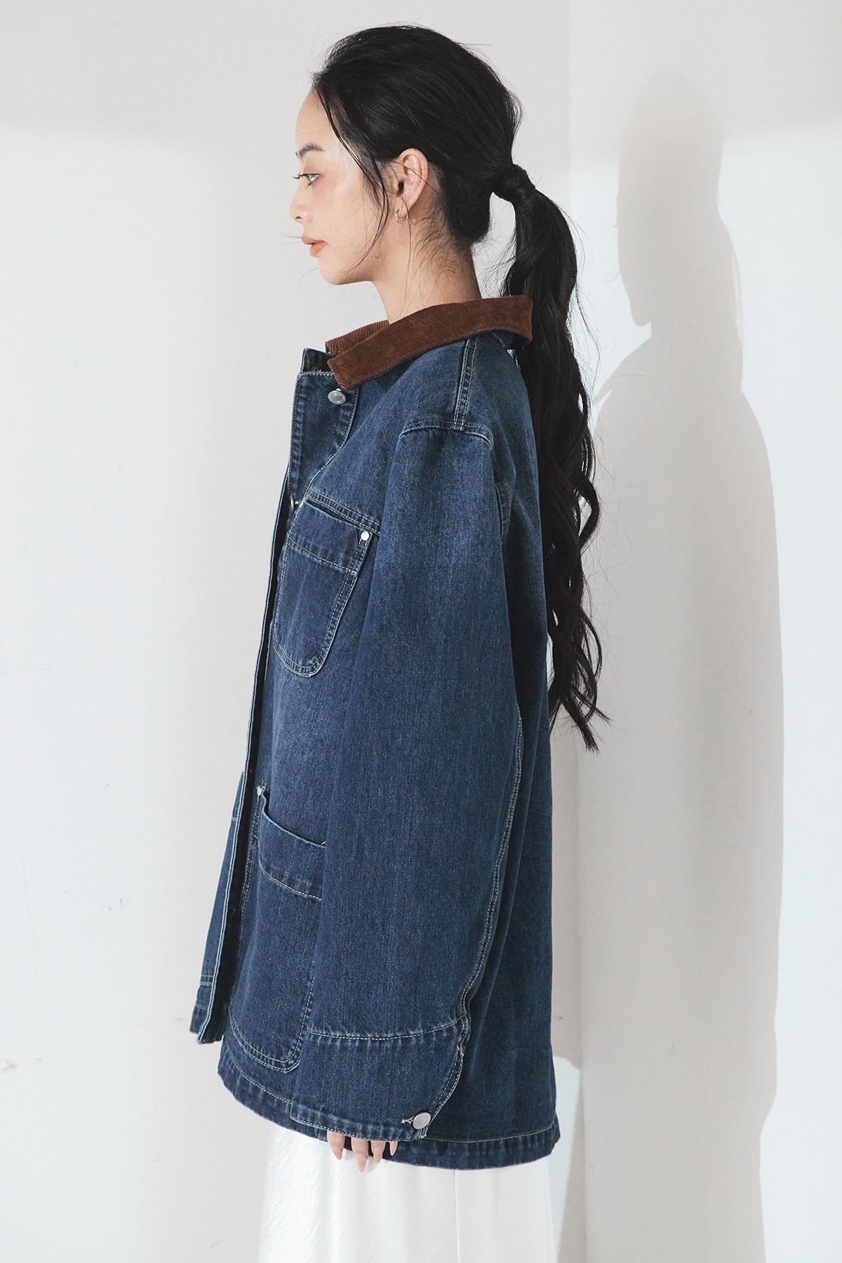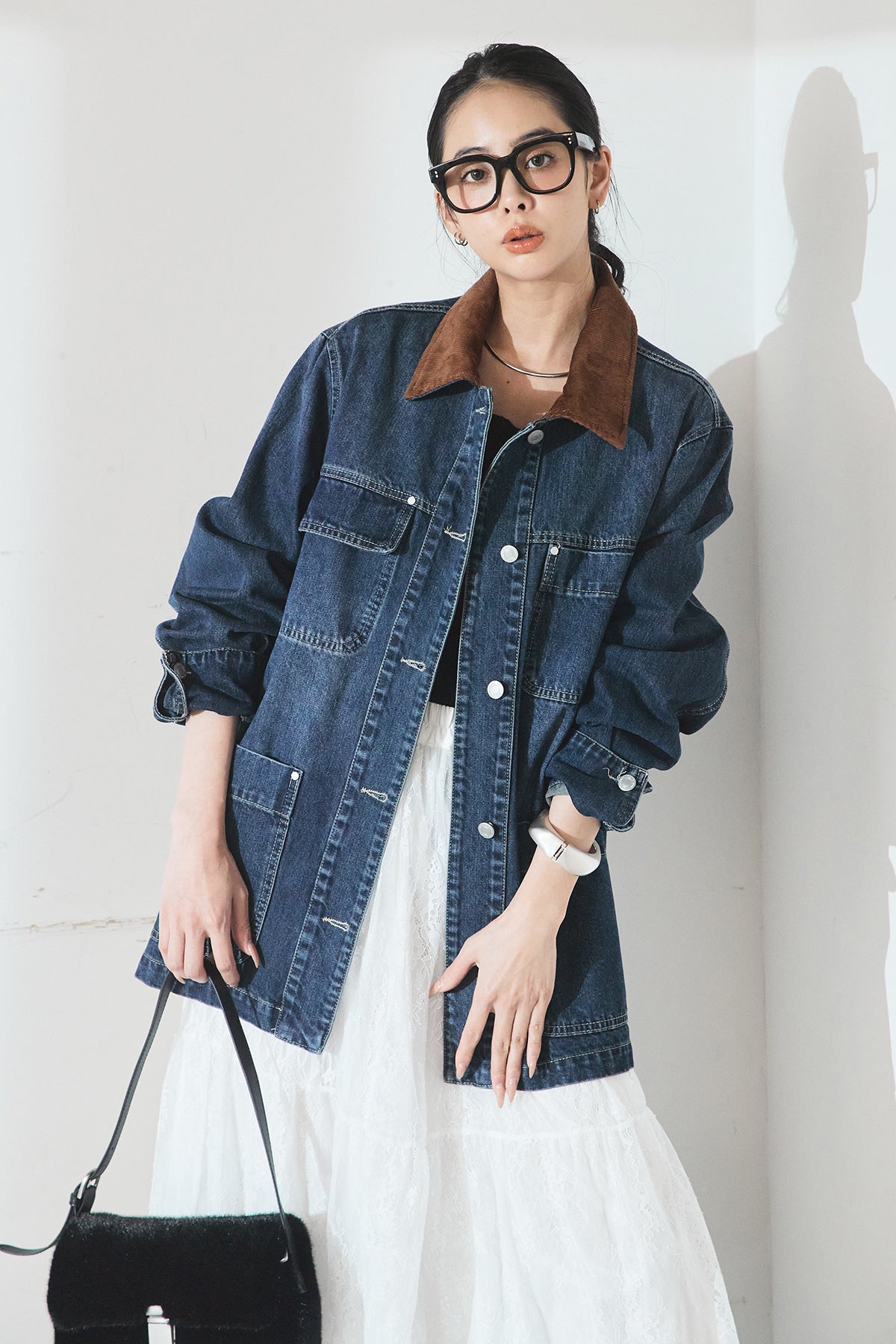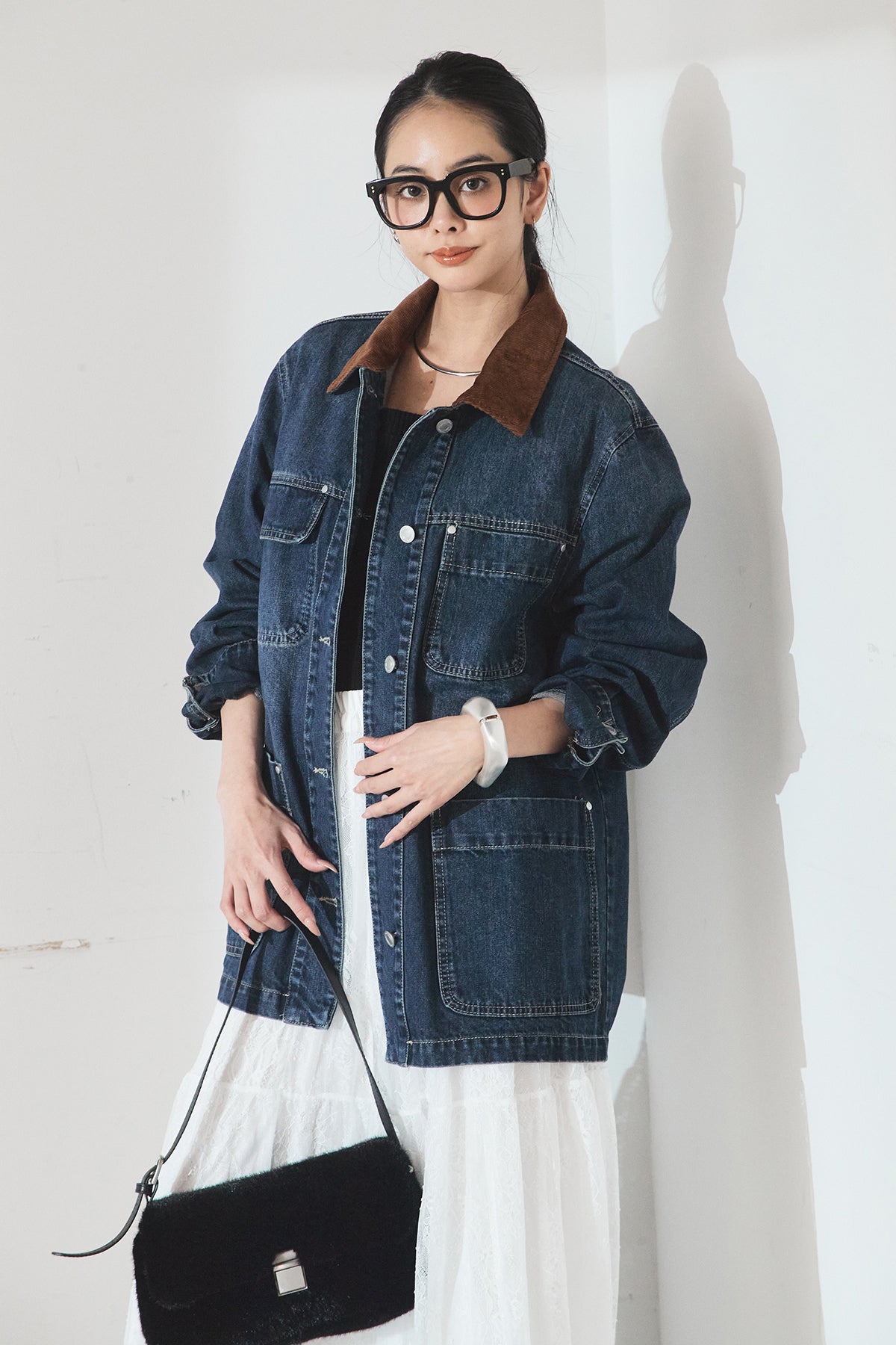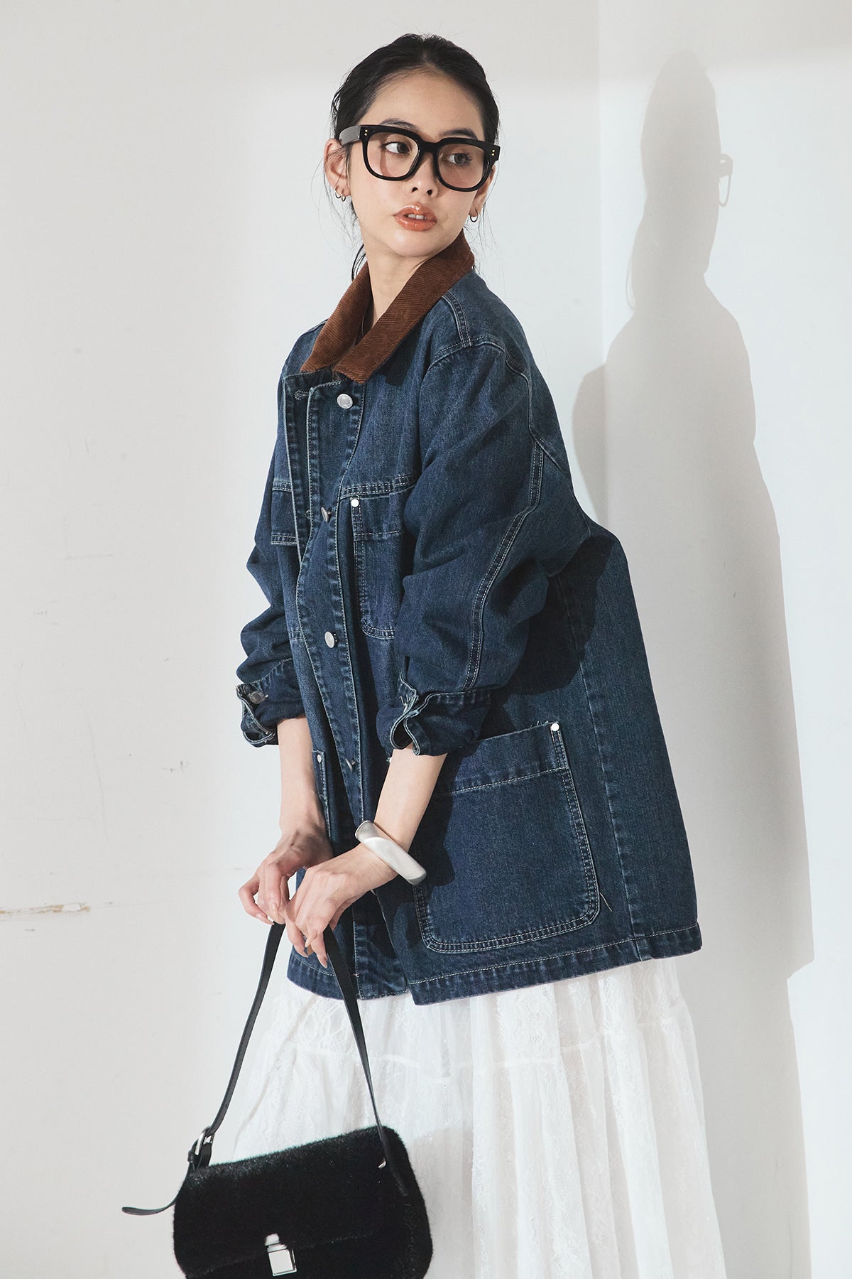 デニム素材に衿元のコーデュロイを組み合わせた、クラシカルな雰囲気のカバーオール。程よくハリのある生地感とゆとりのあるシルエットで、ラフに羽織るだけでも様になります。配色の衿がさりげないアクセントとなり、カジュアルながらも大人っぽい印象に。パンツにもスカートにも合わせやすく、季節の変わり目にも活躍する一枚です。