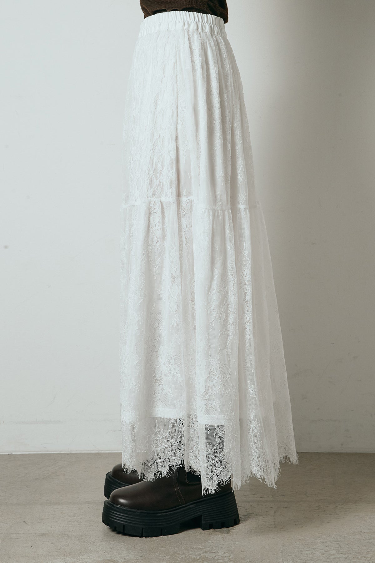 繊細なレース素材を贅沢に使用し、裾にひげレースをあしらったロング丈スカート。切り替えデザインが軽やかな動きを生み、歩くたびに表情のあるシルエットを演出します。ウエストはゴム仕様で穿き心地も快適。ニットやスウェットなどカジュアルなトップスとも好相性で、スタイリングにさりげない甘さを添える一枚です。