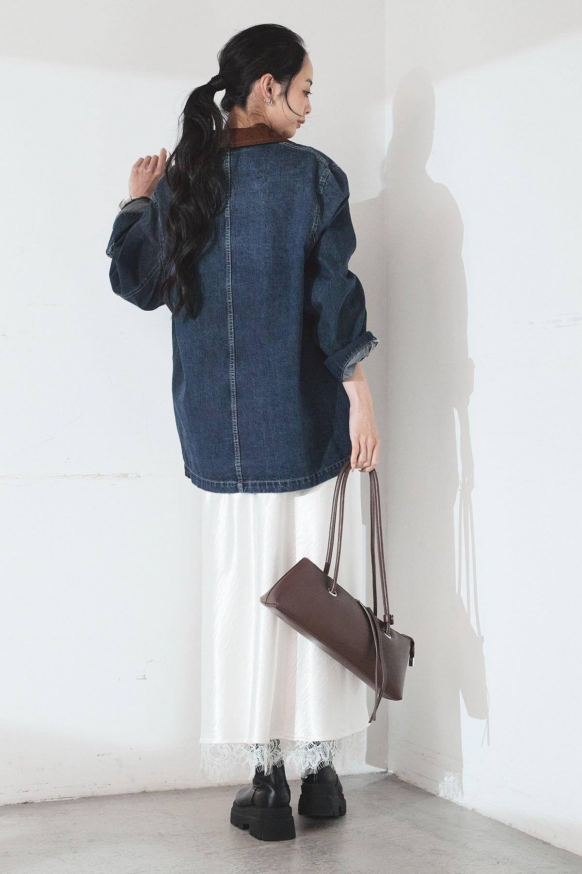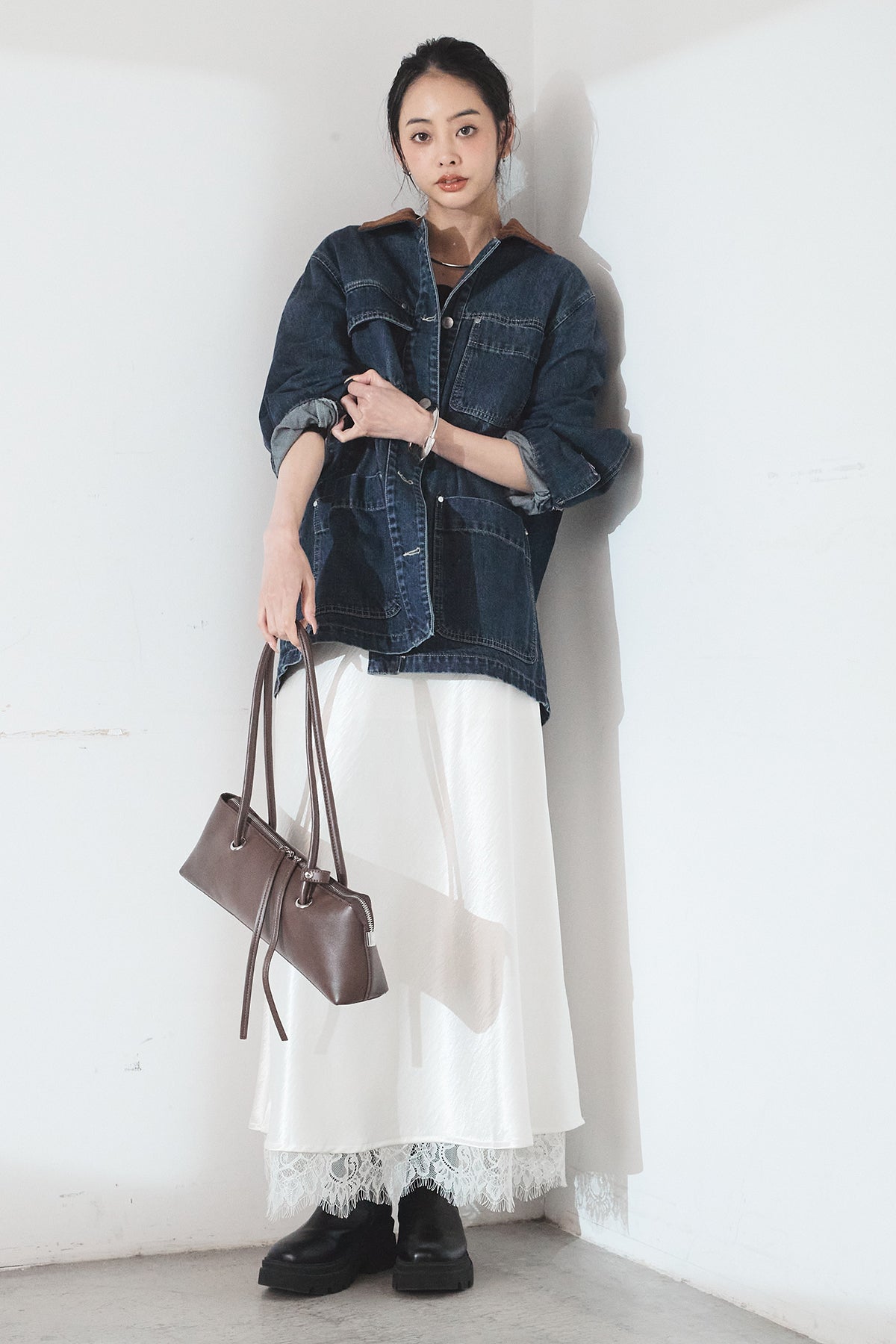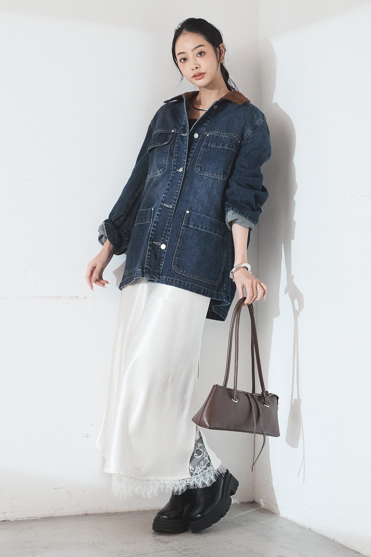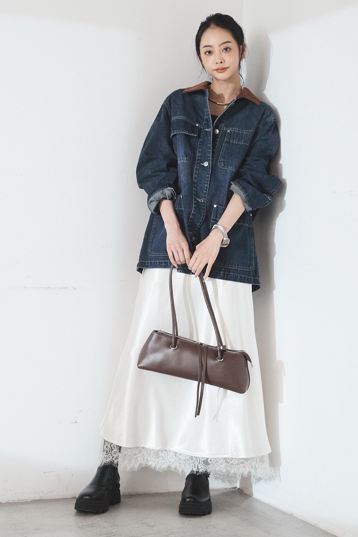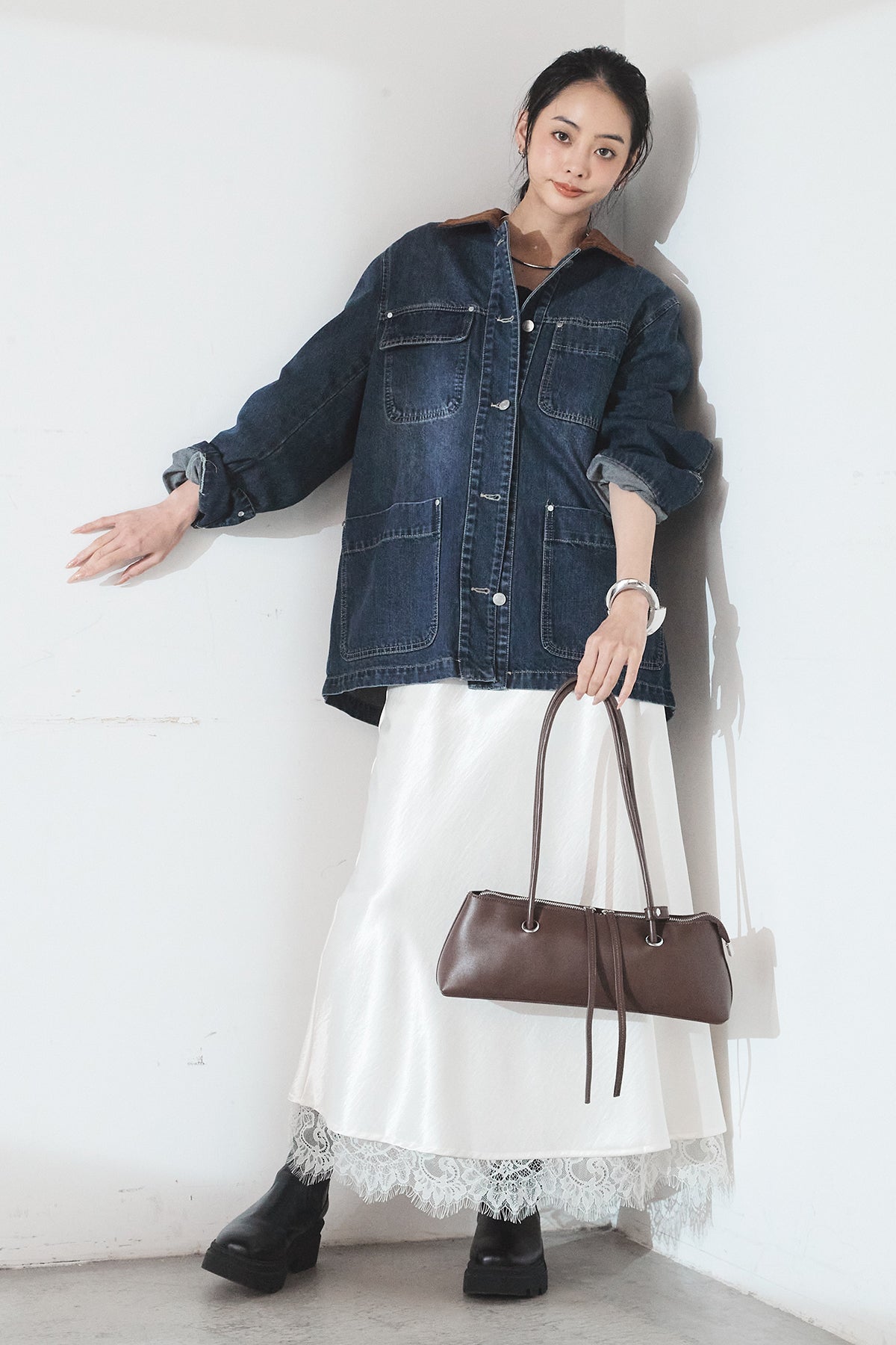 [SET]襟コーデュロイデニムカバーオール+裾レースデザインサテンスカート(2set)