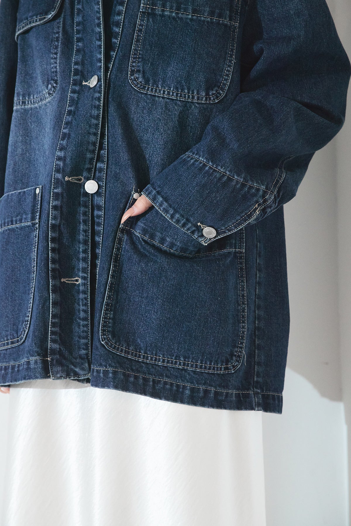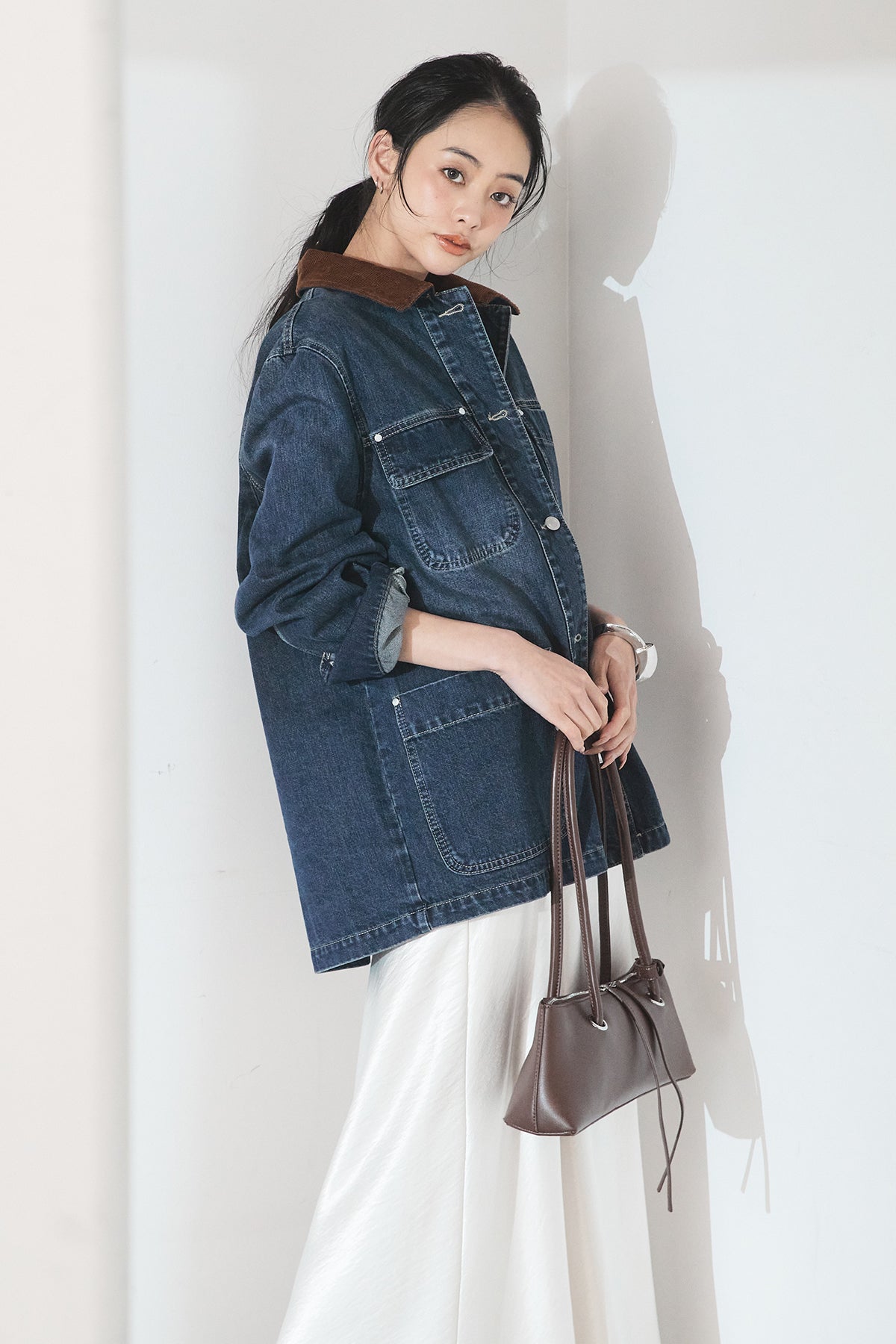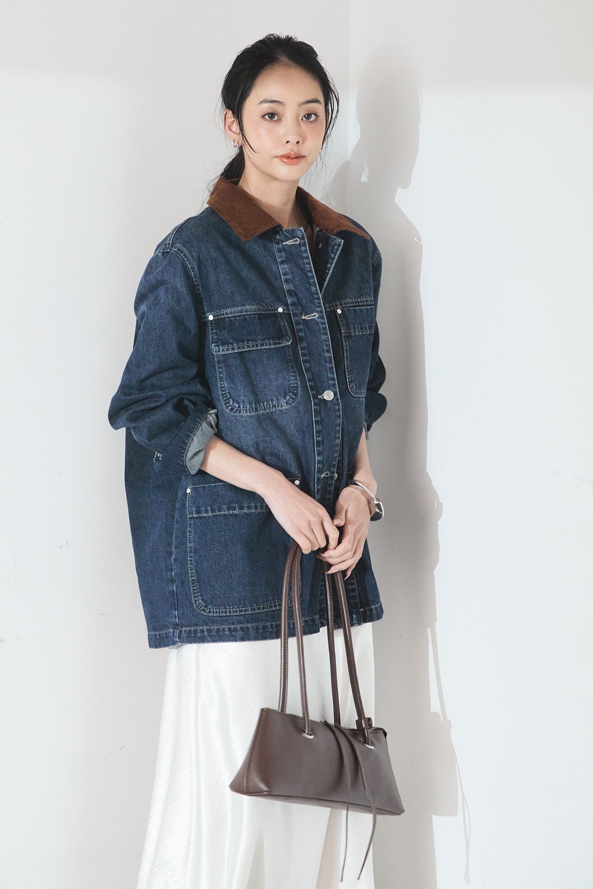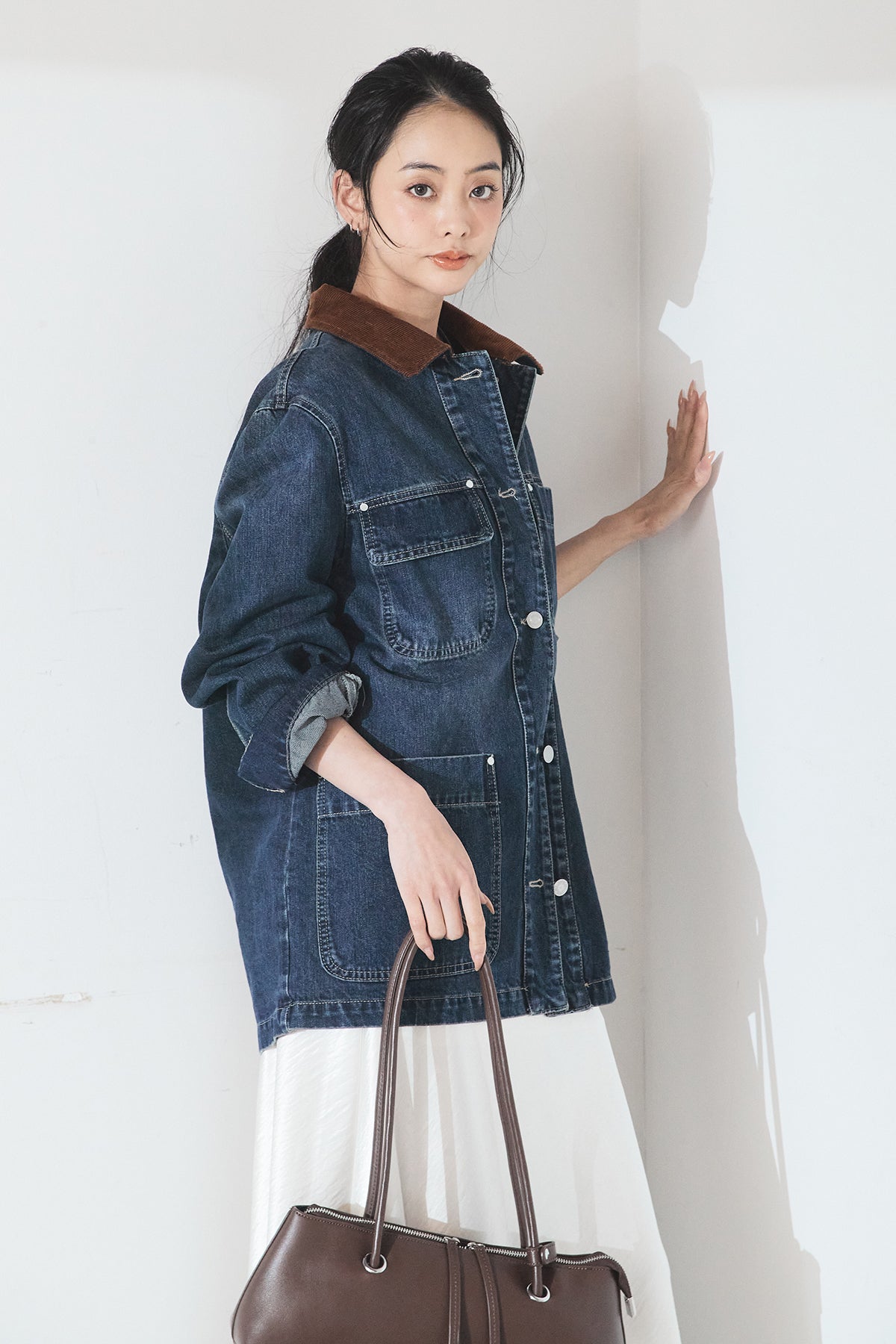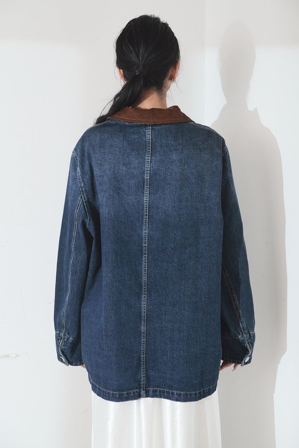 デニム素材に衿元のコーデュロイを組み合わせた、クラシカルな雰囲気のカバーオール。程よくハリのある生地感とゆとりのあるシルエットで、ラフに羽織るだけでも様になります。配色の衿がさりげないアクセントとなり、カジュアルながらも大人っぽい印象に。パンツにもスカートにも合わせやすく、季節の変わり目にも活躍する一枚です。