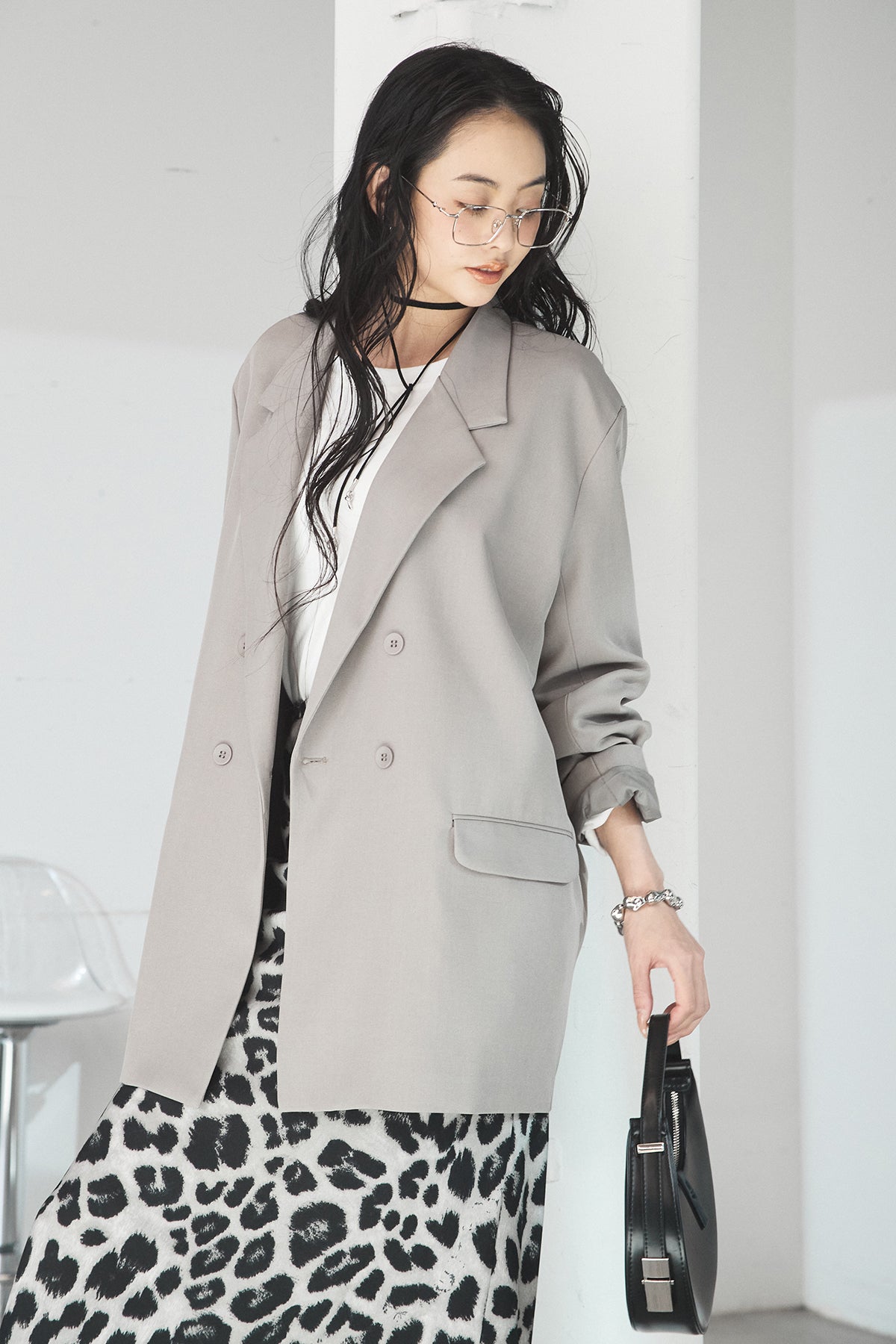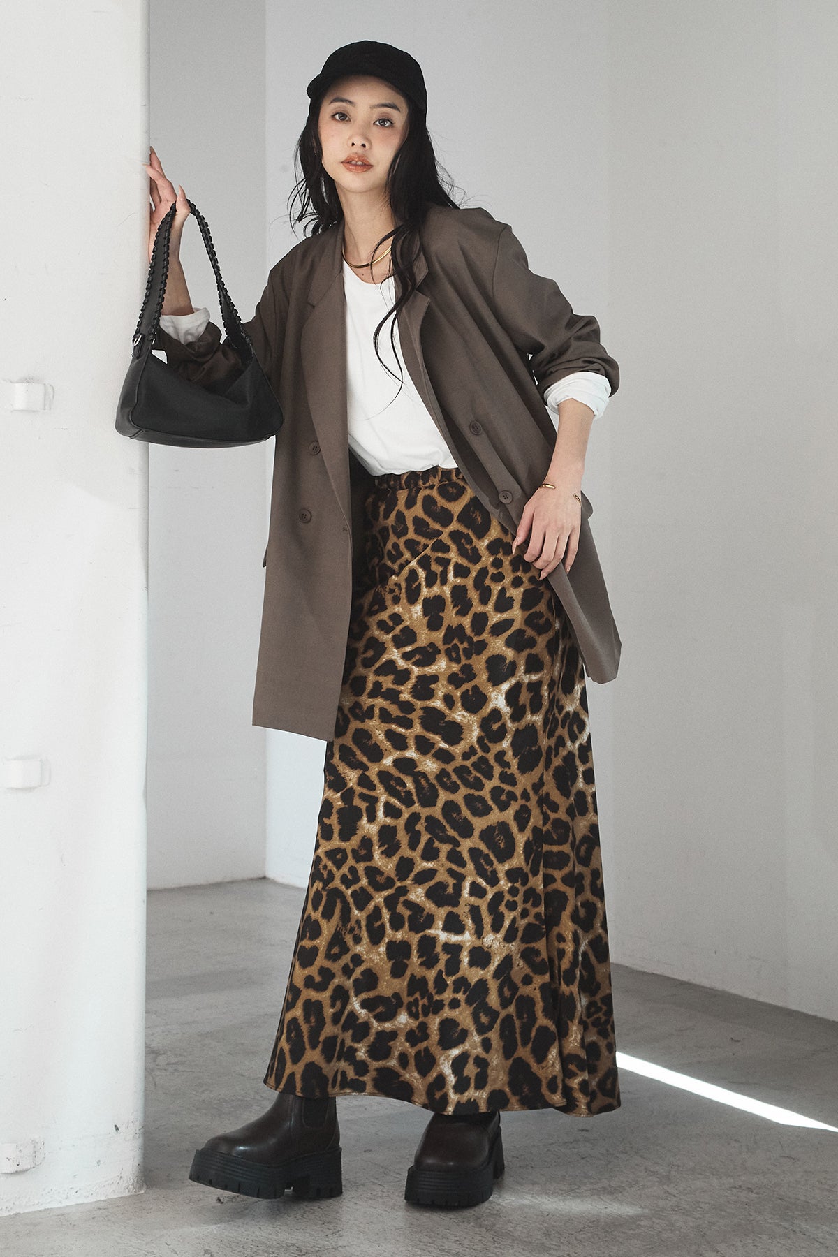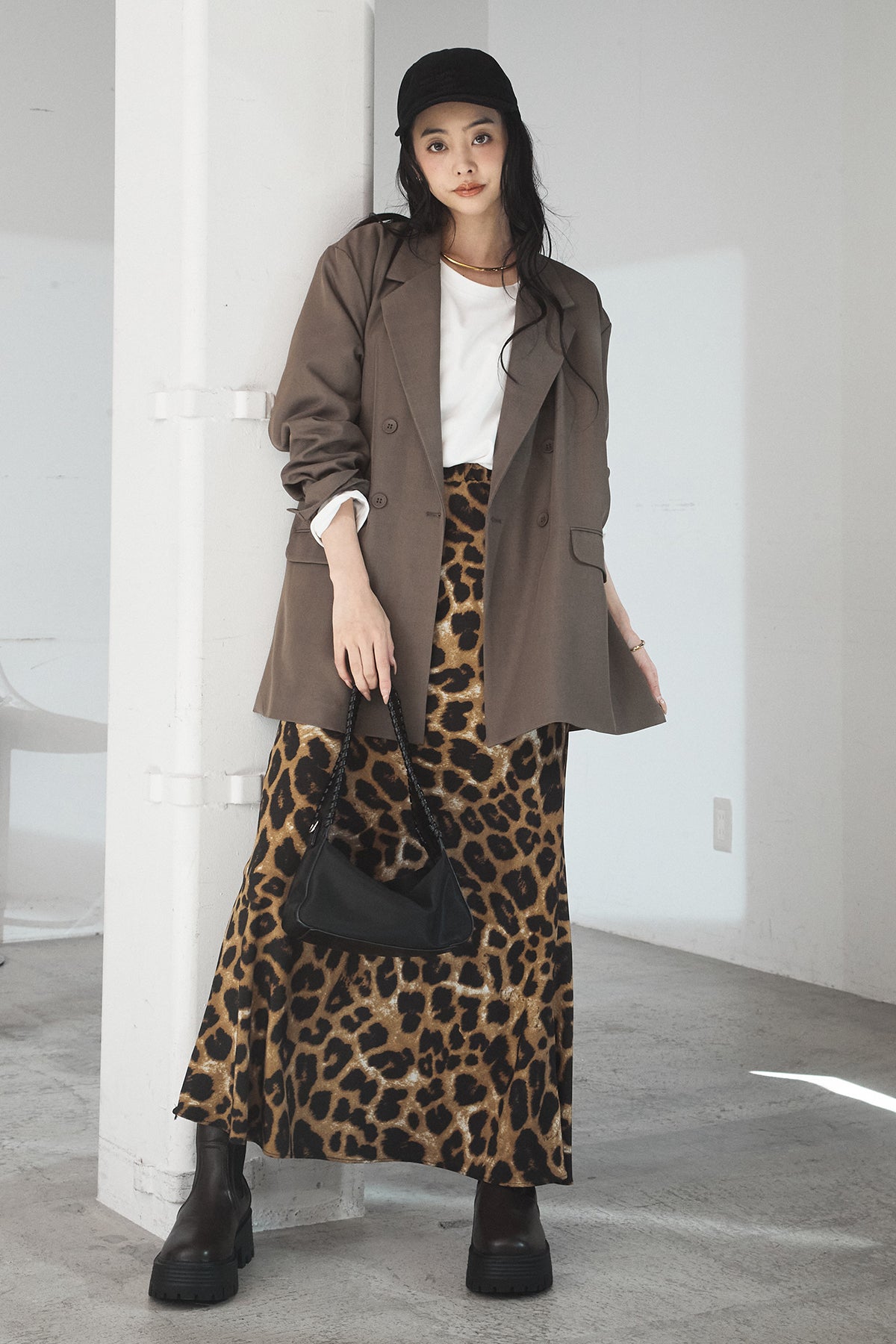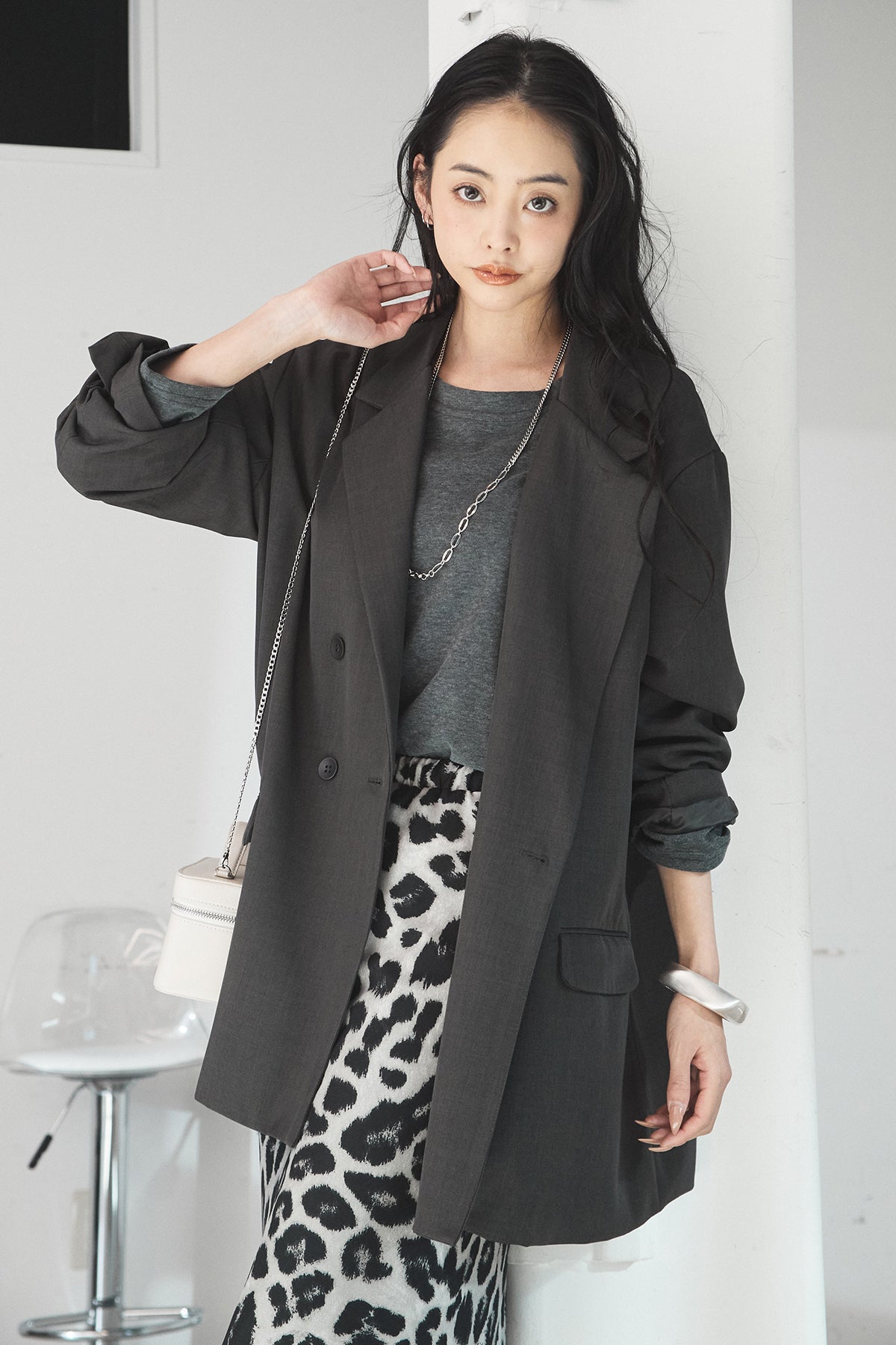 [SET]ルーズシルエットダブルテーラードジャケット+ストレッチロングTシャツ+レオパードサテンナロースカート(3set)