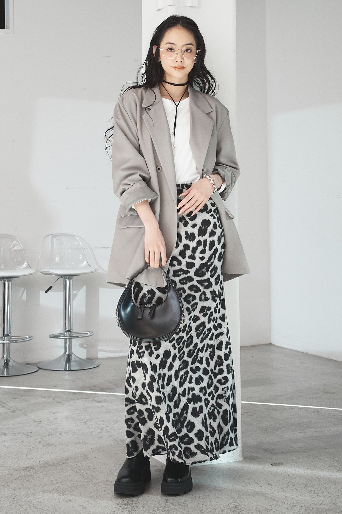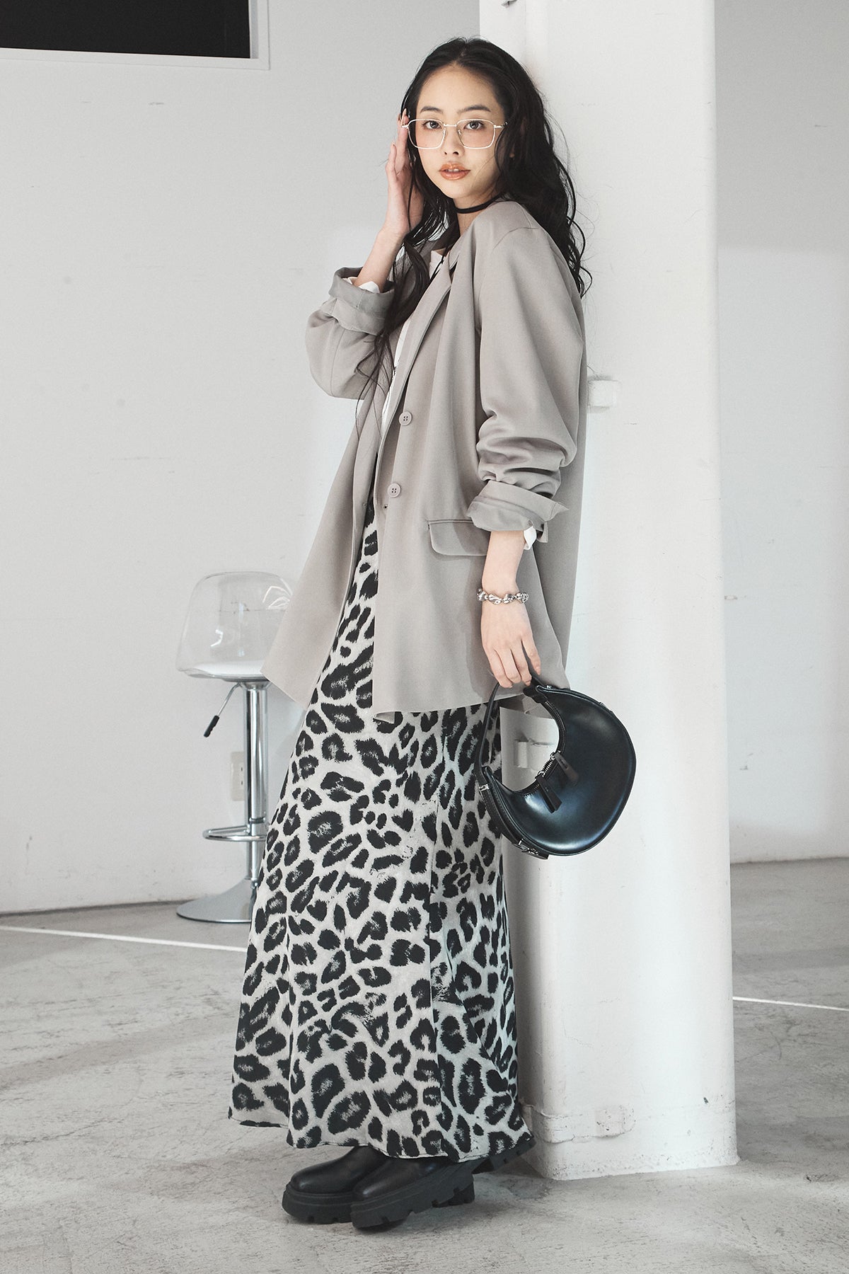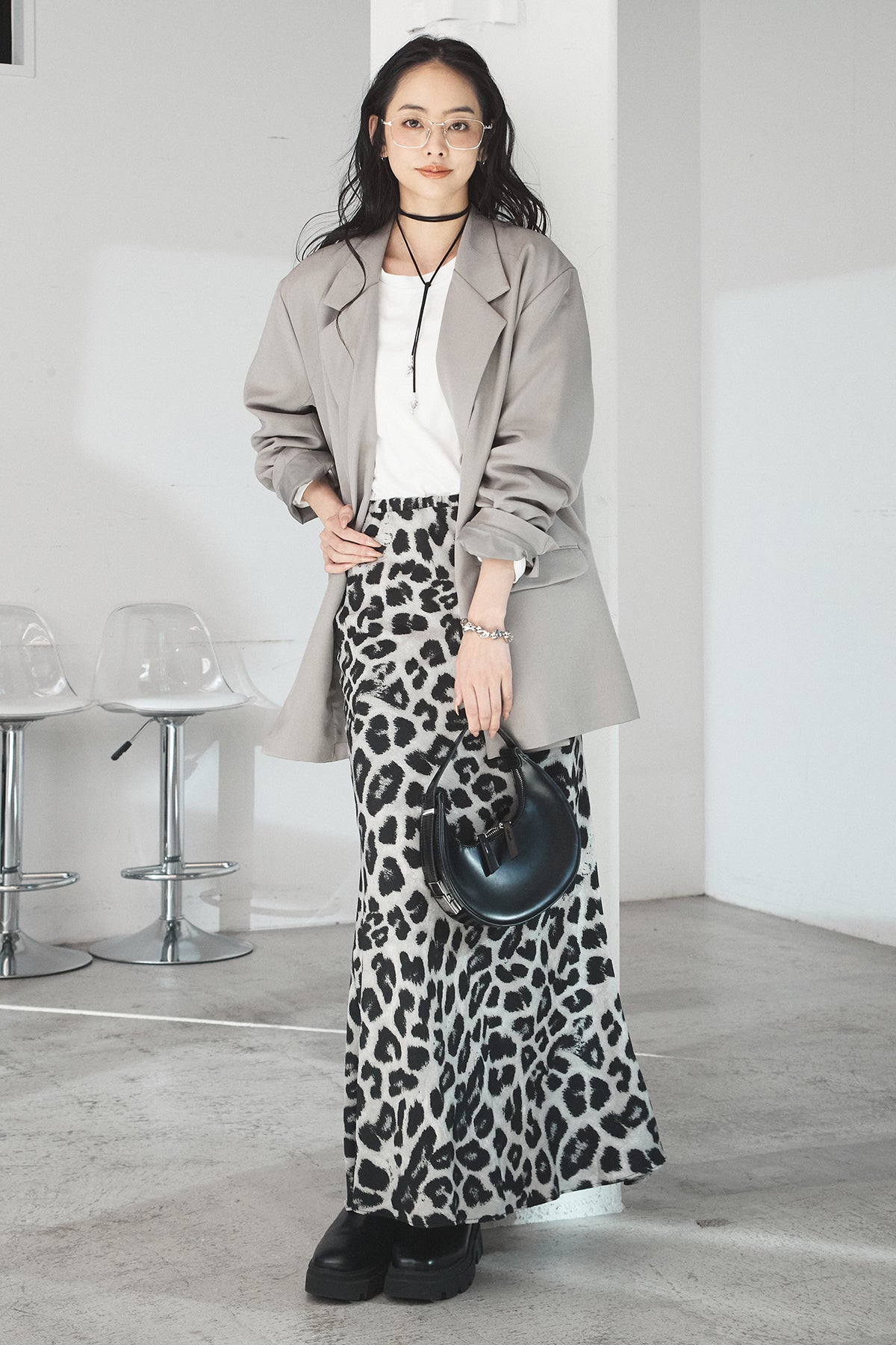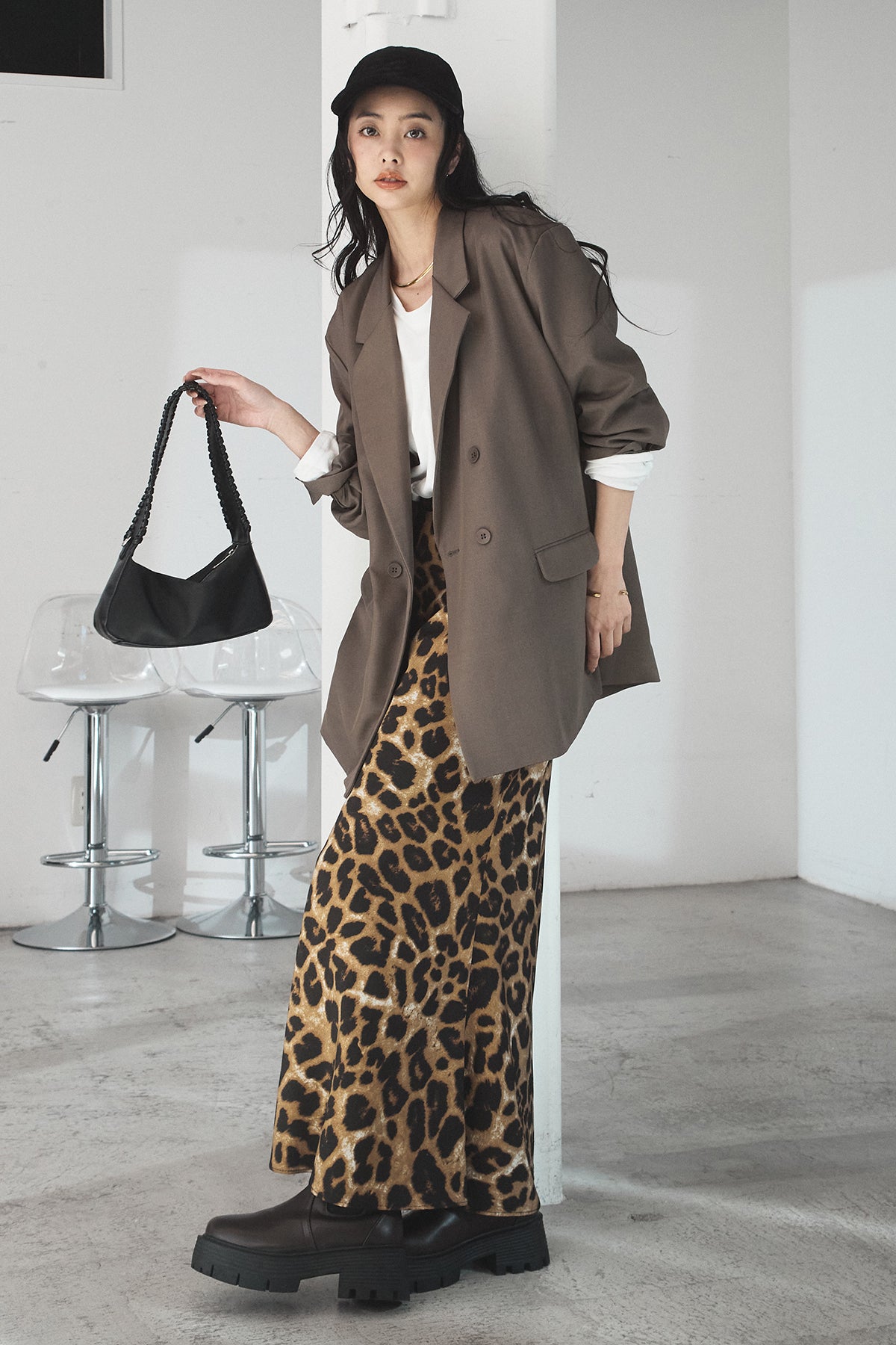 [SET]ルーズシルエットダブルテーラードジャケット+ストレッチロングTシャツ+レオパードサテンナロースカート(3set)
