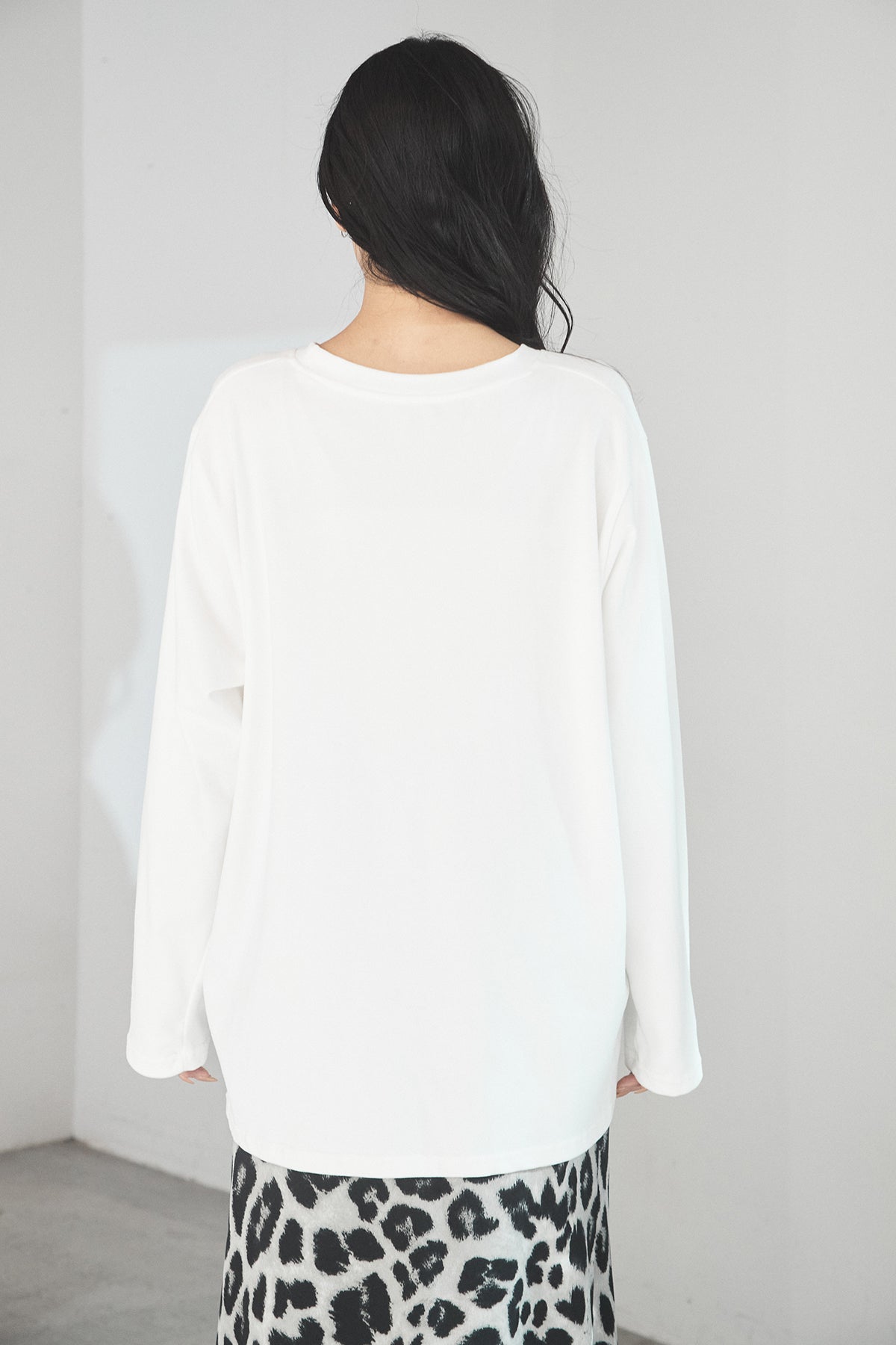 伸縮性のある柔らかな素材で仕立てた、着心地の良いロングTシャツ。程よくゆとりのあるシルエットが体のラインを拾いにくく、1枚でもレイヤードでも使いやすいデザインです。シンプルなクルーネックで合わせるアイテムを選ばず、デイリーに活躍。ワードローブにあると重宝する、ベーシックな一枚です。