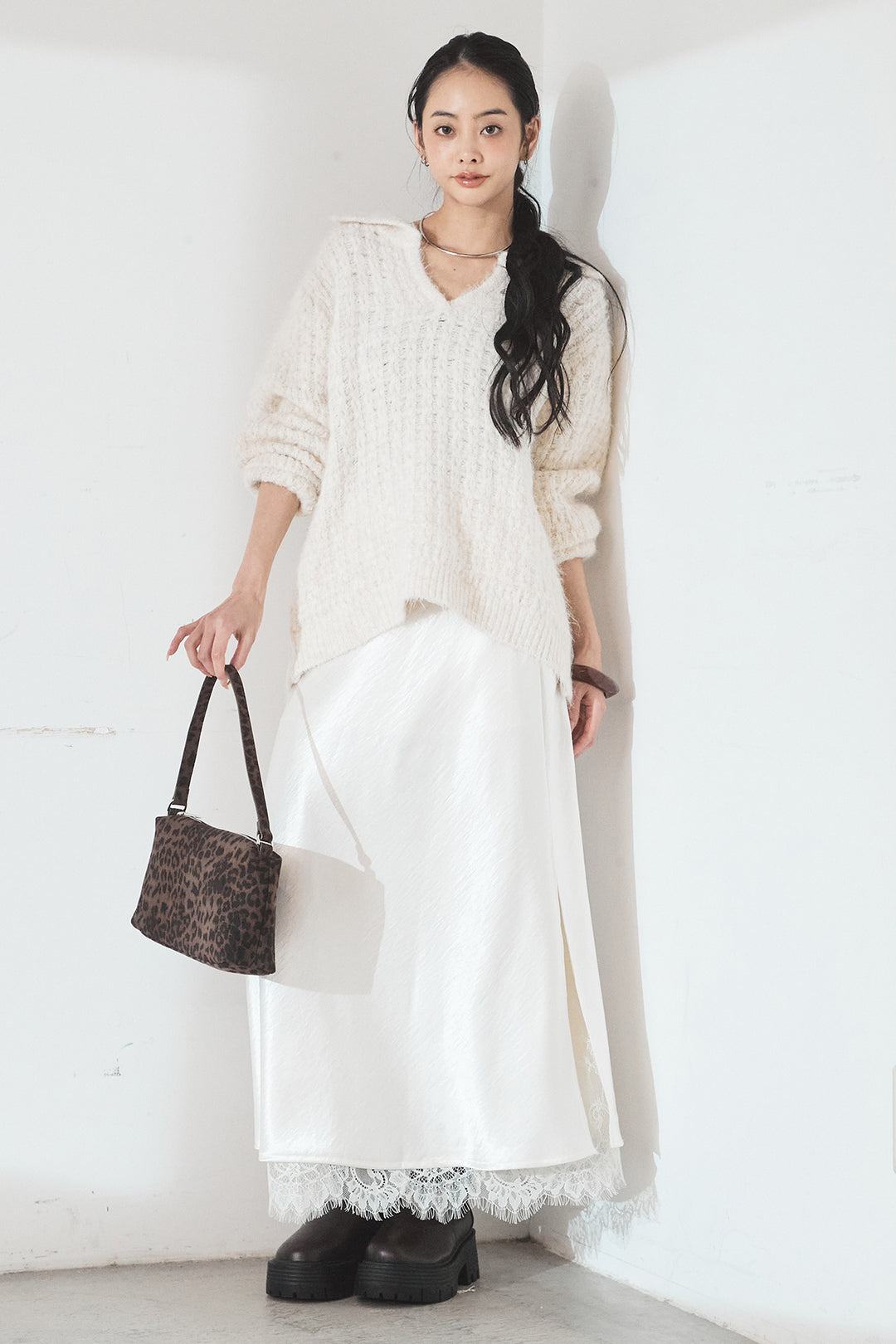 [SET]襟付きVネックニットトップス+裾レースデザインサテンスカート(2set)