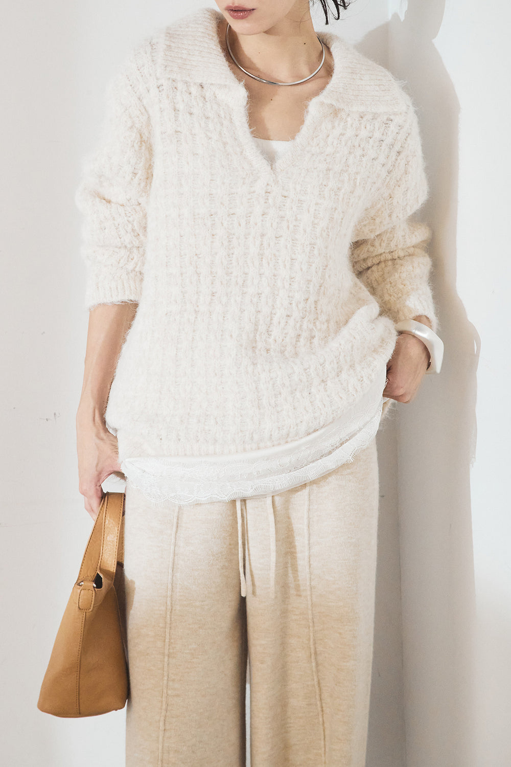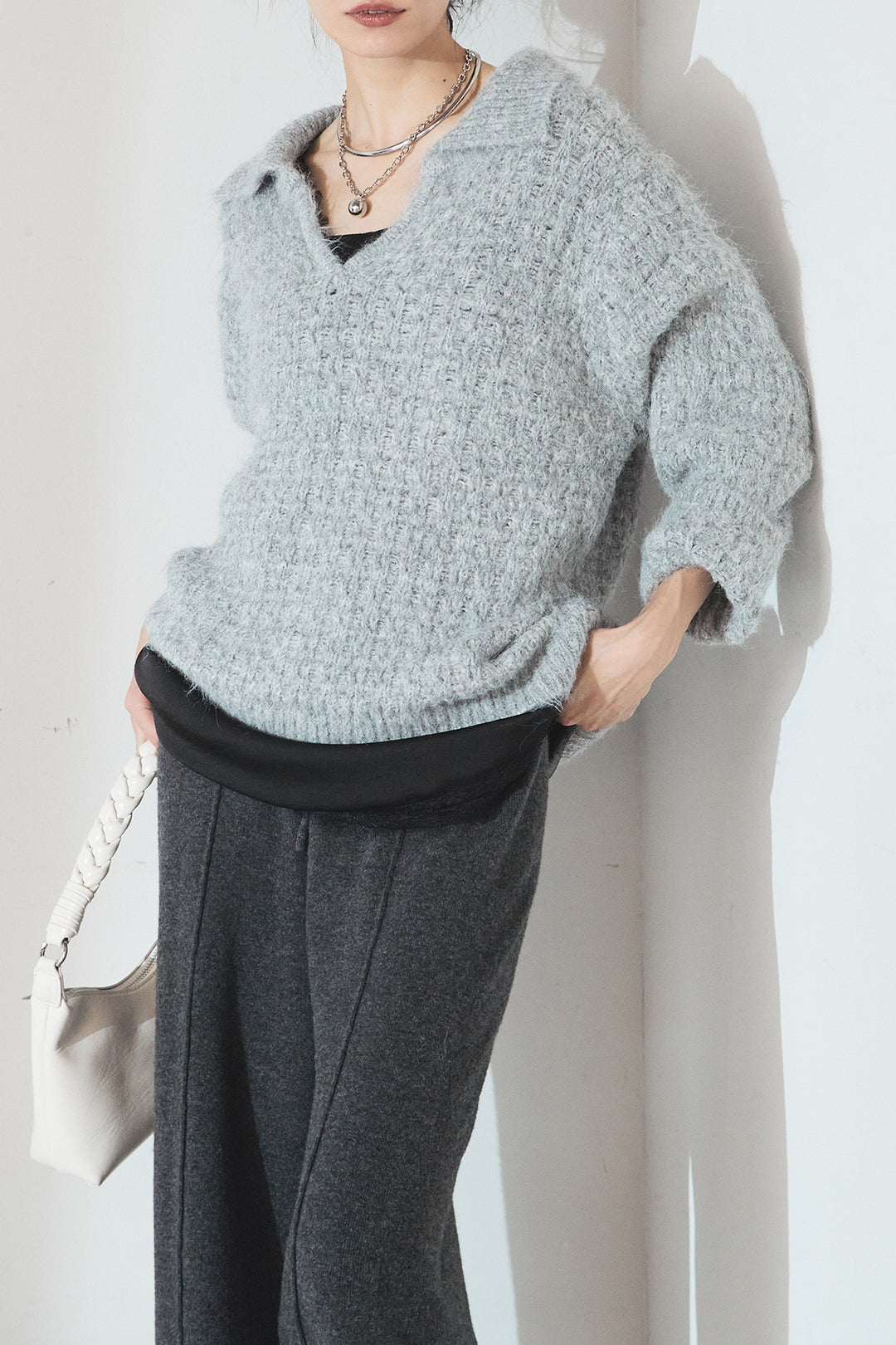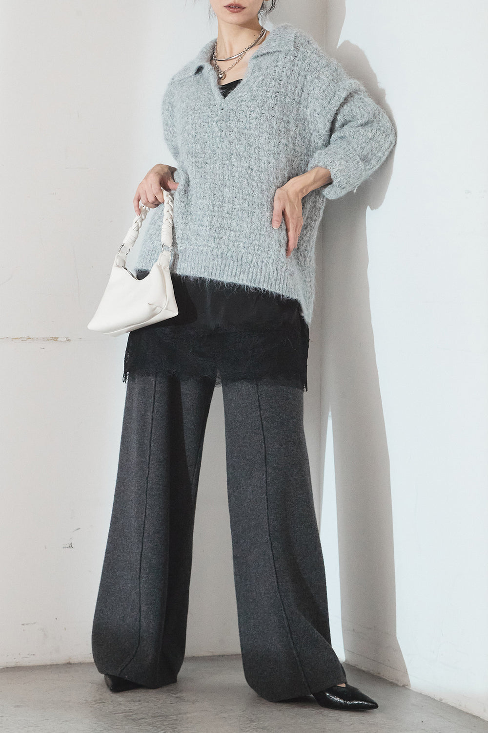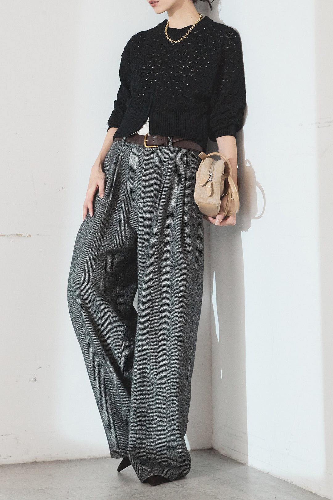 [SET]透かし編みニットジップスリットプルオーバー+タックツイードワイドパンツ(2set)