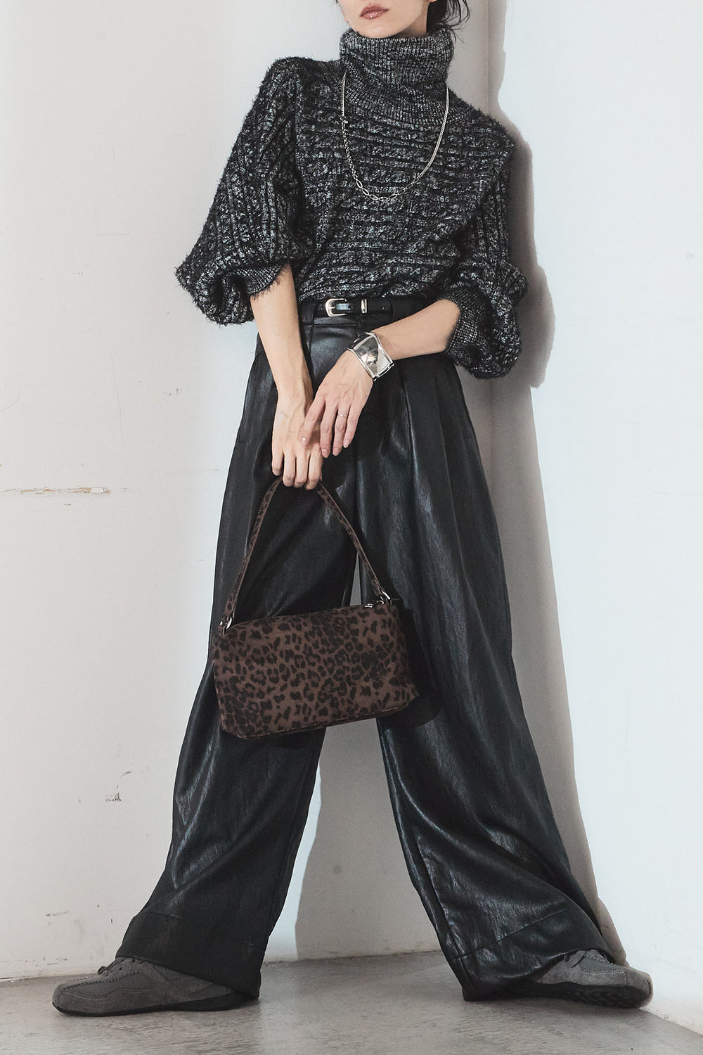 [SET]ミックス編みドルマンニットトップス+ベルト付きレザーライクタックパンツ(2set)
