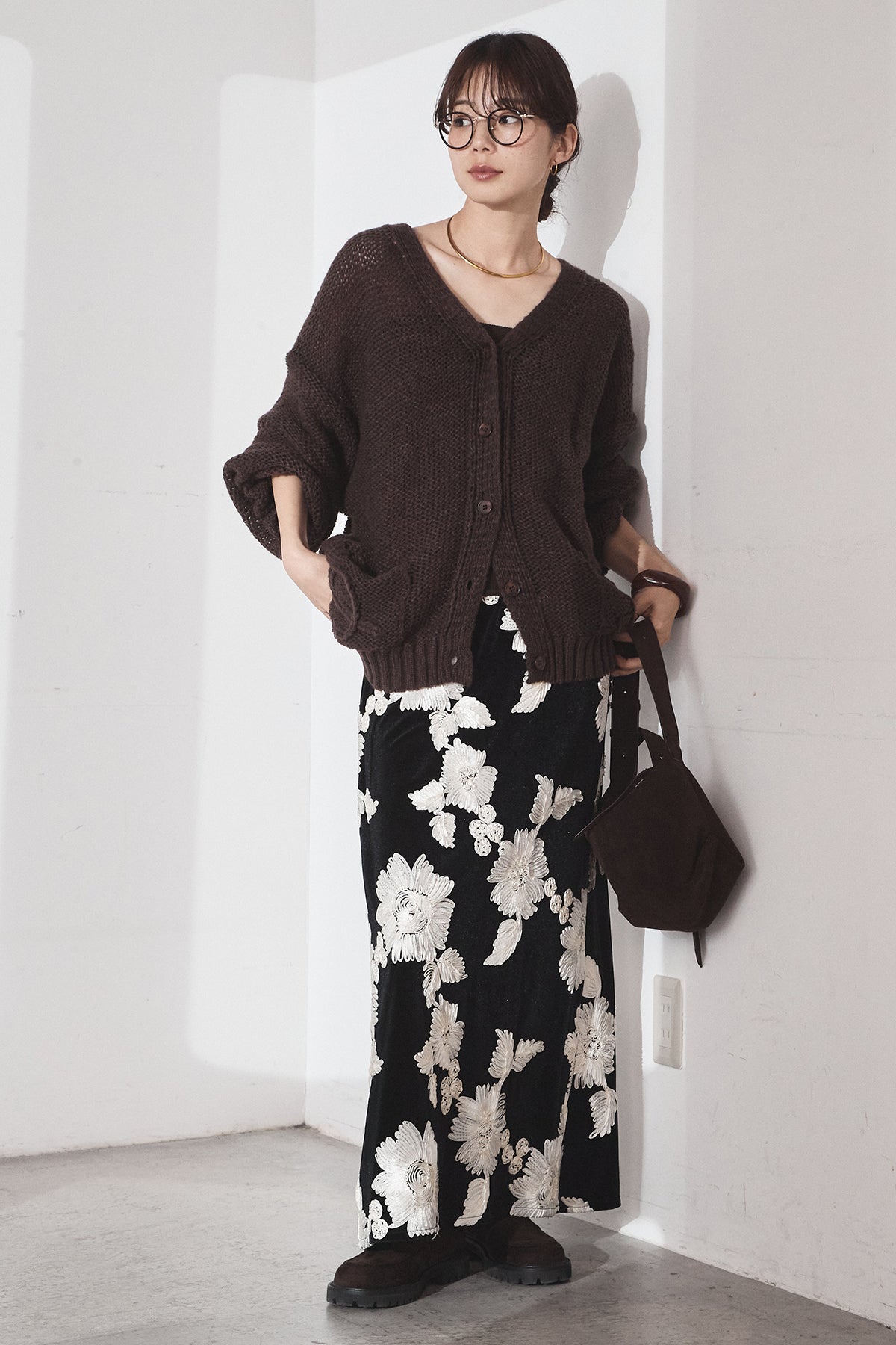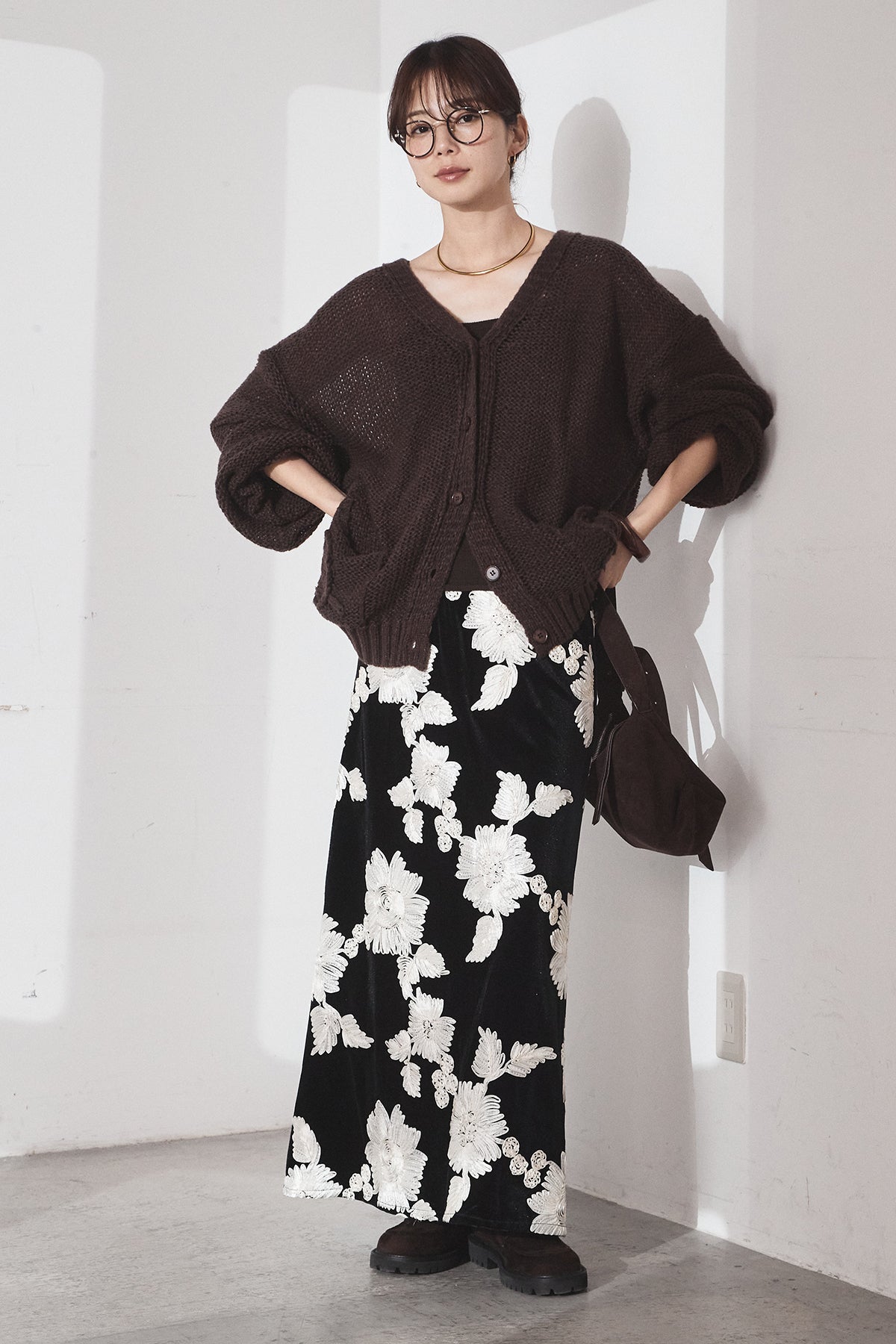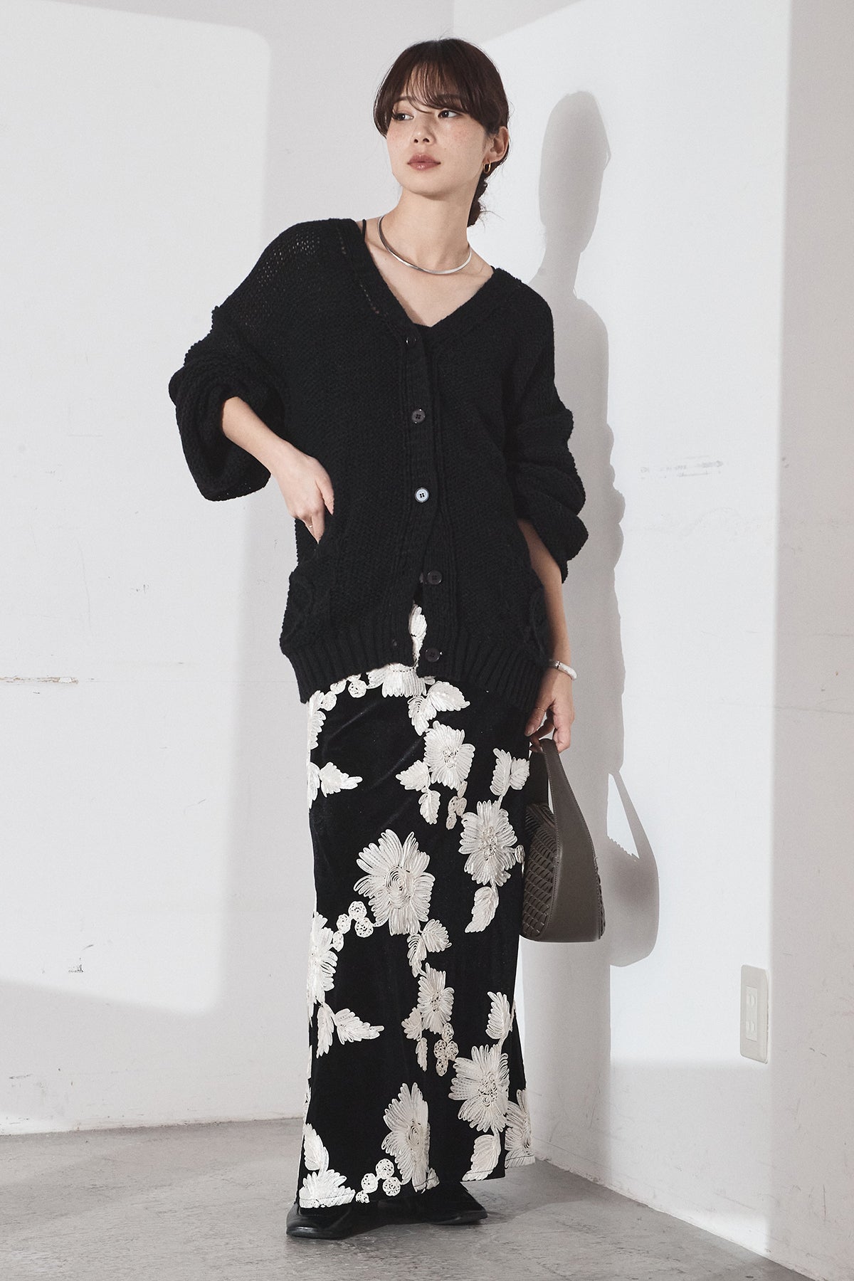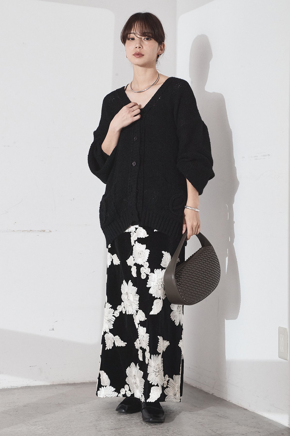 [SET]コード刺繍リラックスニットカーディガン+フラワー刺繍ワイドスカート(2set)