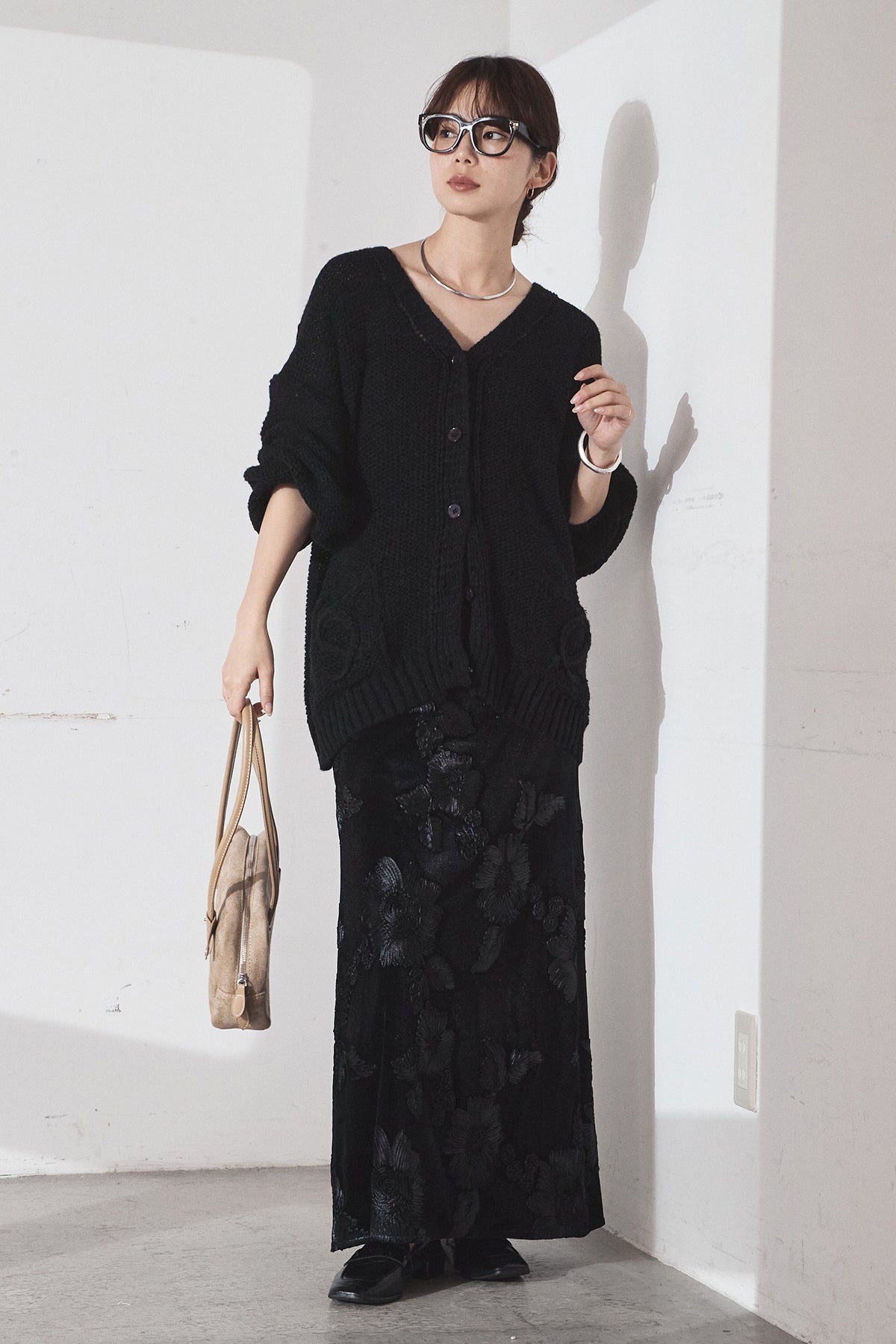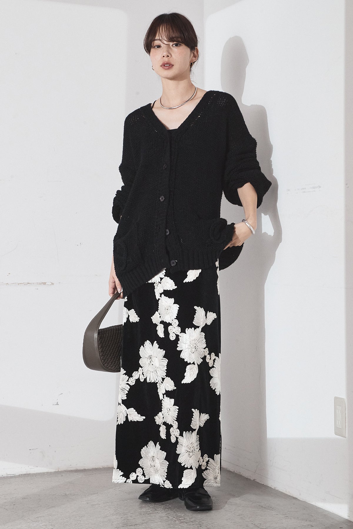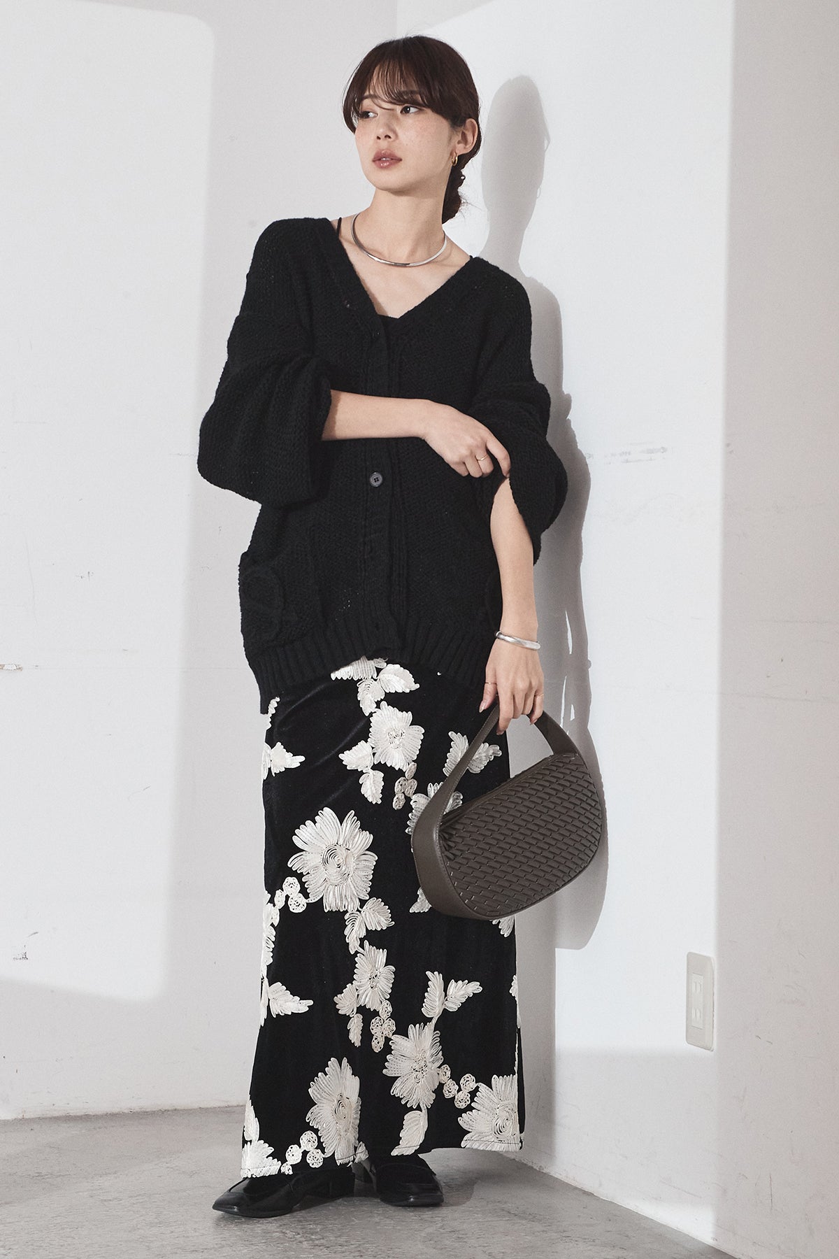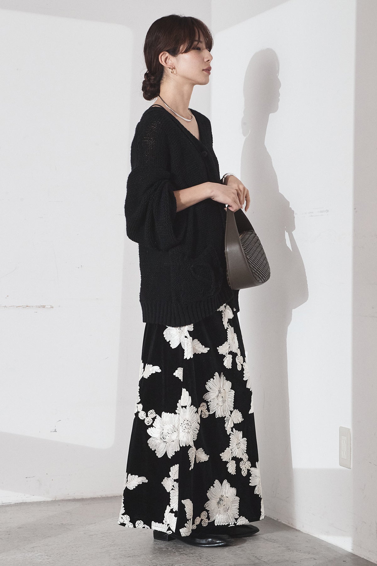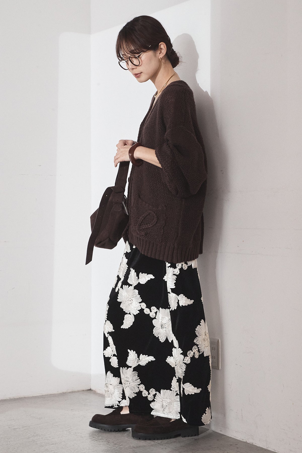 [SET]コード刺繍リラックスニットカーディガン+フラワー刺繍ワイドスカート(2set)