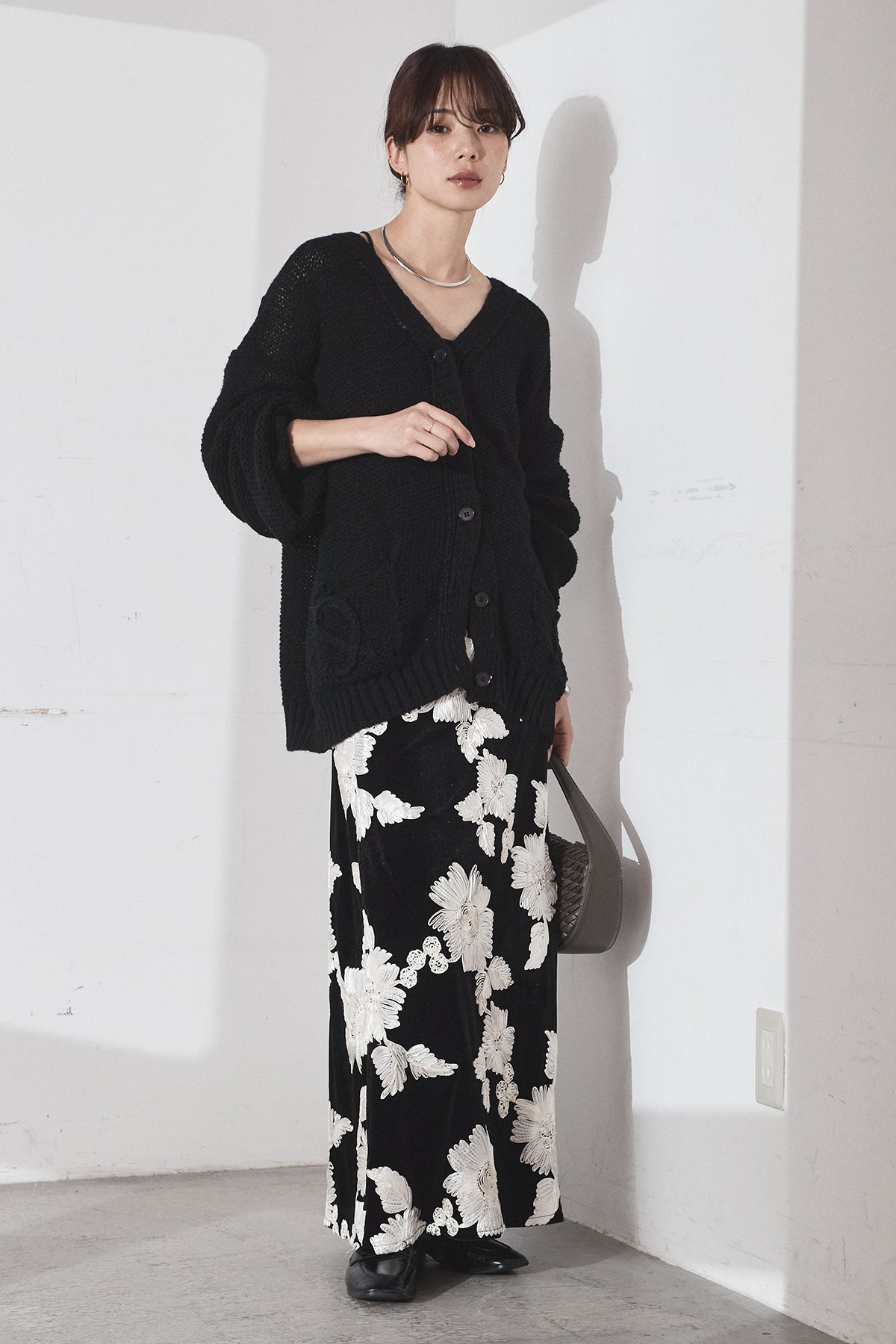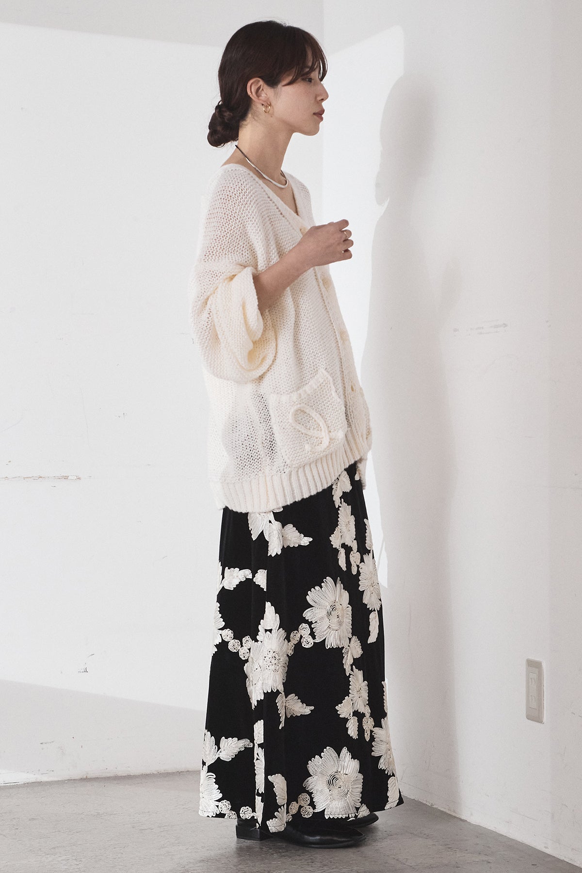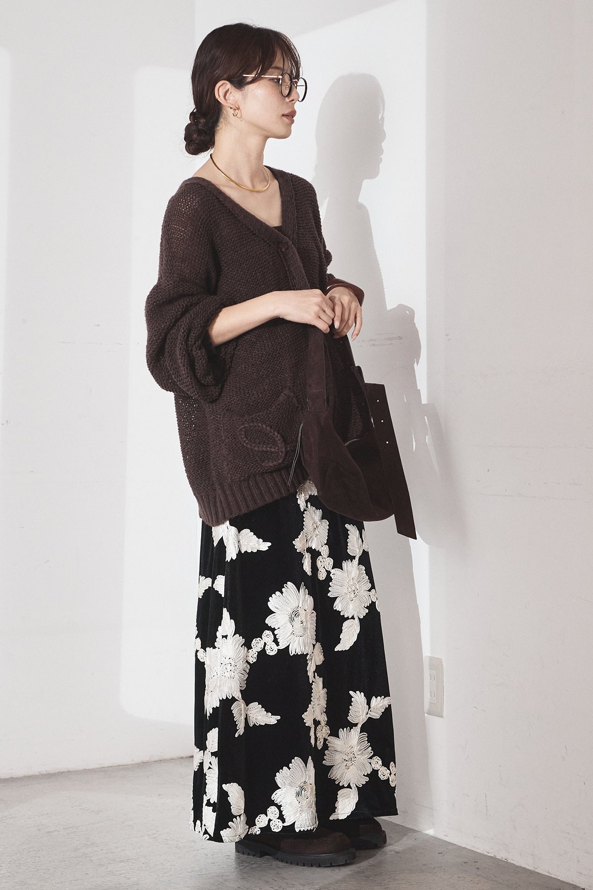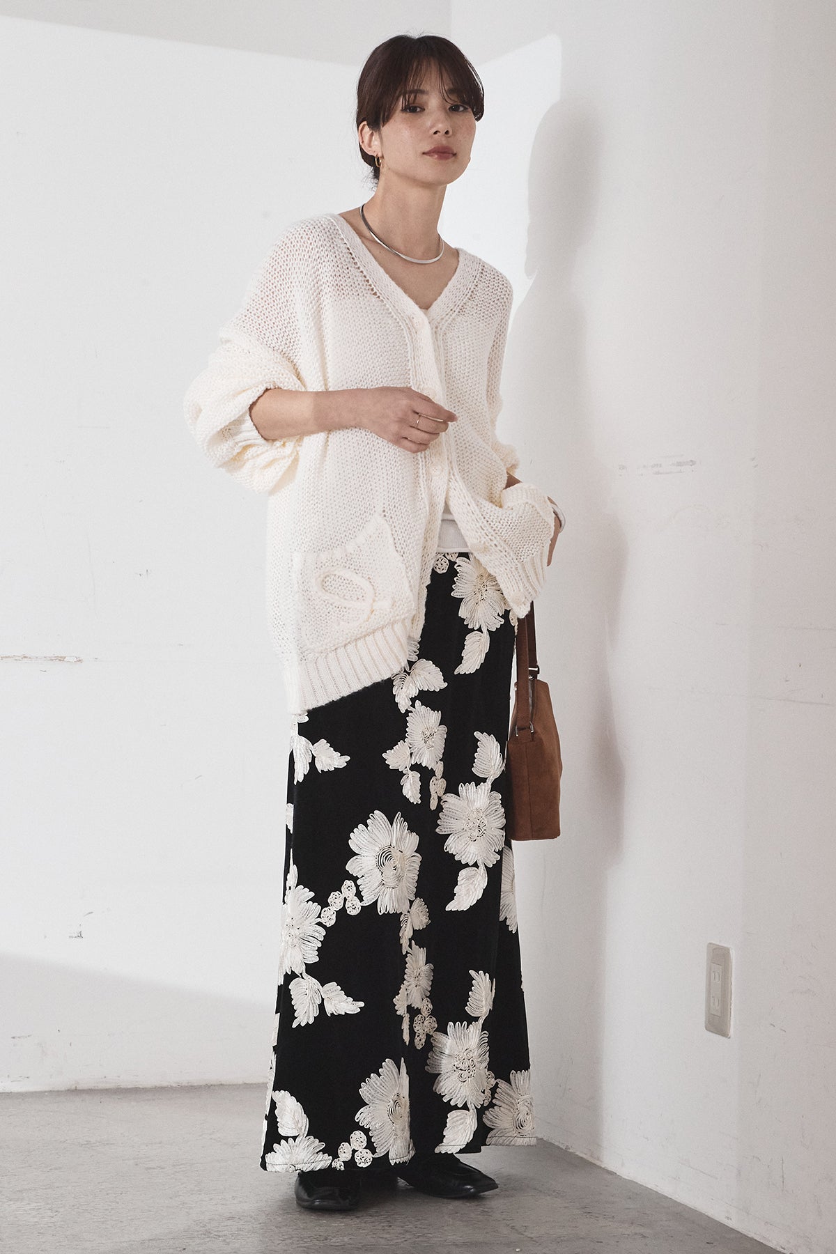 [SET]コード刺繍リラックスニットカーディガン+フラワー刺繍ワイドスカート(2set)