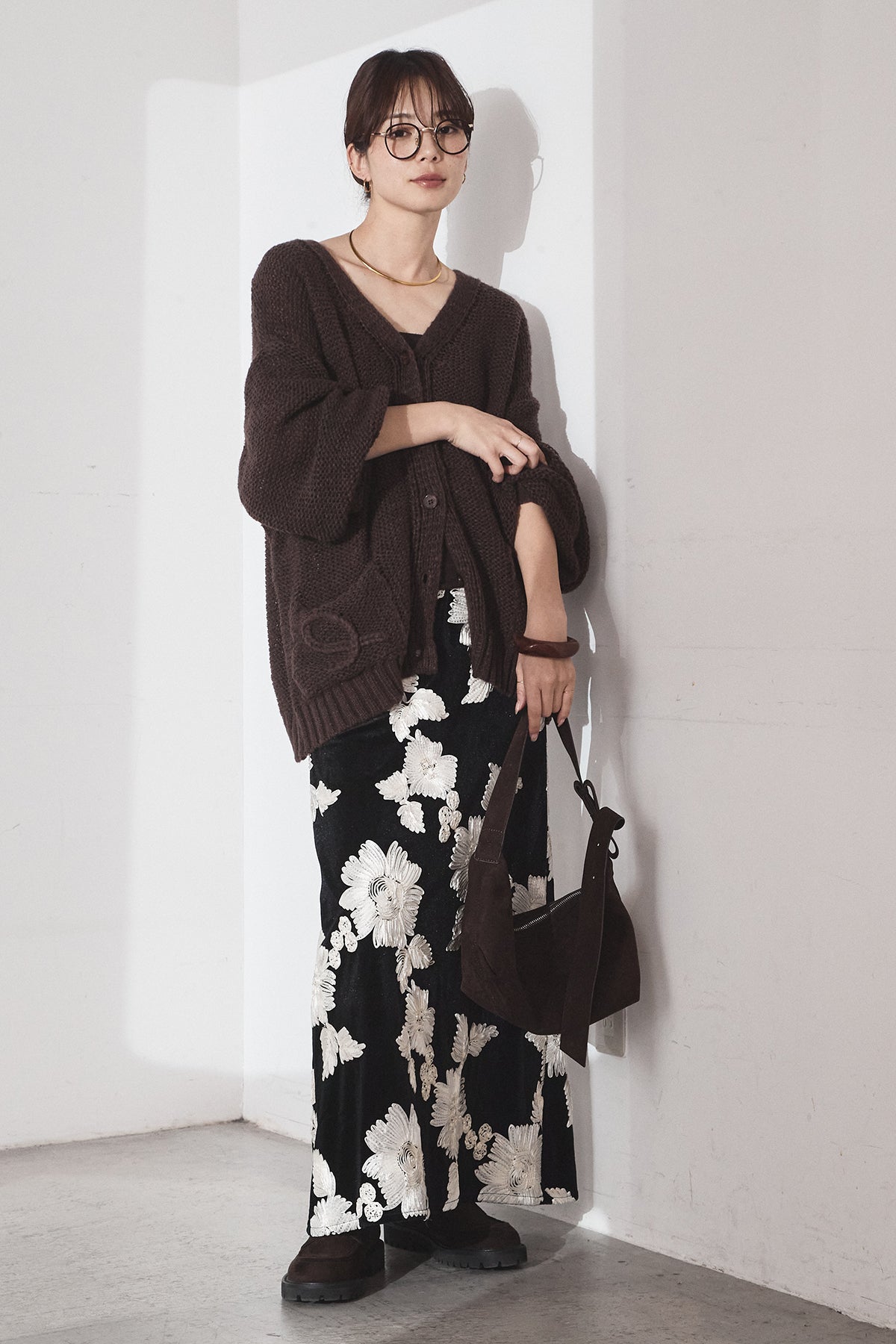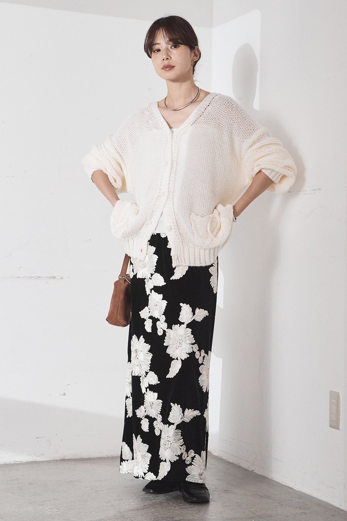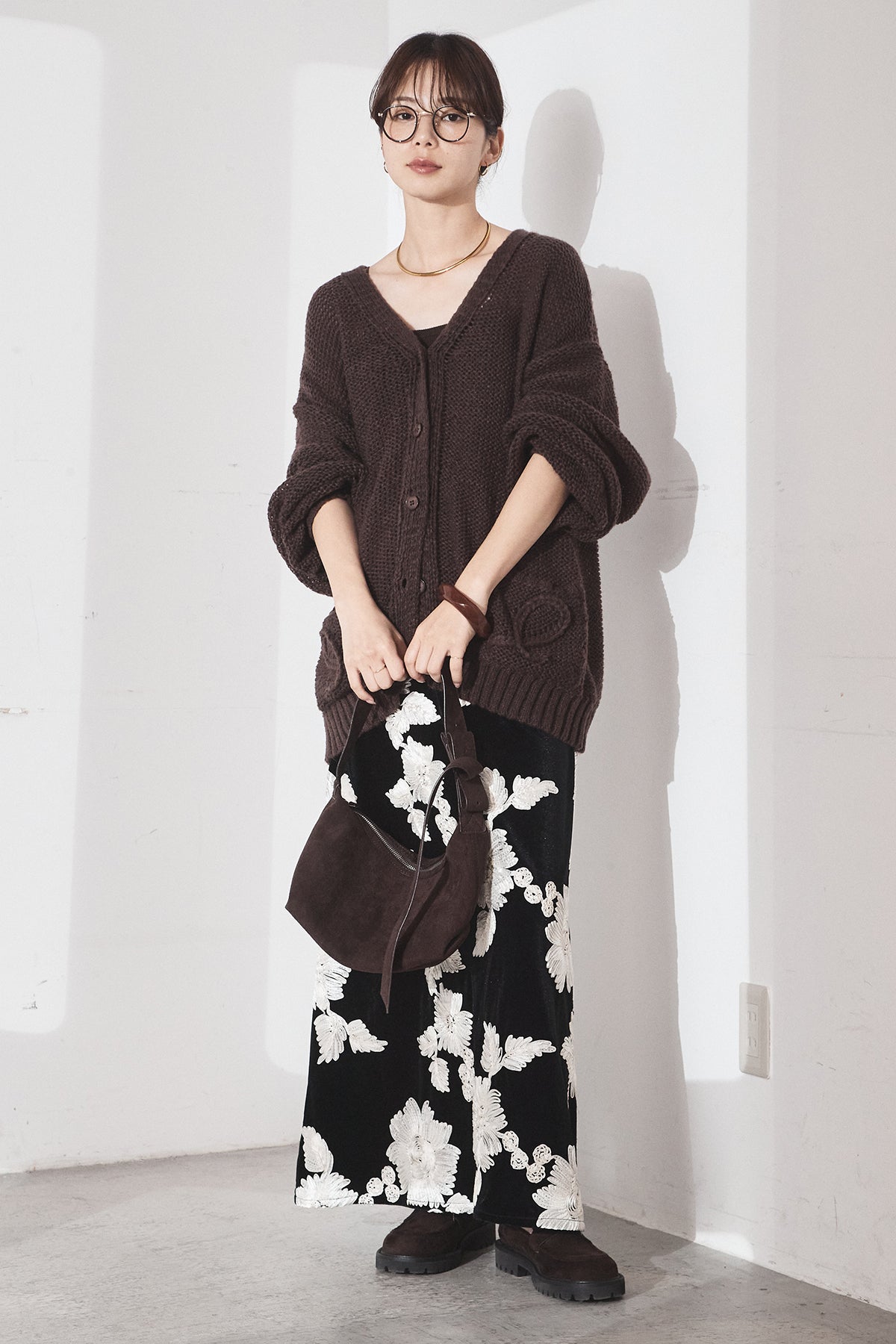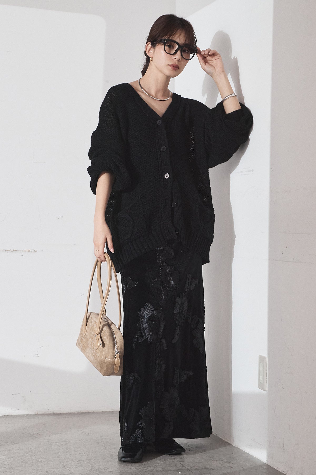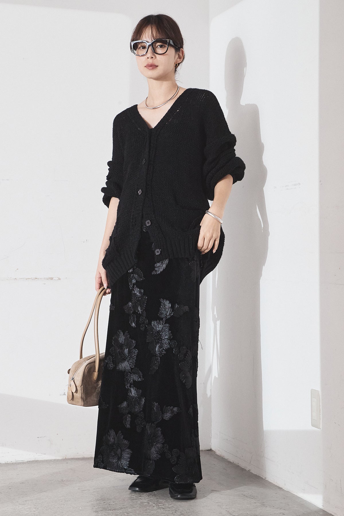 [SET]コード刺繍リラックスニットカーディガン+フラワー刺繍ワイドスカート(2set)