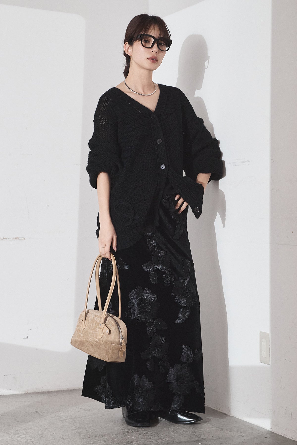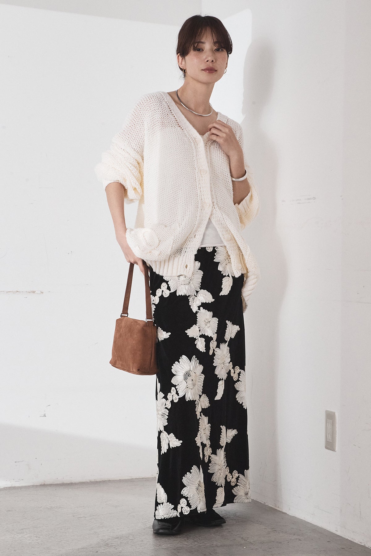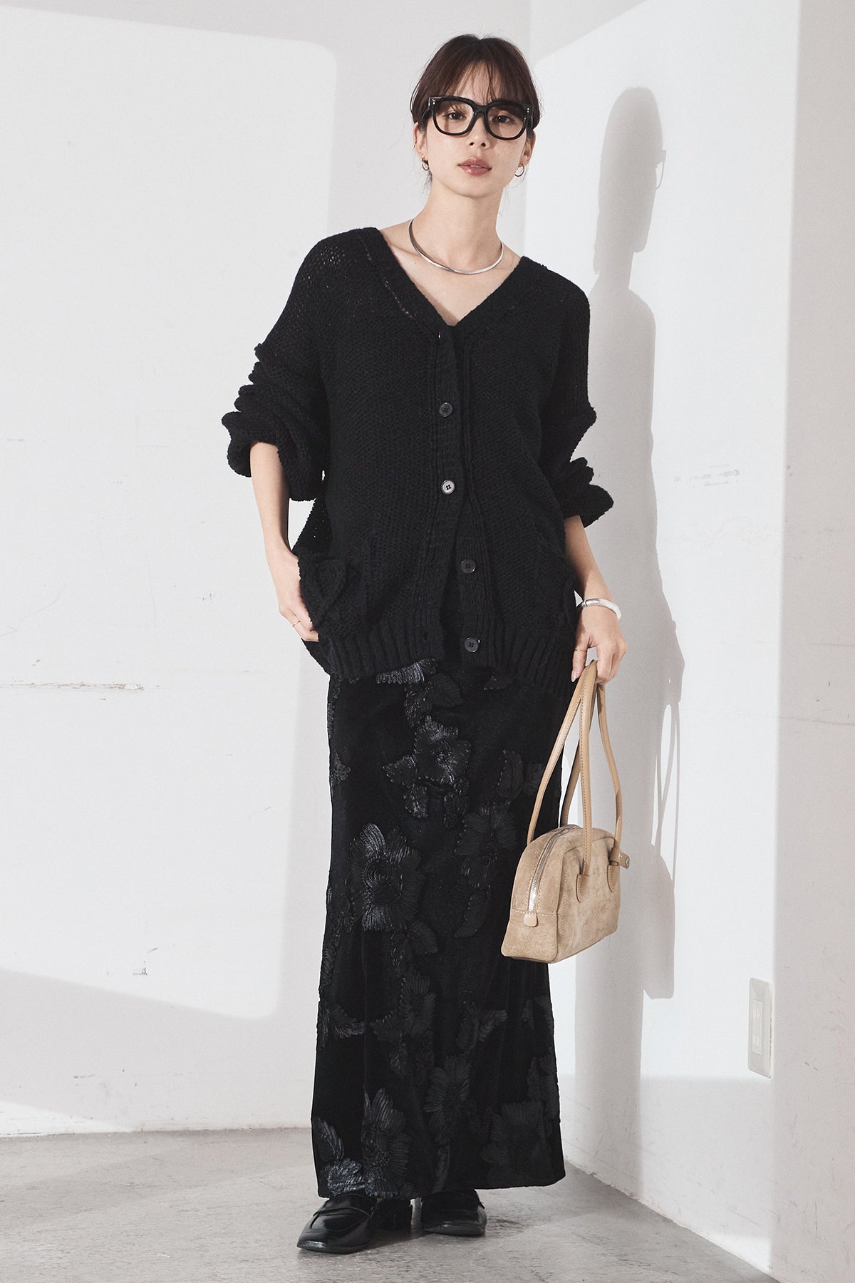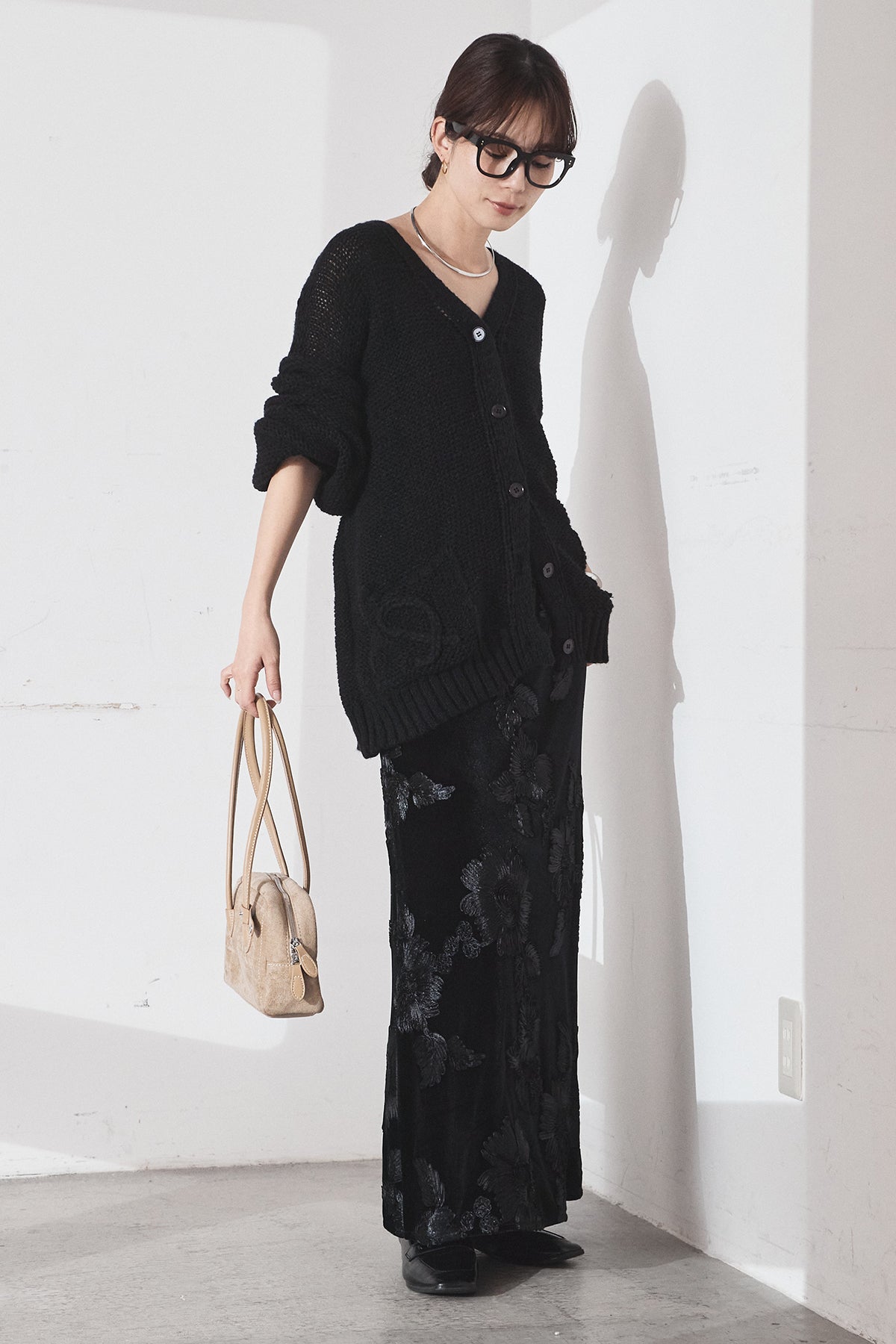 [SET]コード刺繍リラックスニットカーディガン+フラワー刺繍ワイドスカート(2set)