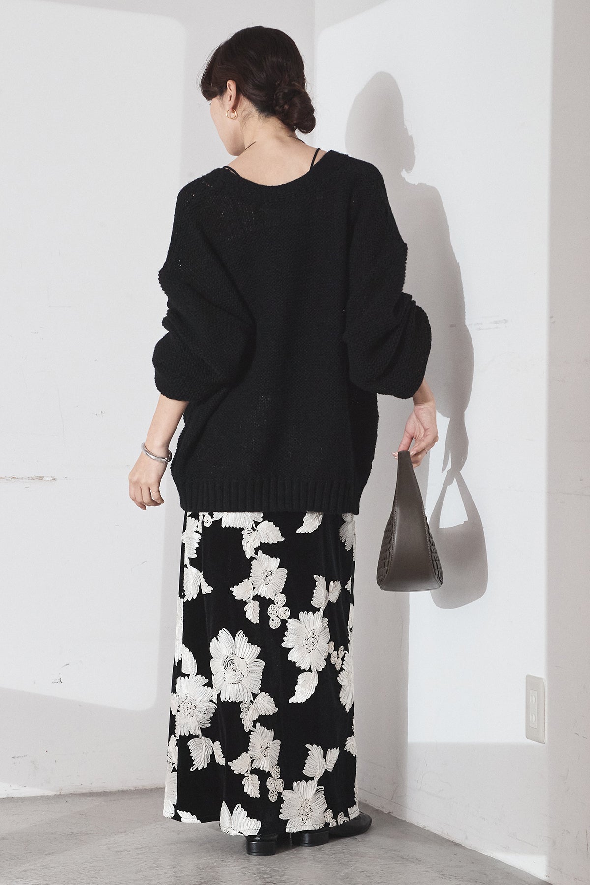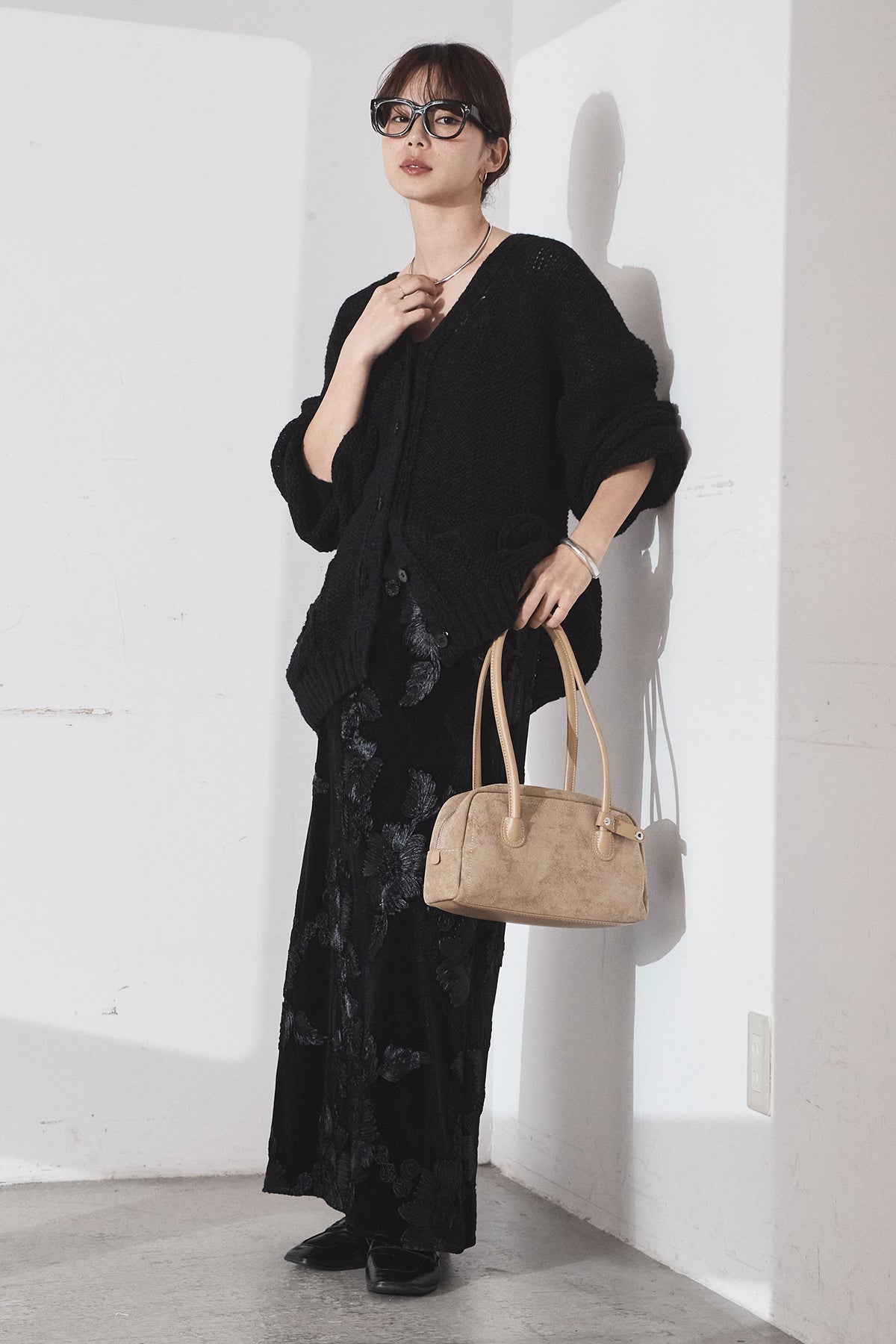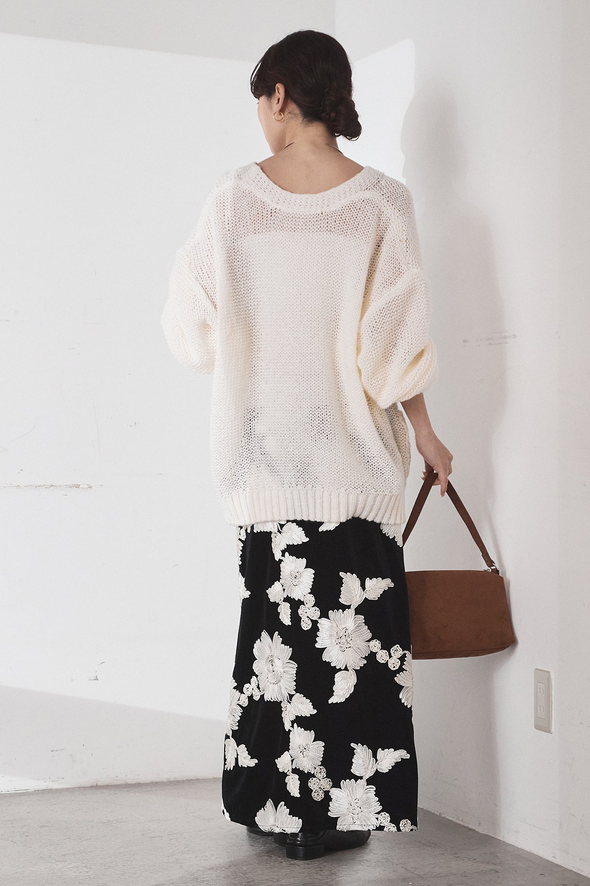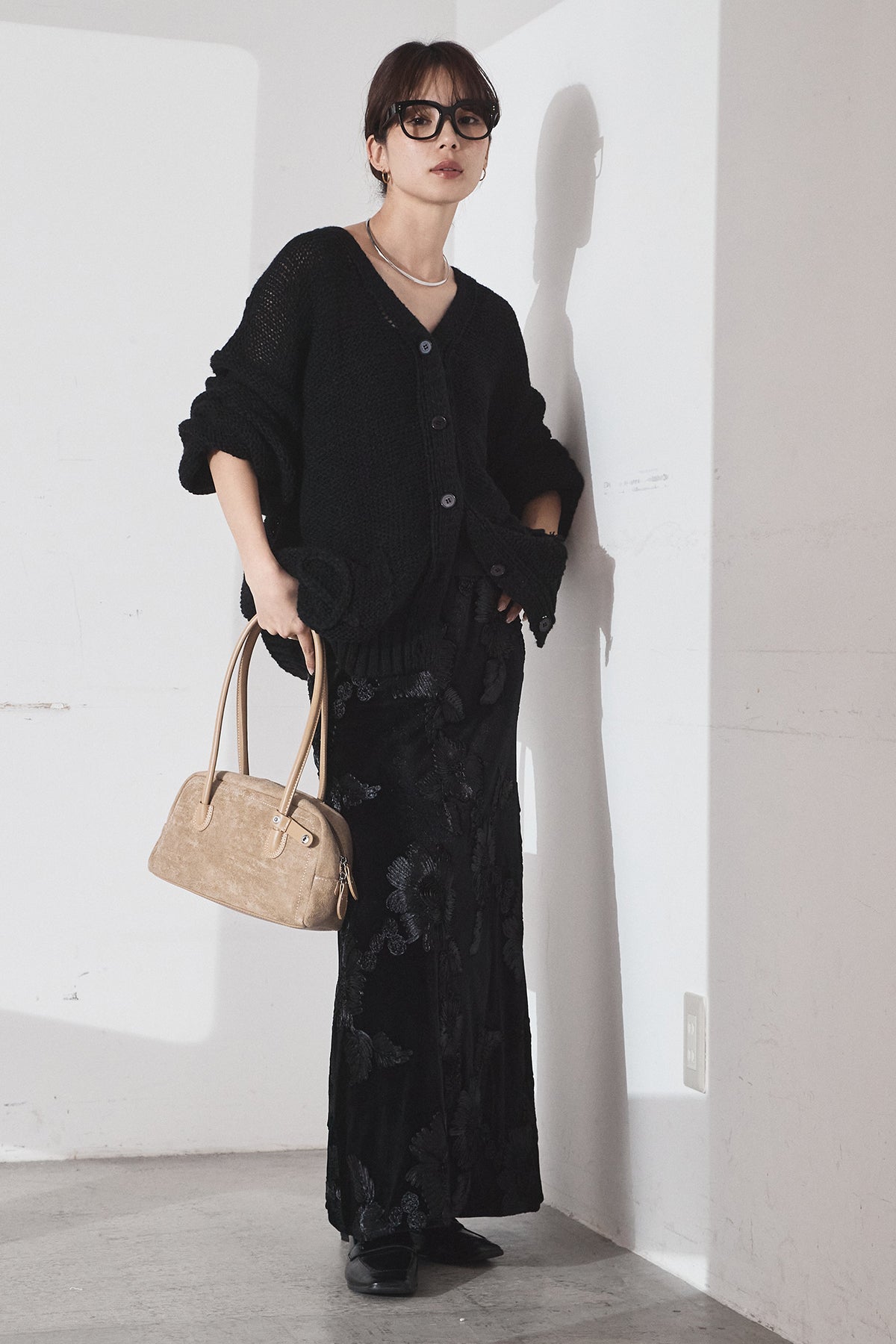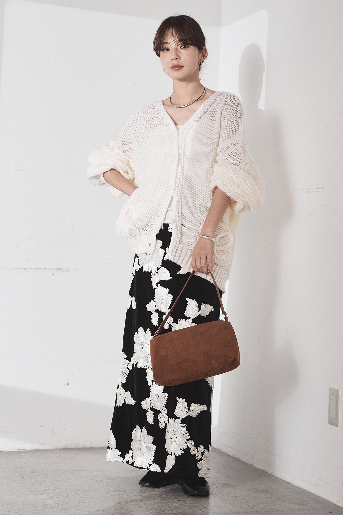 [SET]コード刺繍リラックスニットカーディガン+フラワー刺繍ワイドスカート(2set)