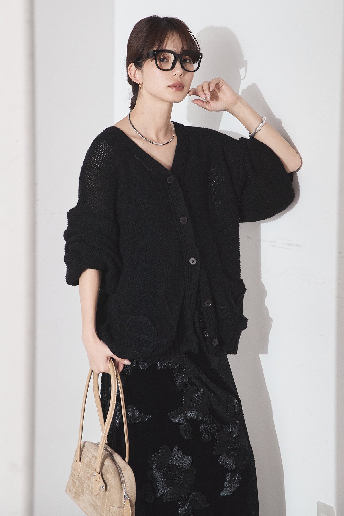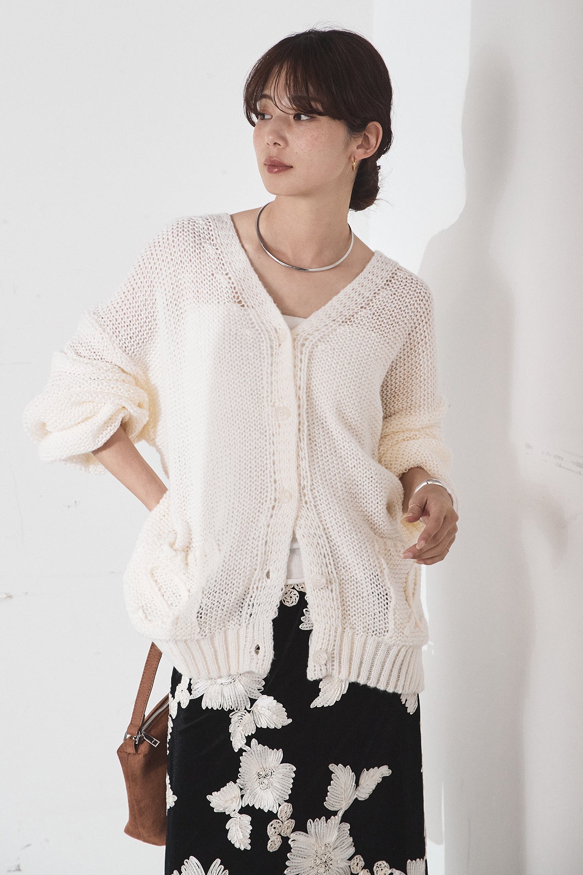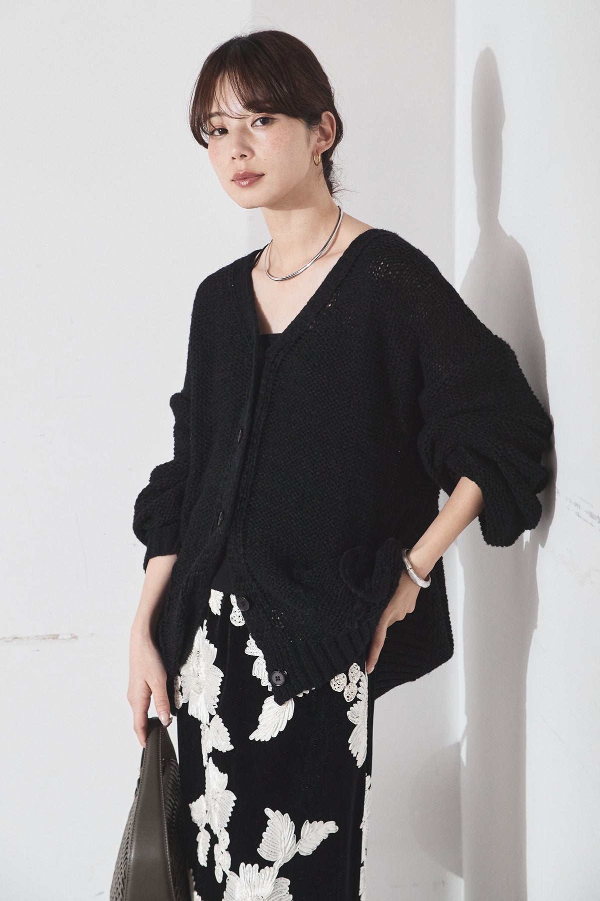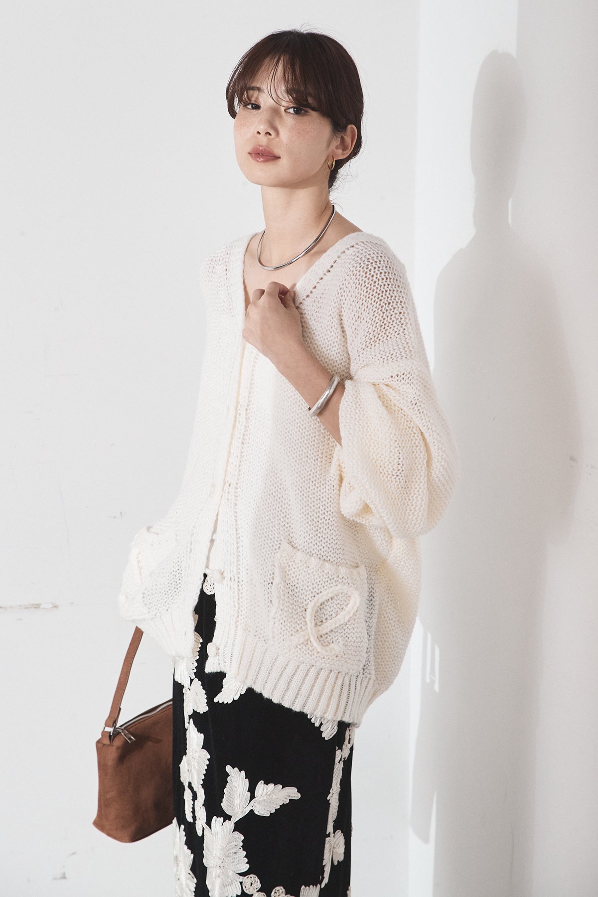 コード刺繍をあしらったリラックス感のあるニットカーディガン。 立体的な刺繍がさりげないアクセントになり、シンプルなスタイリングにも表情を加えます。 ゆとりのあるシルエットで、重ね着しやすく羽織りとして使いやすい一着。 パンツ・スカートどちらにも合わせやすく、デイリーに取り入れやすいアイテムです。