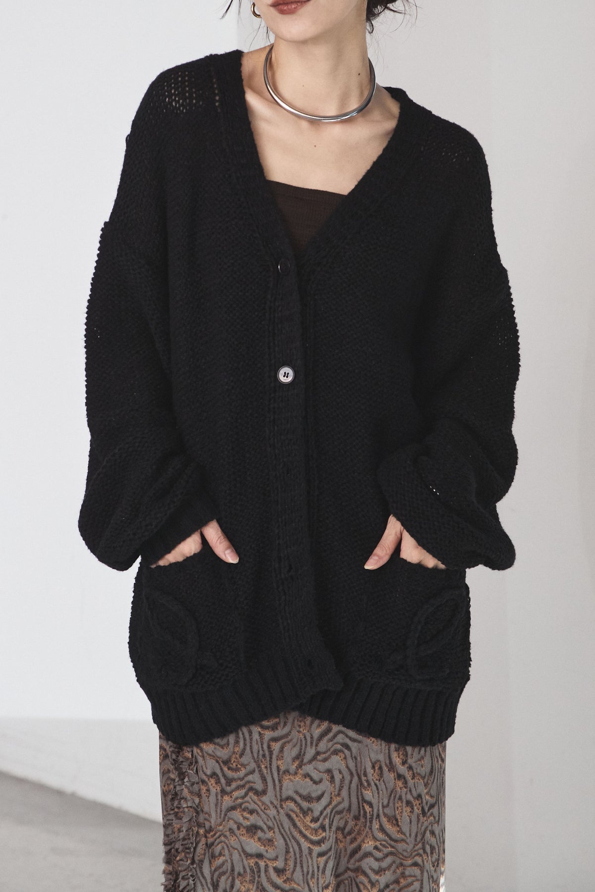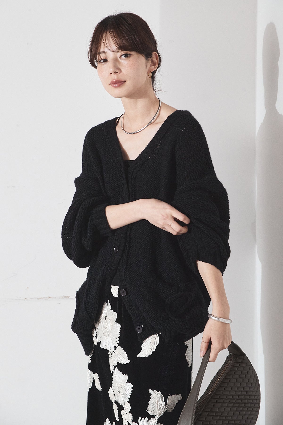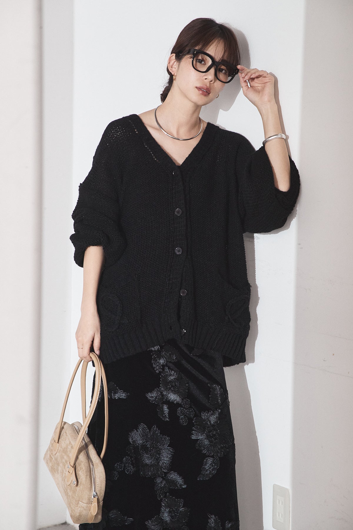 コード刺繍をあしらったリラックス感のあるニットカーディガン。 立体的な刺繍がさりげないアクセントになり、シンプルなスタイリングにも表情を加えます。 ゆとりのあるシルエットで、重ね着しやすく羽織りとして使いやすい一着。 パンツ・スカートどちらにも合わせやすく、デイリーに取り入れやすいアイテムです。