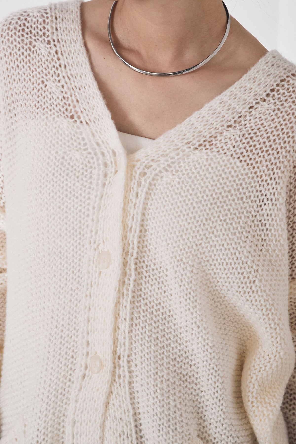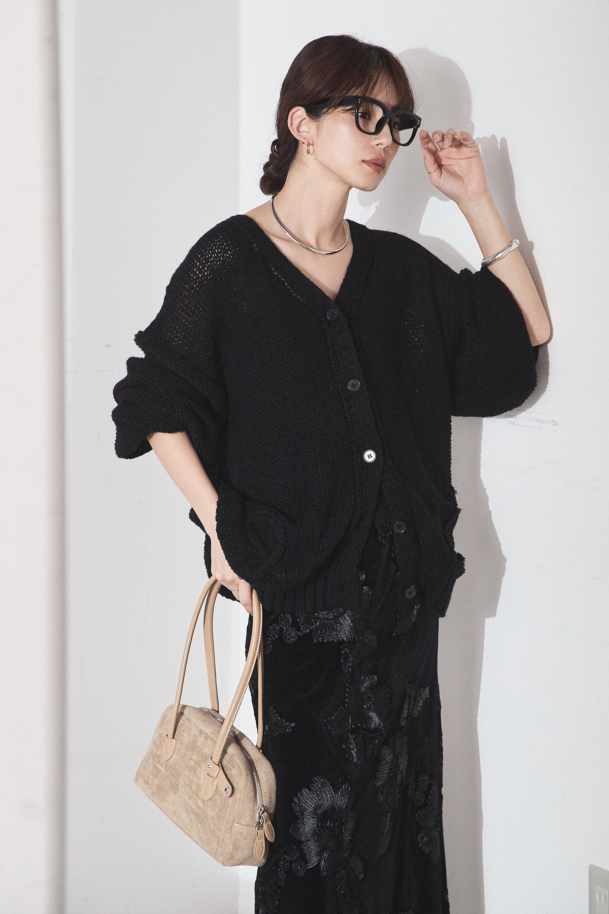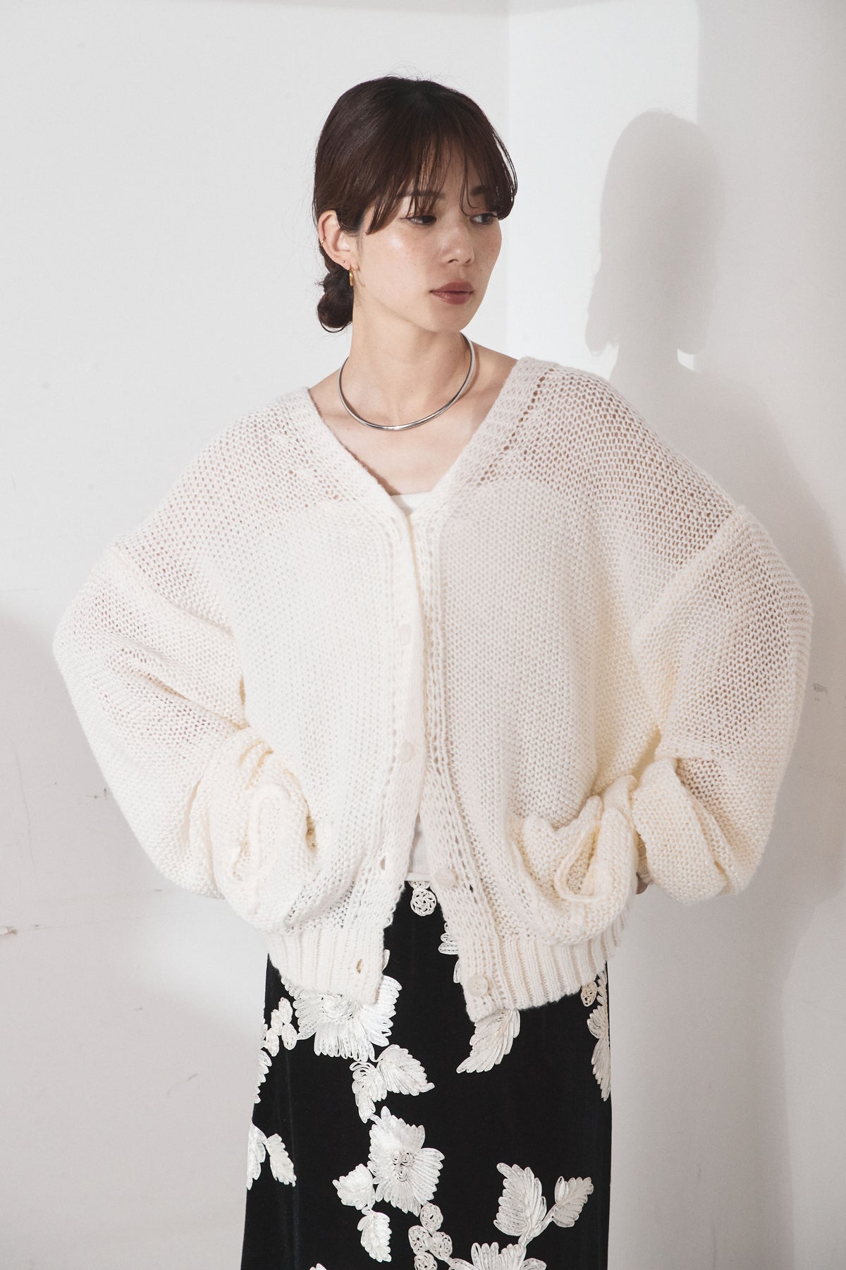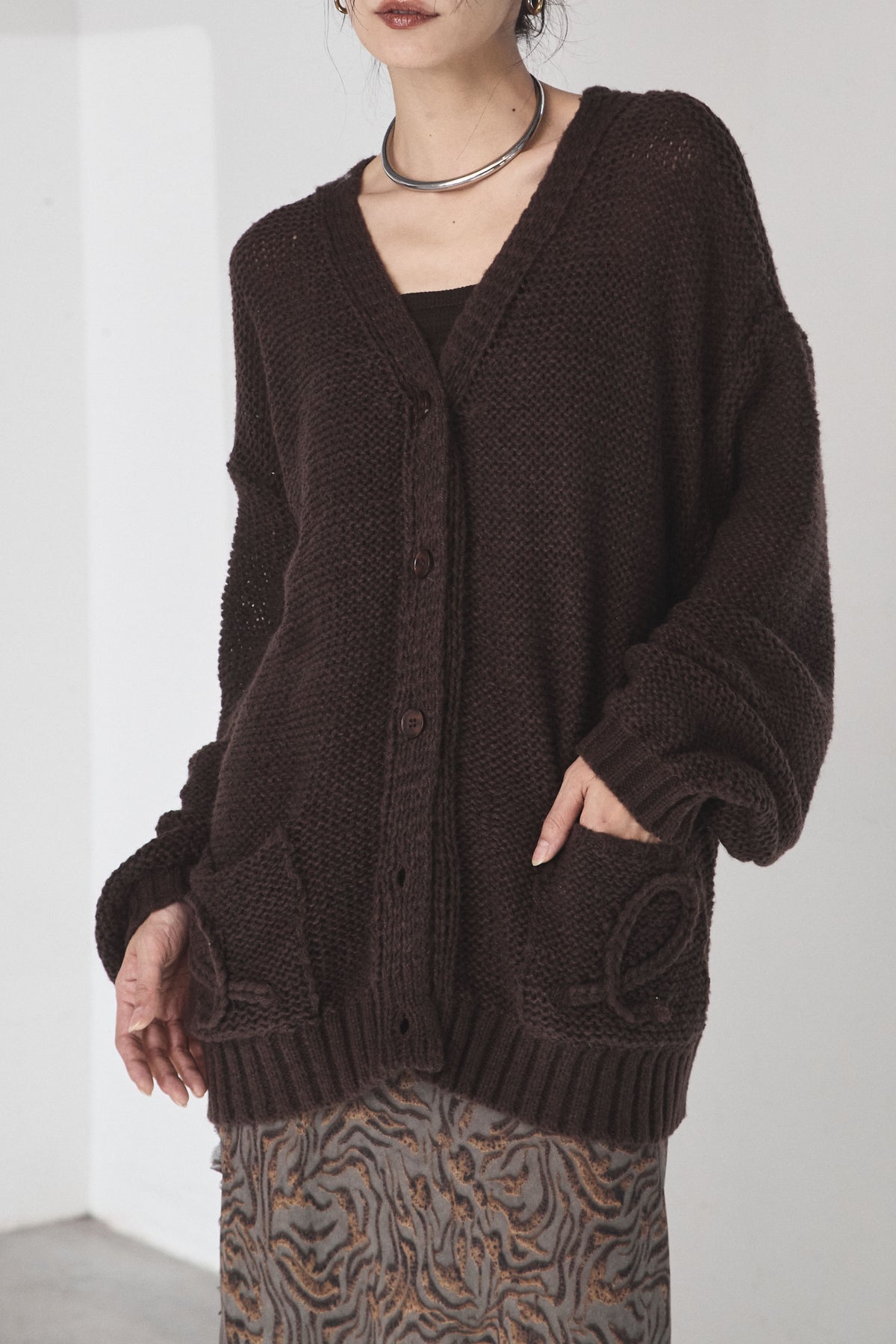 コード刺繍をあしらったリラックス感のあるニットカーディガン。 立体的な刺繍がさりげないアクセントになり、シンプルなスタイリングにも表情を加えます。 ゆとりのあるシルエットで、重ね着しやすく羽織りとして使いやすい一着。 パンツ・スカートどちらにも合わせやすく、デイリーに取り入れやすいアイテムです。