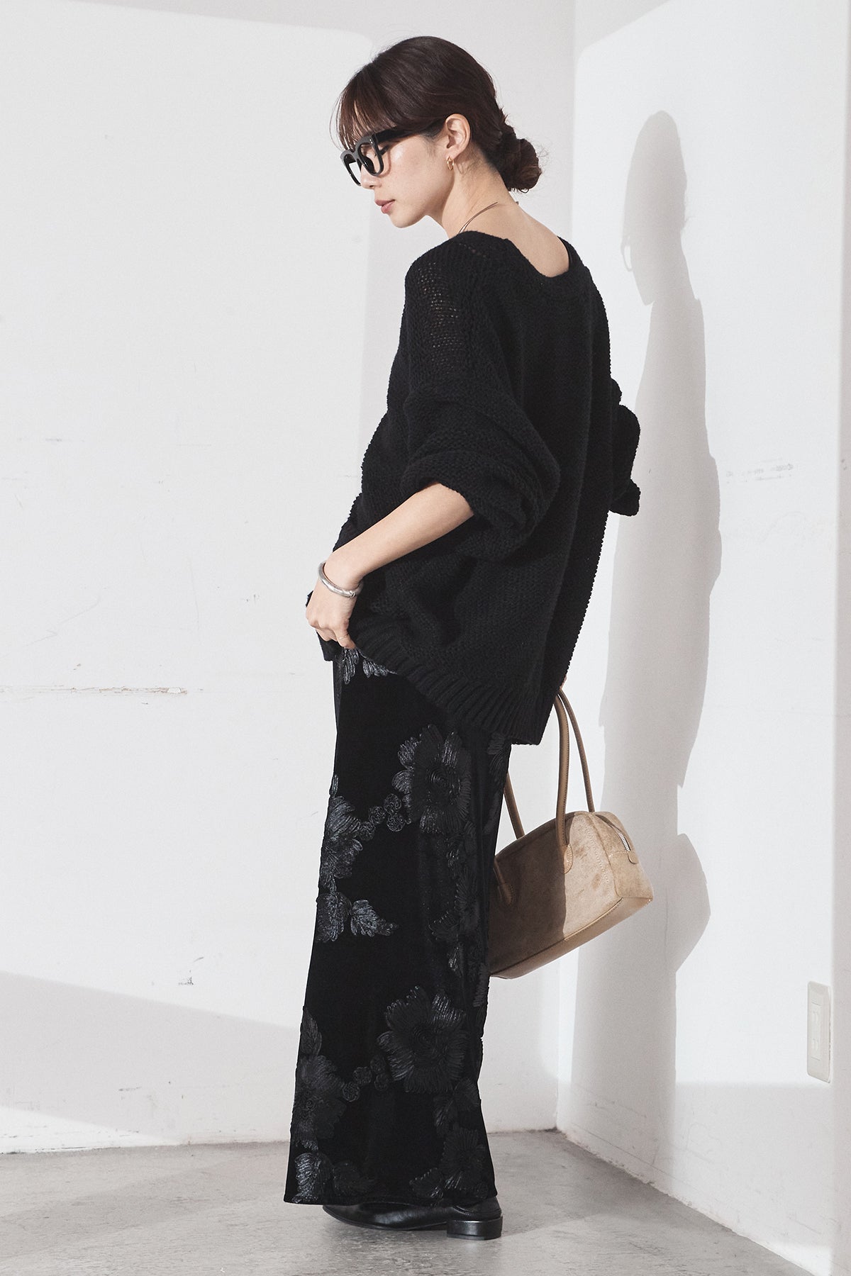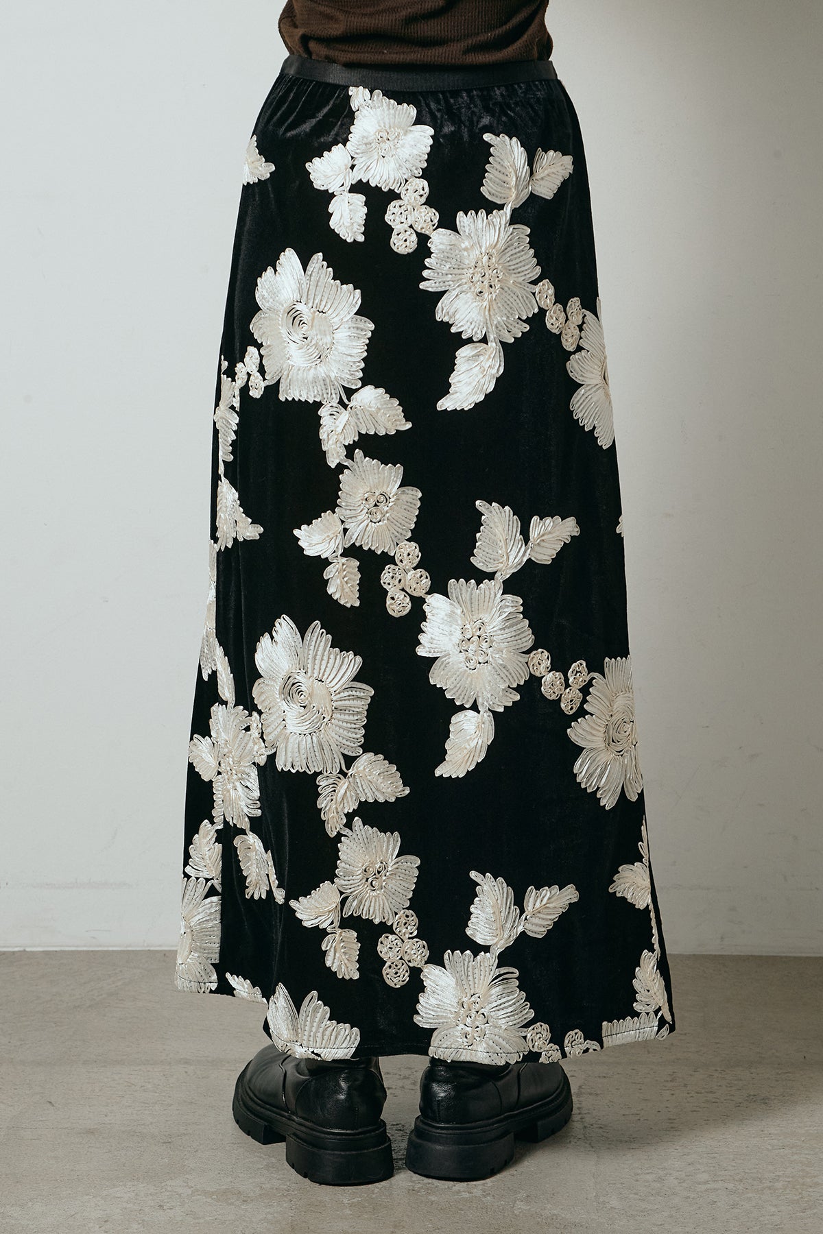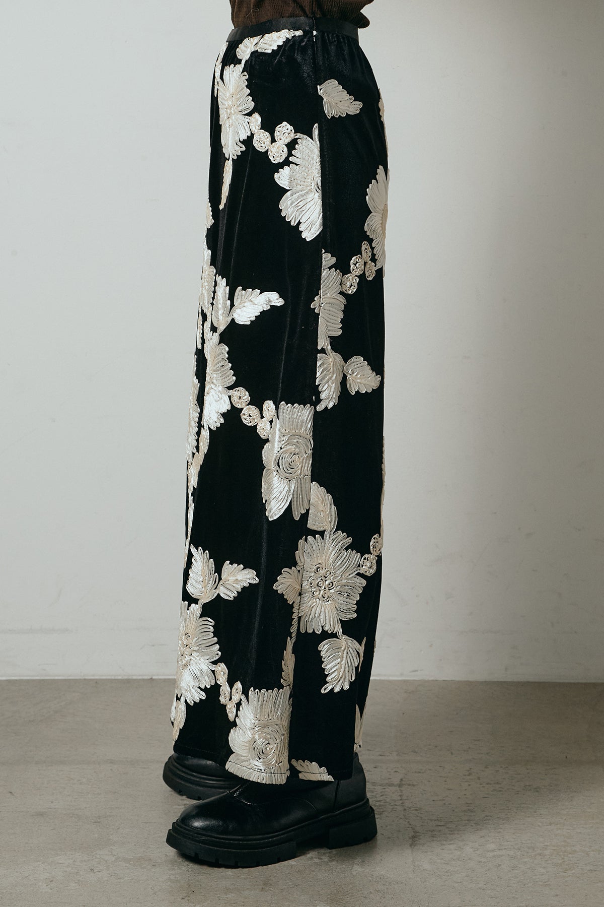立体感のあるフラワー刺繍を贅沢にあしらった、存在感のあるワイドスカート。繊細な刺繍が動くたびに表情を変え、スタイリングに華やかさを添えます。すとんと落ちるシルエットで甘くなりすぎず、大人っぽいバランスに。シンプルなトップスを合わせるだけで、コーディネートが印象的に仕上がる一枚です。