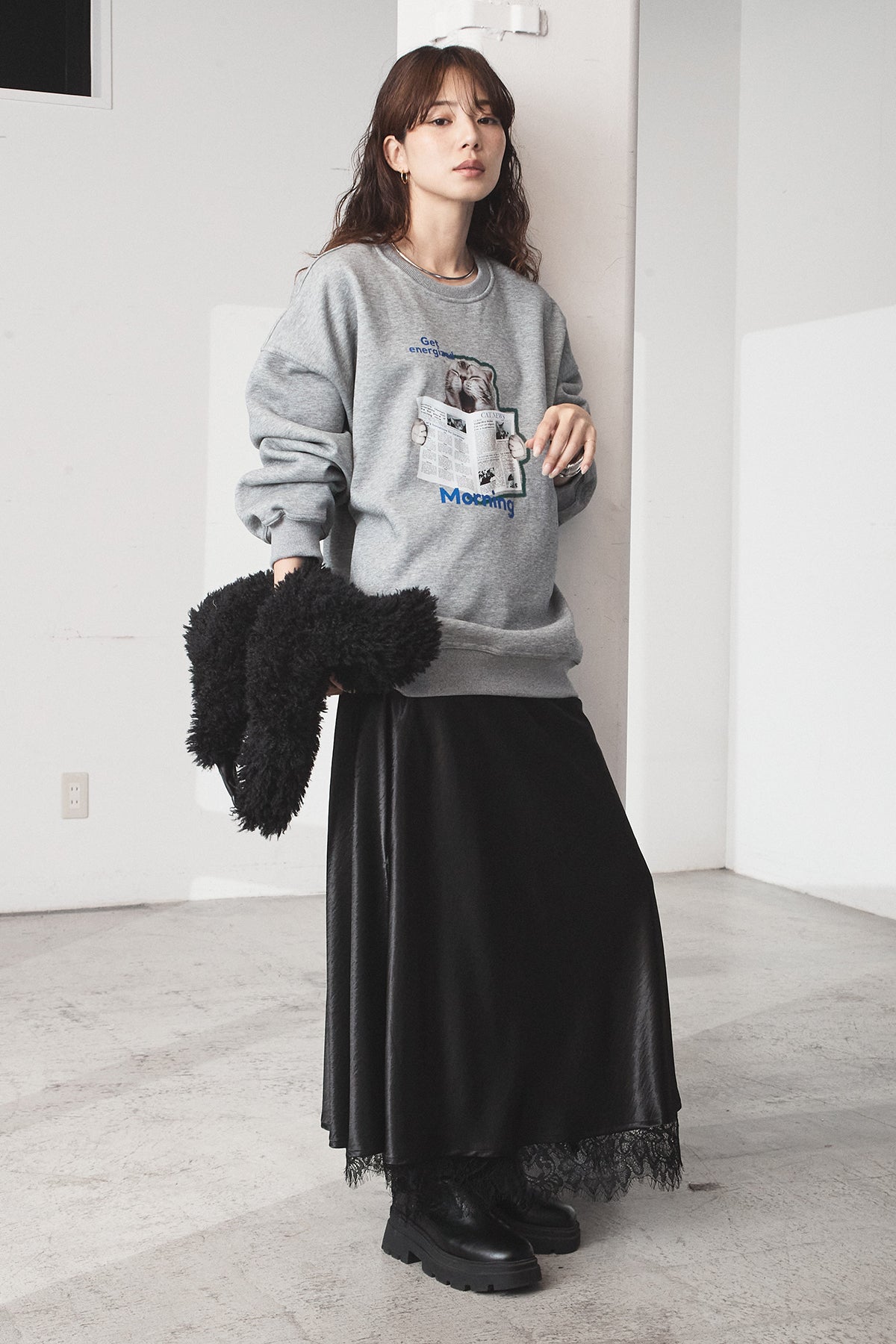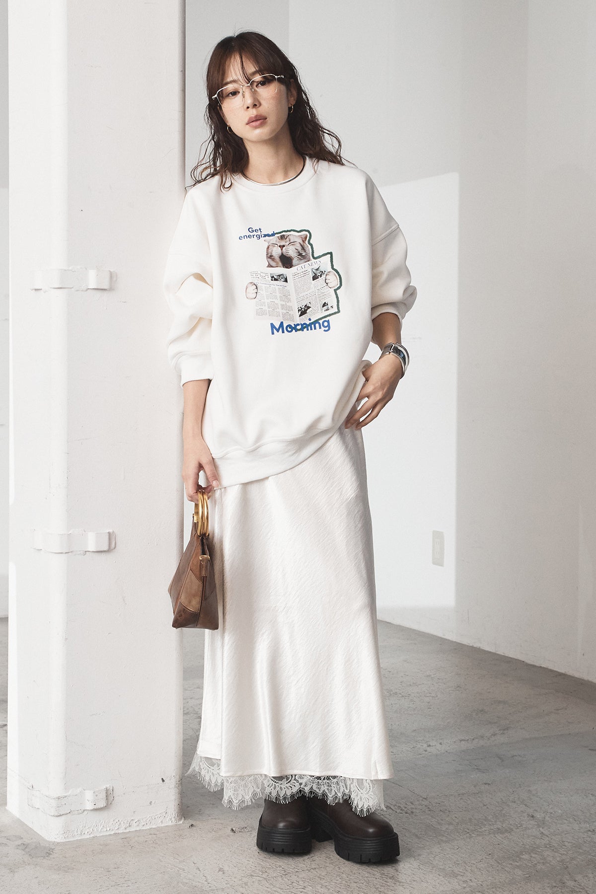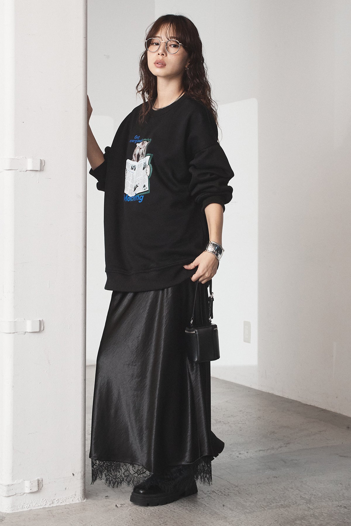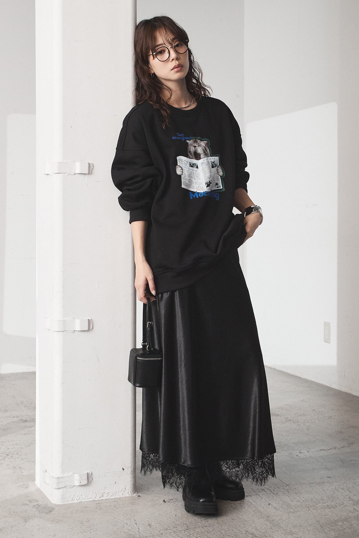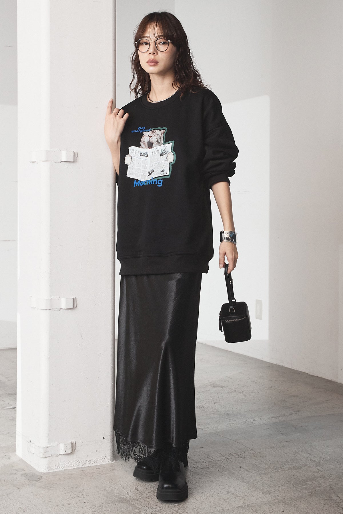 [SET]裏起毛モーニングキャットプリントスウェット+裾レースデザインサテンスカート(2set)
