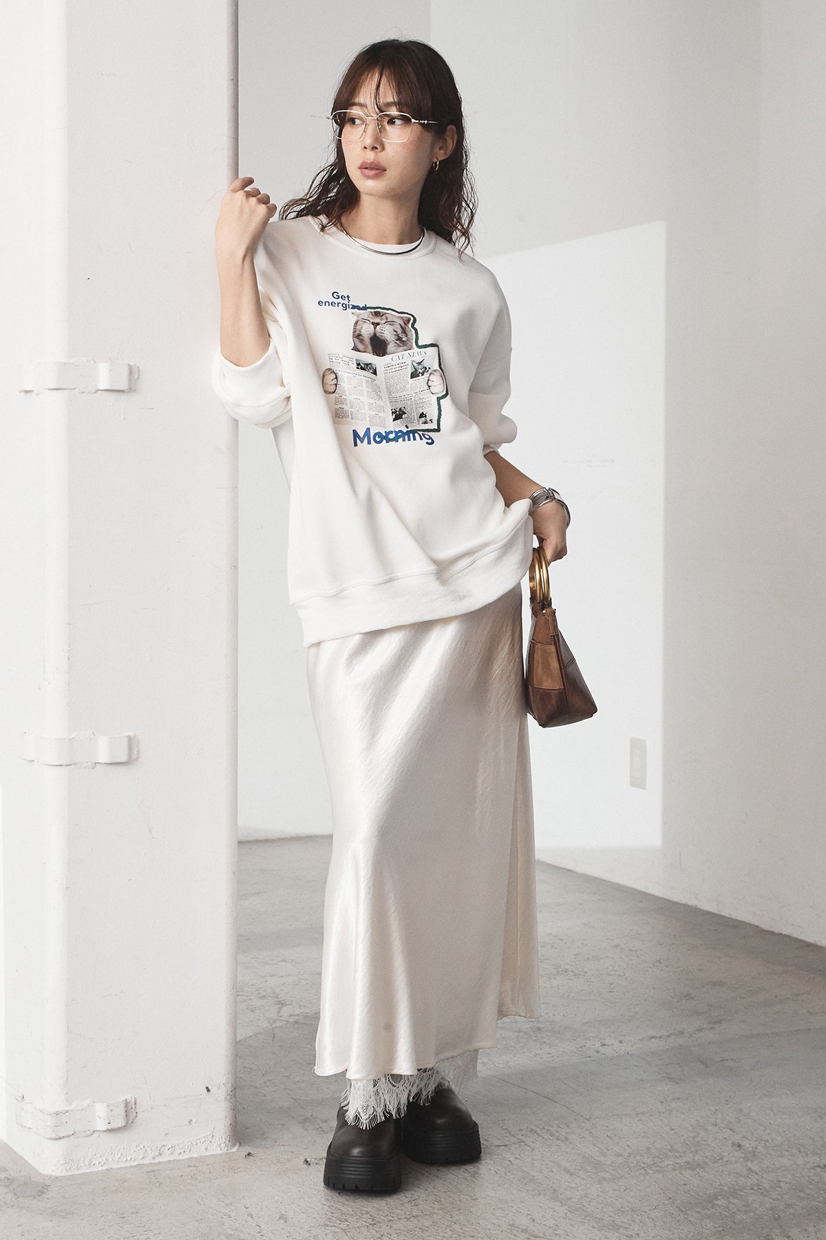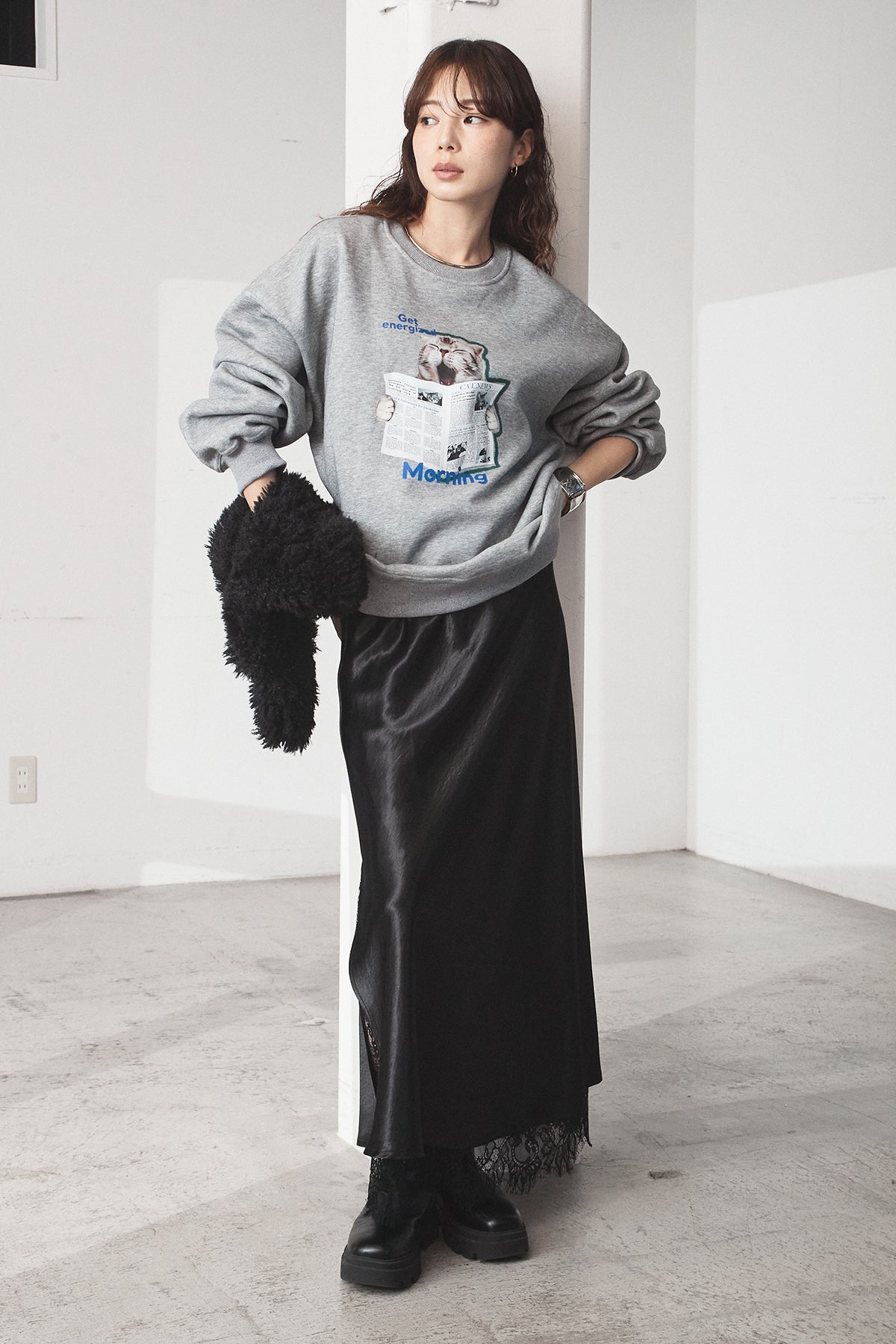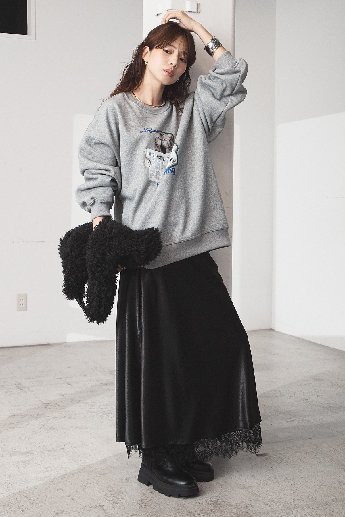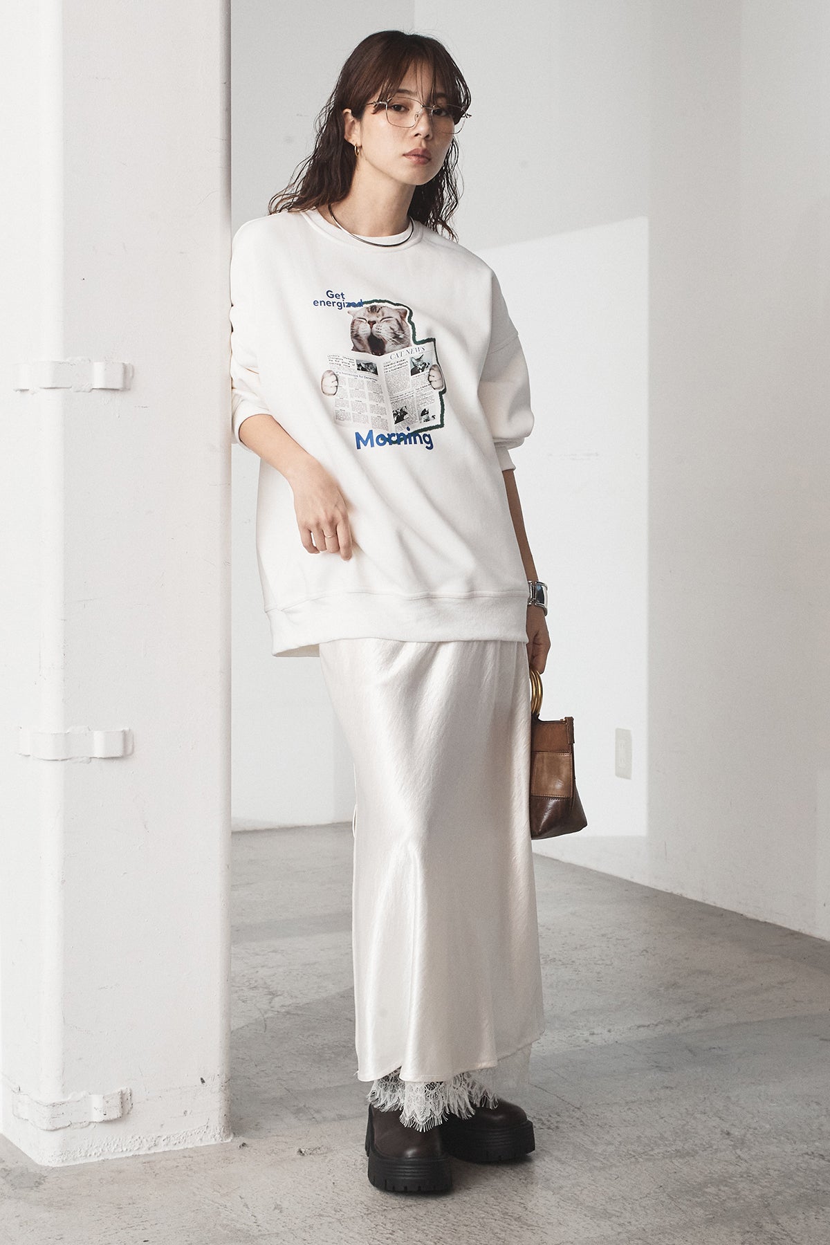 [SET]裏起毛モーニングキャットプリントスウェット+裾レースデザインサテンスカート(2set)