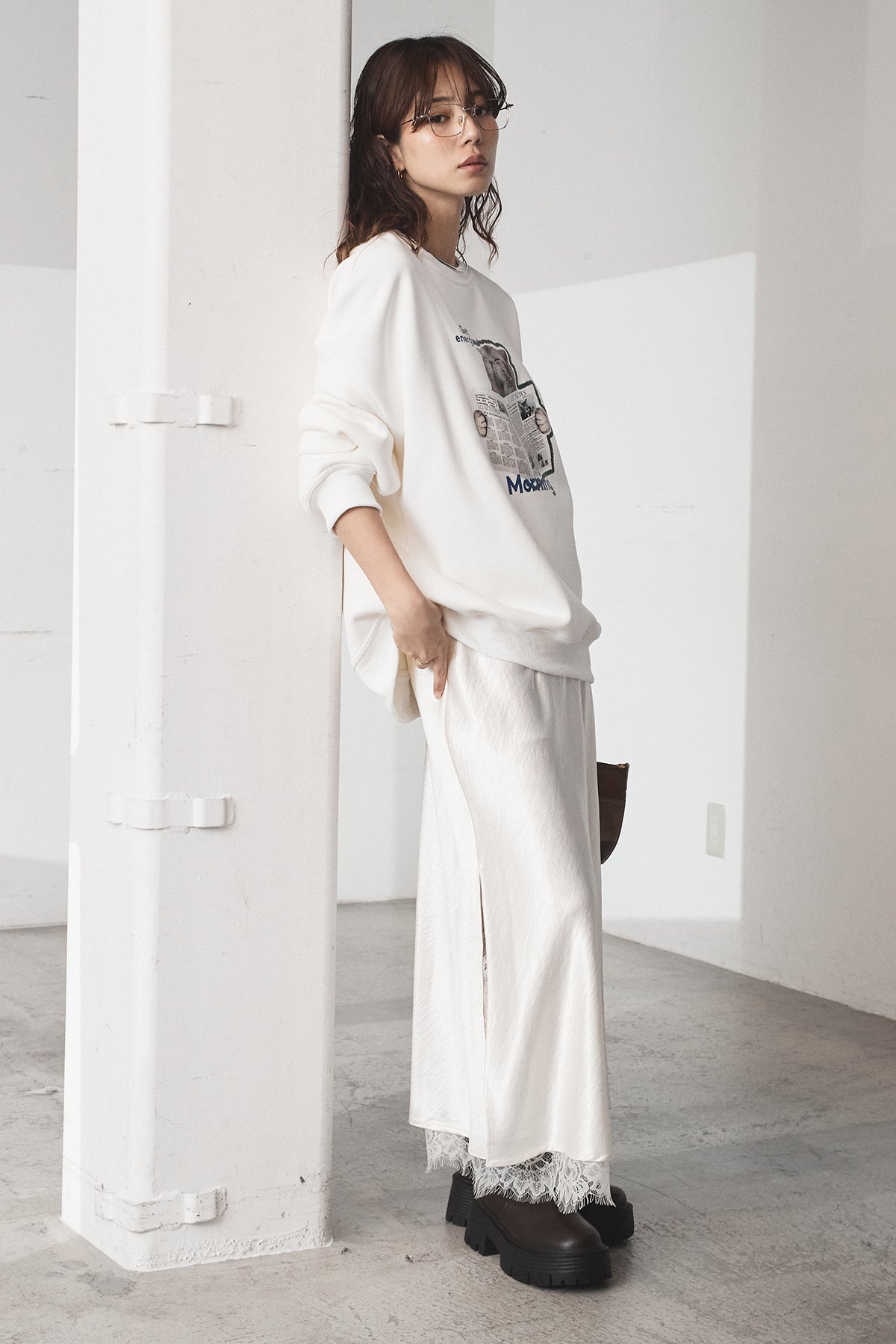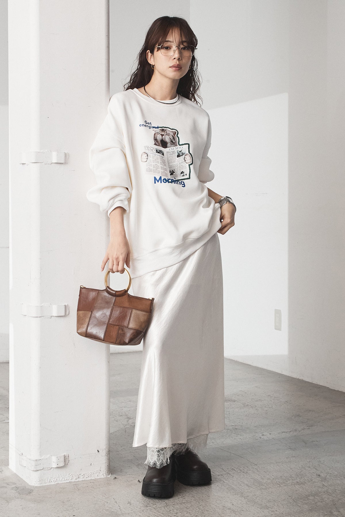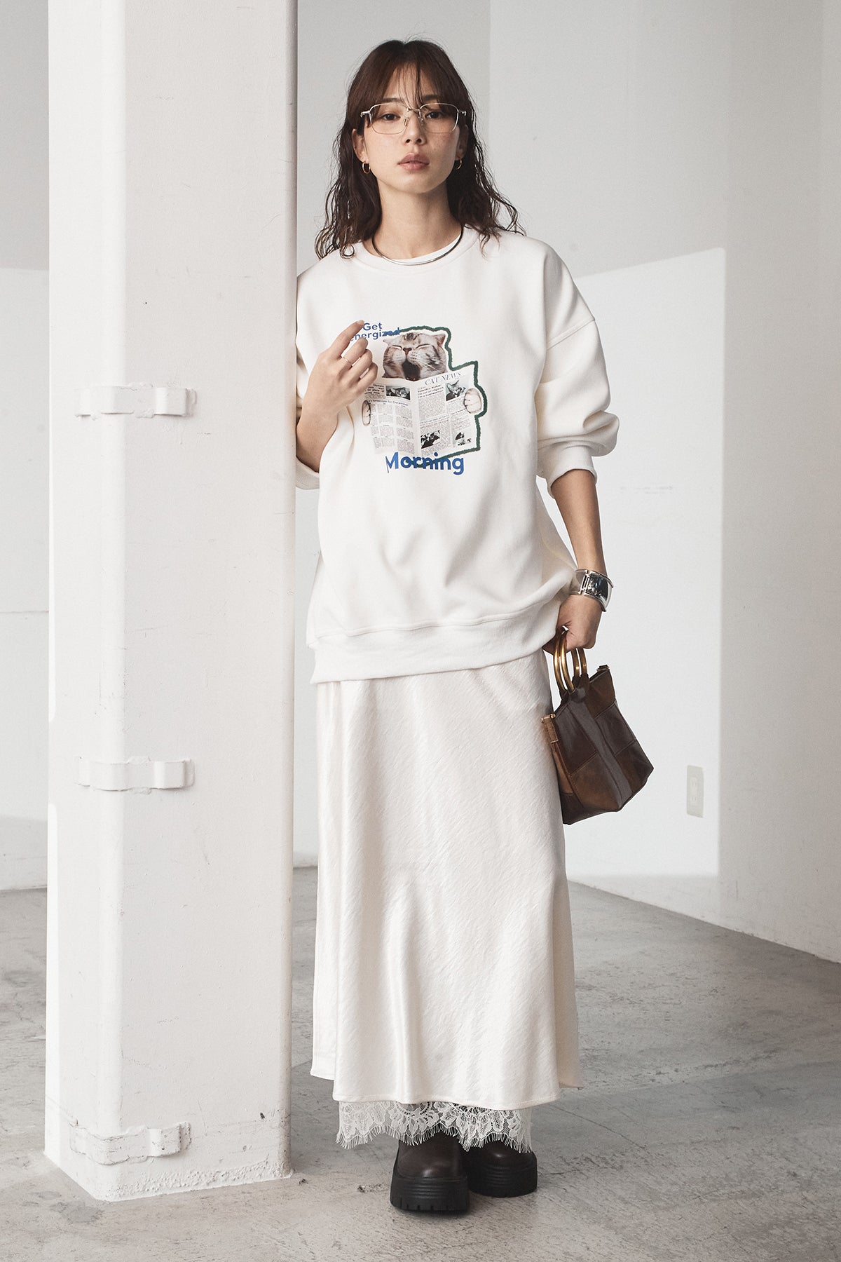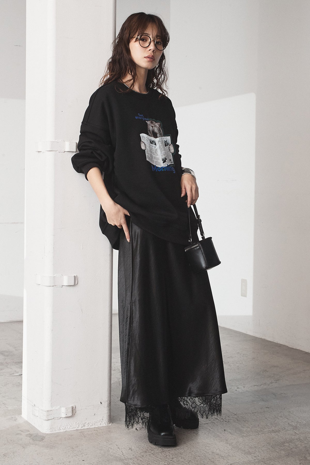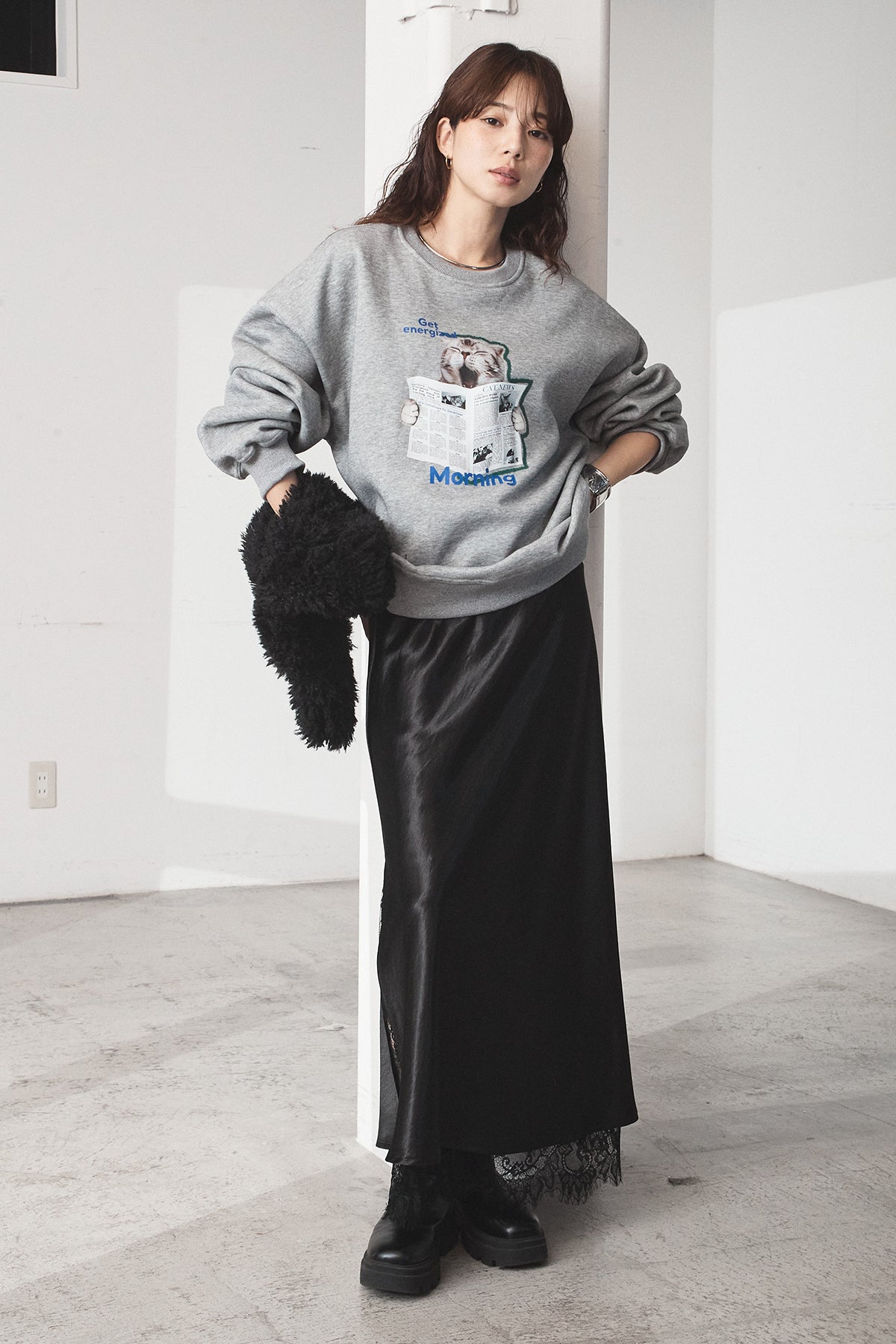[SET]裏起毛モーニングキャットプリントスウェット+裾レースデザインサテンスカート(2set)
