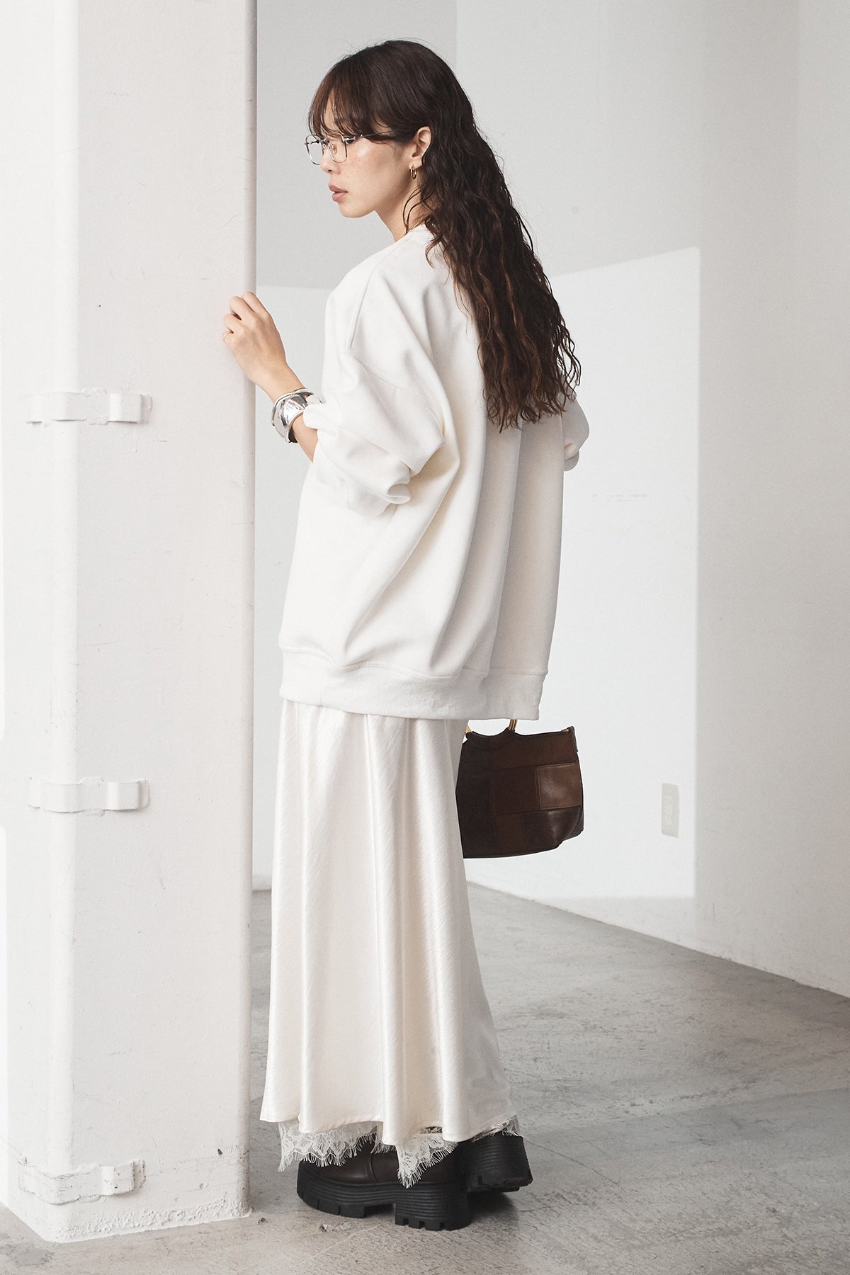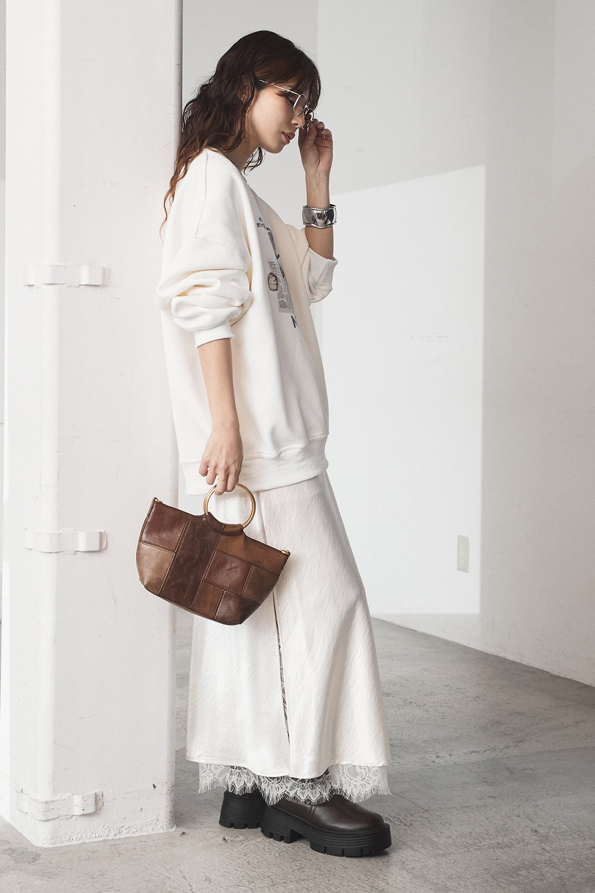 上品な光沢のあるサテン素材に、裾のレースディテールを組み合わせたデザインスカート。なめらかに落ちるシルエットが女性らしい動きを演出し、歩くたびにさりげない華やかさを添えます。甘くなりすぎないバランスで、ニットやカジュアルなトップスとも好相性。スタイリングに抜け感と品の良さをプラスしてくれる一枚です。