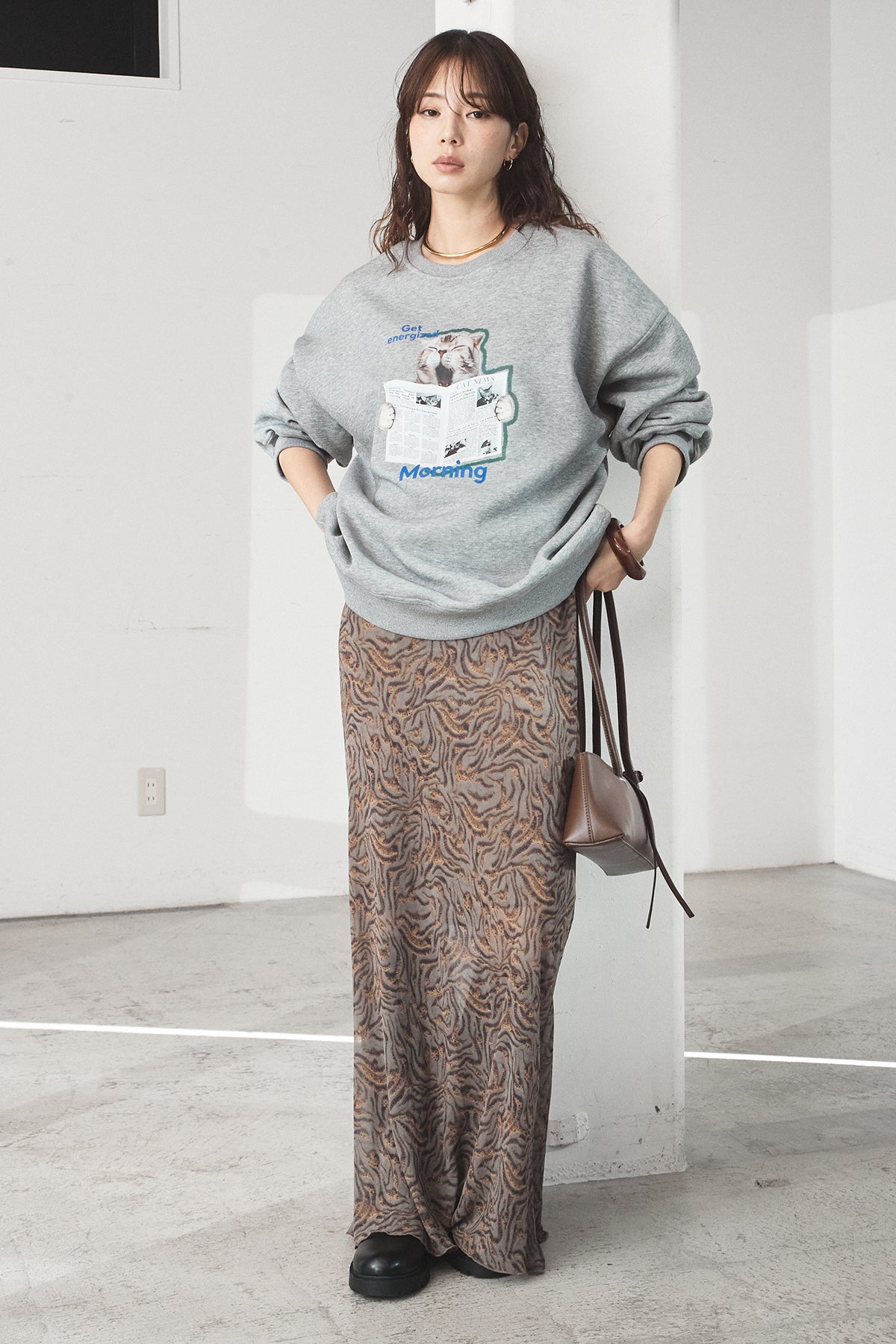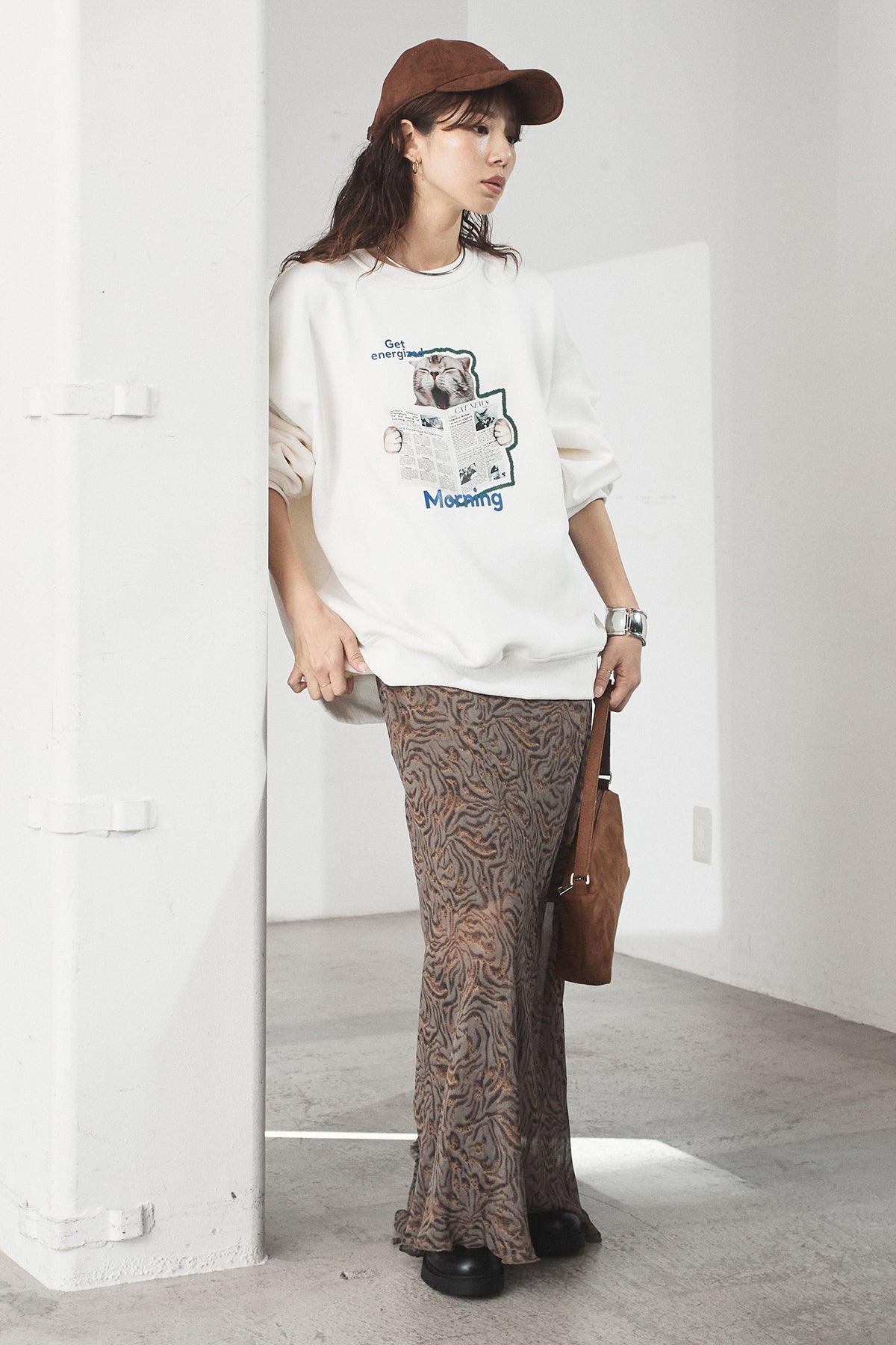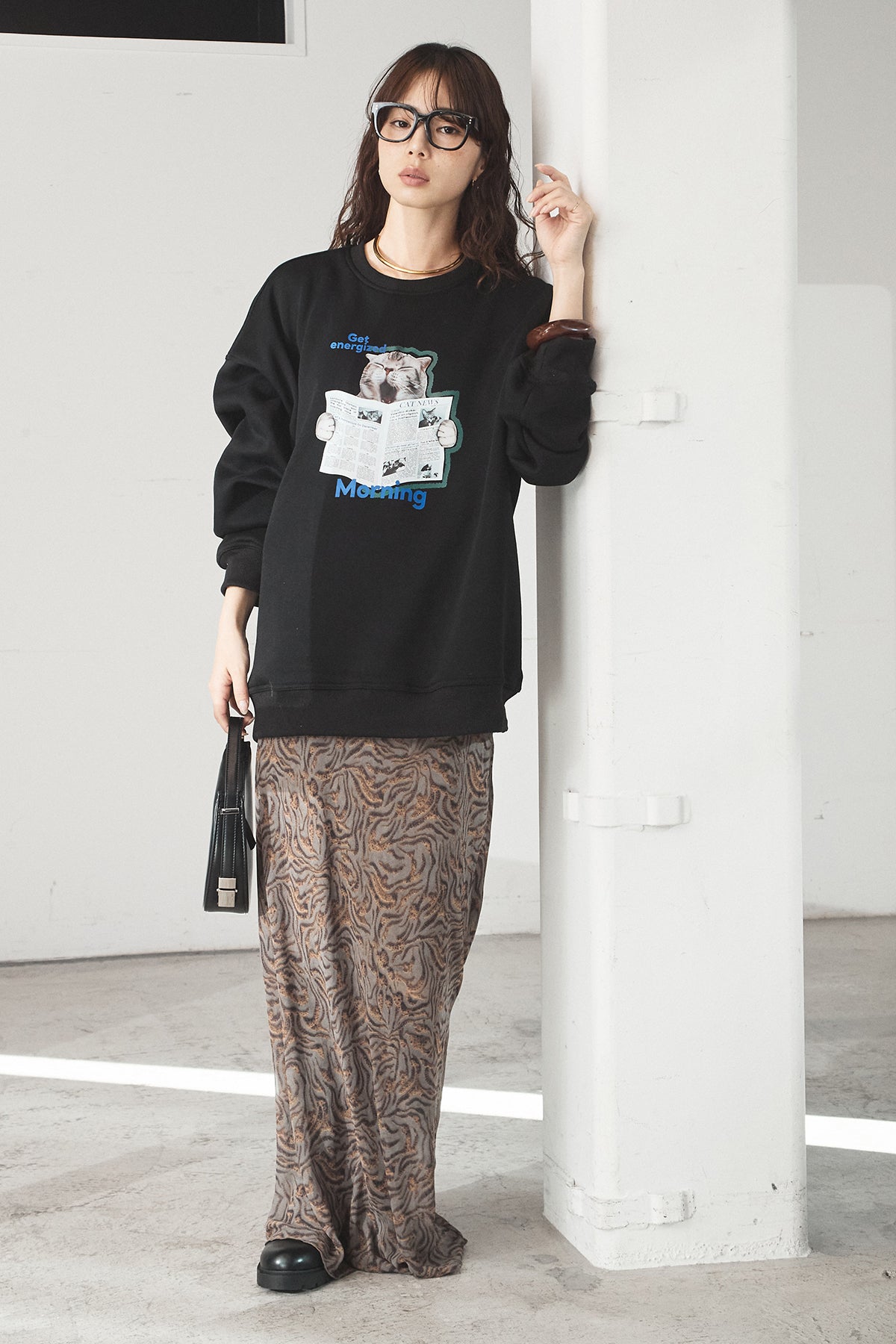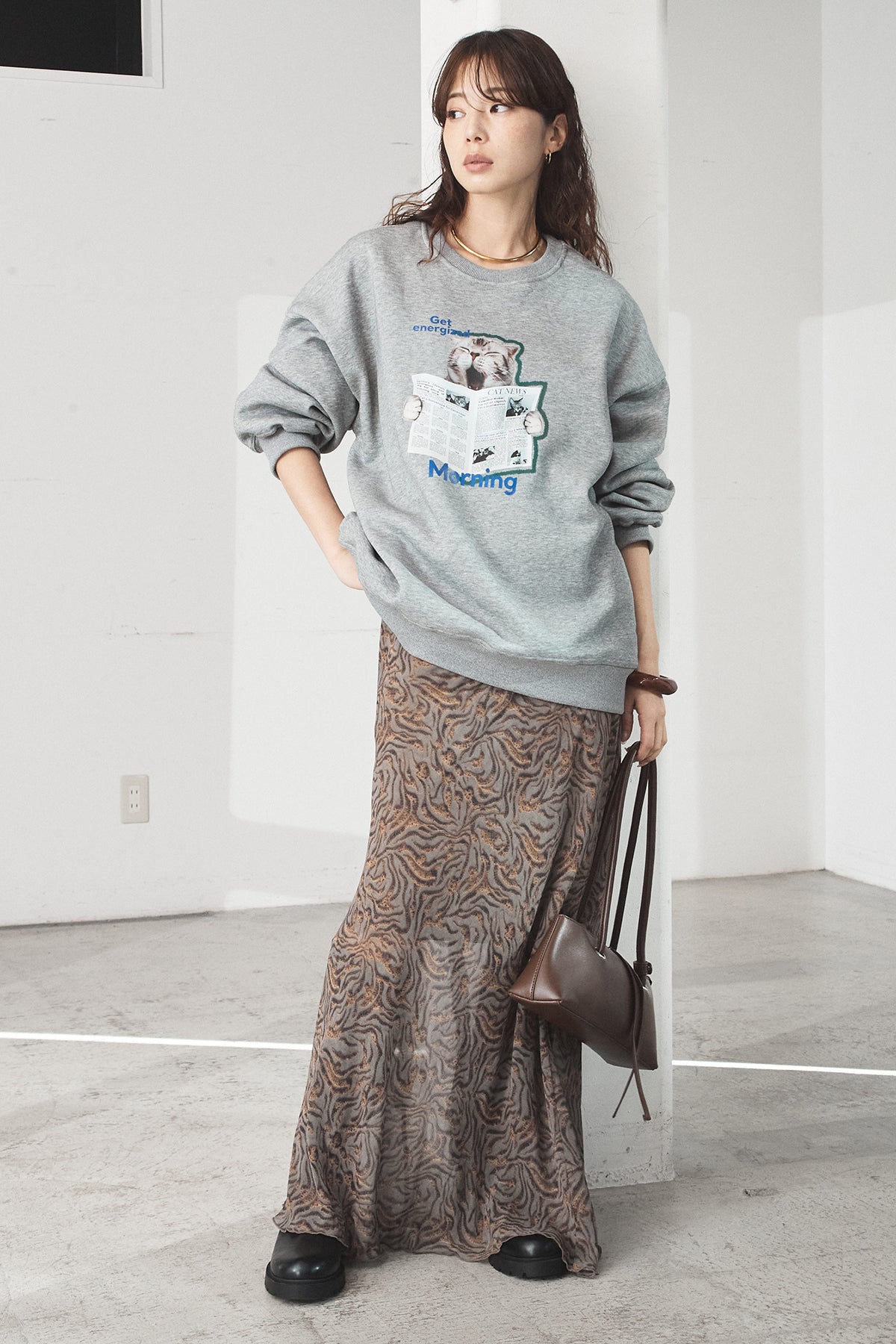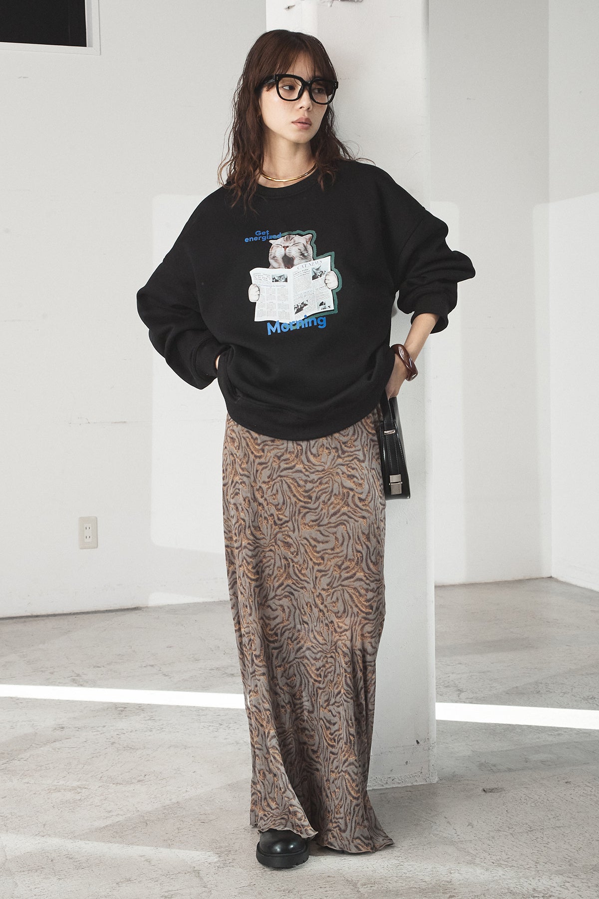 [SET]裏起毛モーニングキャットプリントスウェット+抽象柄ロングスカート(2set)