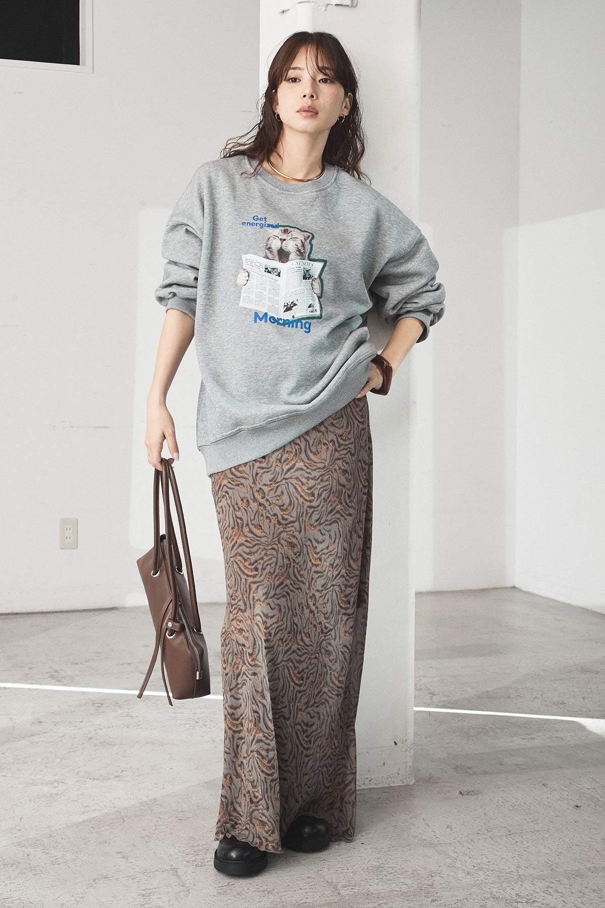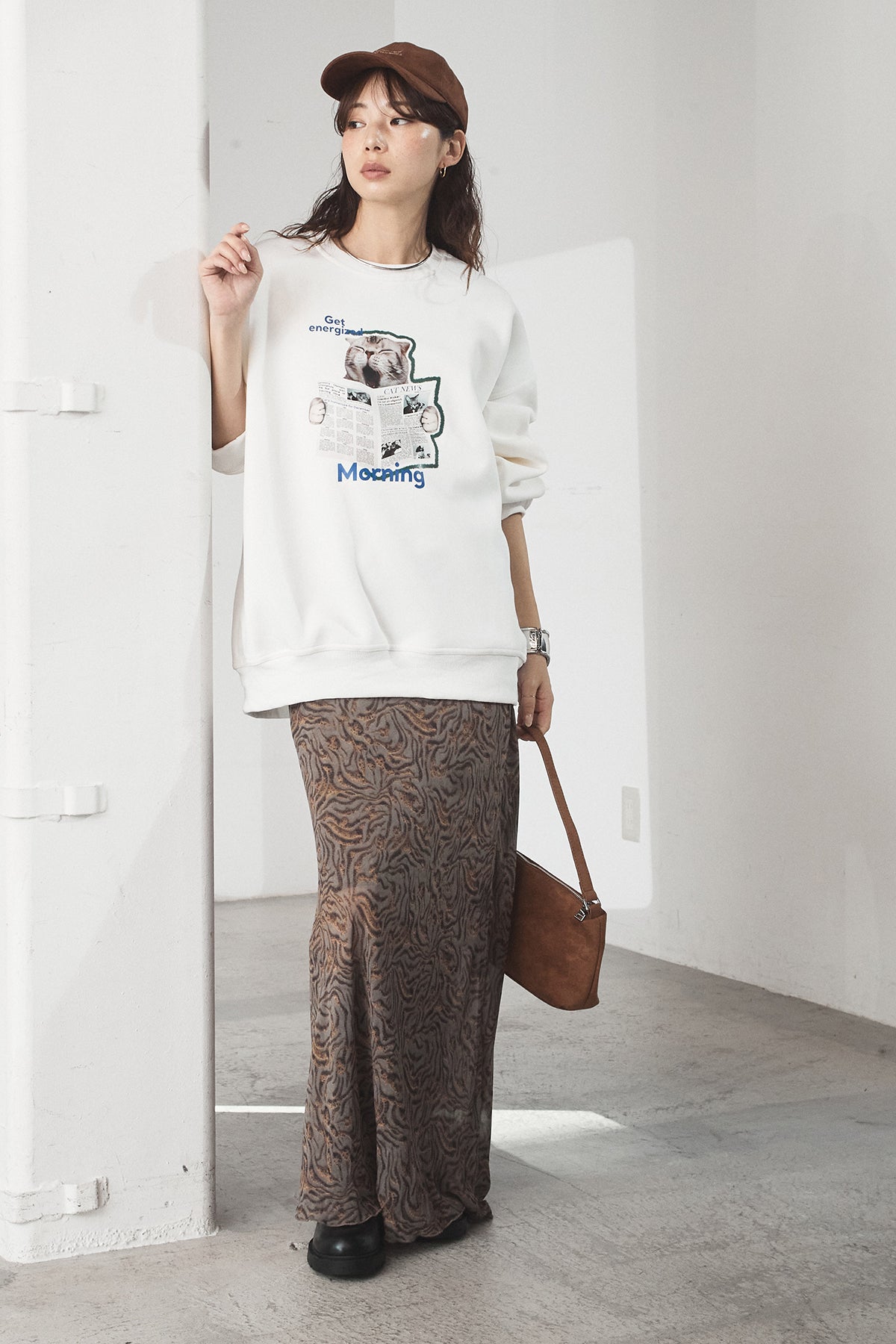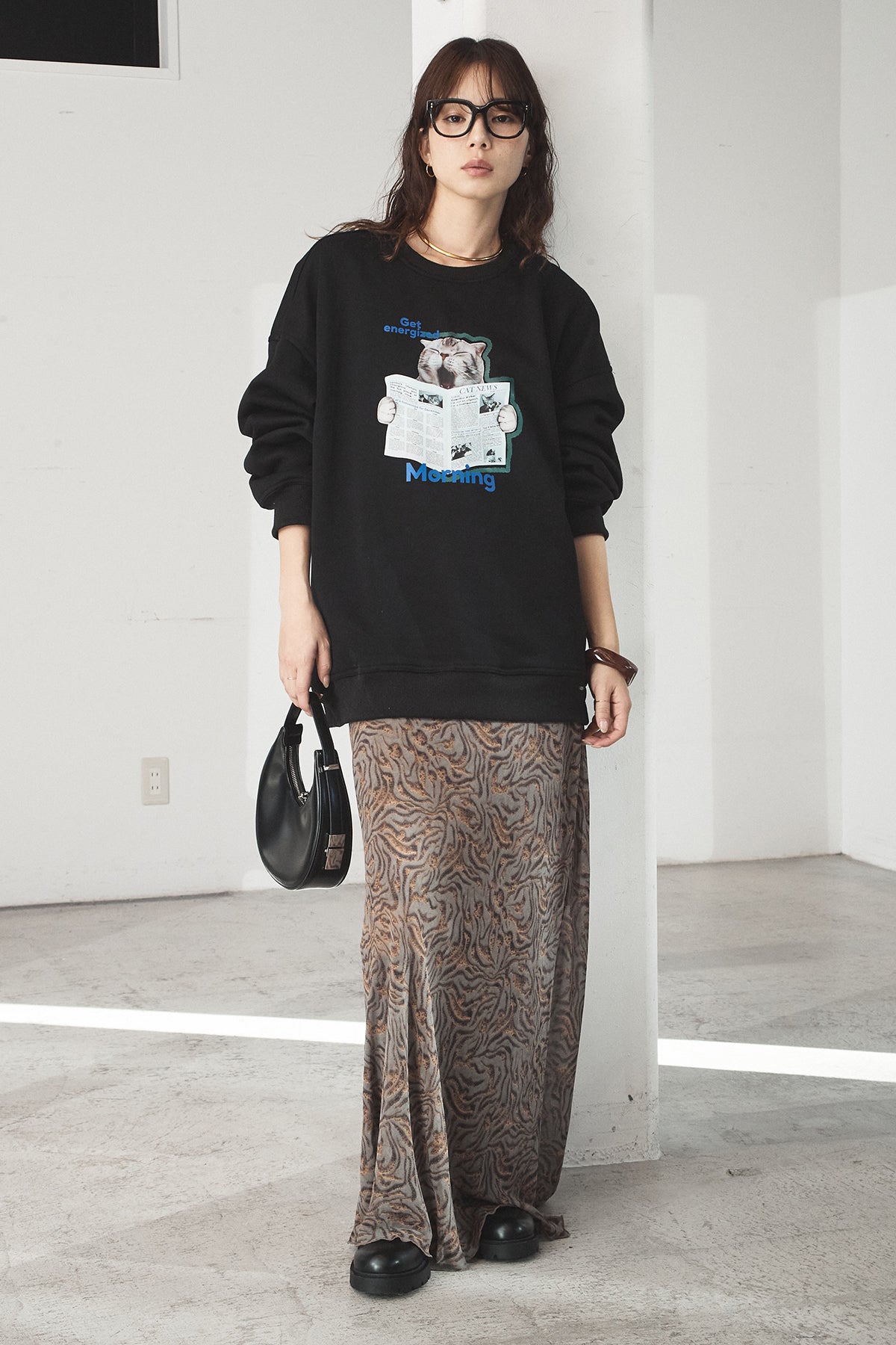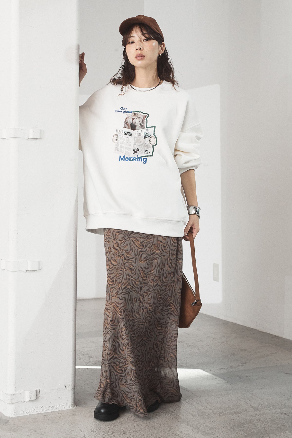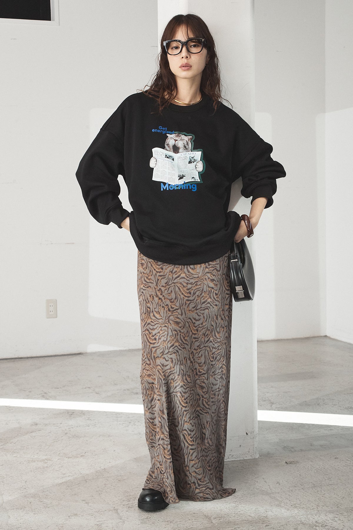 [SET]裏起毛モーニングキャットプリントスウェット+抽象柄ロングスカート(2set)