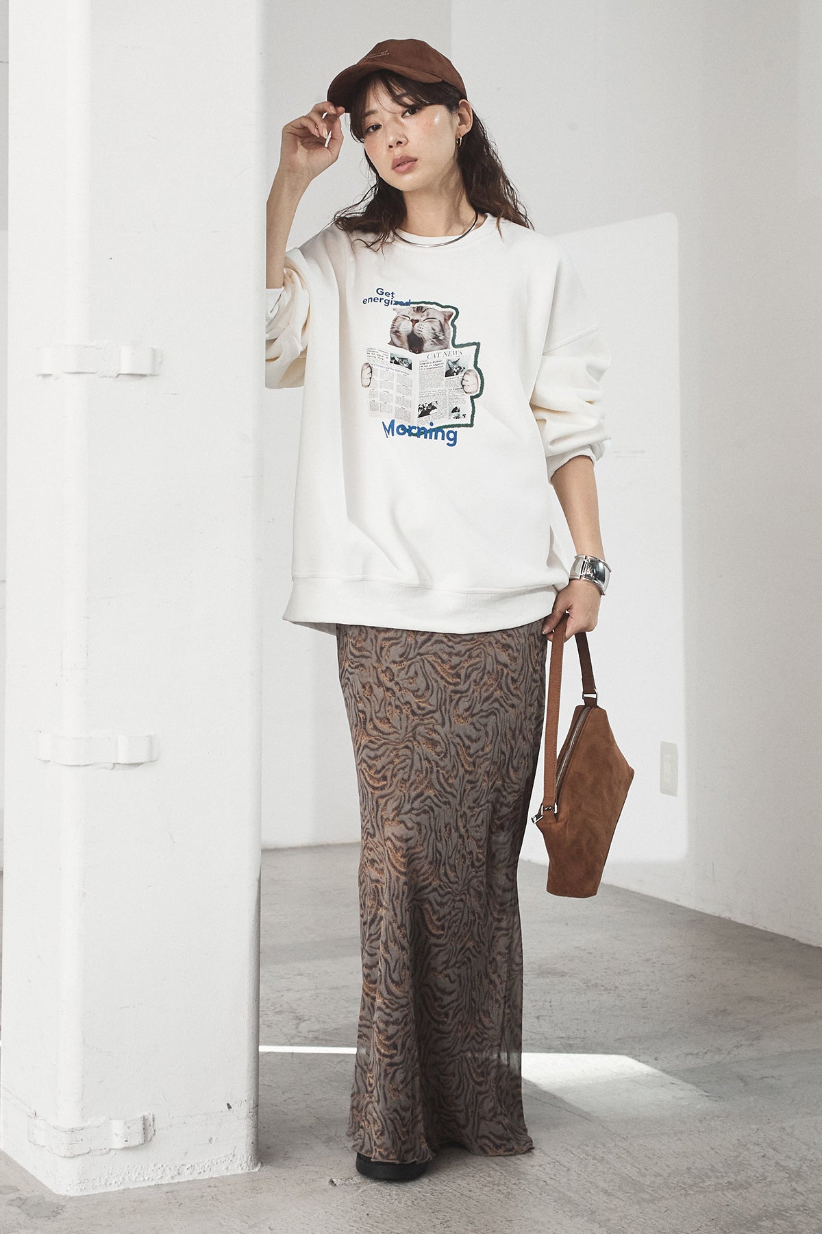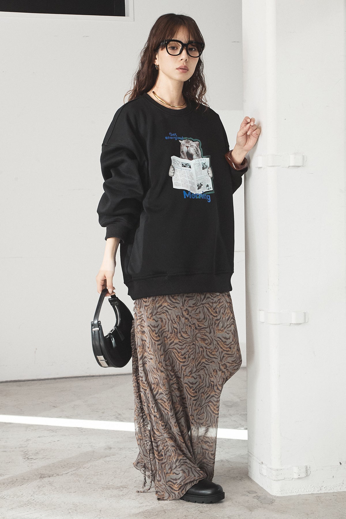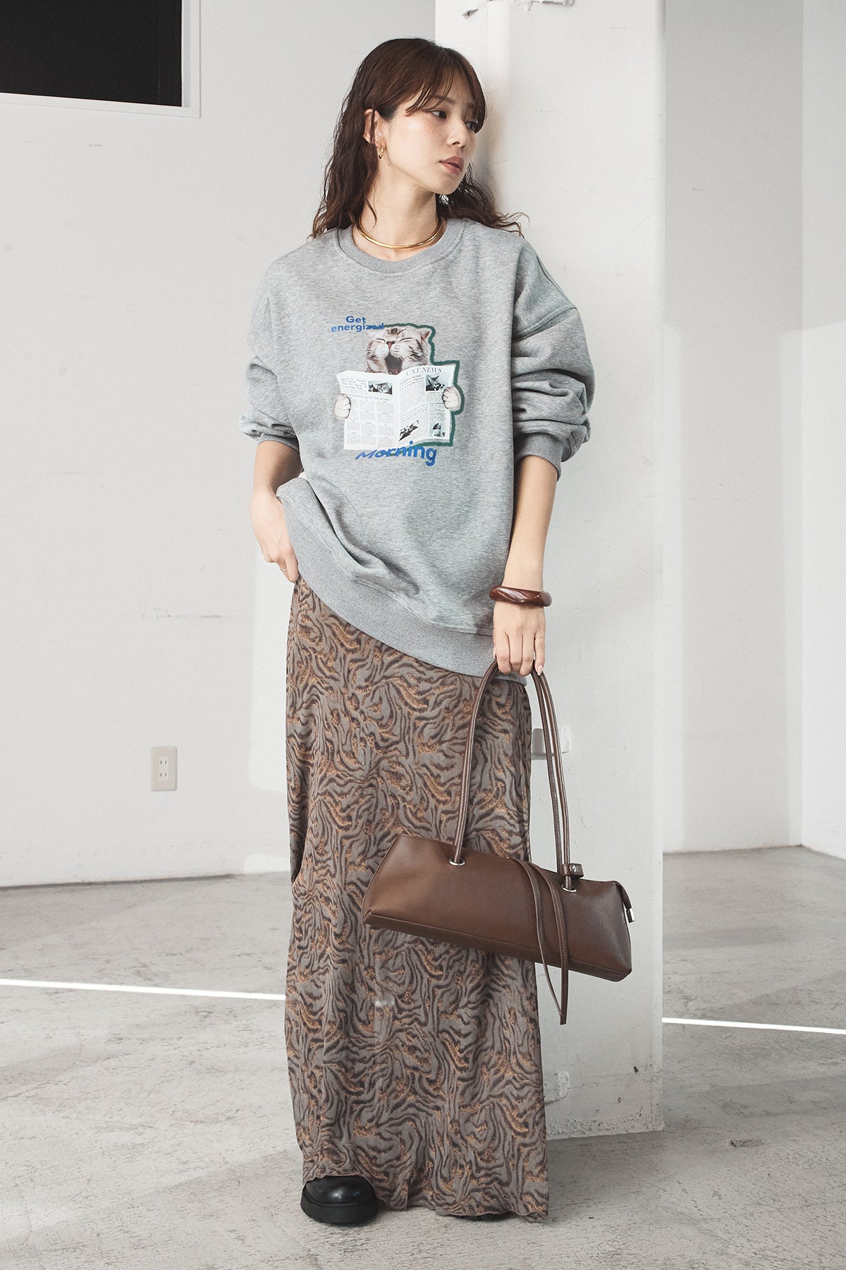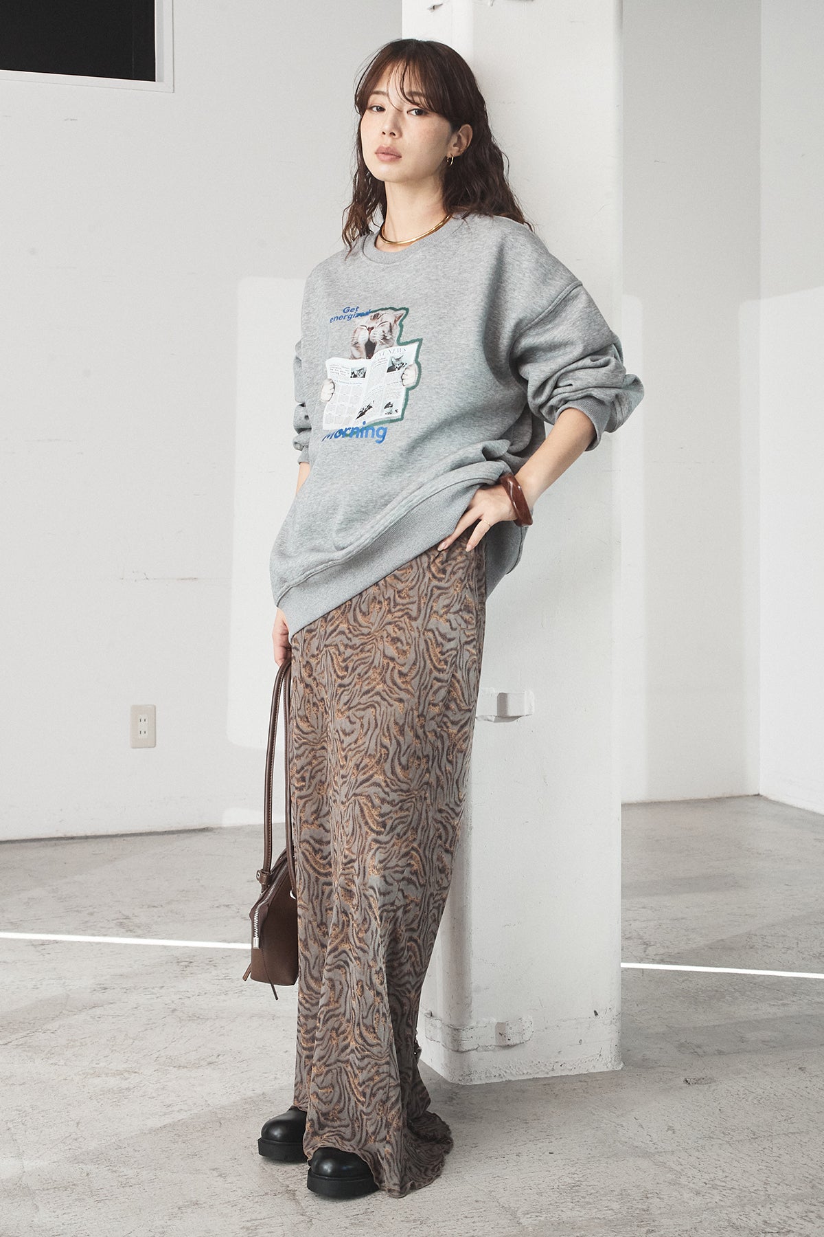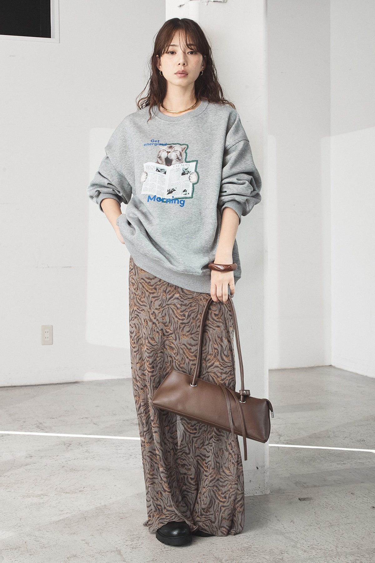 [SET]裏起毛モーニングキャットプリントスウェット+抽象柄ロングスカート(2set)