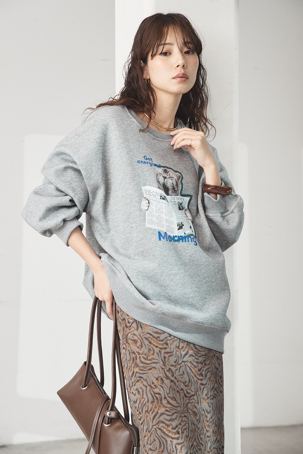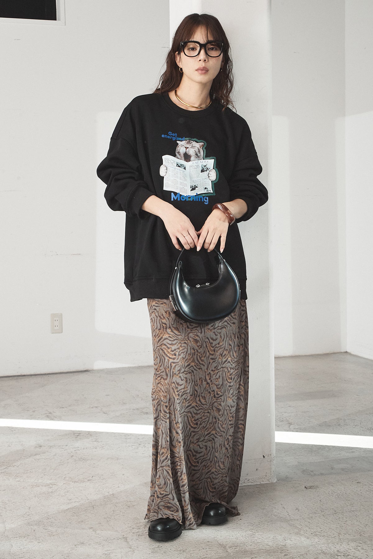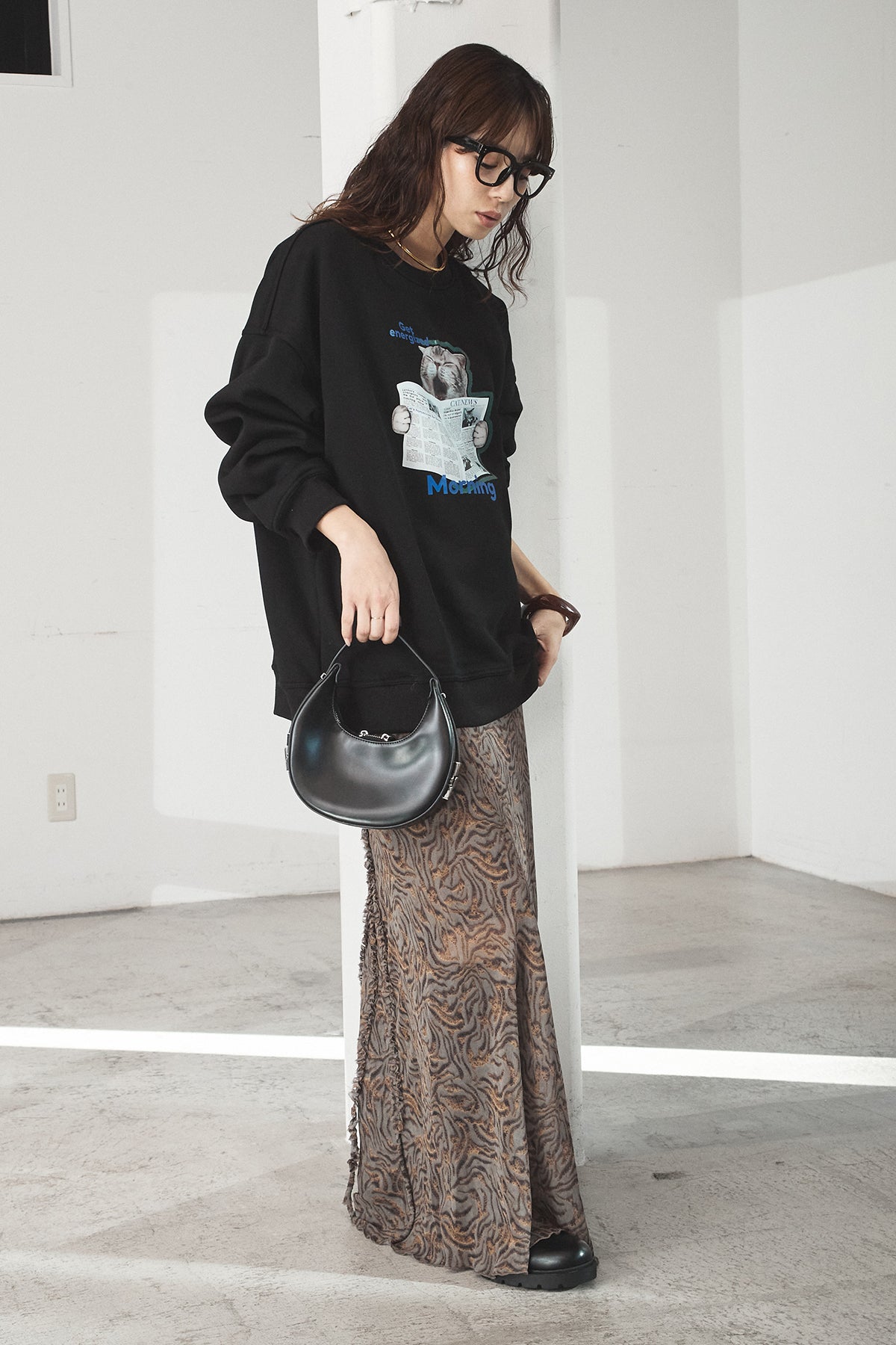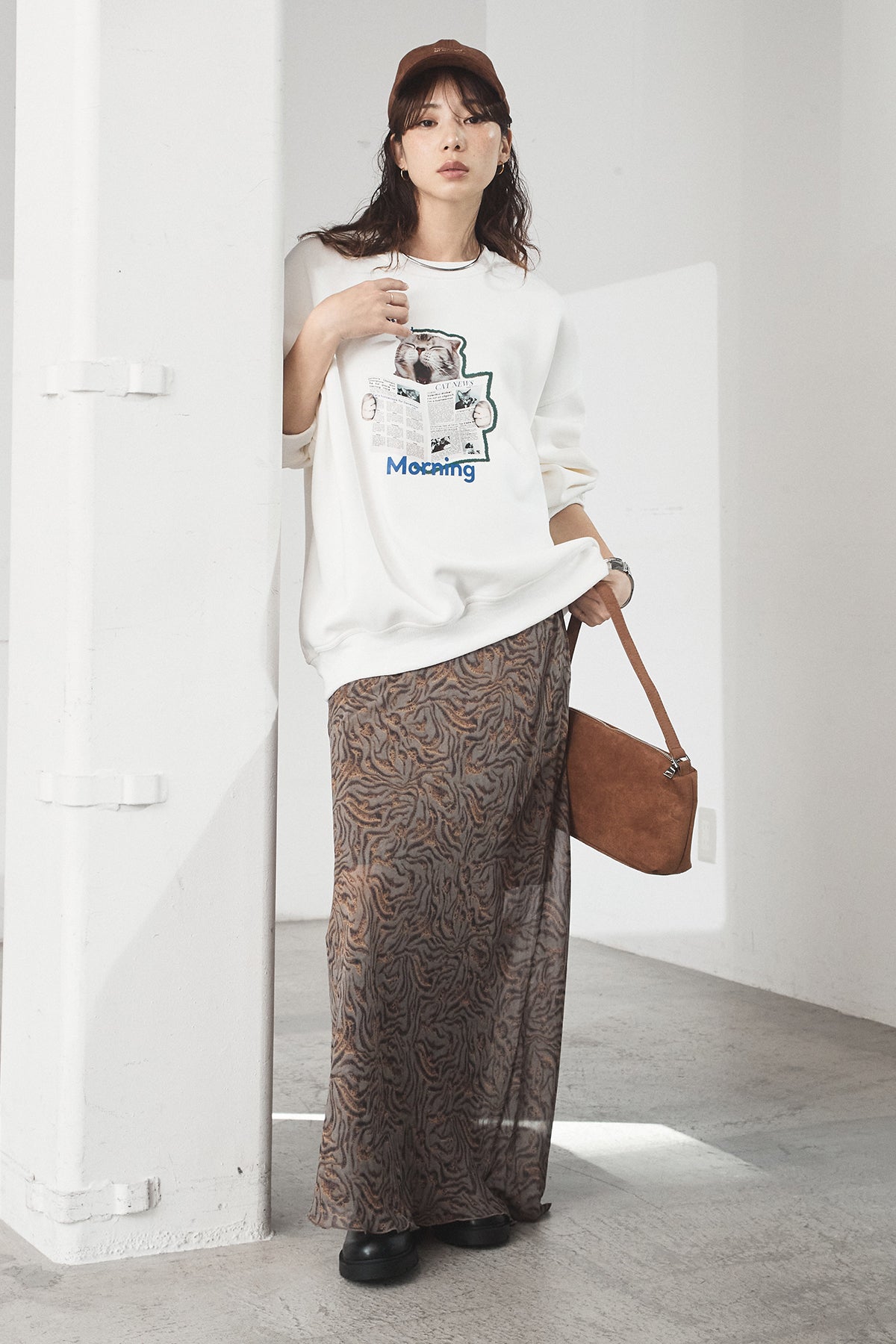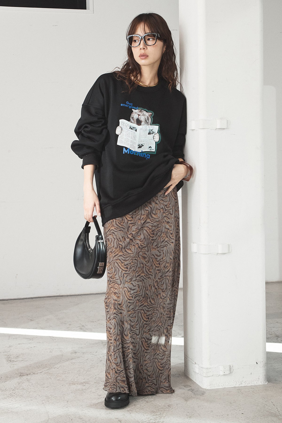 [SET]裏起毛モーニングキャットプリントスウェット+抽象柄ロングスカート(2set)