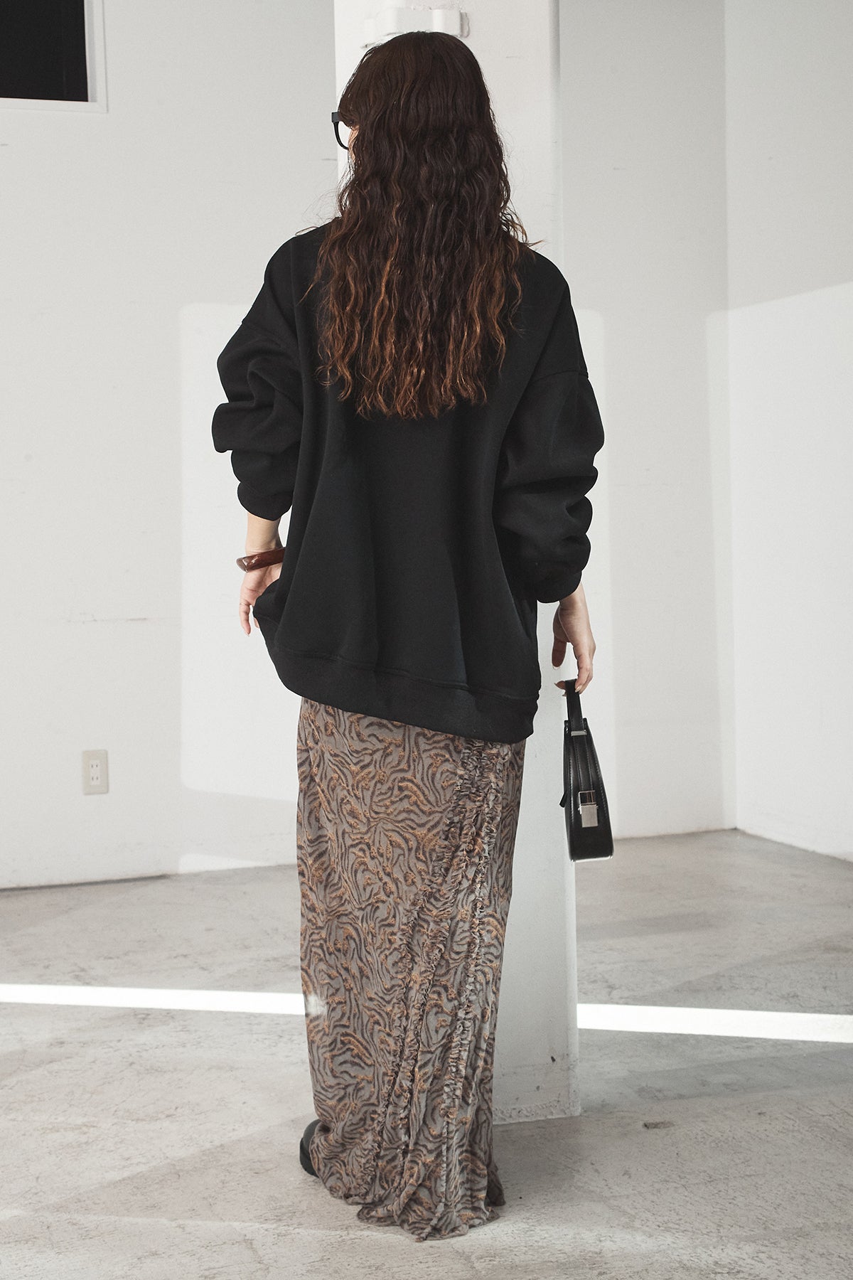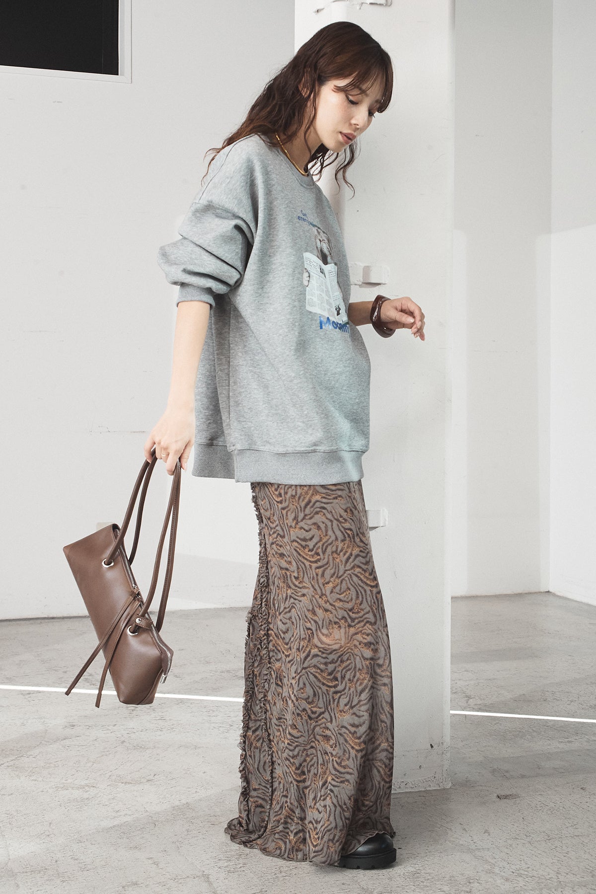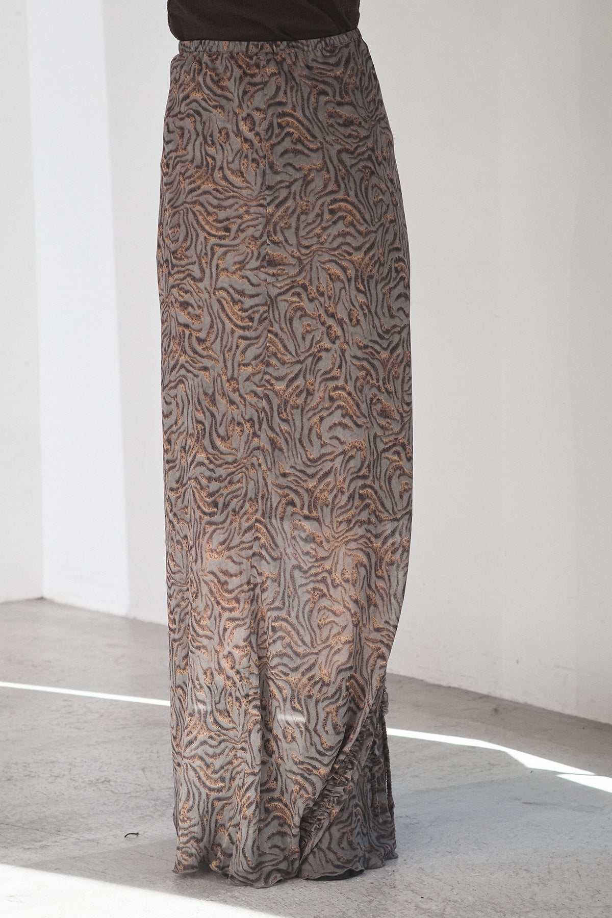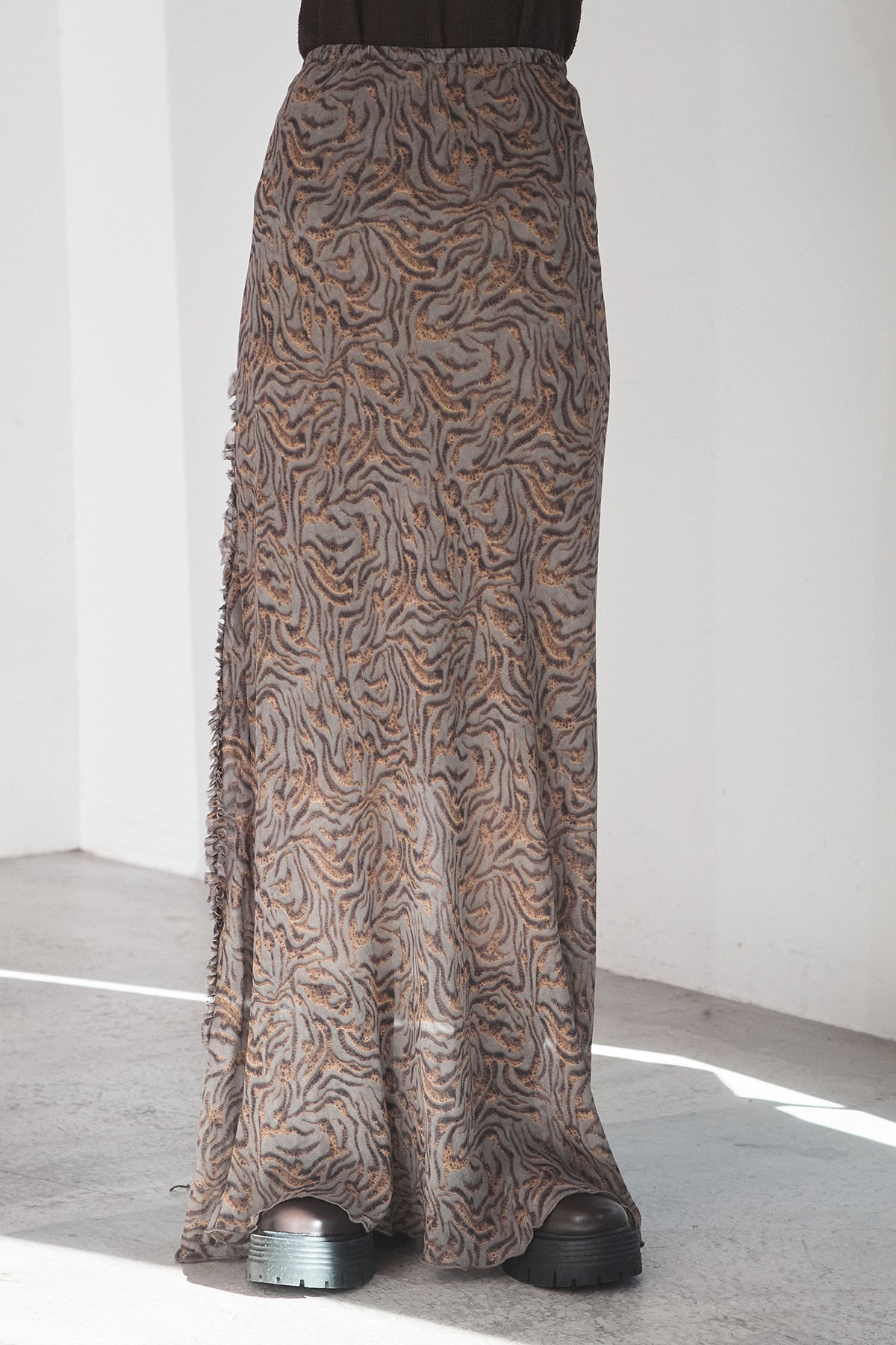 抽象柄を取り入れたロングスカート。 落ち着いた柄感で、コーデにさりげない表情を加えます。 ストンと落ちるシルエットで、広がりすぎず合わせやすいデザイン。 シンプルなトップスと合わせるだけでまとまり、デイリーに取り入れやすい一枚です。
