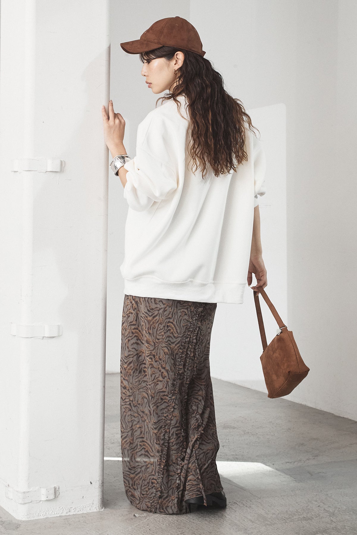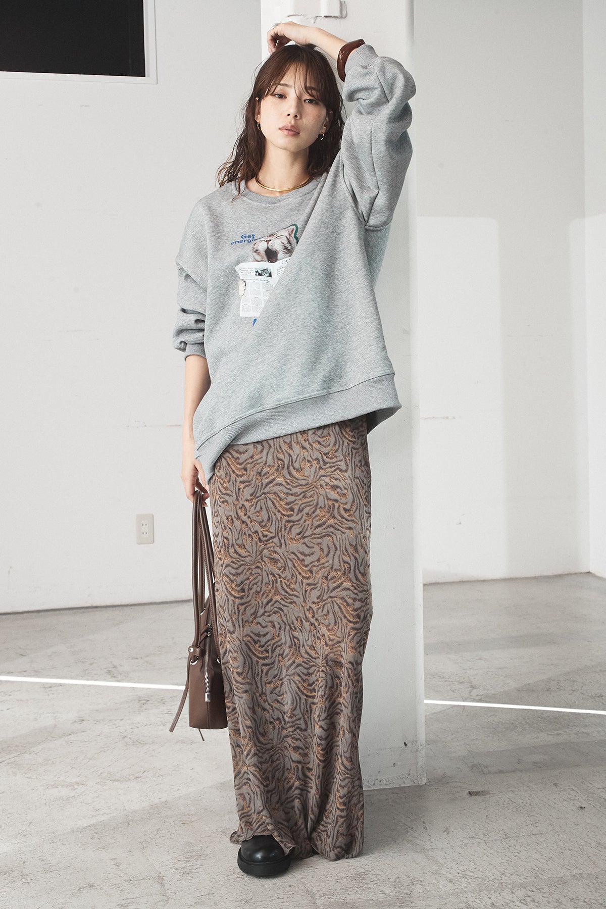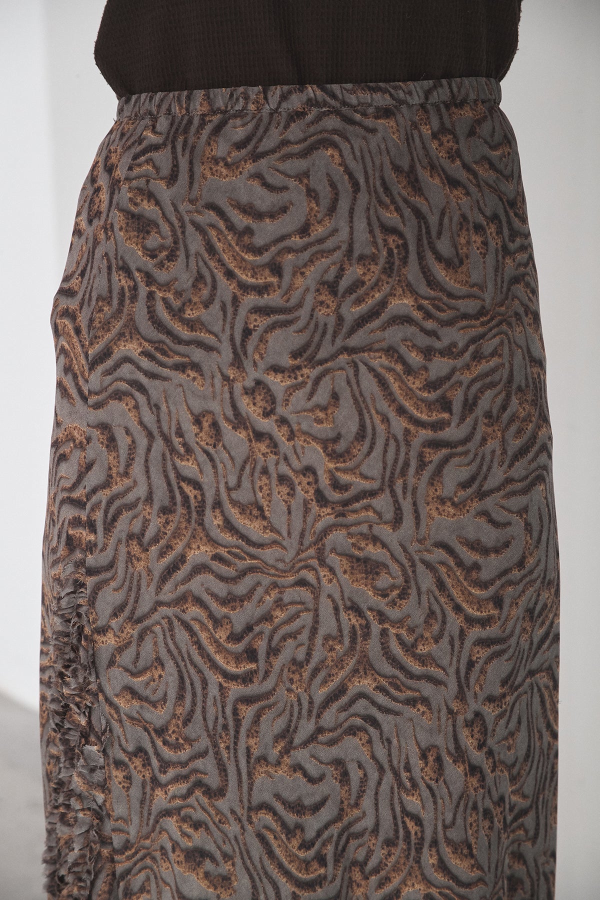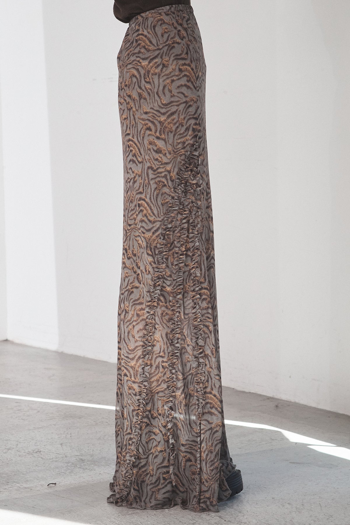 抽象柄を取り入れたロングスカート。 落ち着いた柄感で、コーデにさりげない表情を加えます。 ストンと落ちるシルエットで、広がりすぎず合わせやすいデザイン。 シンプルなトップスと合わせるだけでまとまり、デイリーに取り入れやすい一枚です。