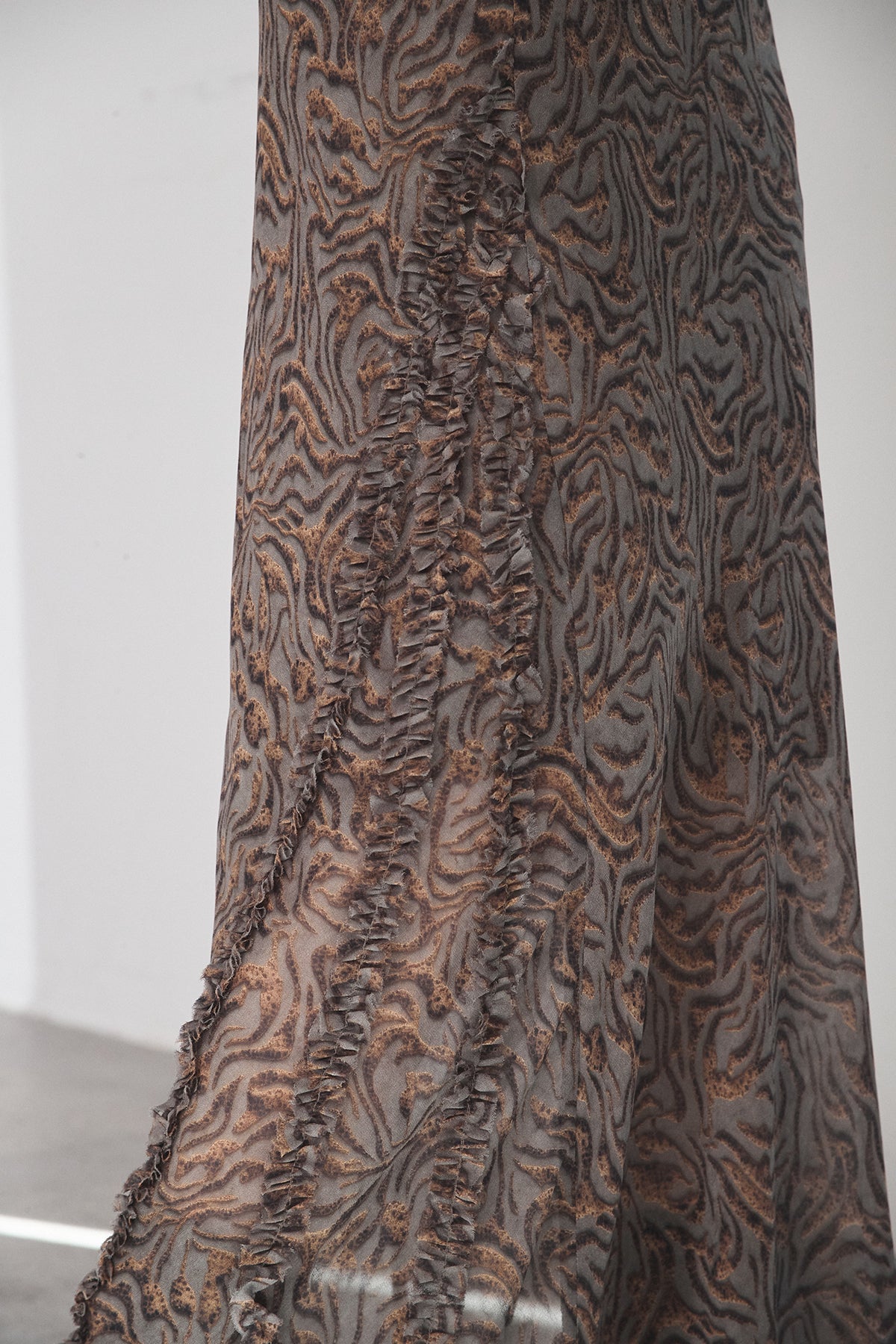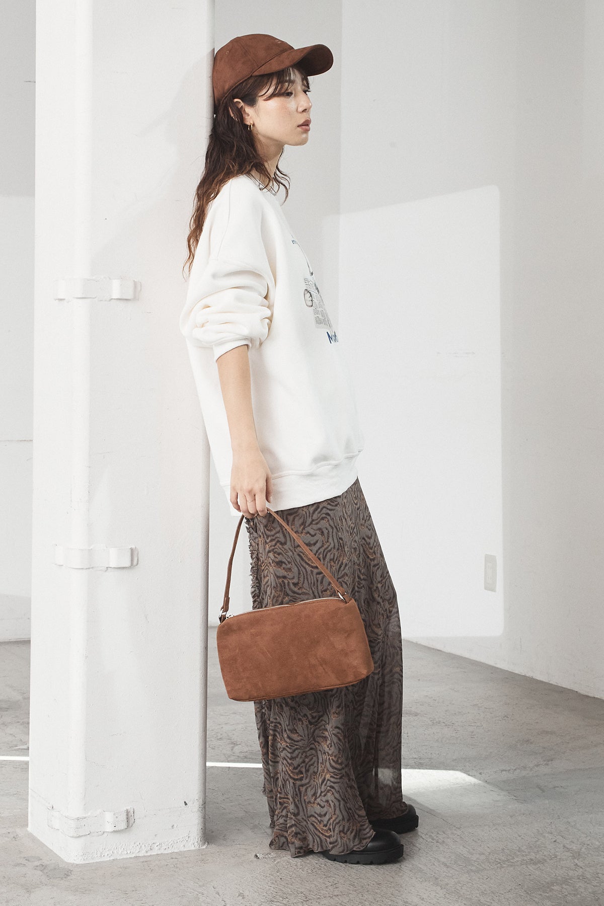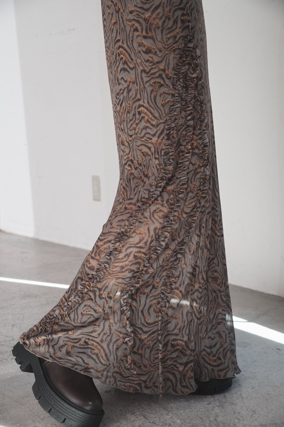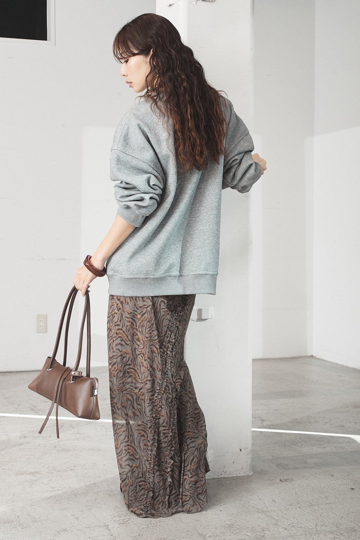 抽象柄を取り入れたロングスカート。 落ち着いた柄感で、コーデにさりげない表情を加えます。 ストンと落ちるシルエットで、広がりすぎず合わせやすいデザイン。 シンプルなトップスと合わせるだけでまとまり、デイリーに取り入れやすい一枚です。