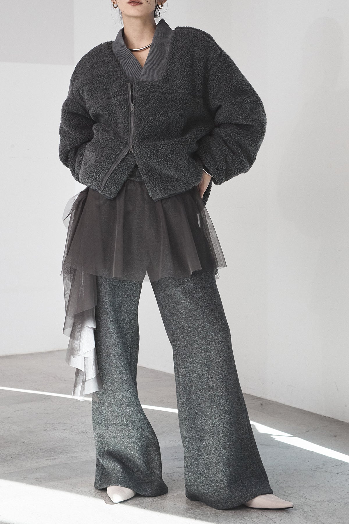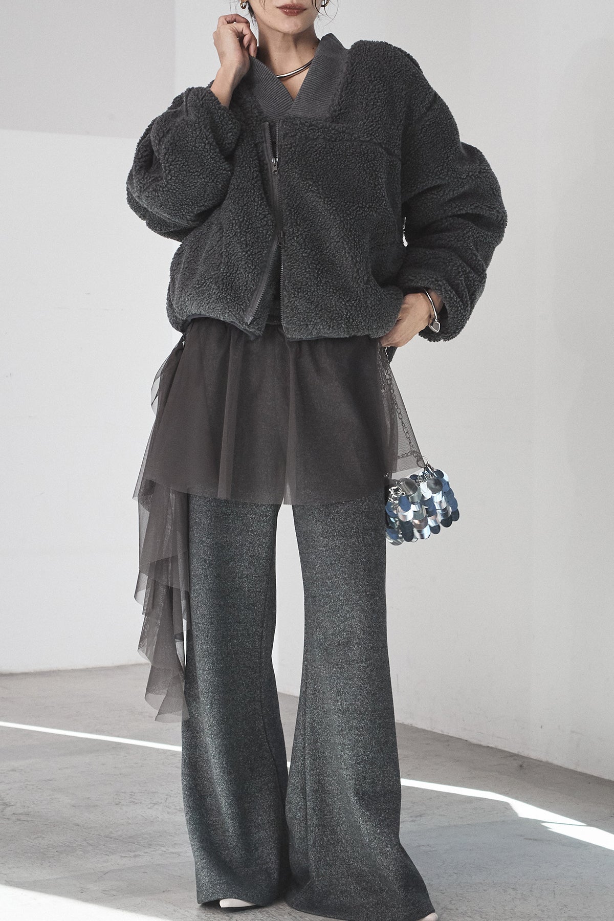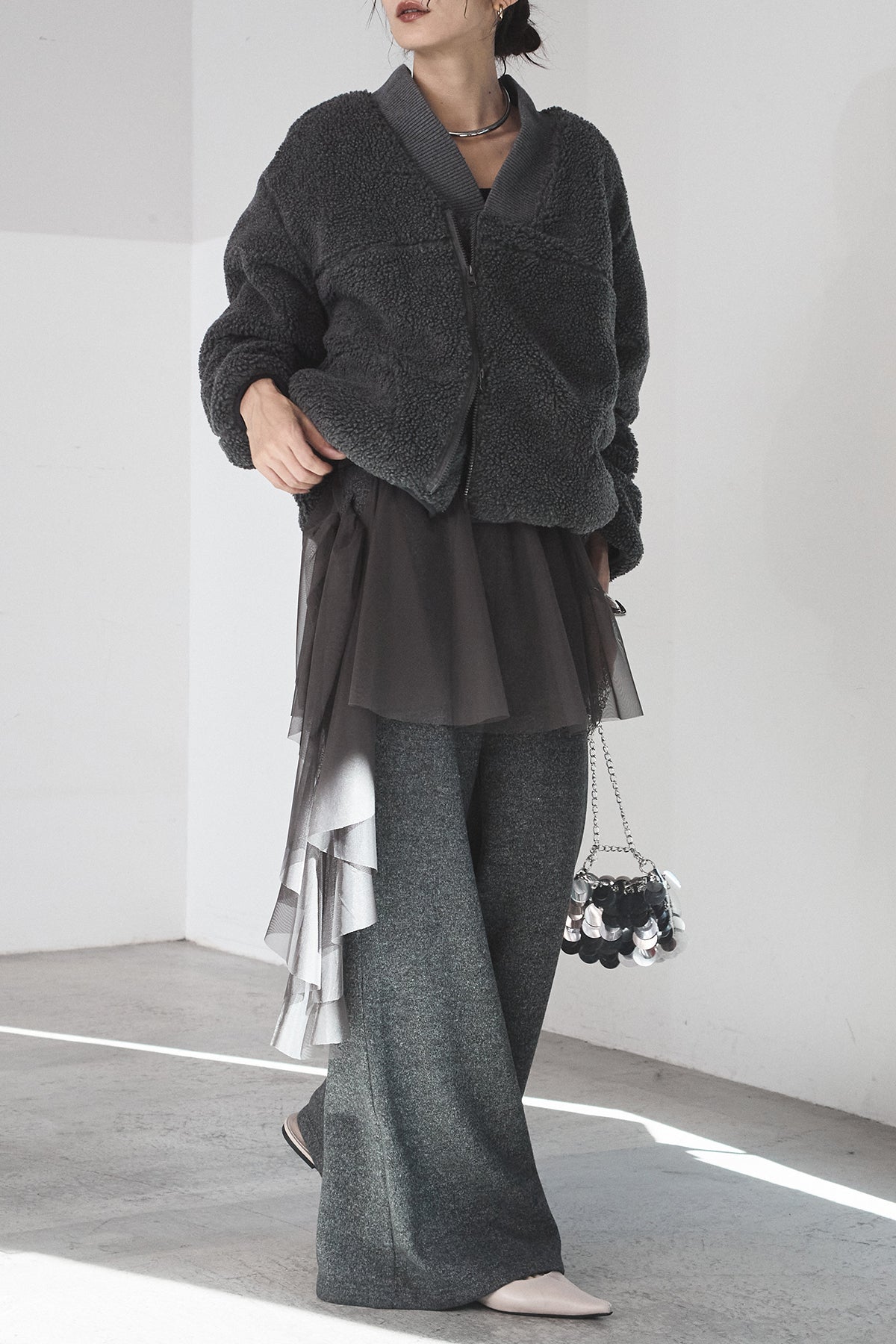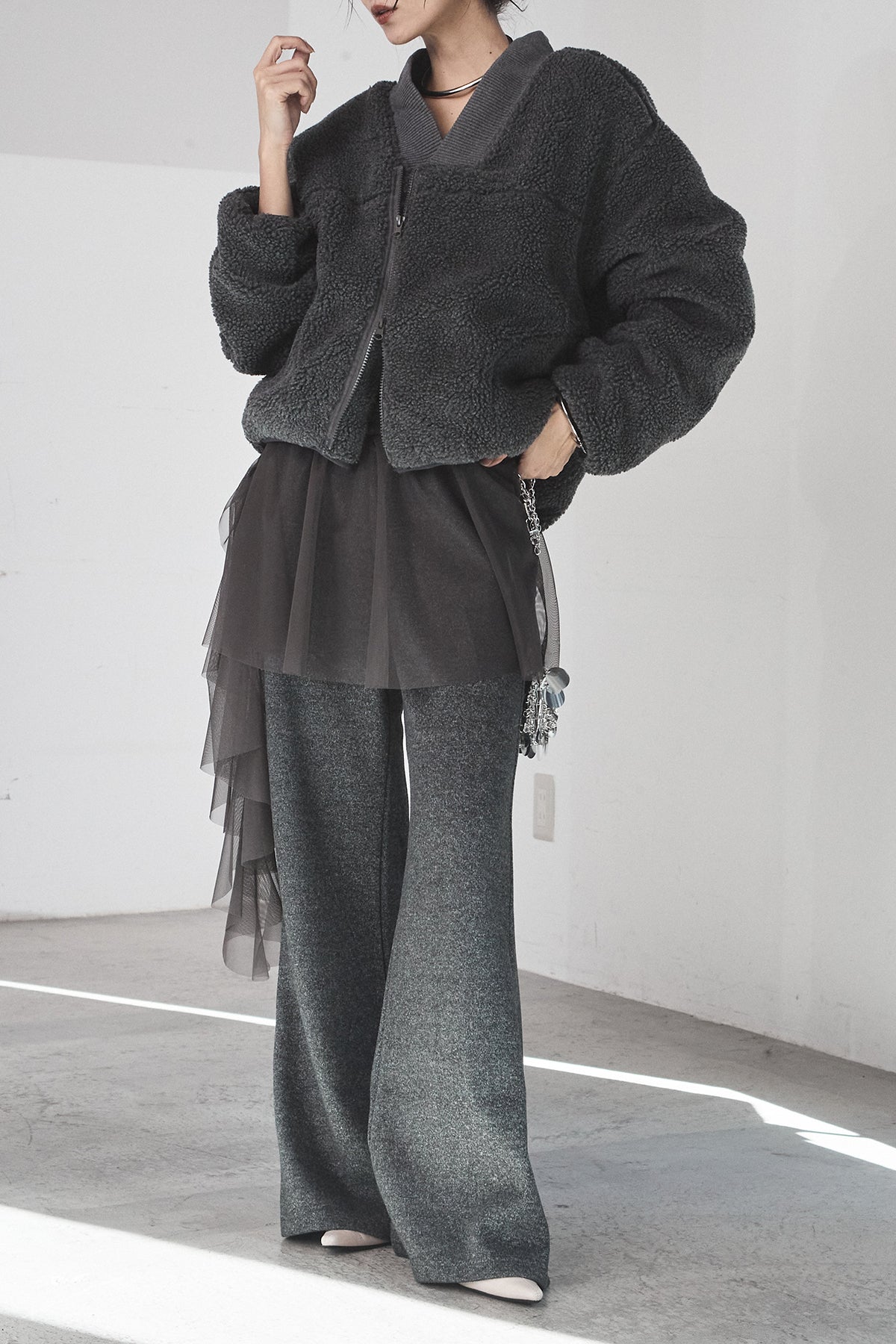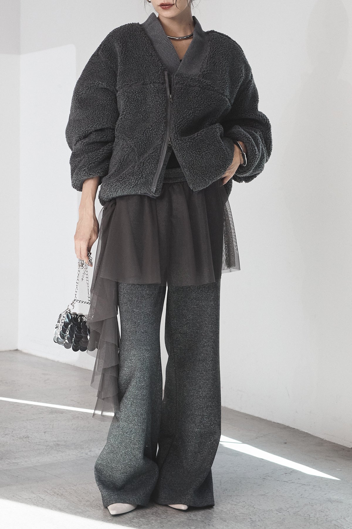 [SET]ノーカラーリブボアアウター+チュールレイヤードニットパンツ(2set)