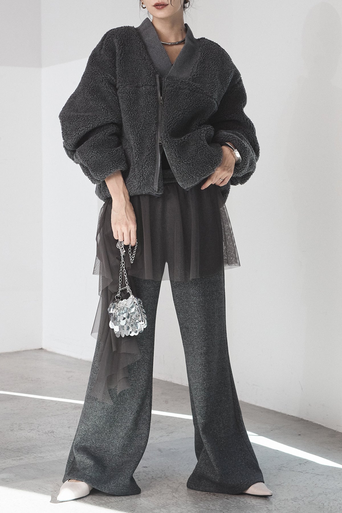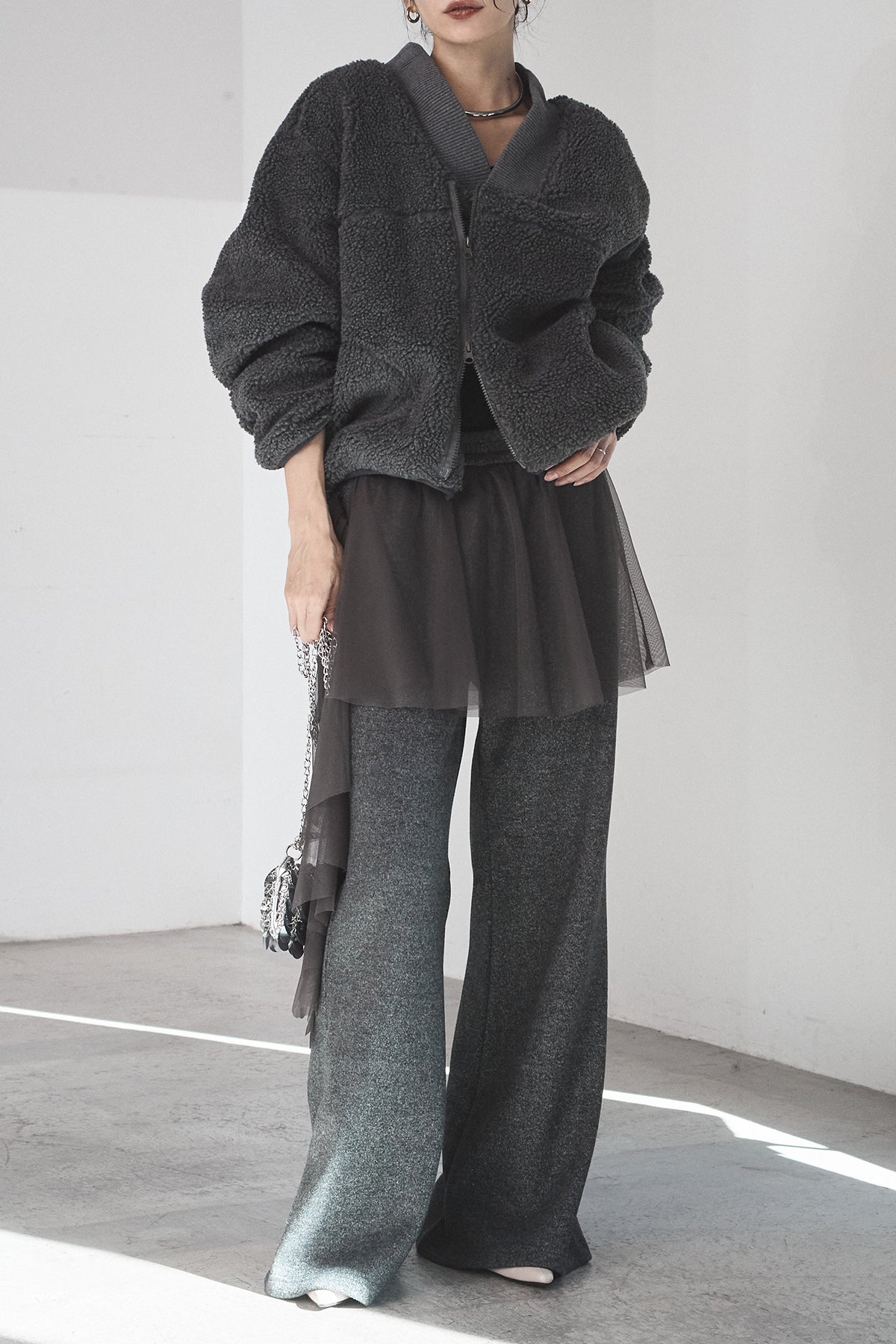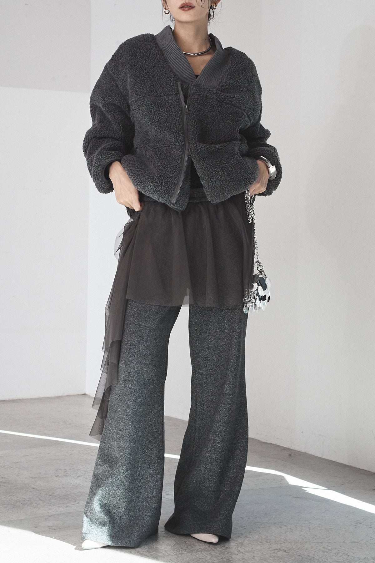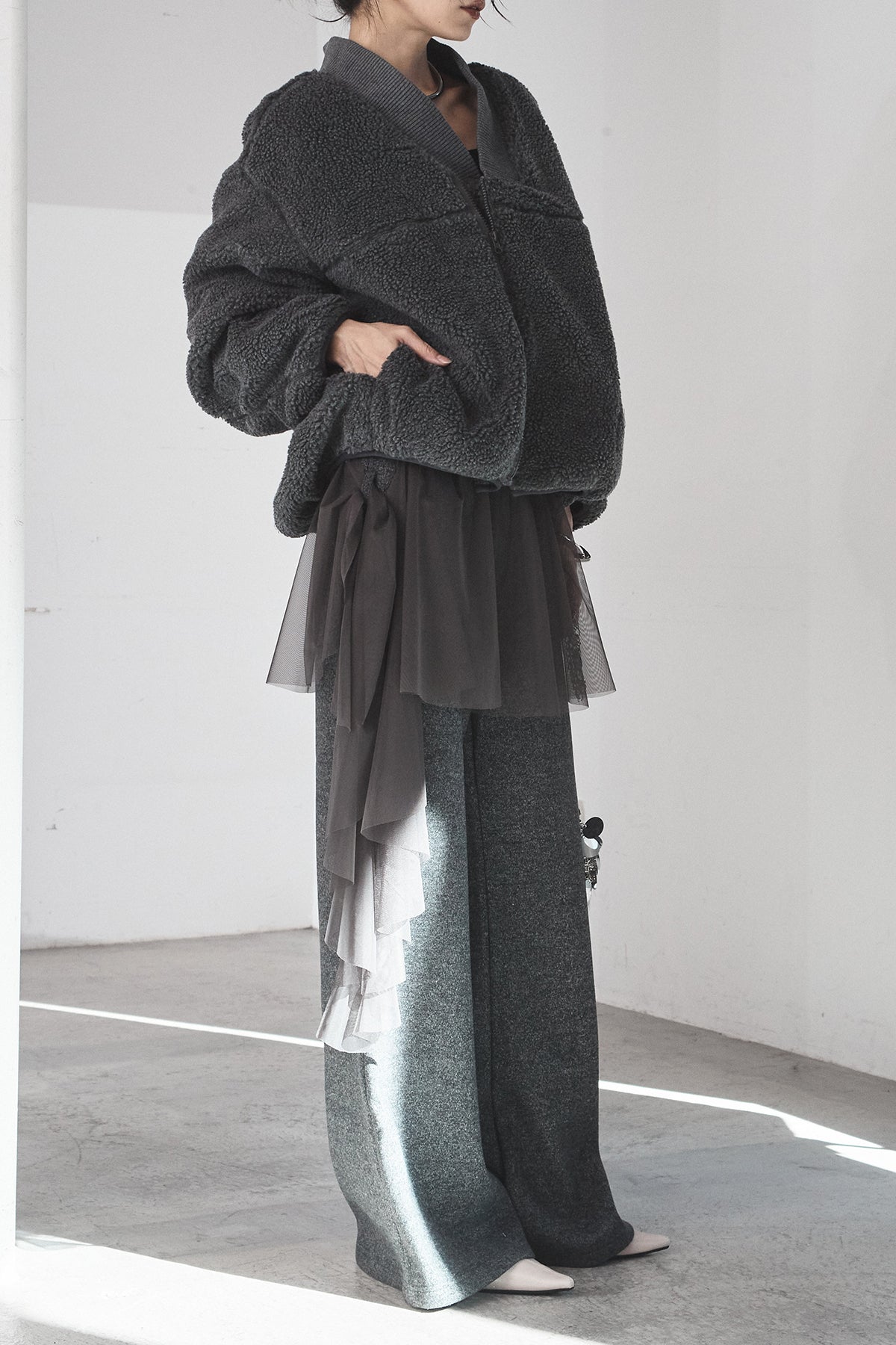 [SET]ノーカラーリブボアアウター+チュールレイヤードニットパンツ(2set)