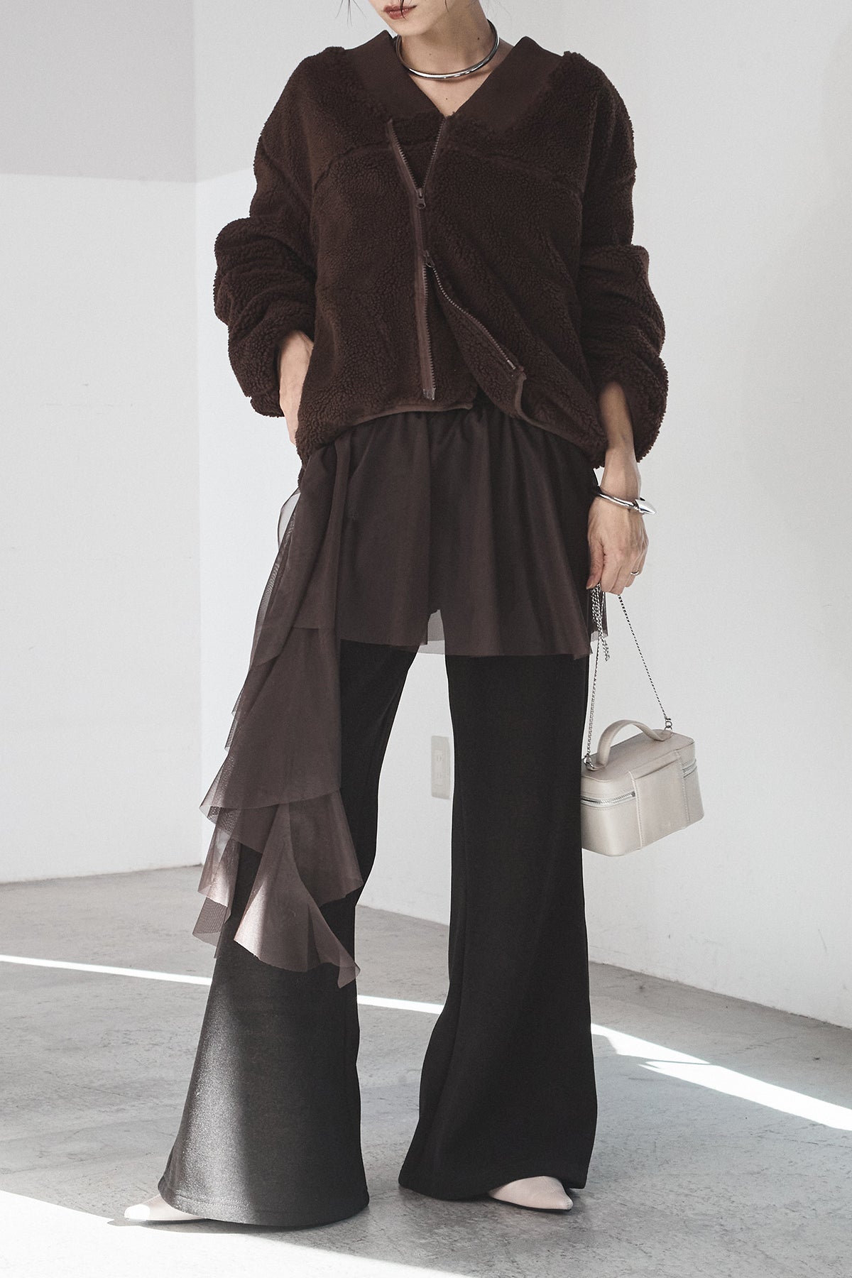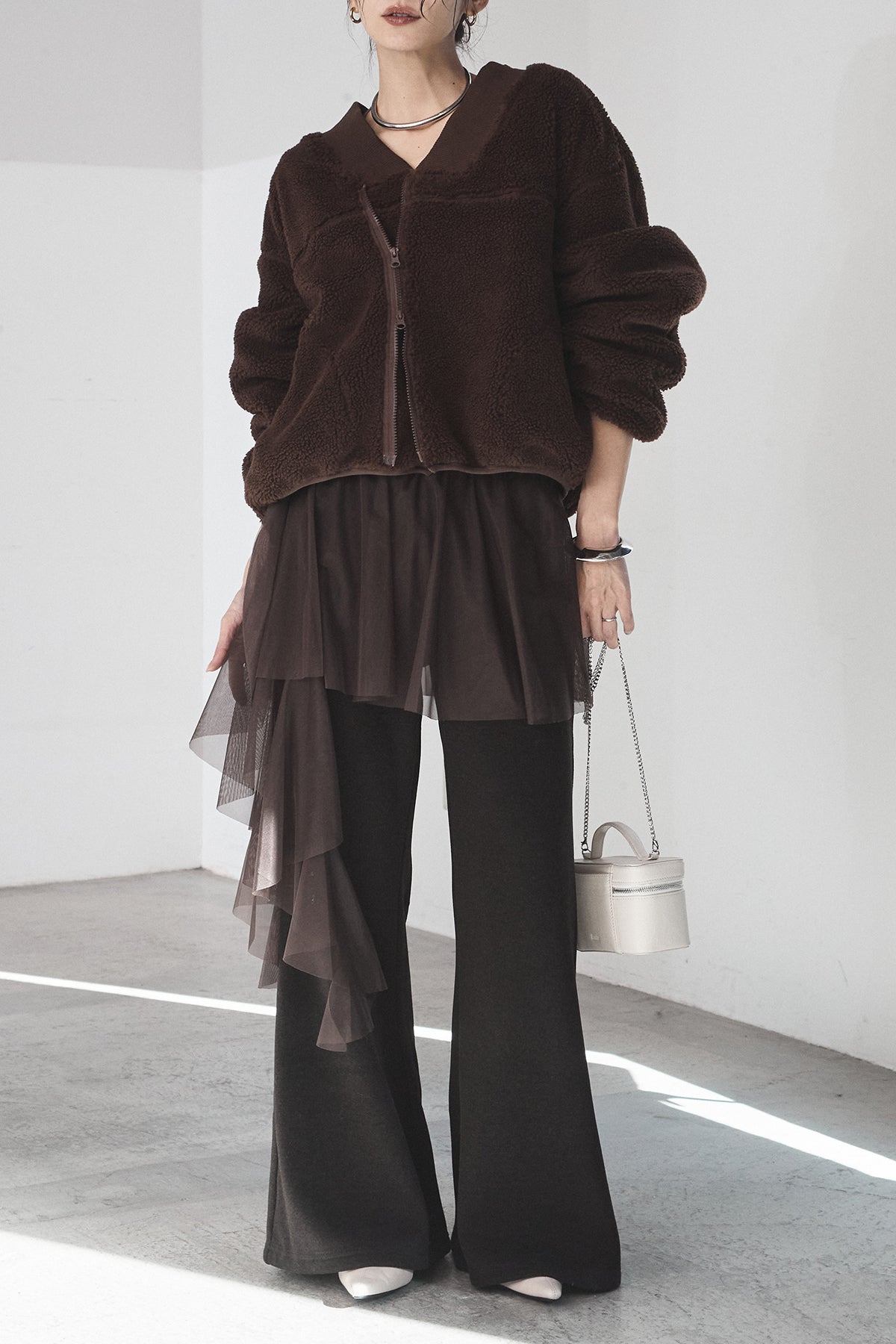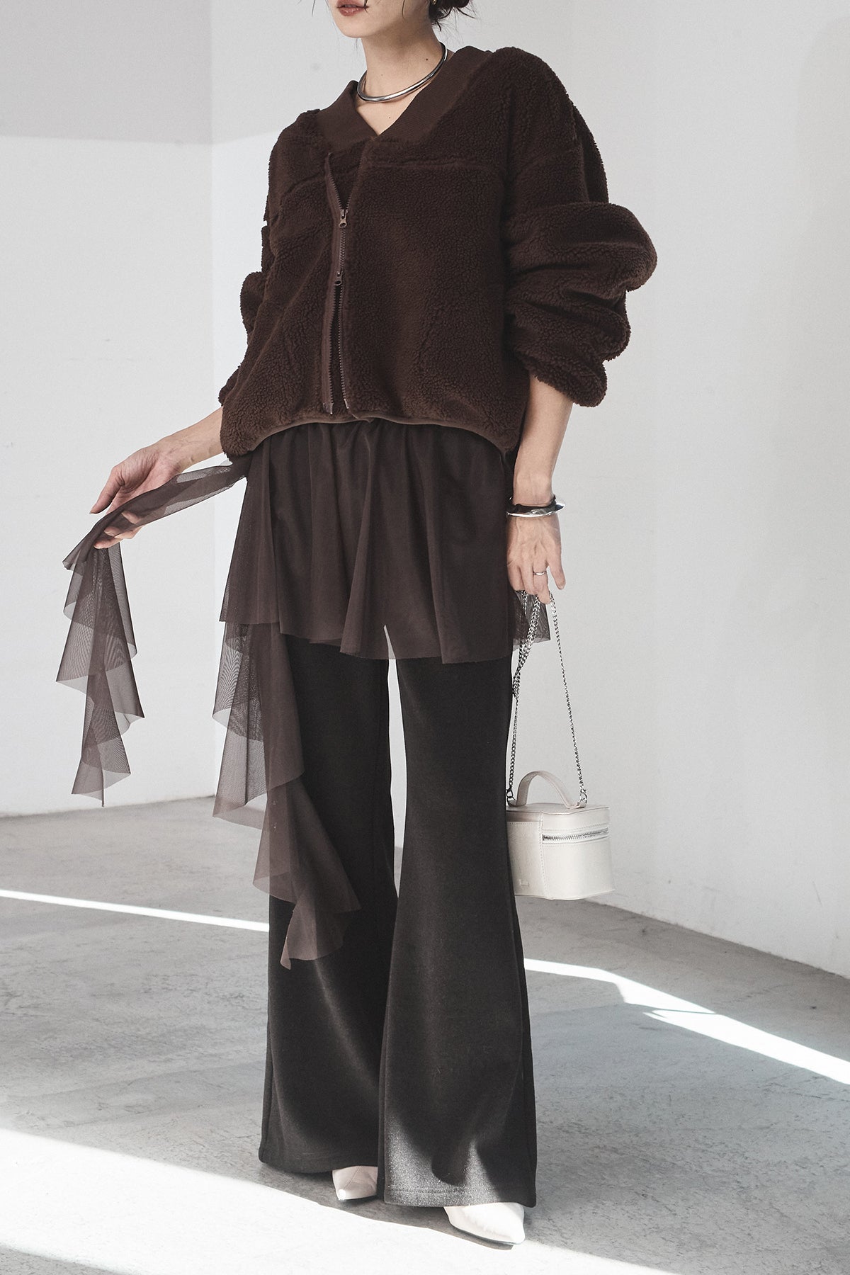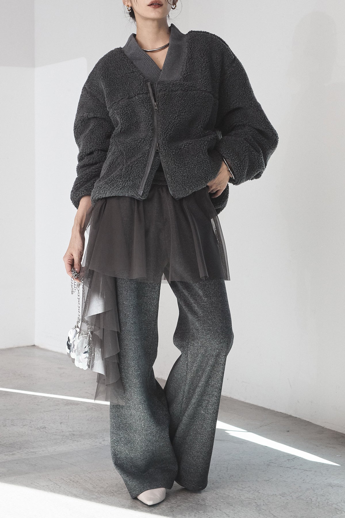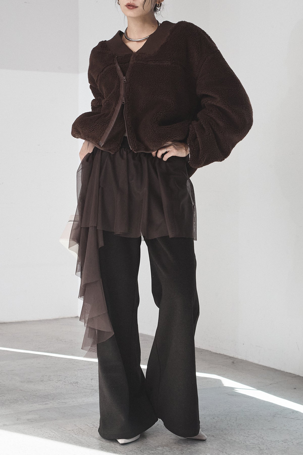 [SET]ノーカラーリブボアアウター+チュールレイヤードニットパンツ(2set)