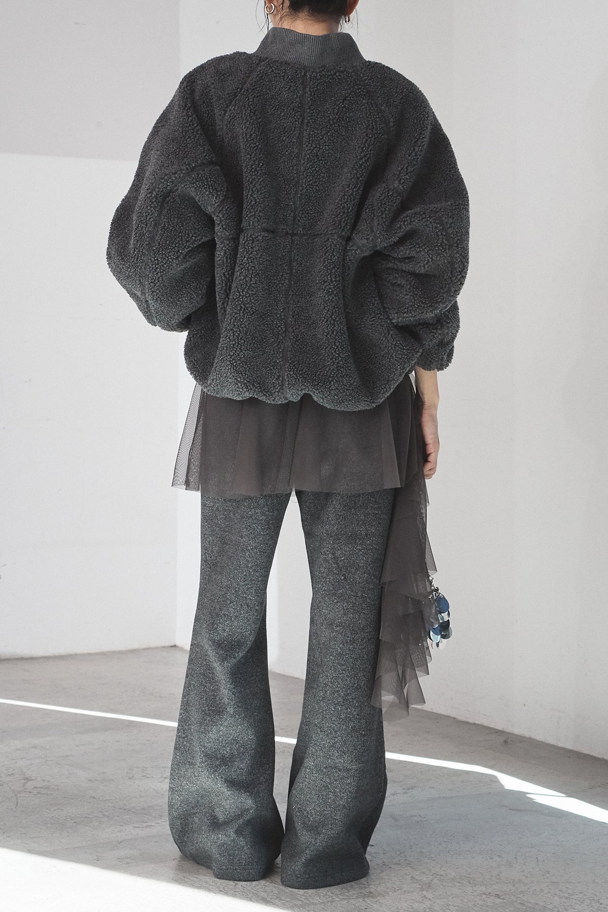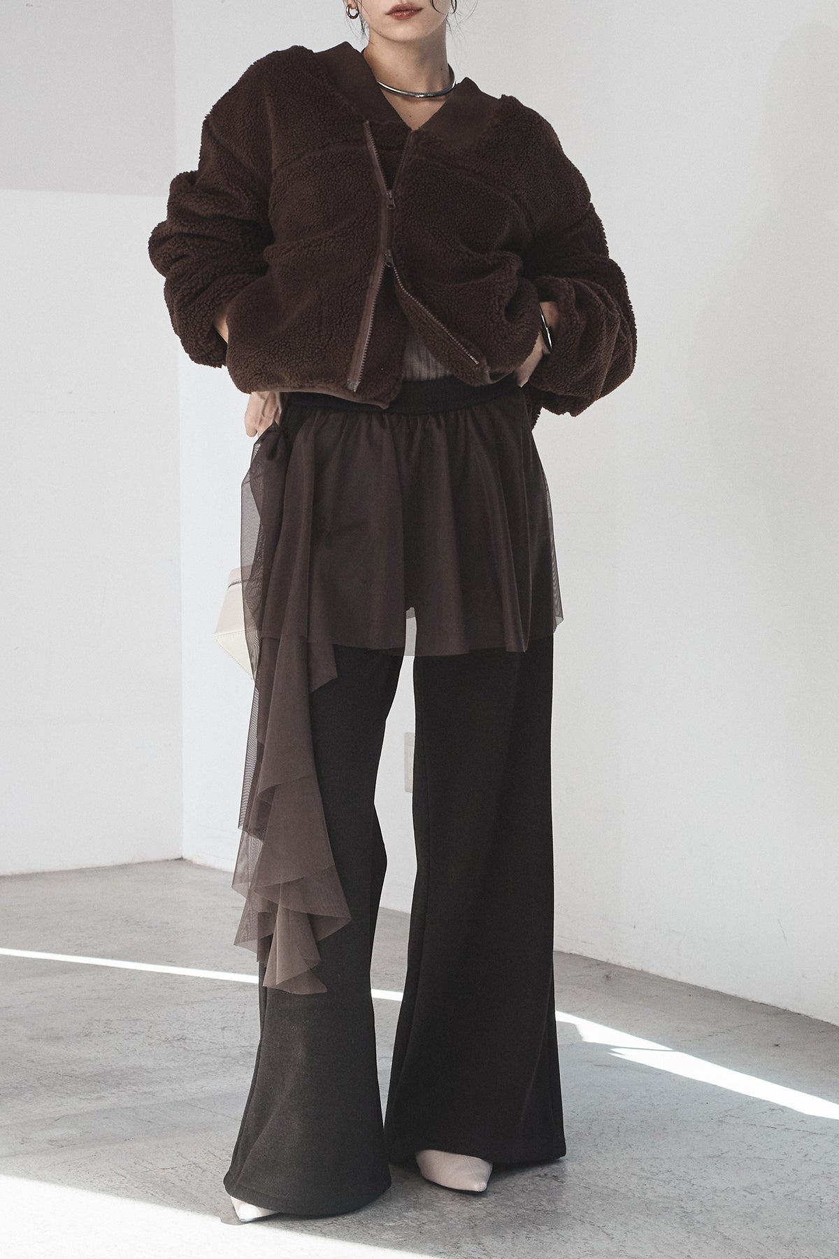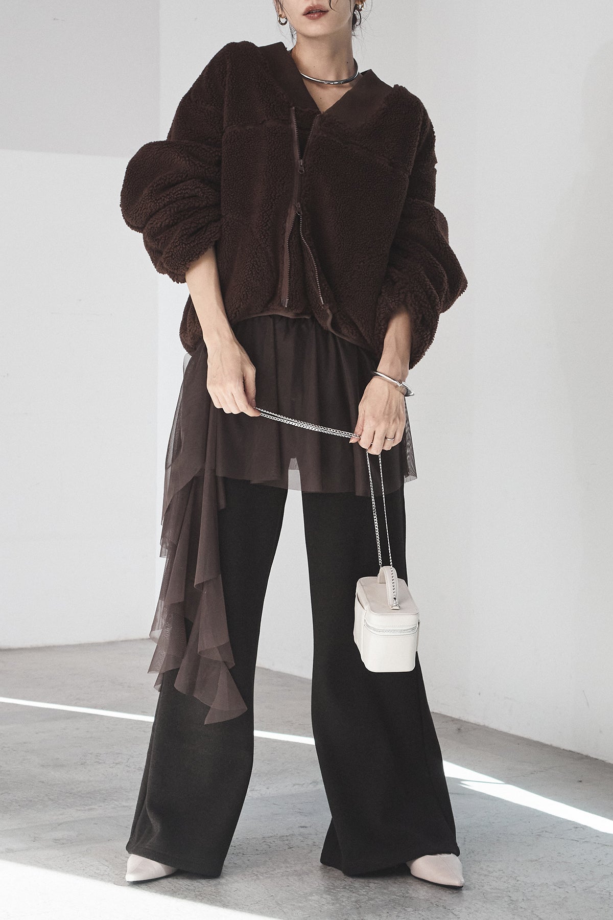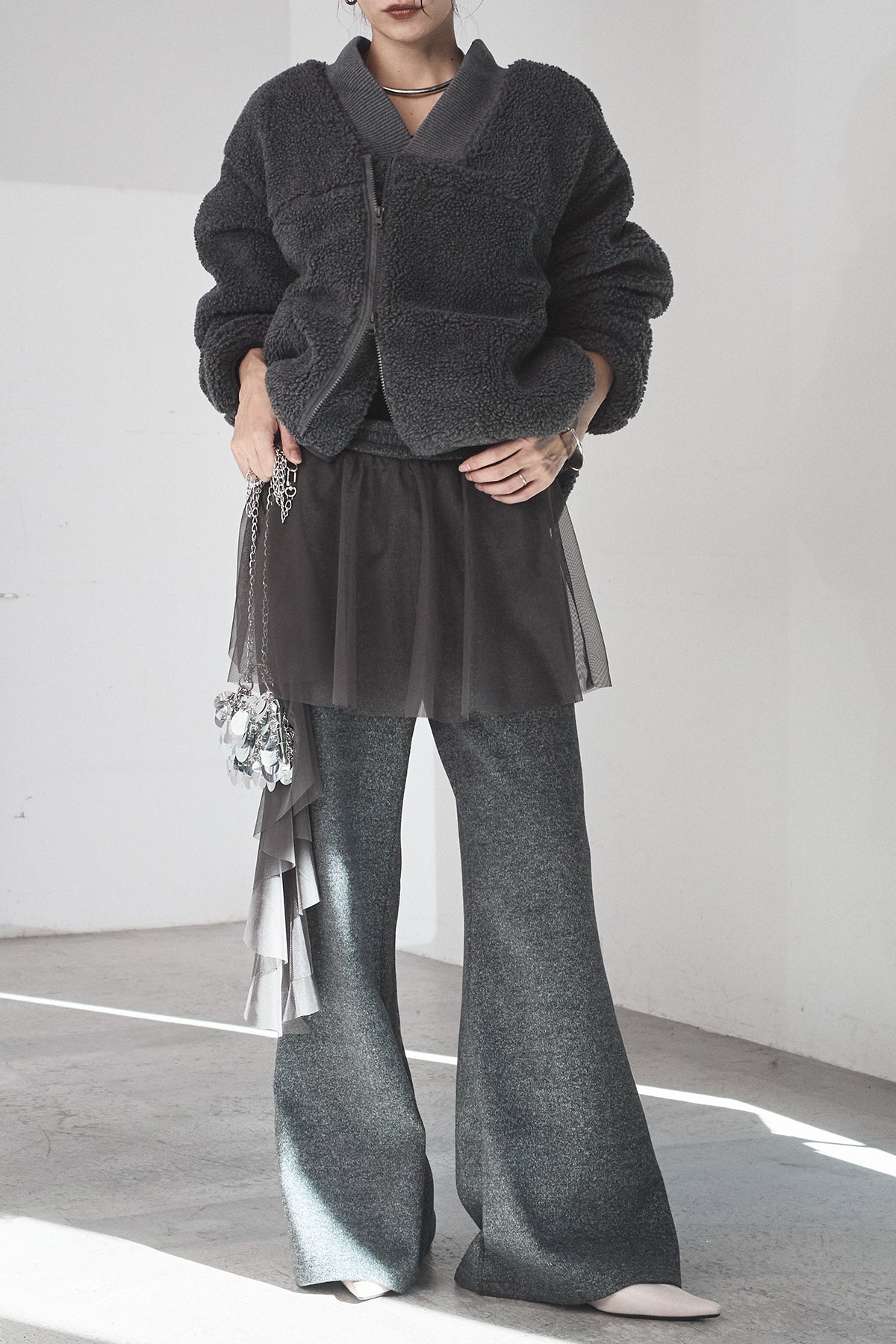[SET]ノーカラーリブボアアウター+チュールレイヤードニットパンツ(2set)