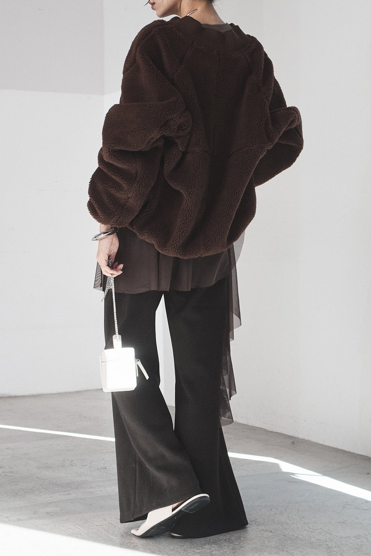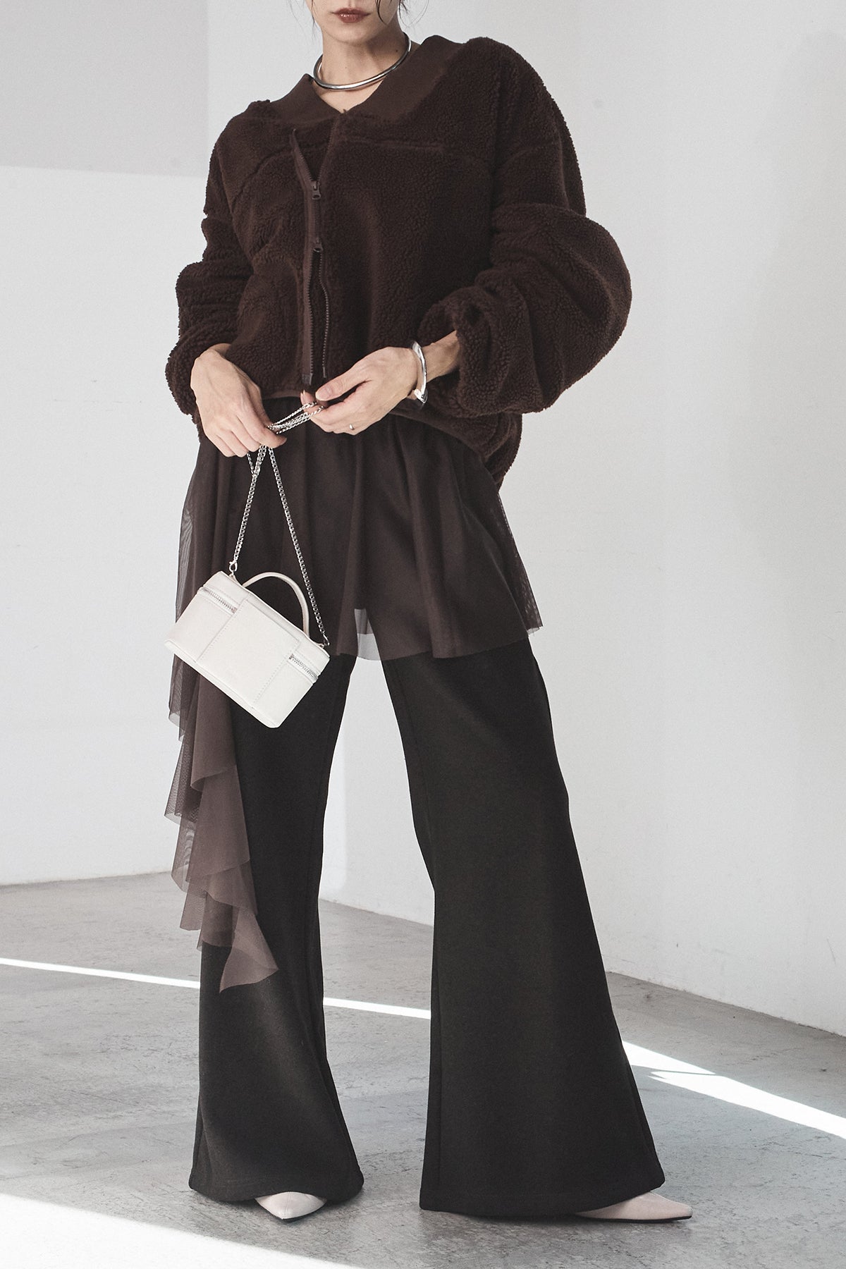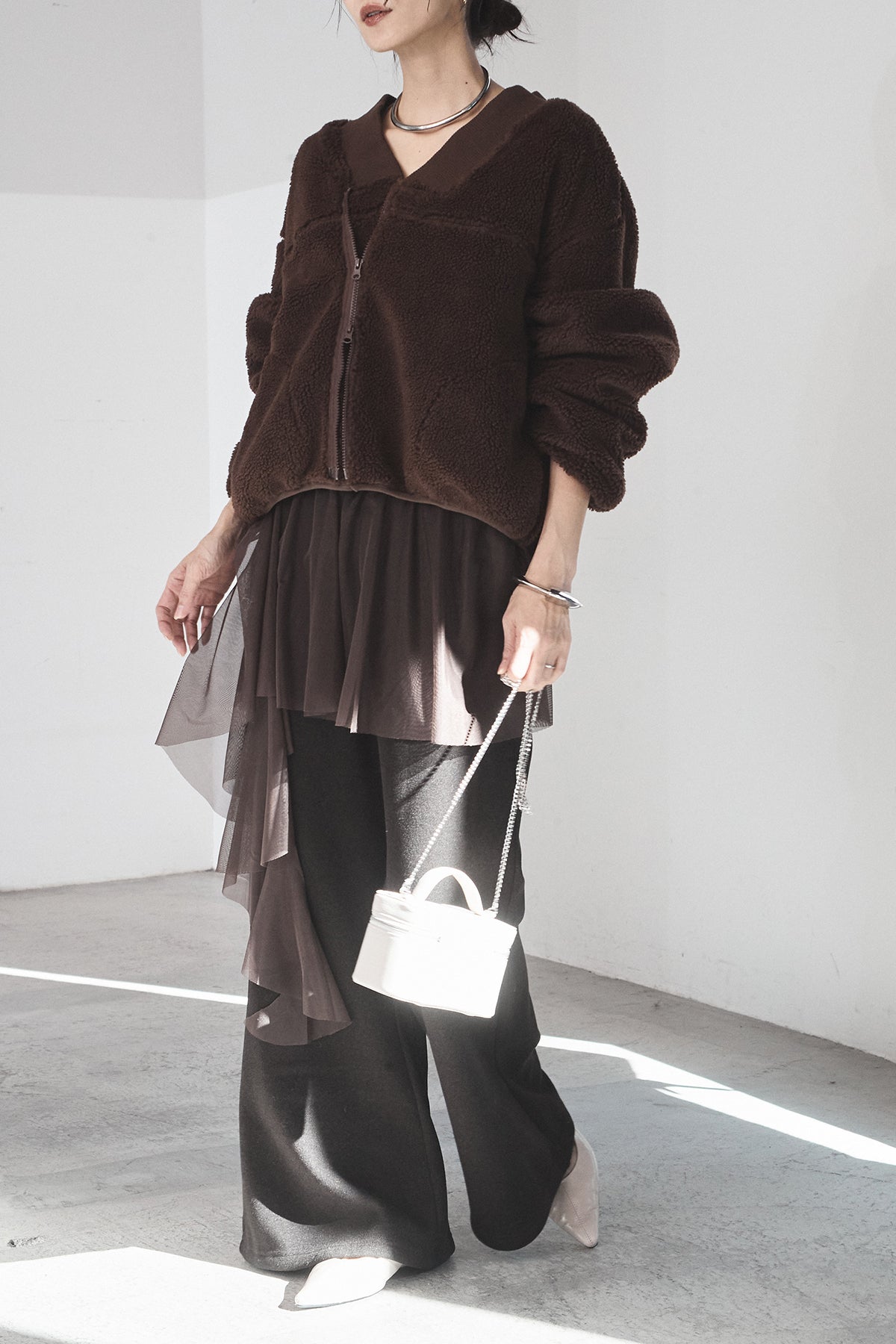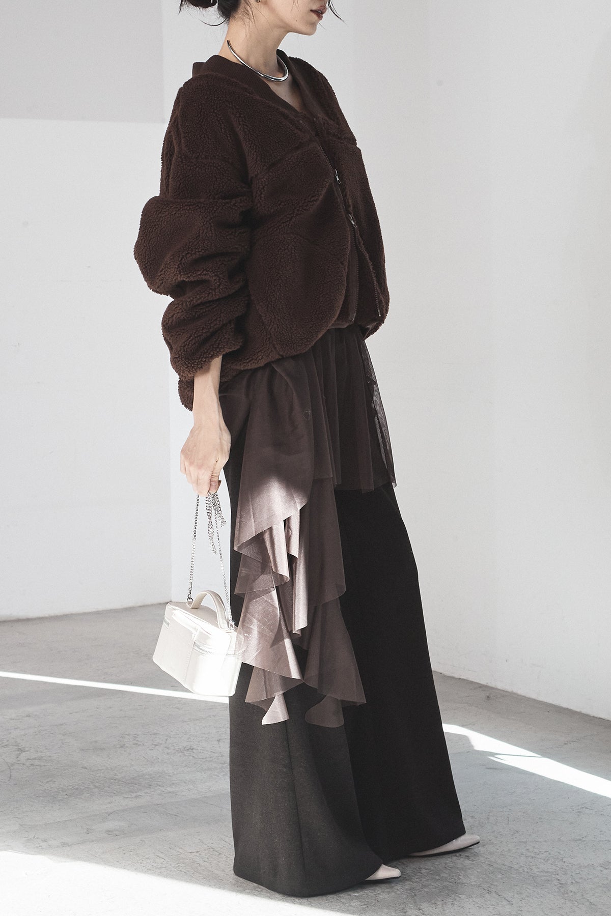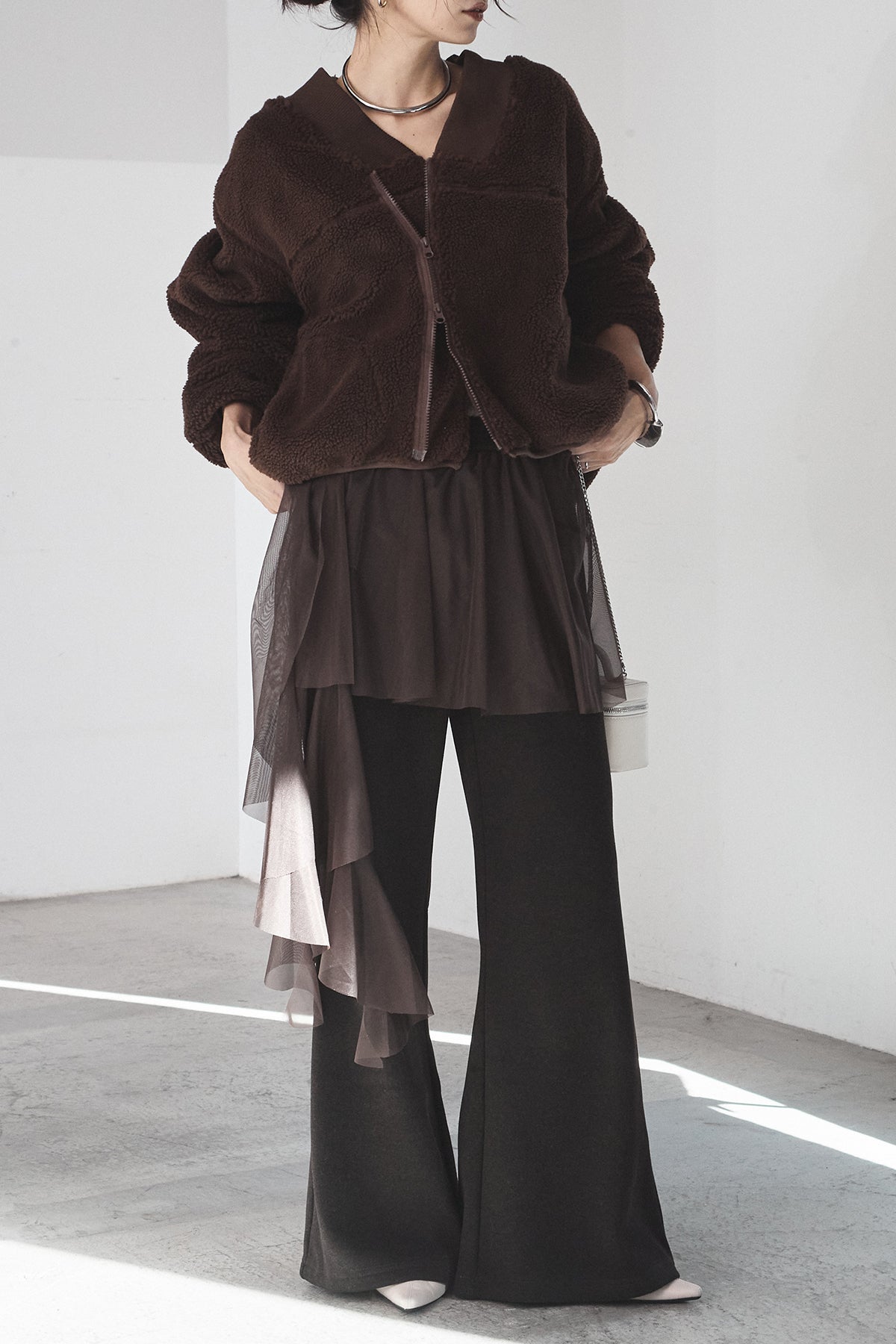 [SET]ノーカラーリブボアアウター+チュールレイヤードニットパンツ(2set)