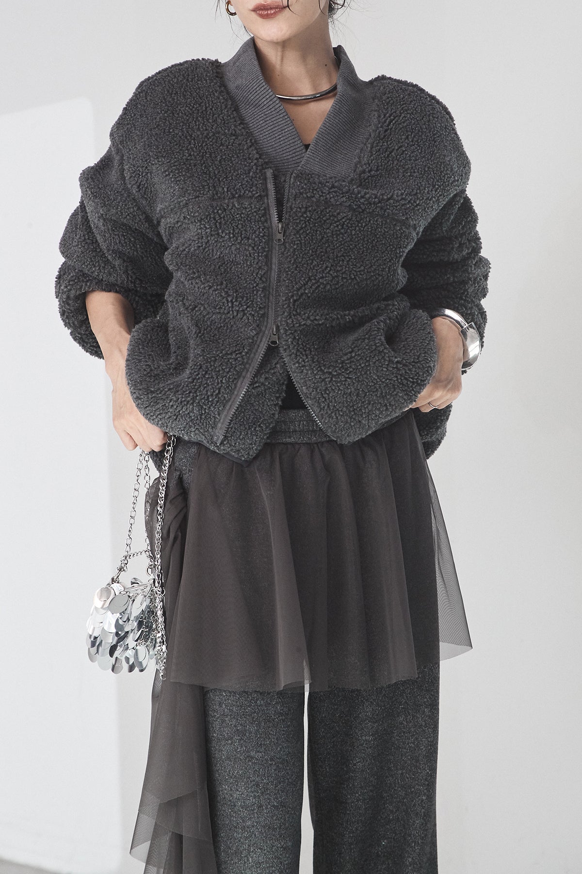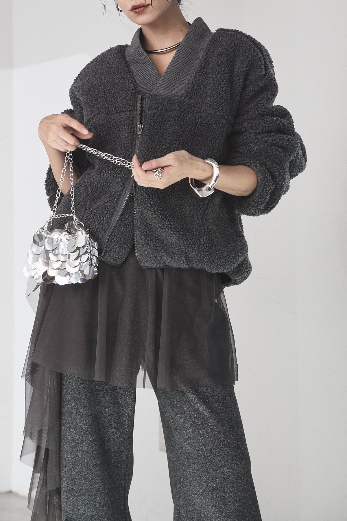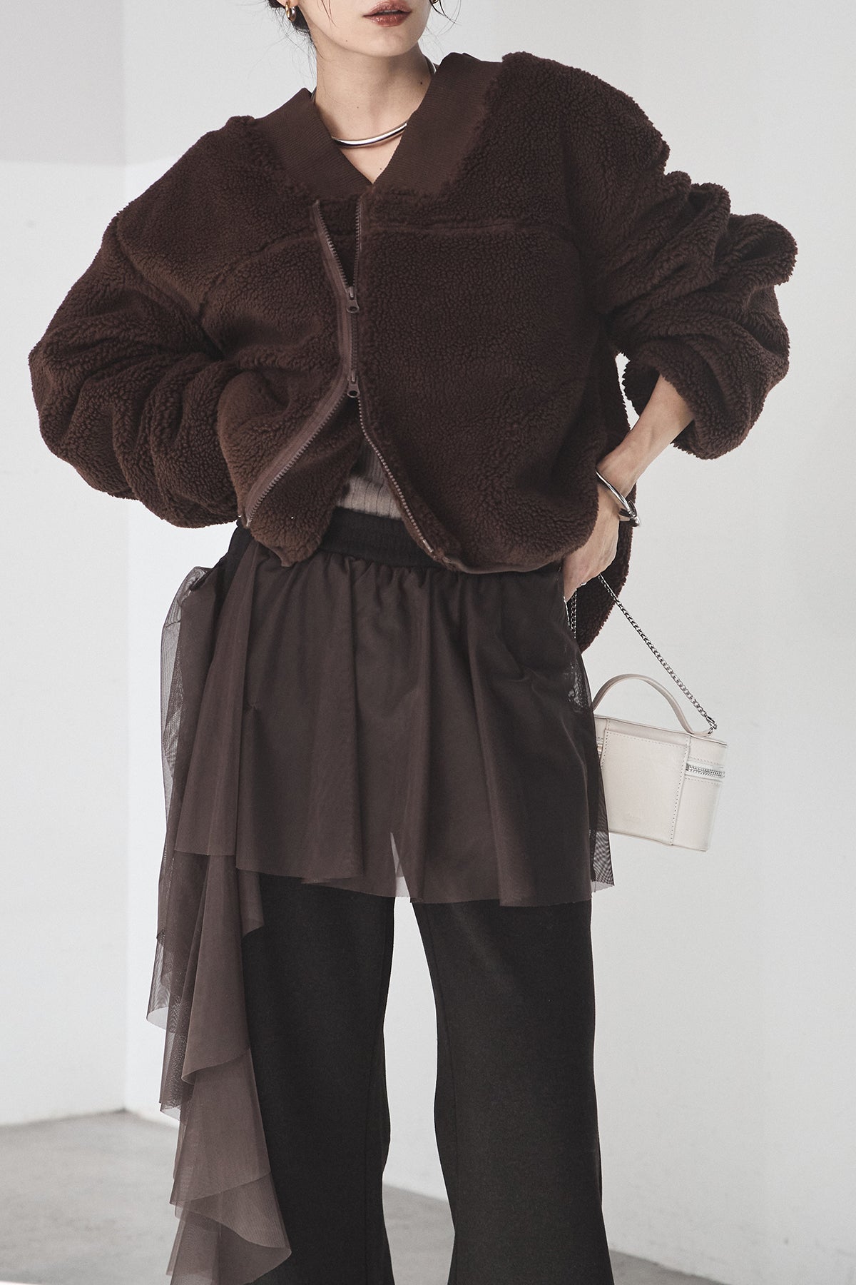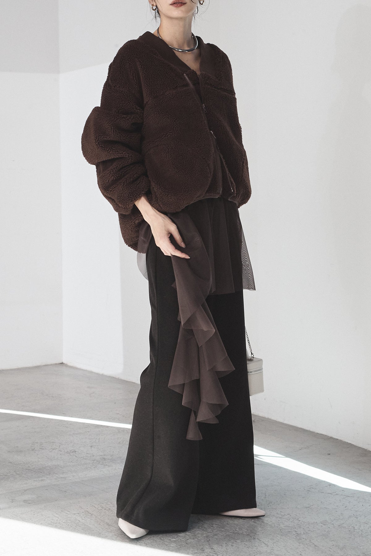 [SET]ノーカラーリブボアアウター+チュールレイヤードニットパンツ(2set)