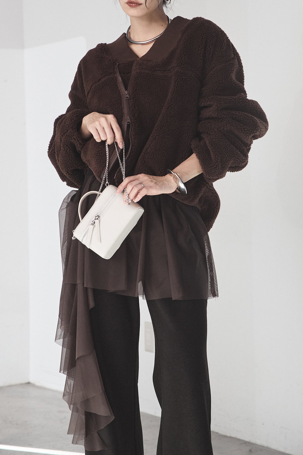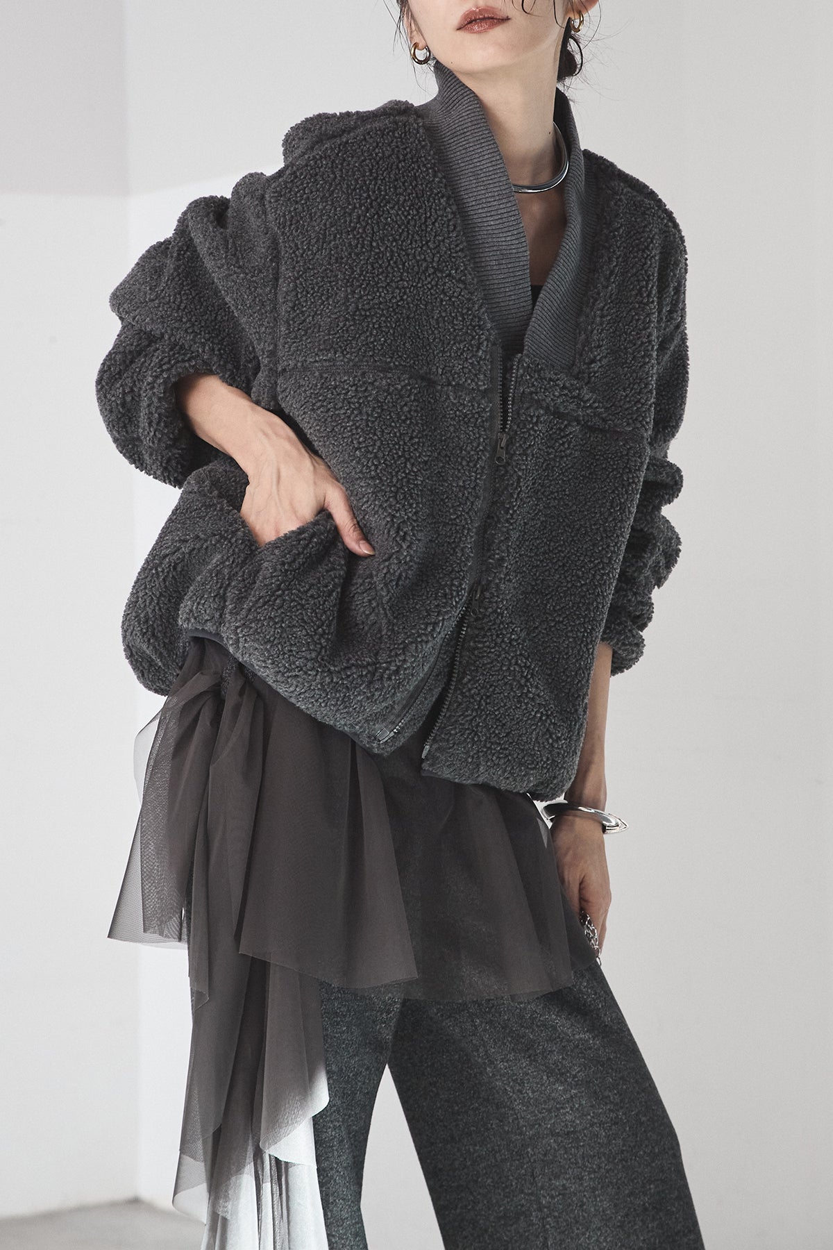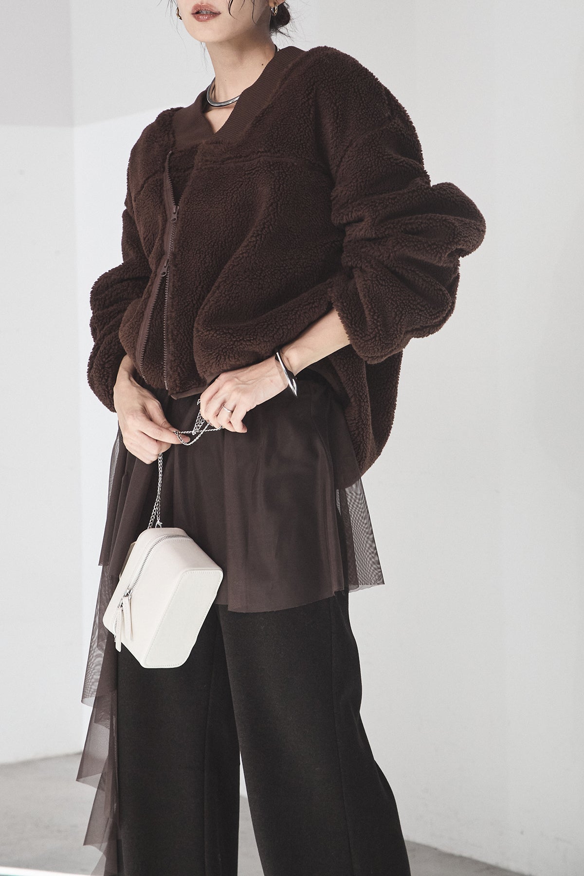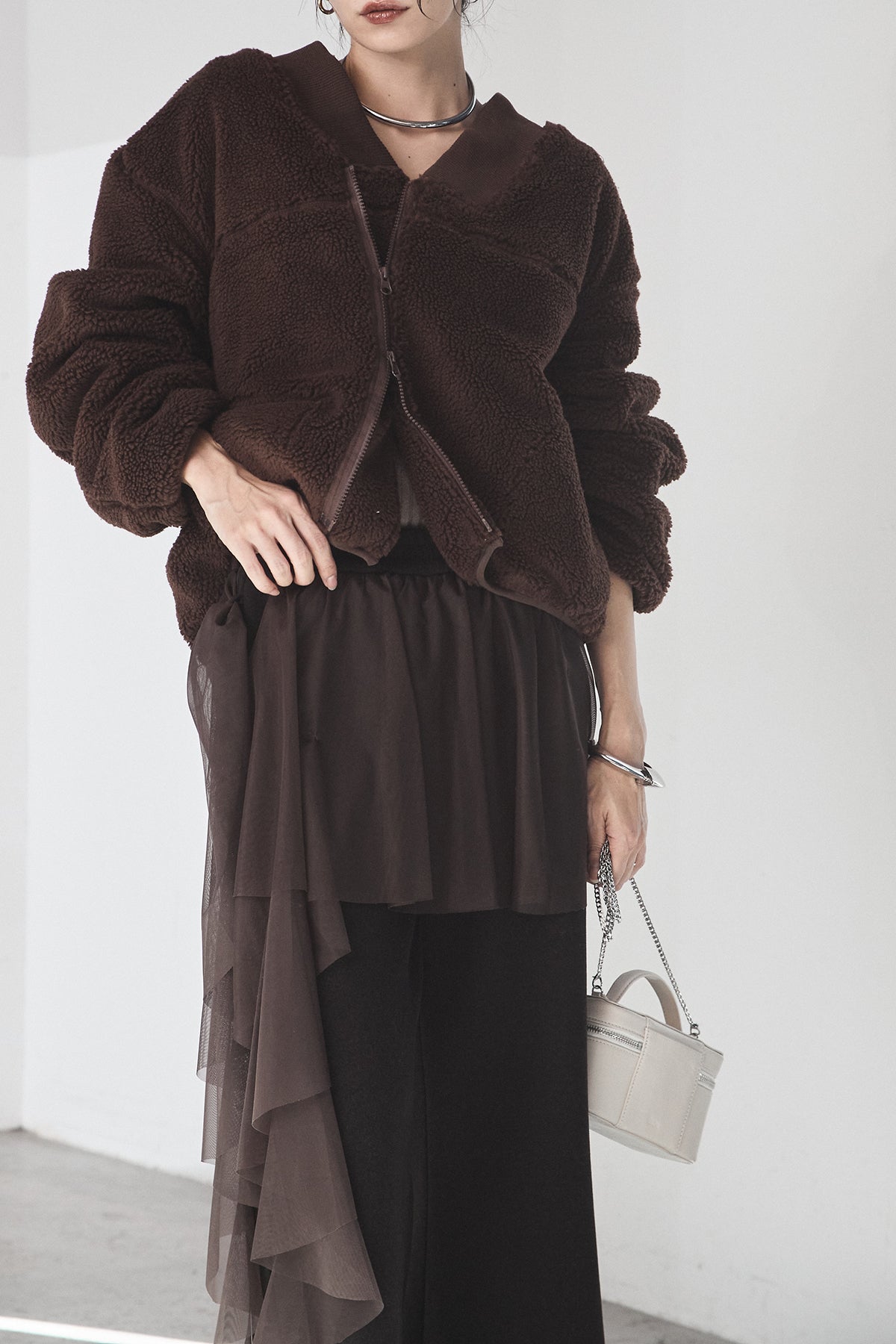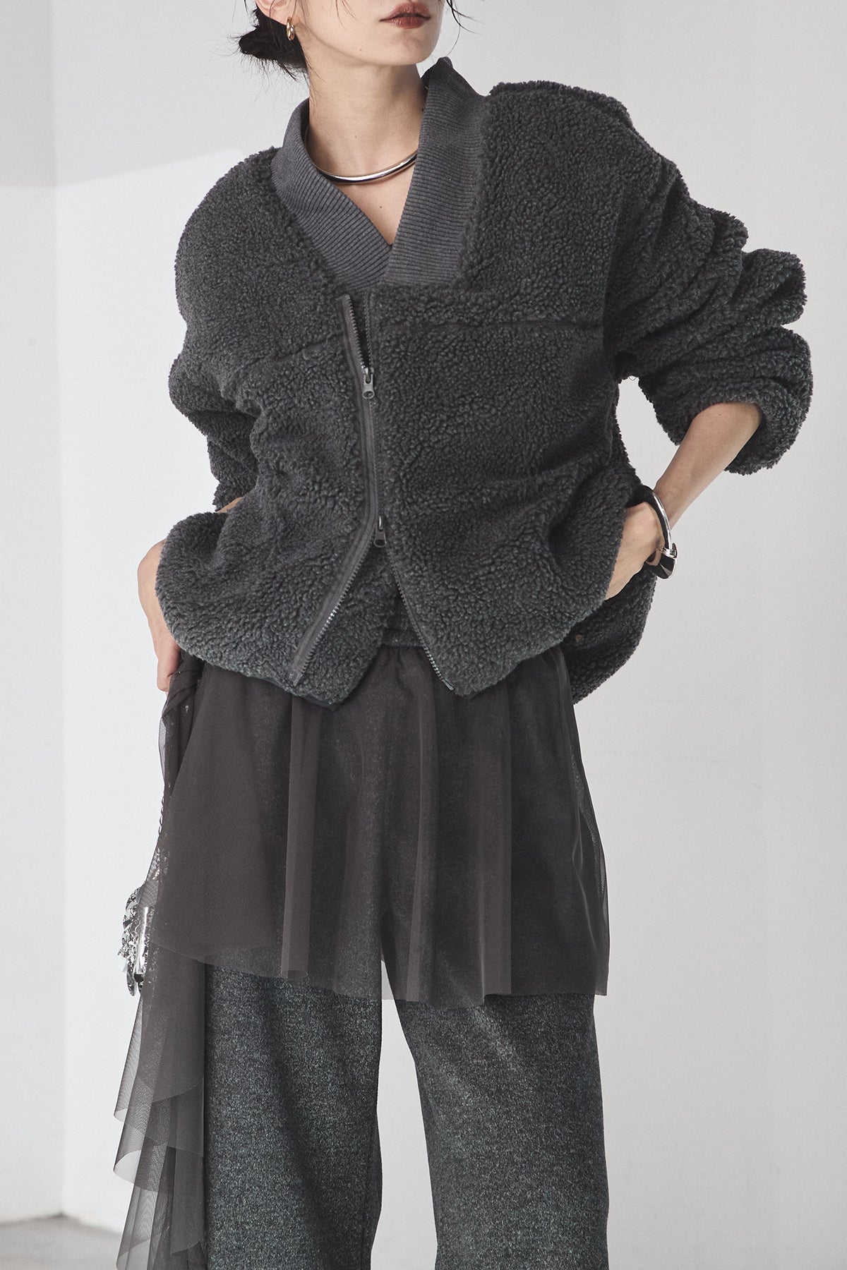[SET]ノーカラーリブボアアウター+チュールレイヤードニットパンツ(2set)