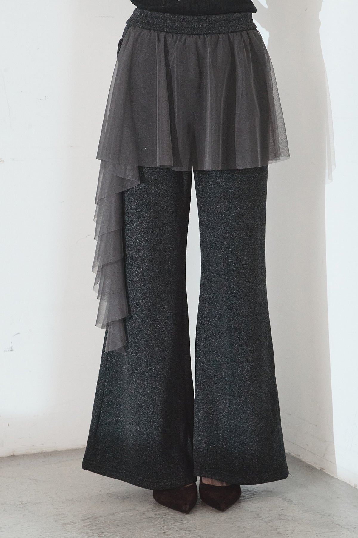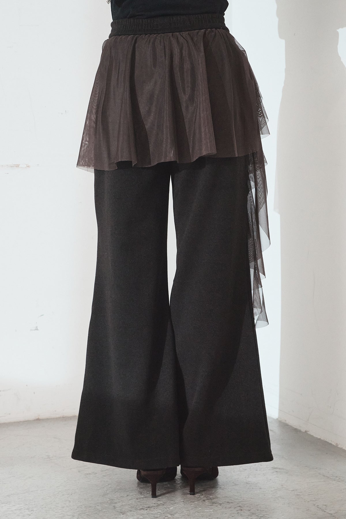 ニットパンツにチュールを重ねた、レイヤードデザインが目を引く一本。柔らかなニット素材に軽やかなチュールを合わせることで、甘さとモード感をバランスよく表現しています。縦に落ちるシルエットが脚のラインをすっきりと見せ、動くたびに表情の変化を楽しめるのも魅力。シンプルなトップスを合わせるだけで、スタイリングに奥行きを添えてくれるアイテムです。