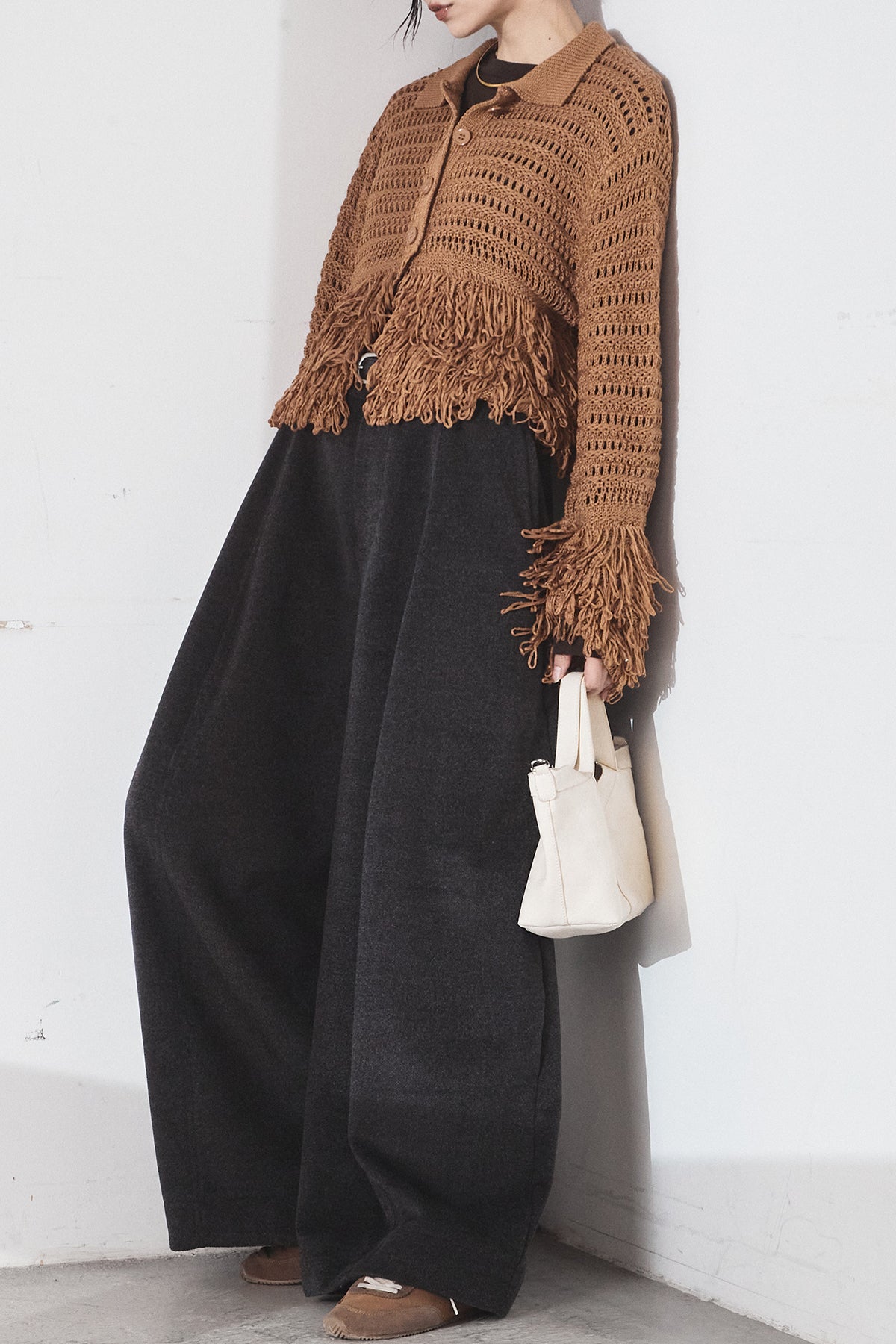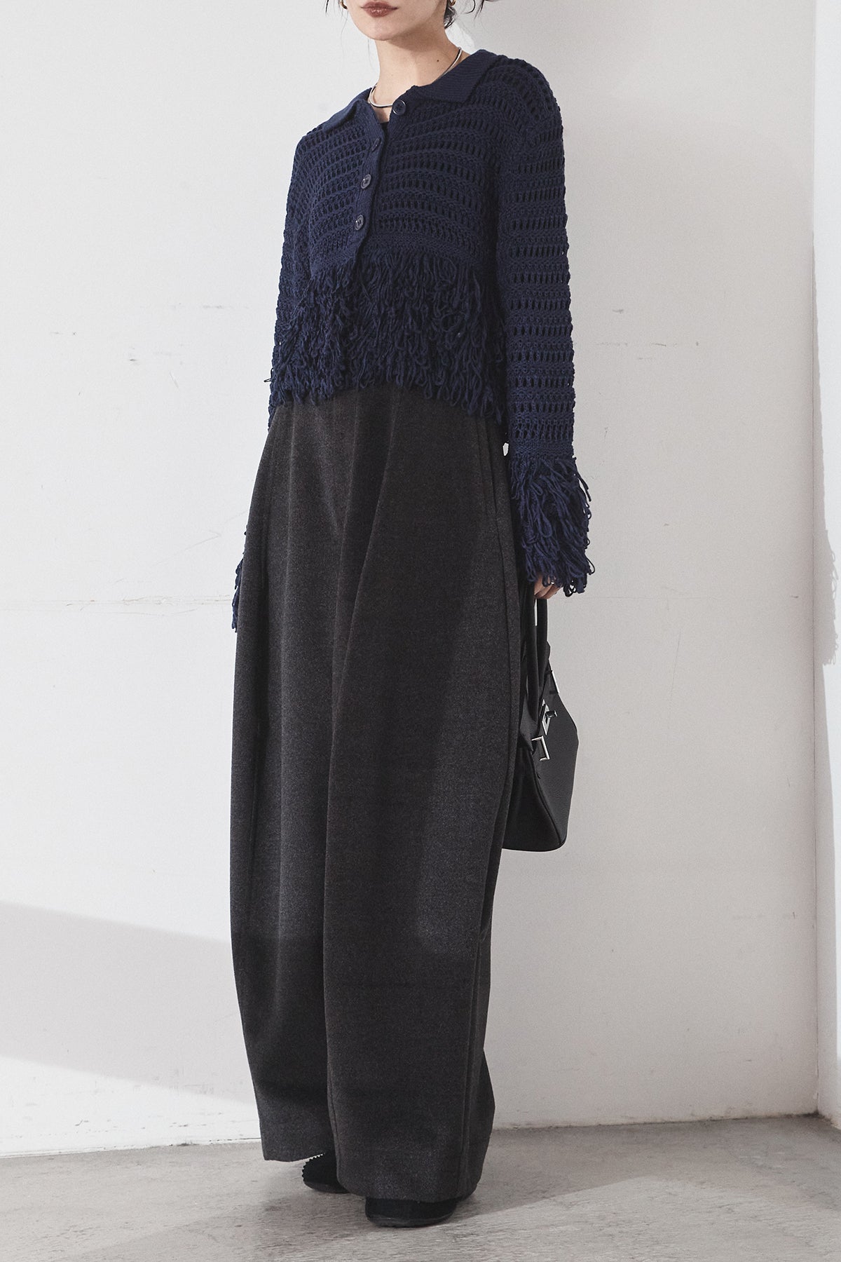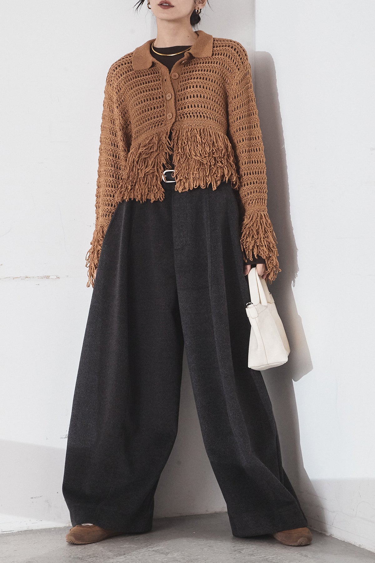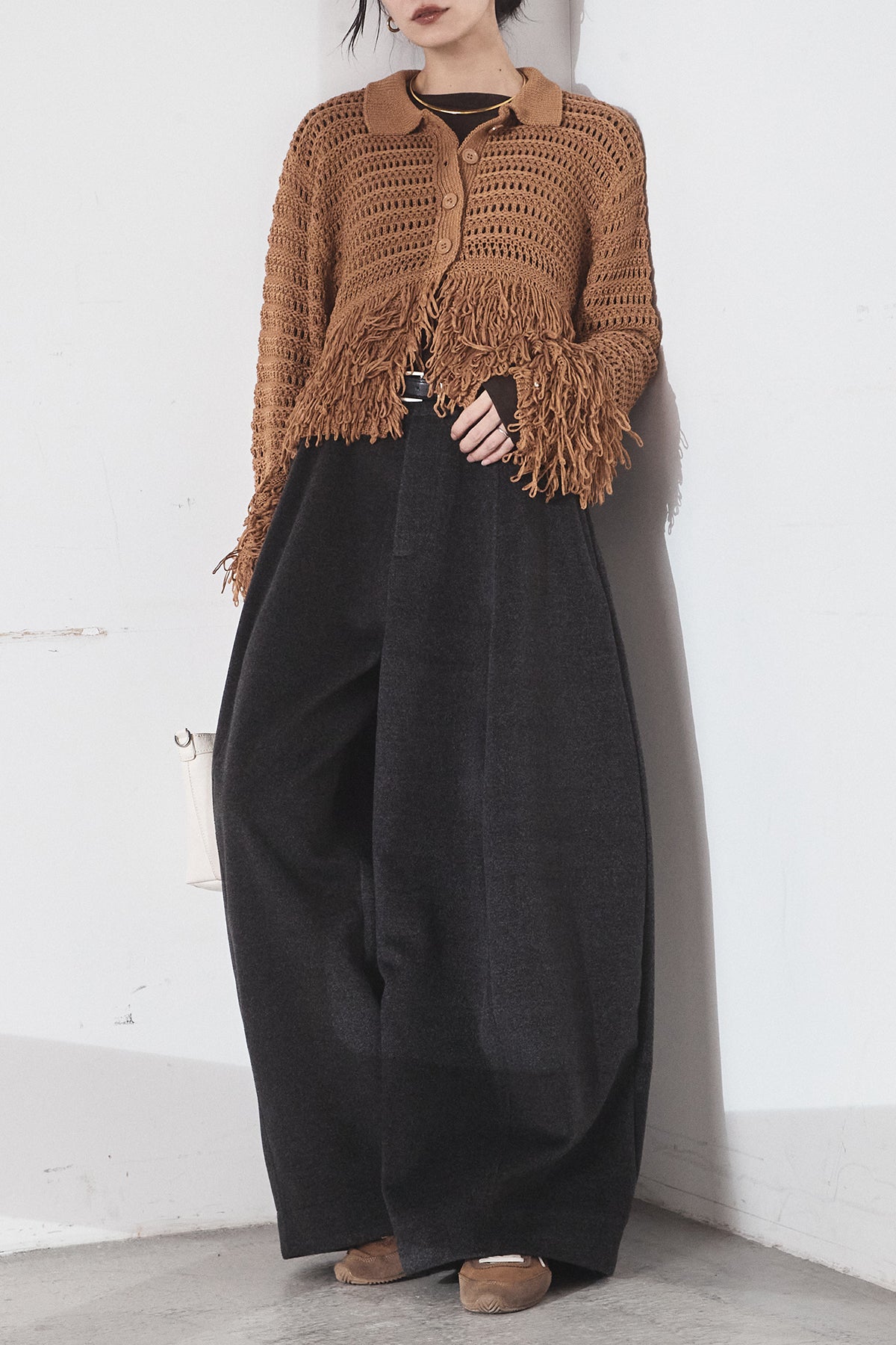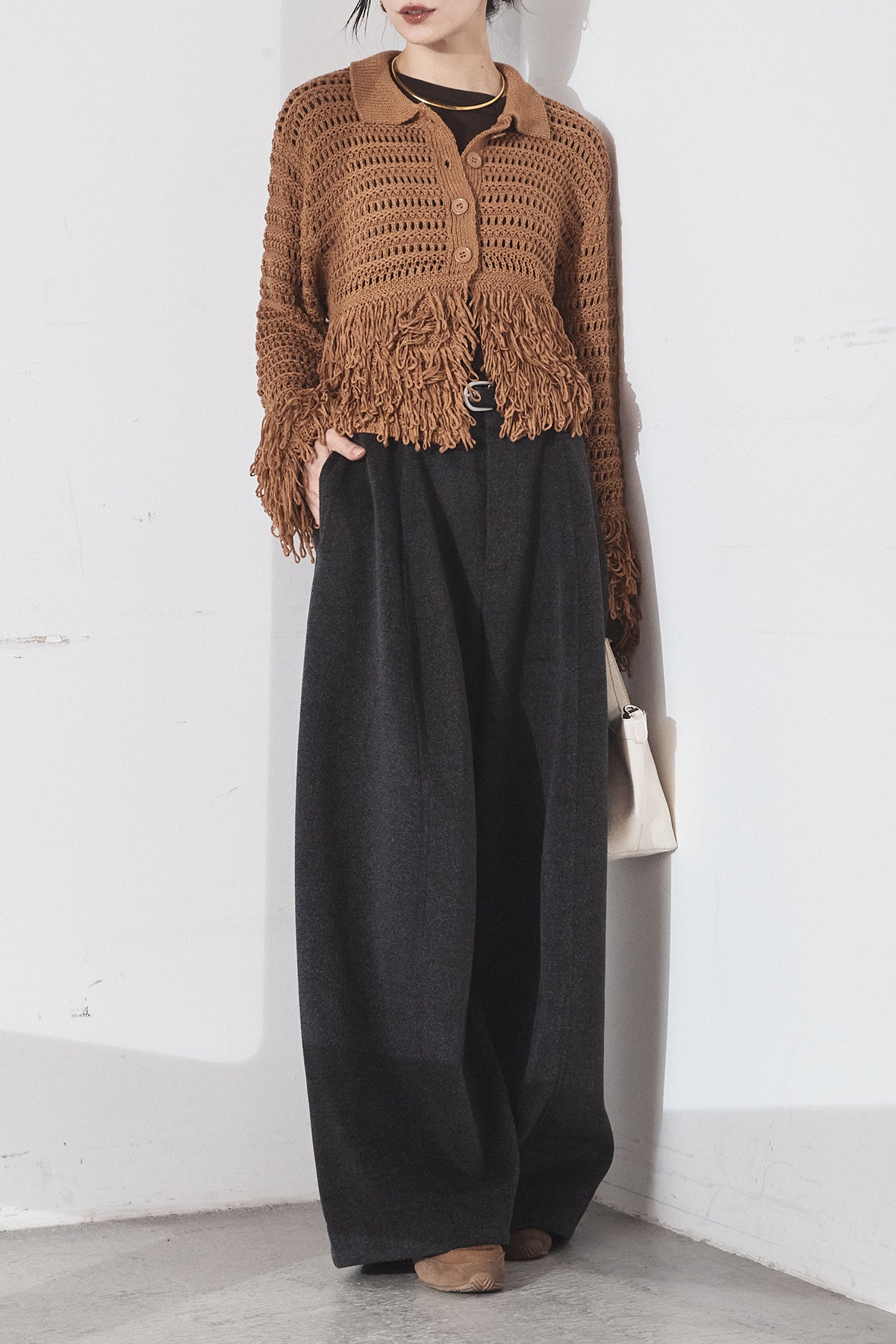 [SET]メッシュフリンジカーディガン+ウールタッチカーブワイドパンツ(2set)