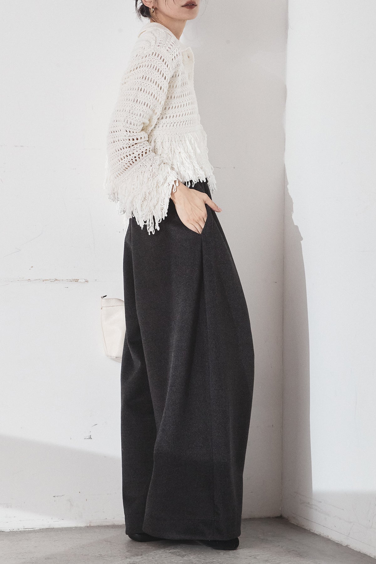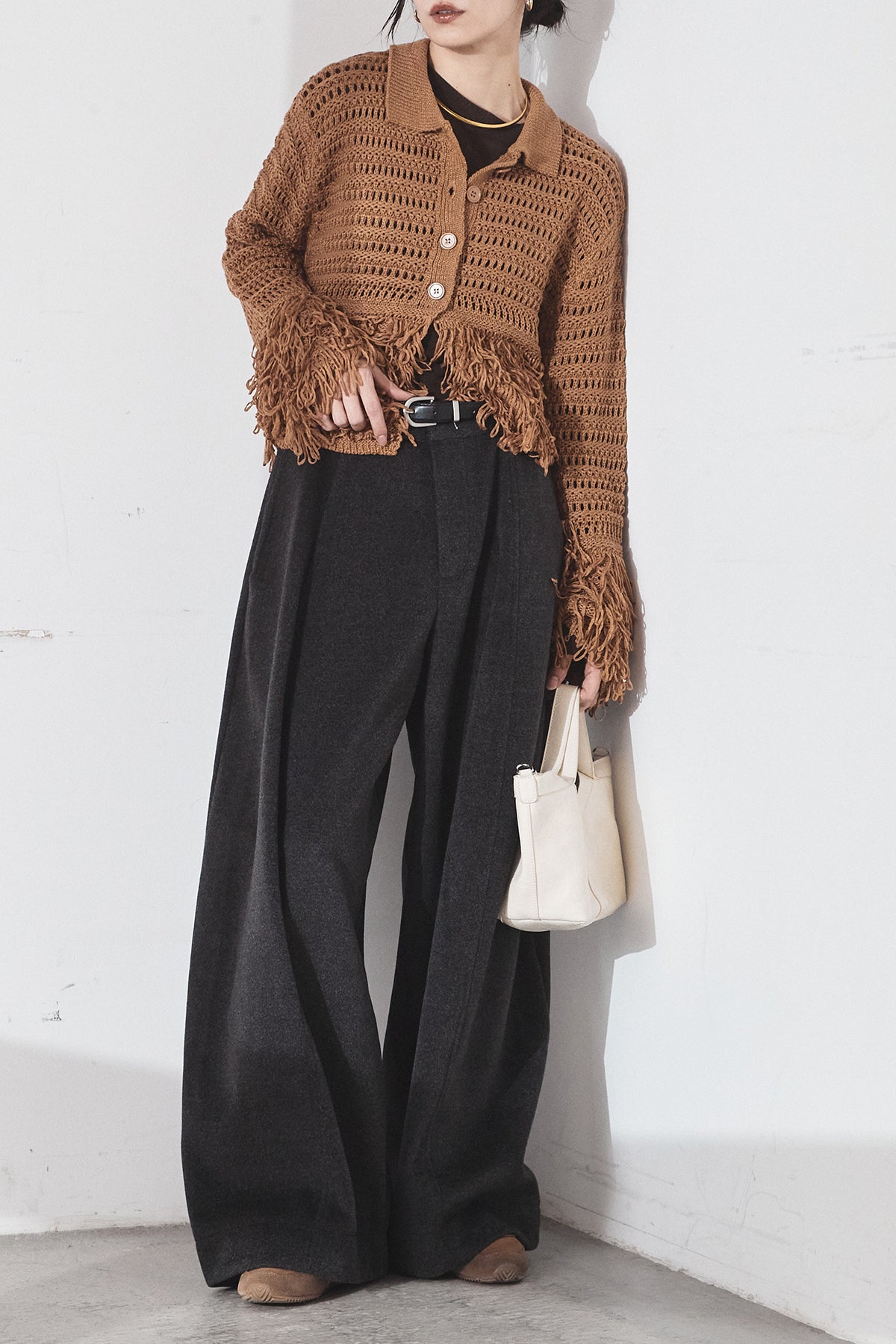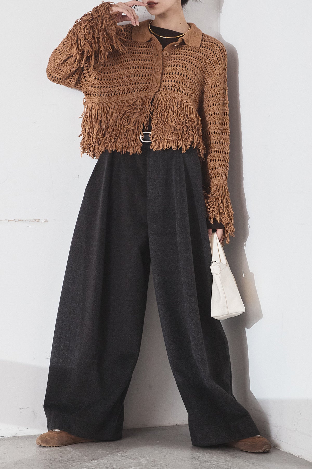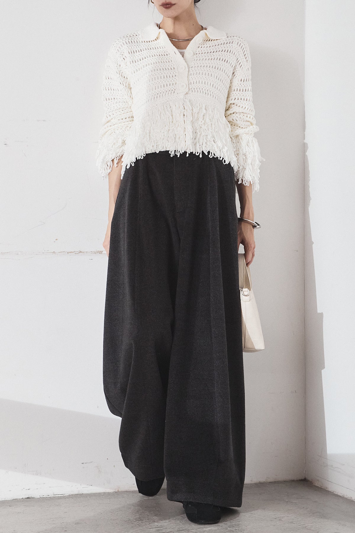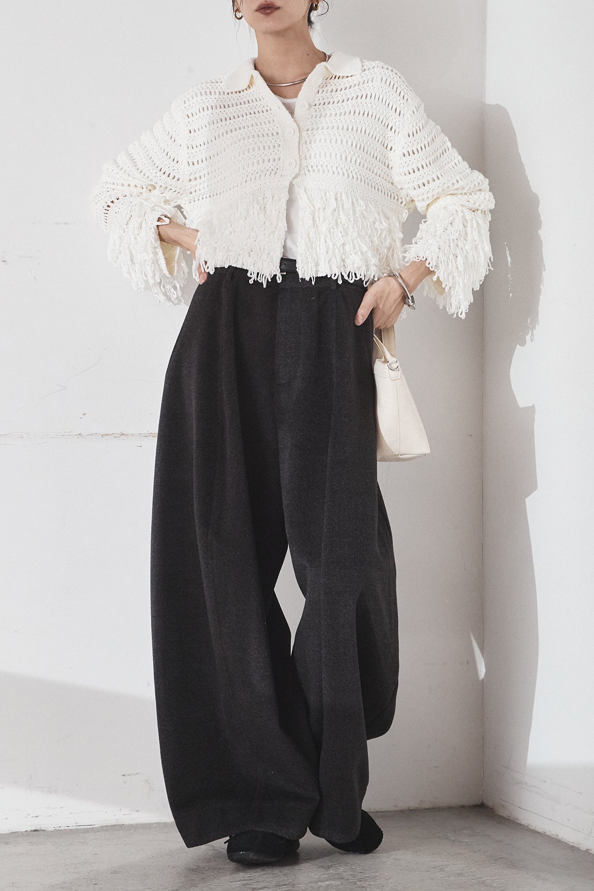 [SET]メッシュフリンジカーディガン+ウールタッチカーブワイドパンツ(2set)