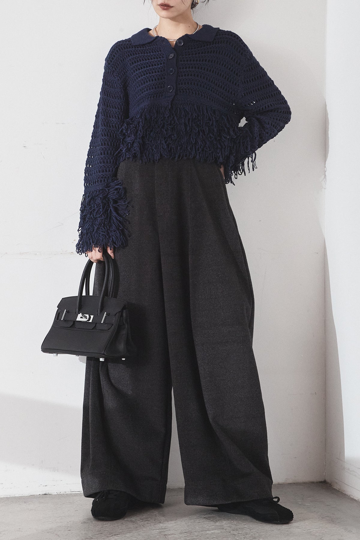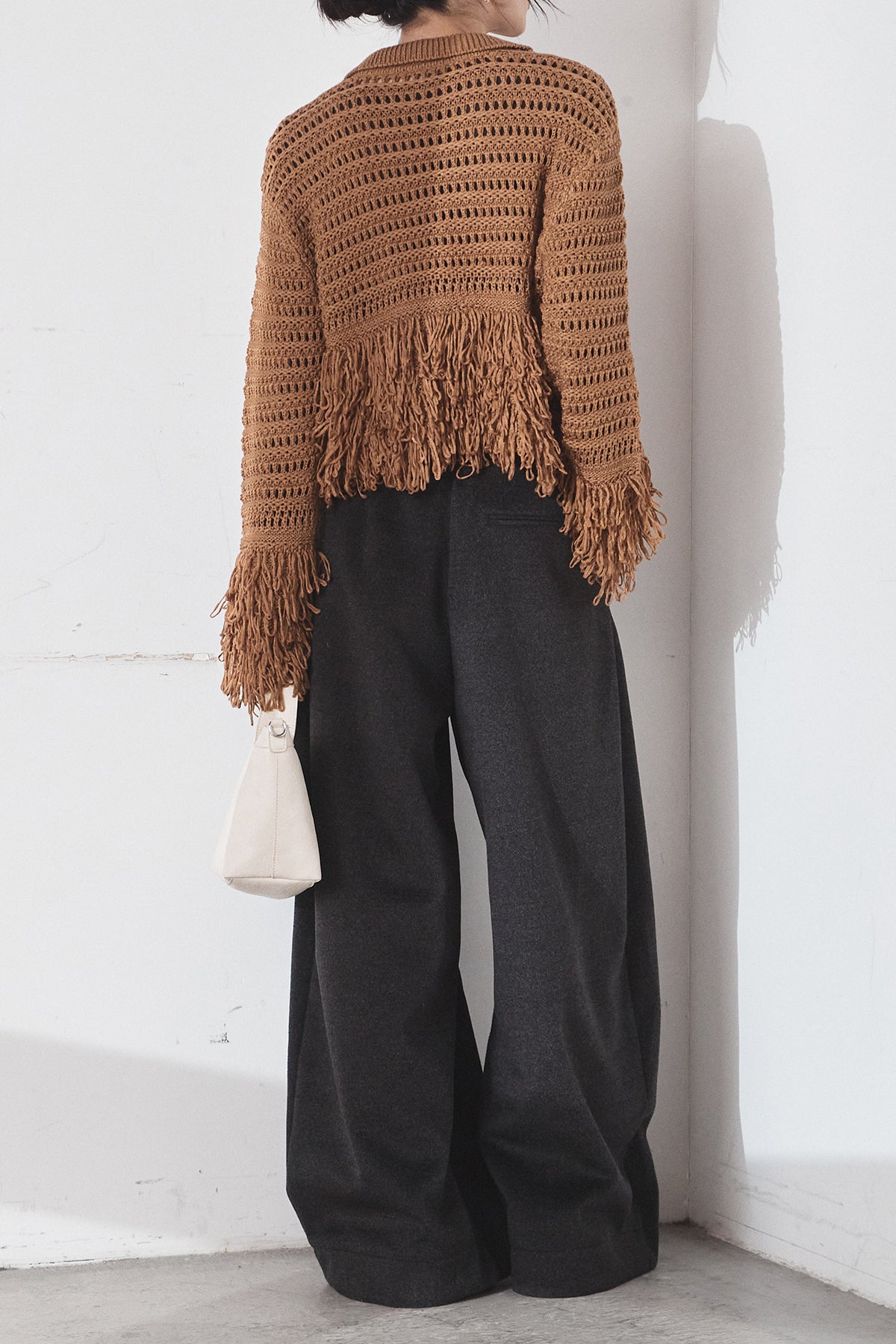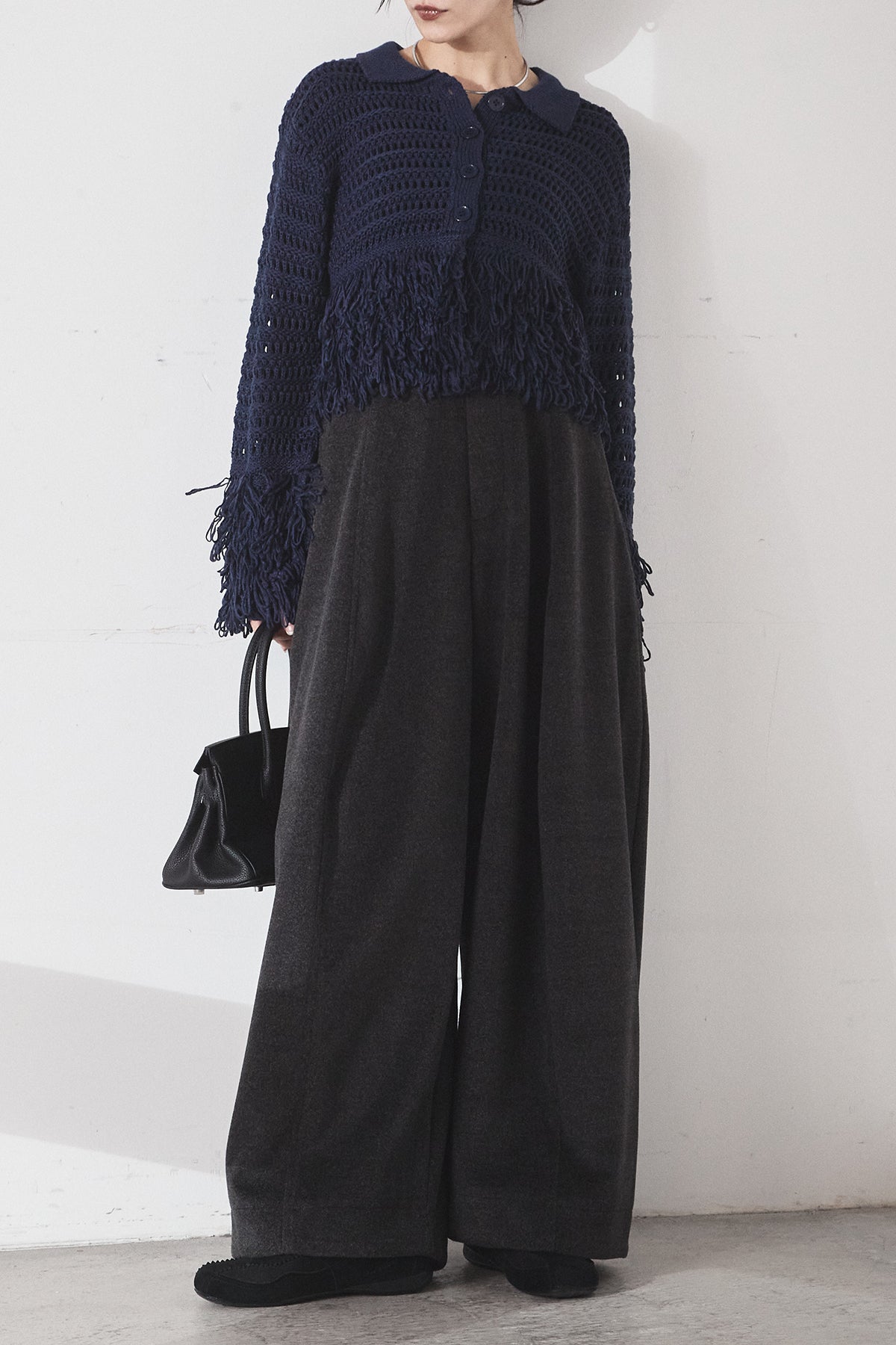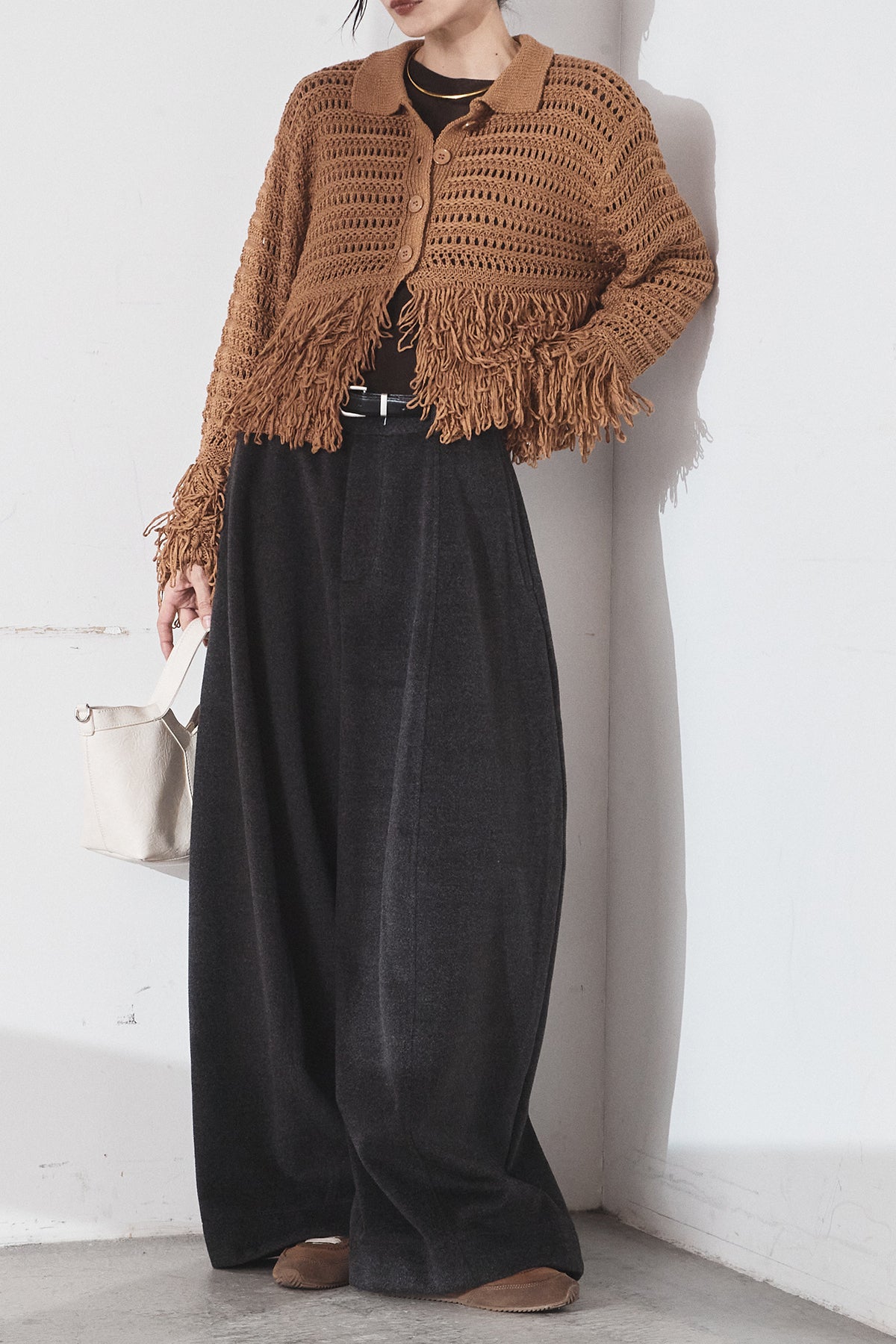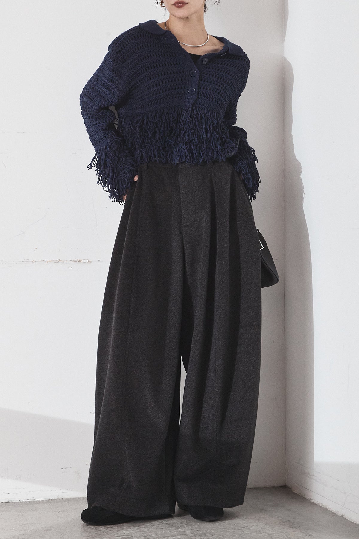 [SET]メッシュフリンジカーディガン+ウールタッチカーブワイドパンツ(2set)