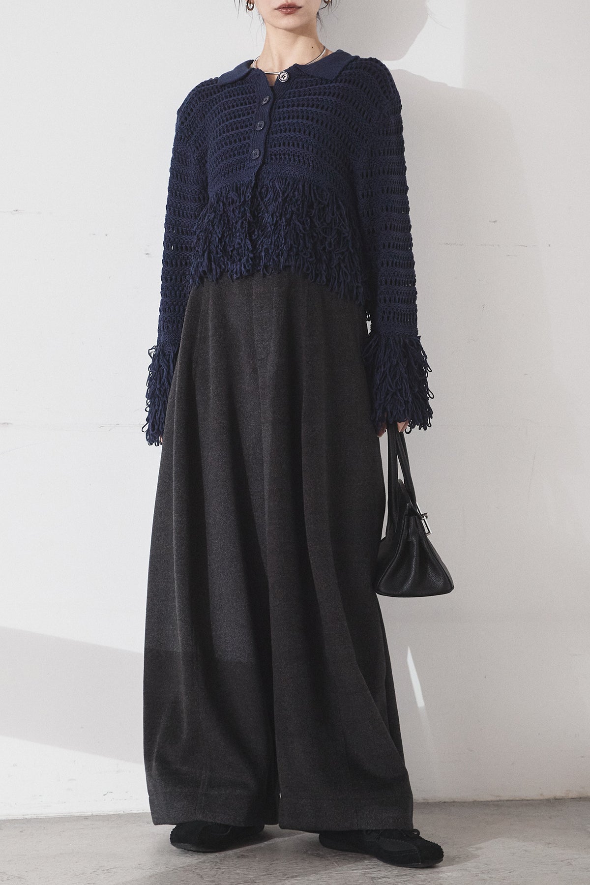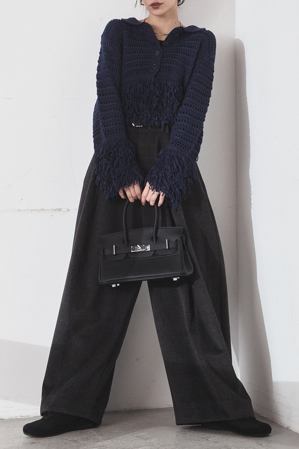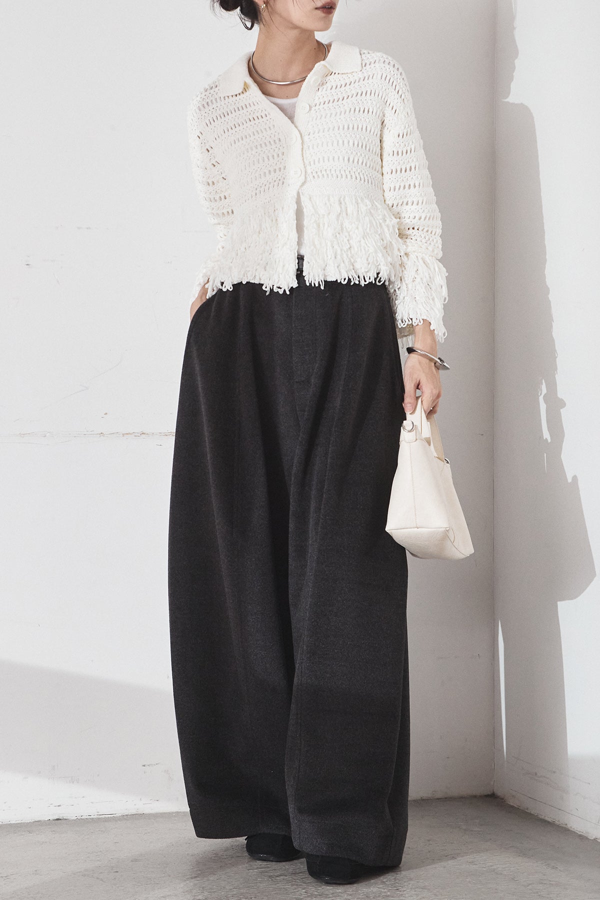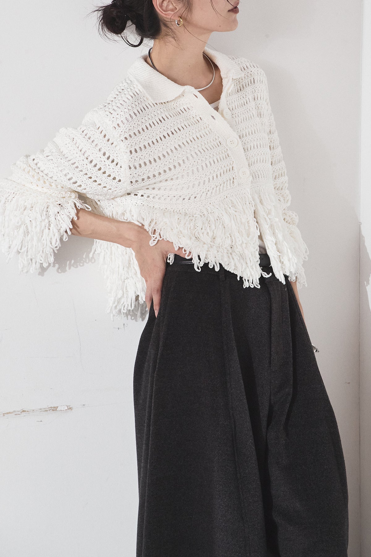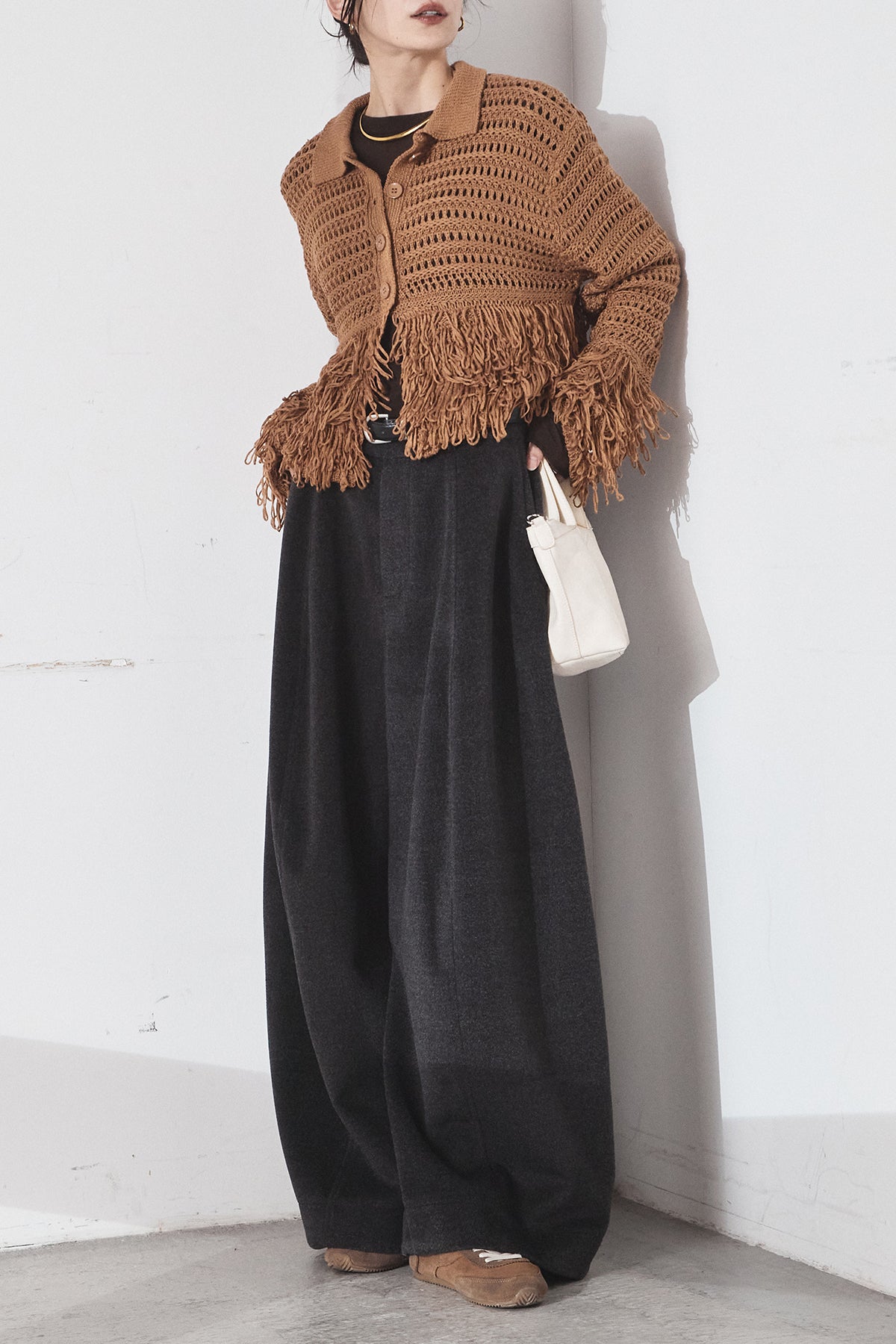 [SET]メッシュフリンジカーディガン+ウールタッチカーブワイドパンツ(2set)