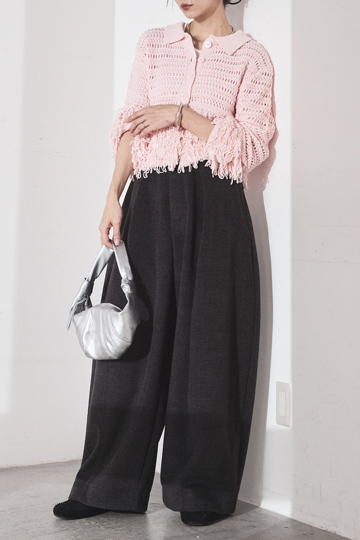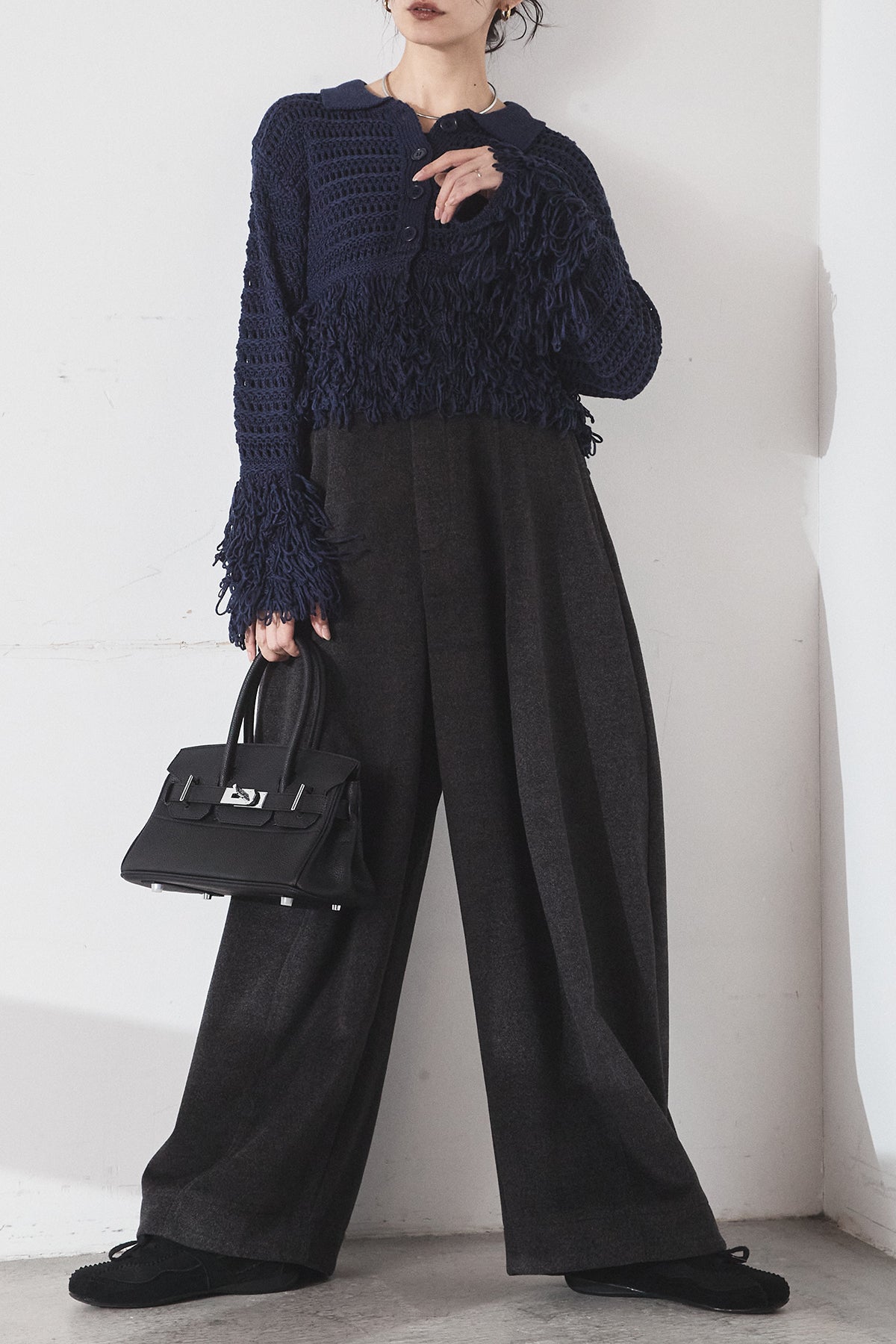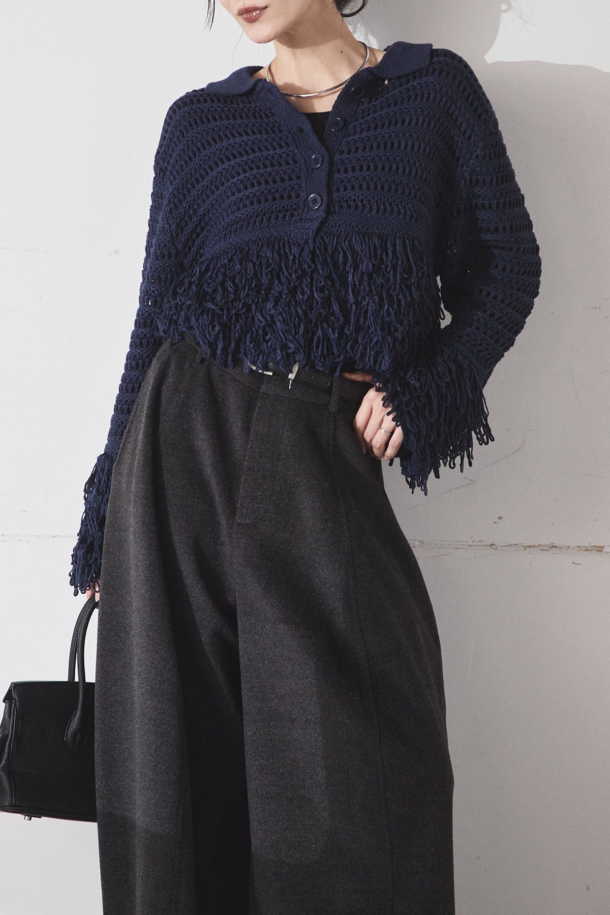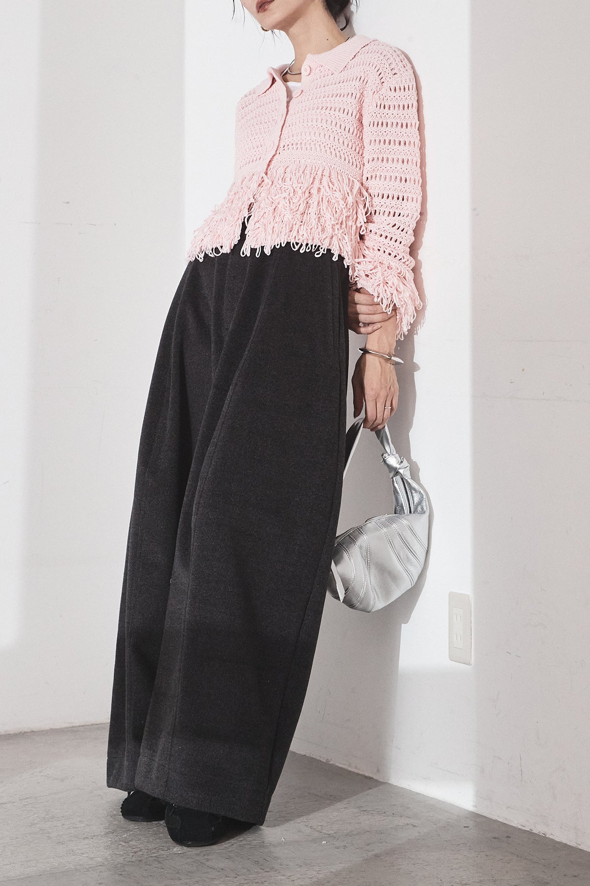 [SET]メッシュフリンジカーディガン+ウールタッチカーブワイドパンツ(2set)