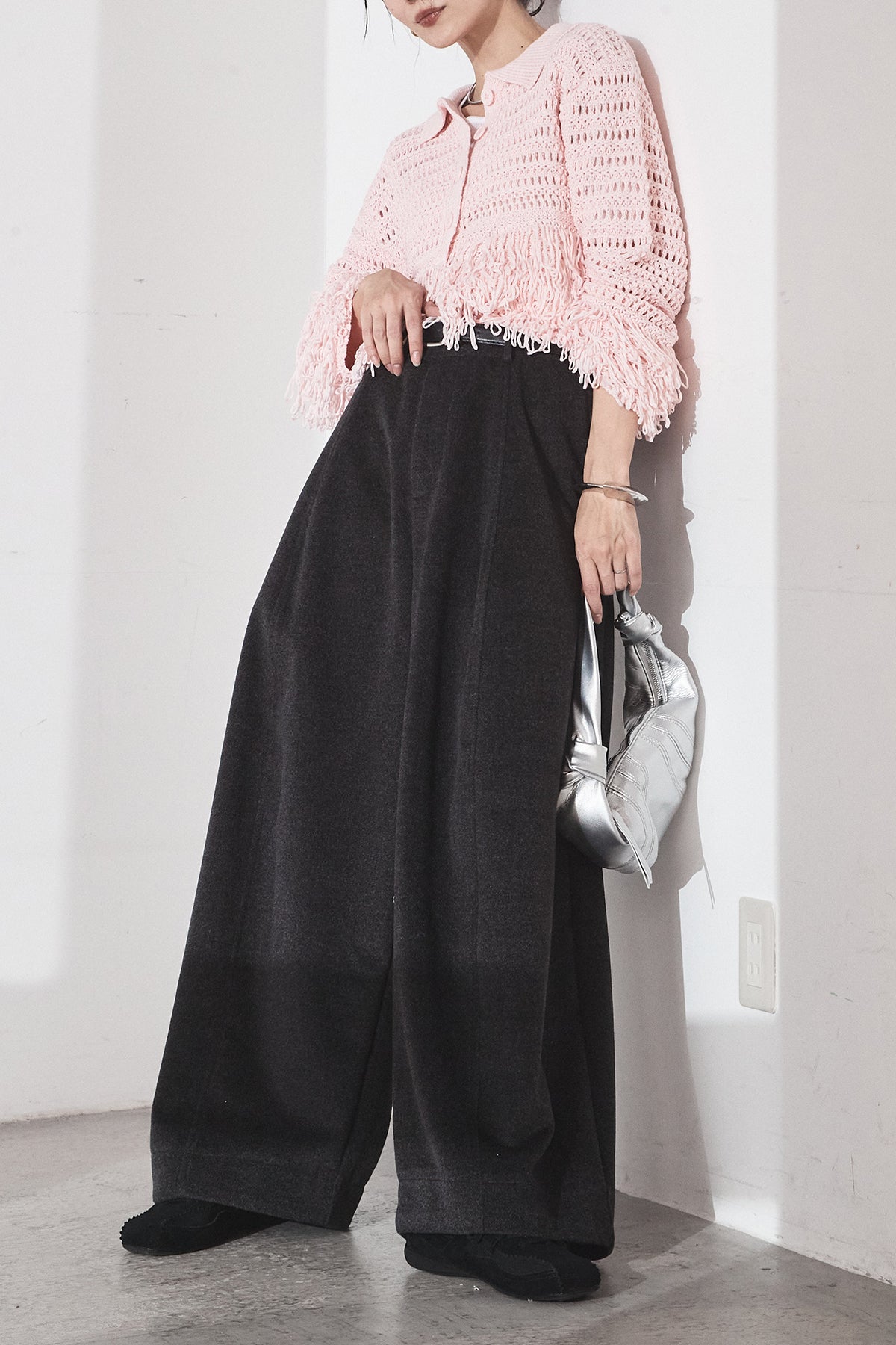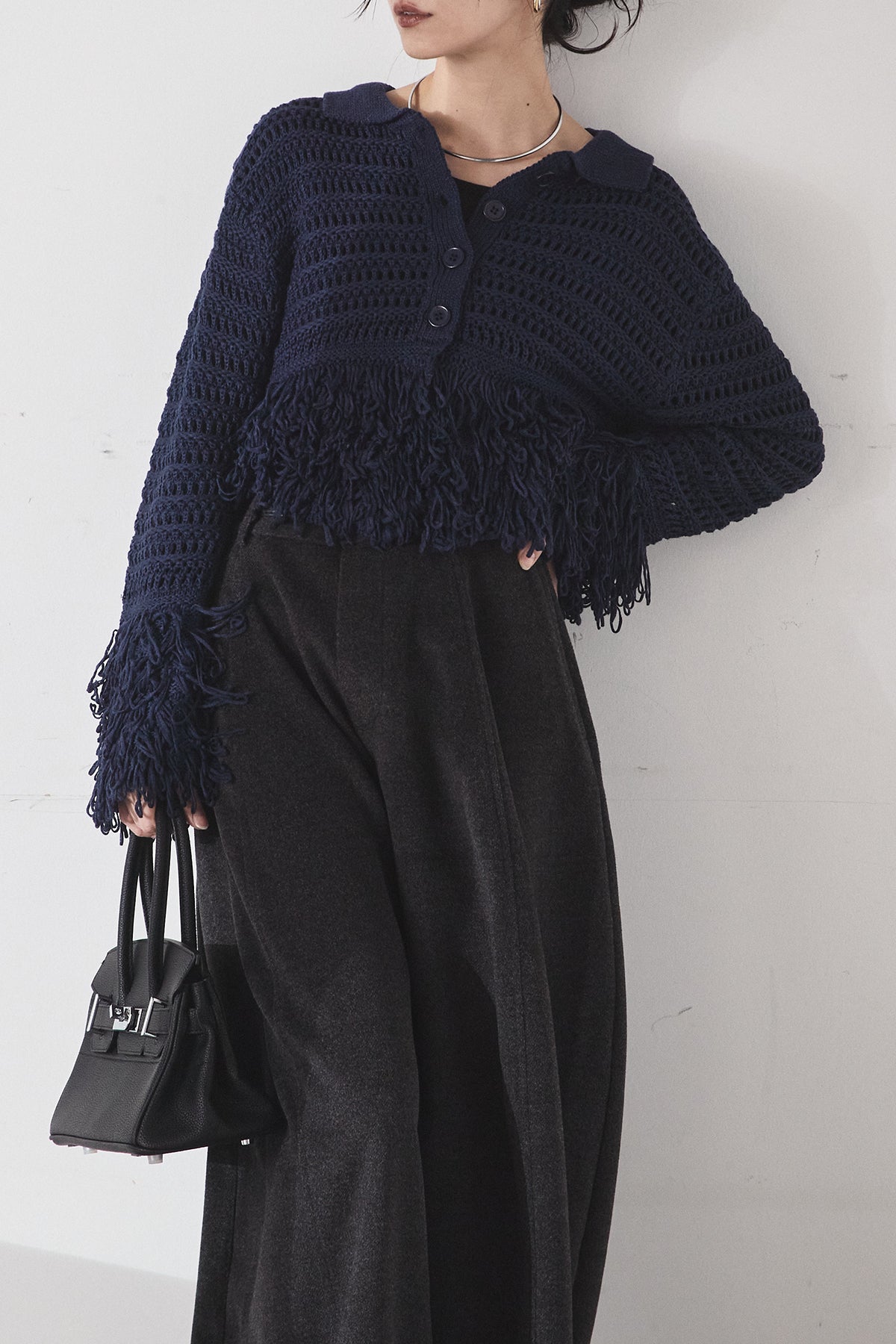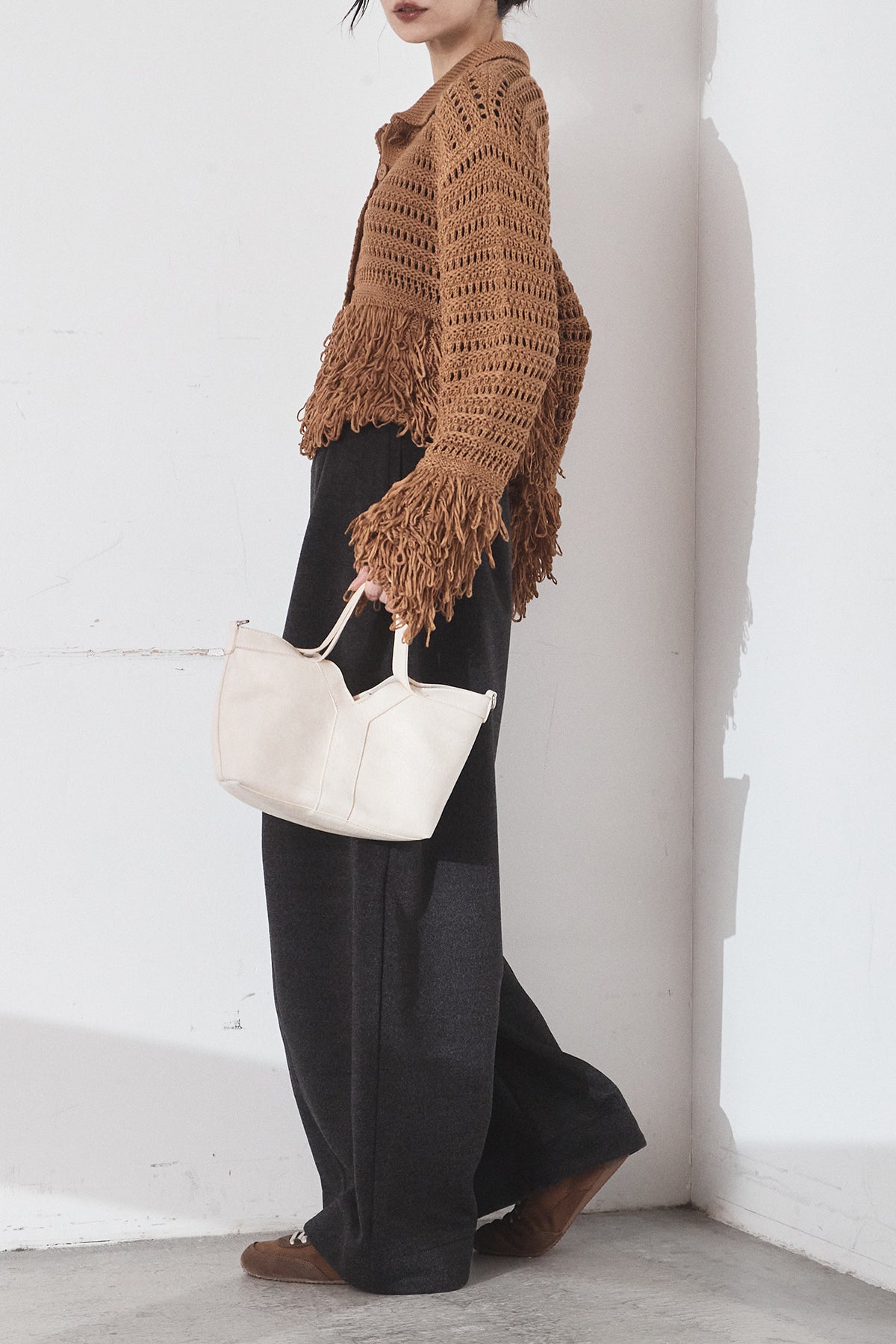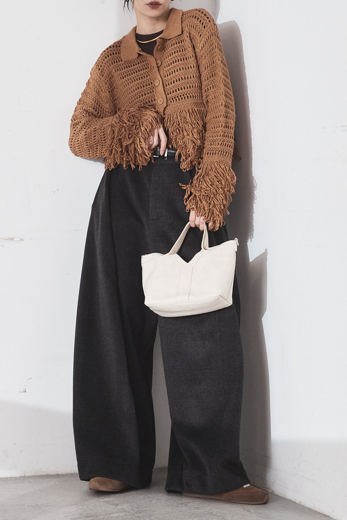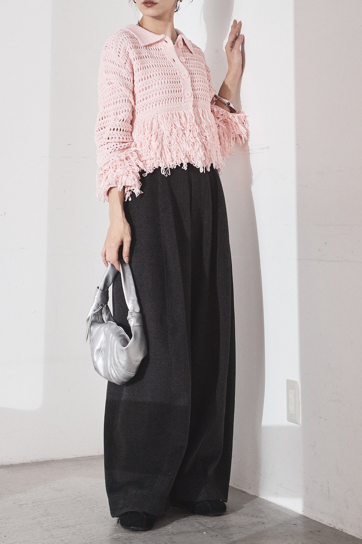 [SET]メッシュフリンジカーディガン+ウールタッチカーブワイドパンツ(2set)