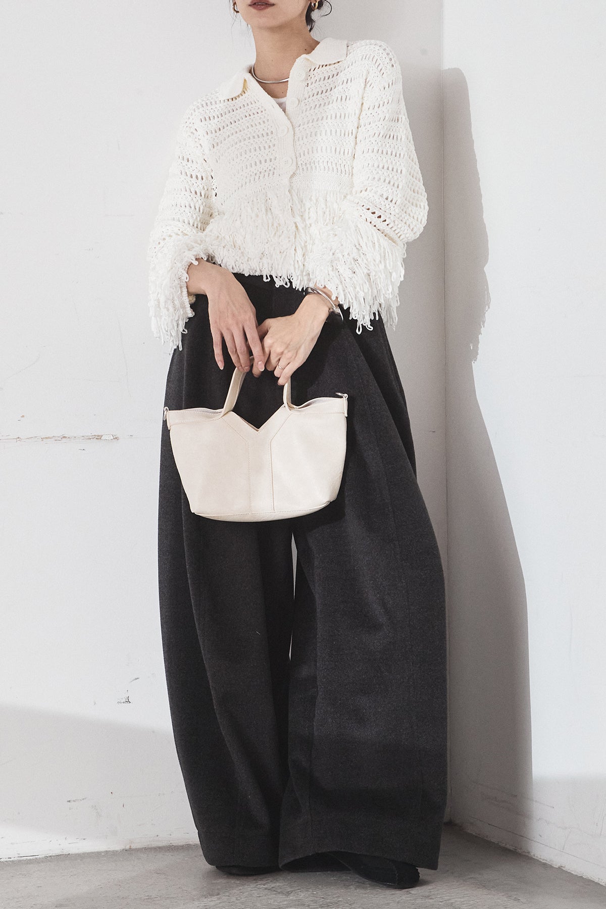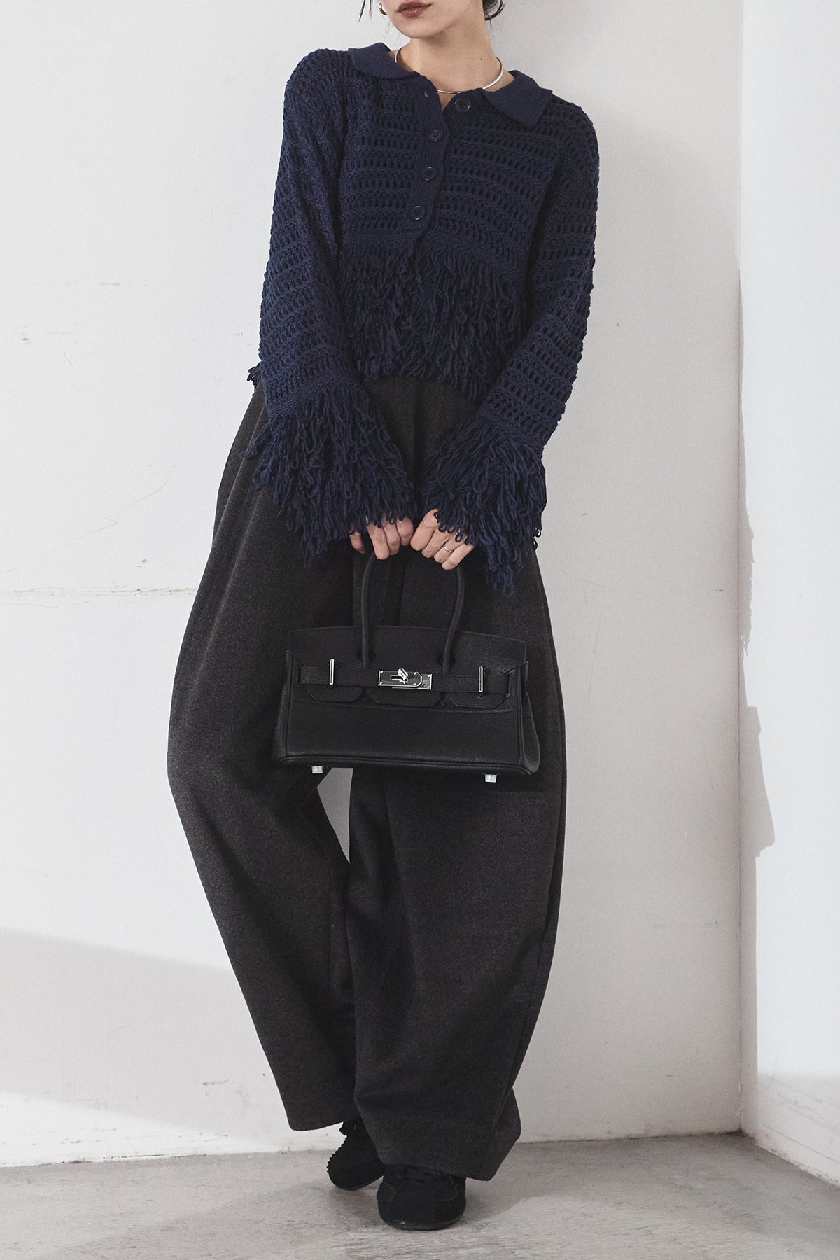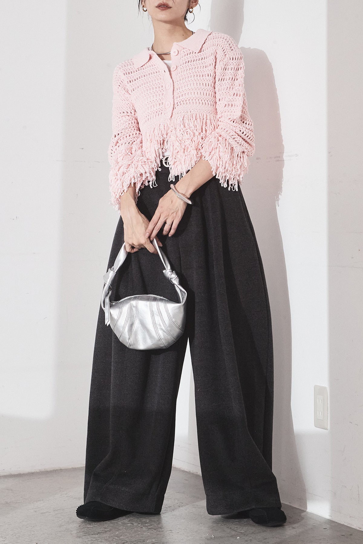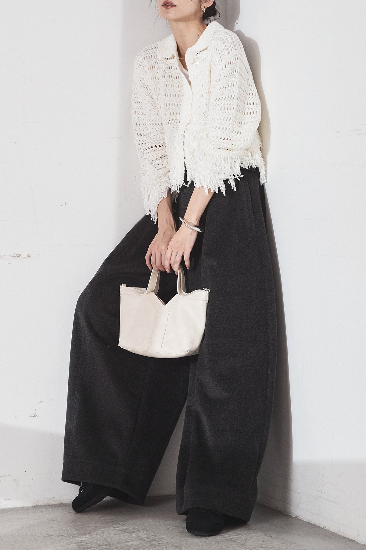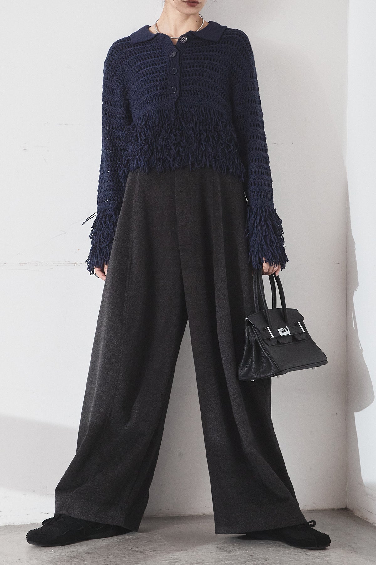 [SET]メッシュフリンジカーディガン+ウールタッチカーブワイドパンツ(2set)