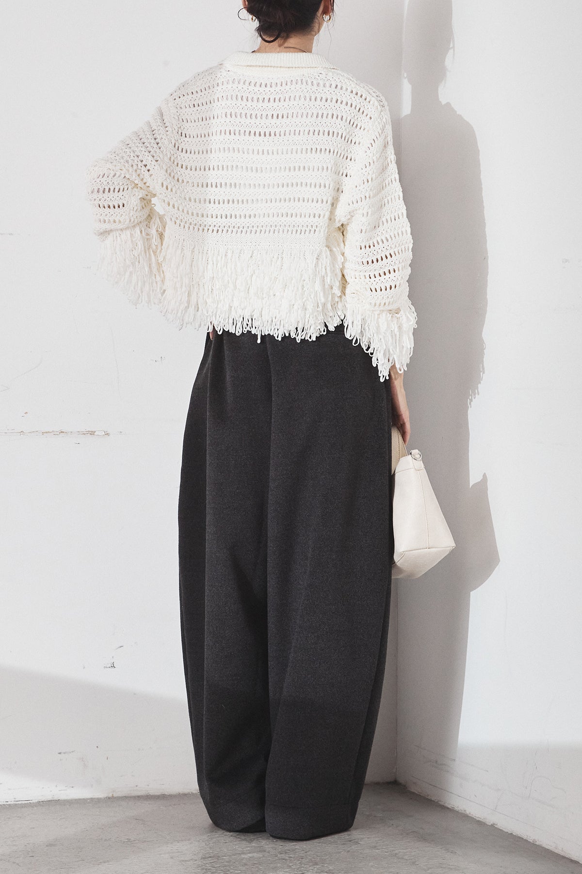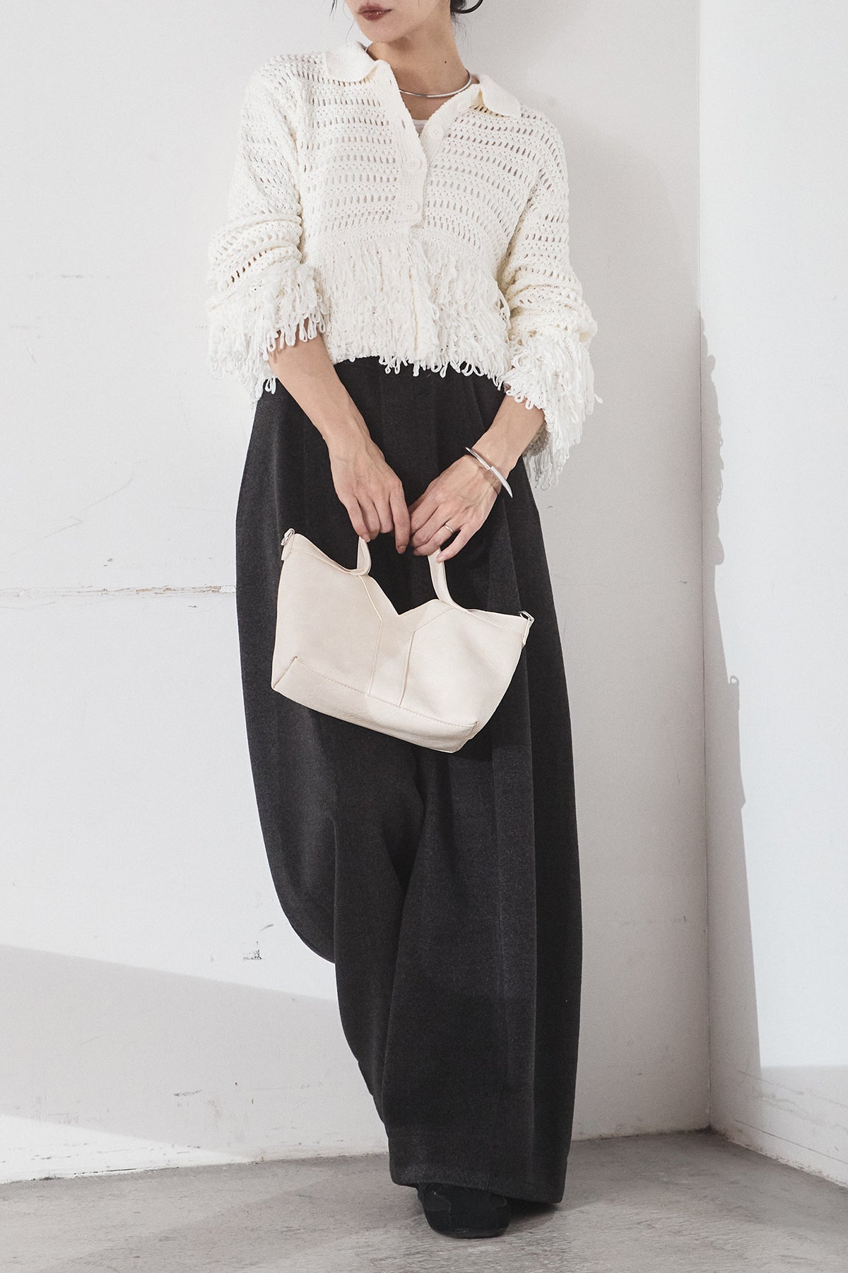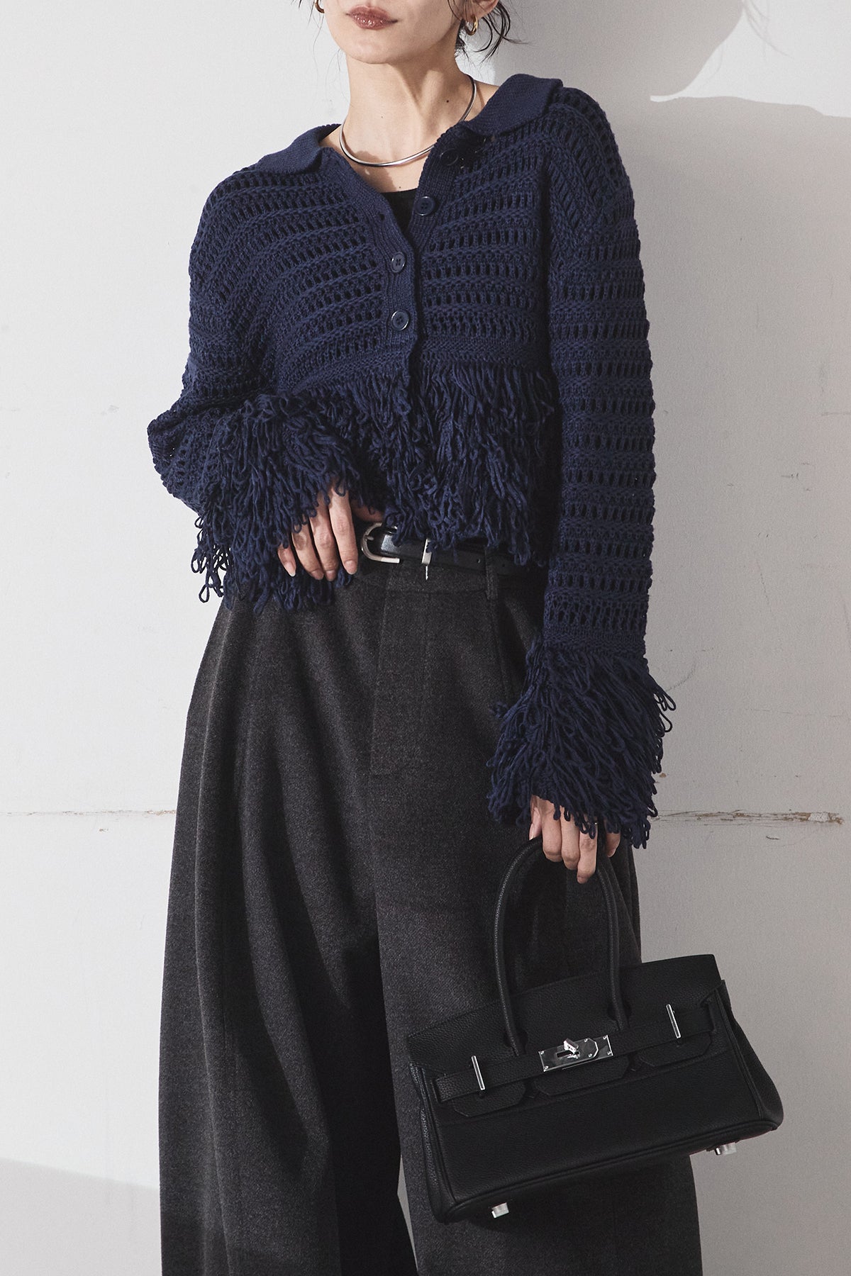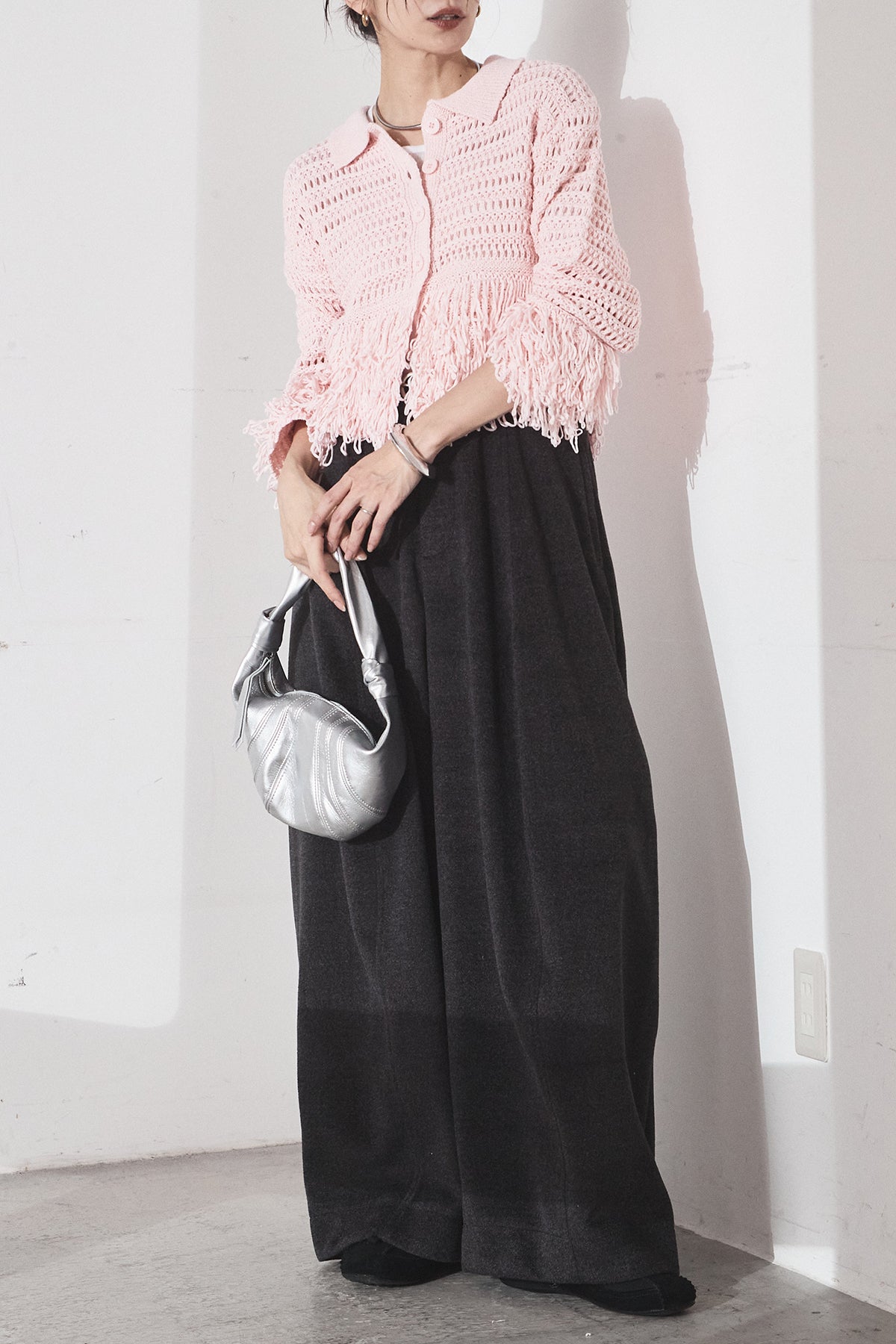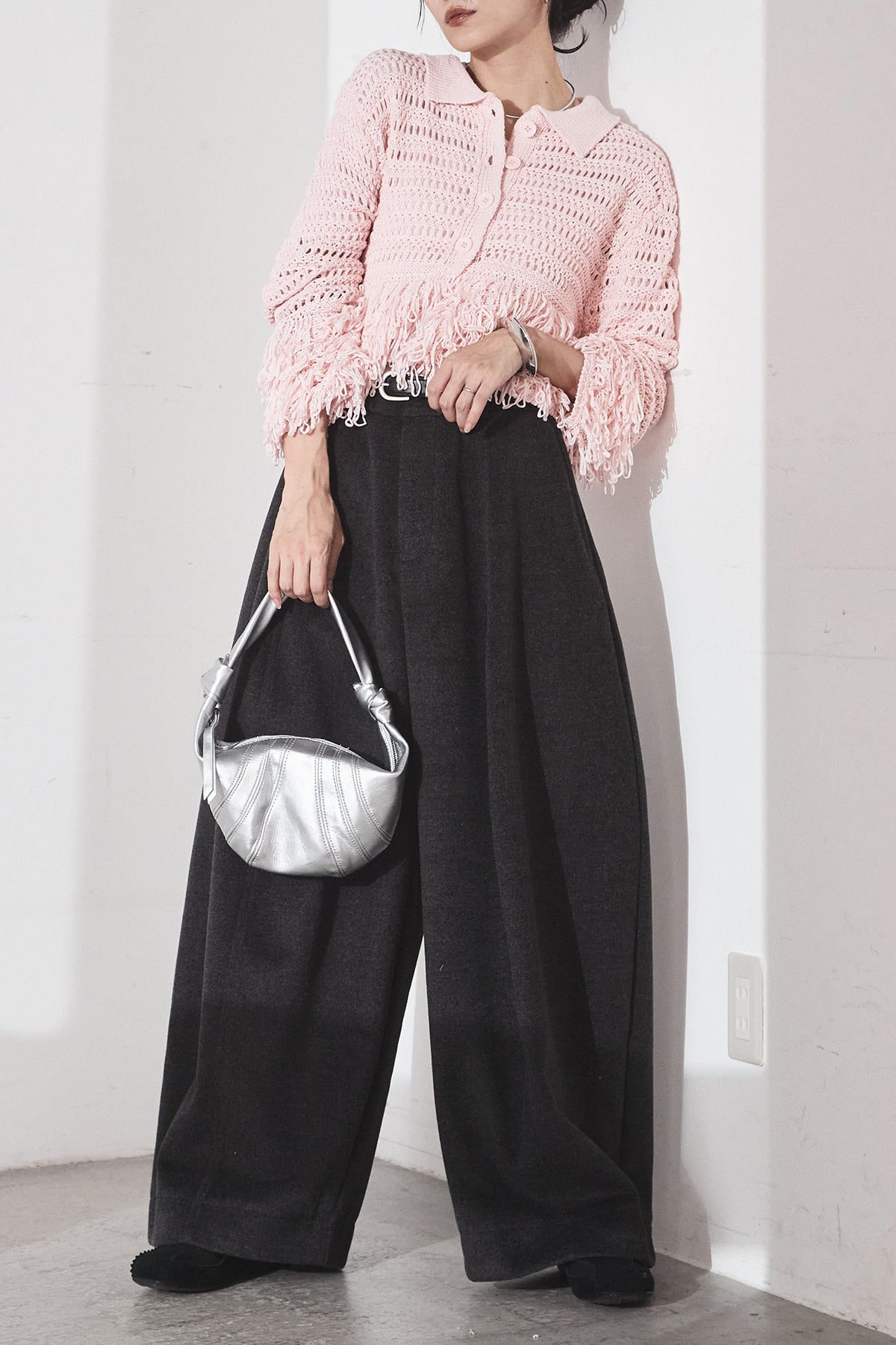 [SET]メッシュフリンジカーディガン+ウールタッチカーブワイドパンツ(2set)