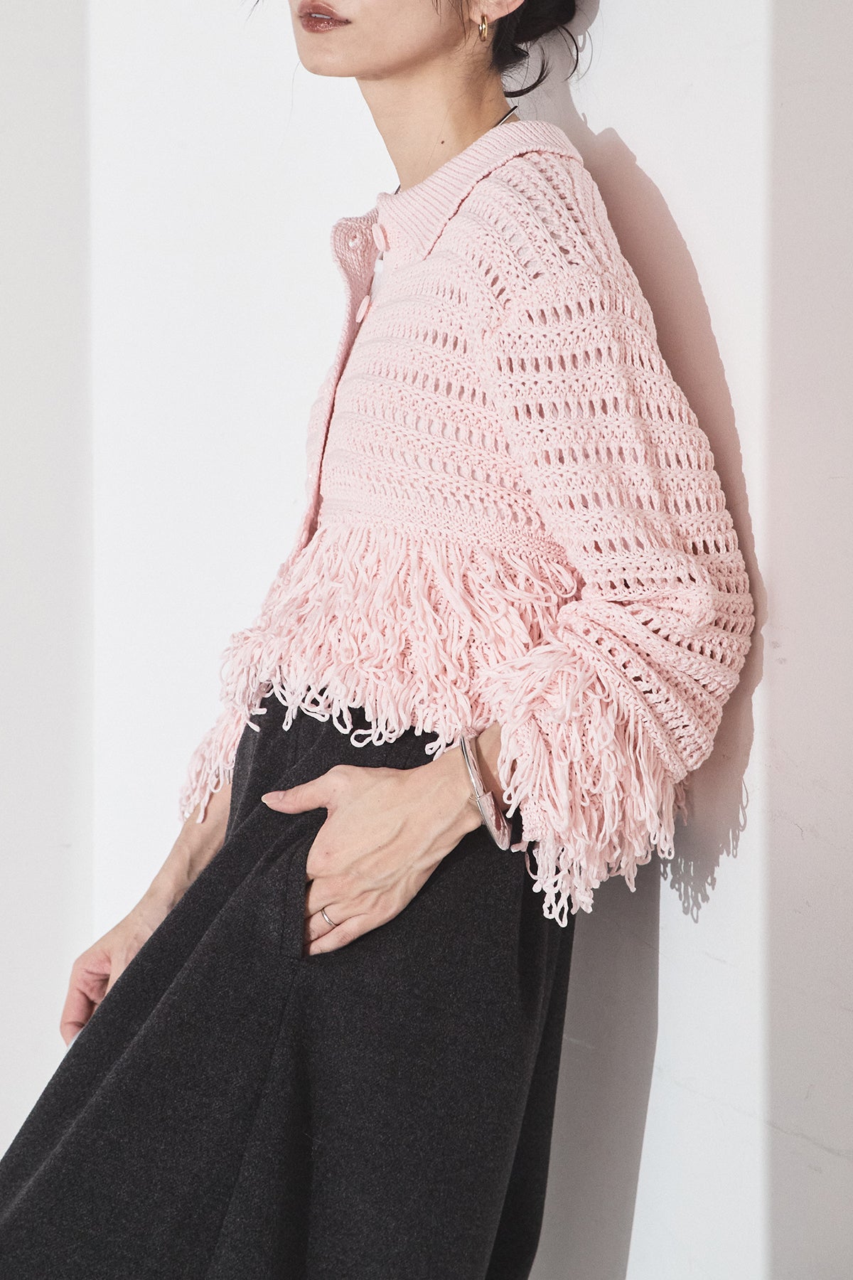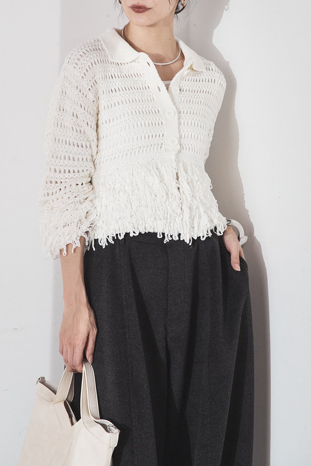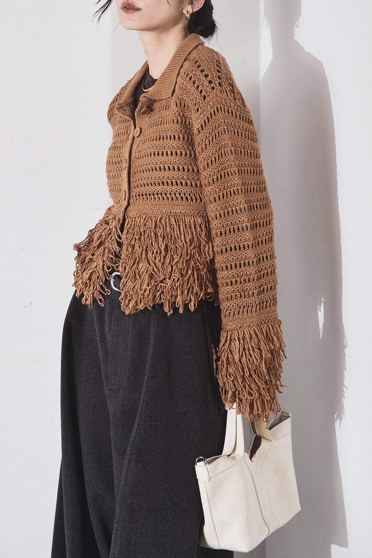 メッシュ編みにフリンジをあしらったデザインカーディガン。 軽やかな編み地で、重たく見えず取り入れやすい一枚です。 フリンジが動きをプラスし、シンプルなスタイリングにも自然なアクセントに。 パンツにもスカートにも合わせやすく、デイリーから外出まで幅広く活躍します。