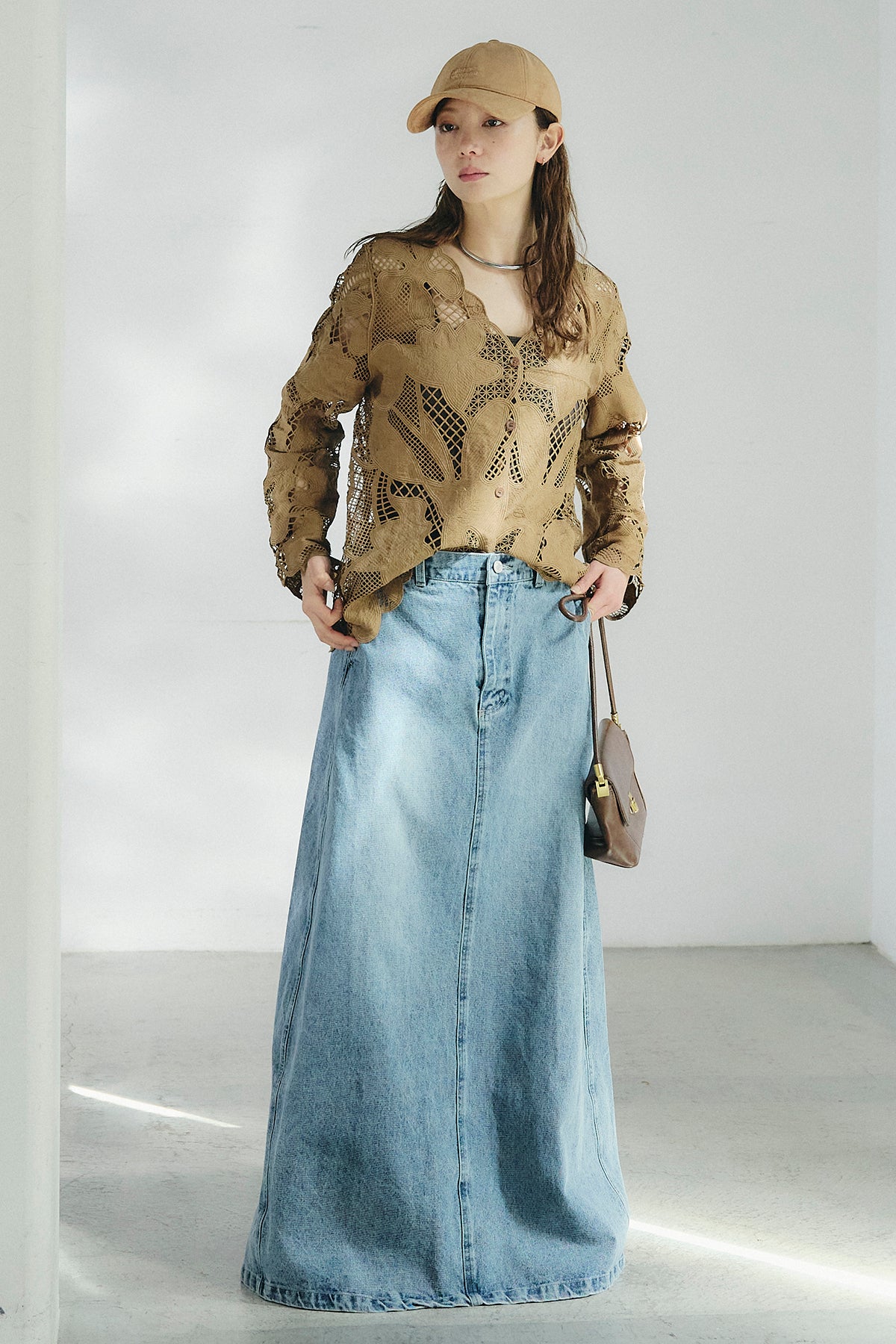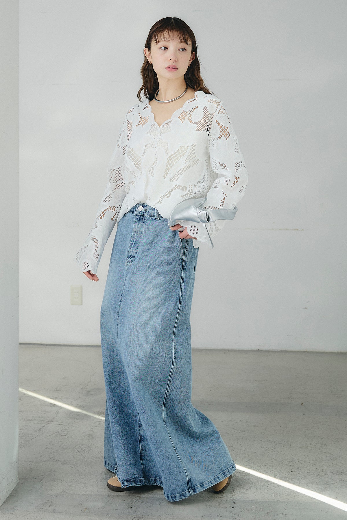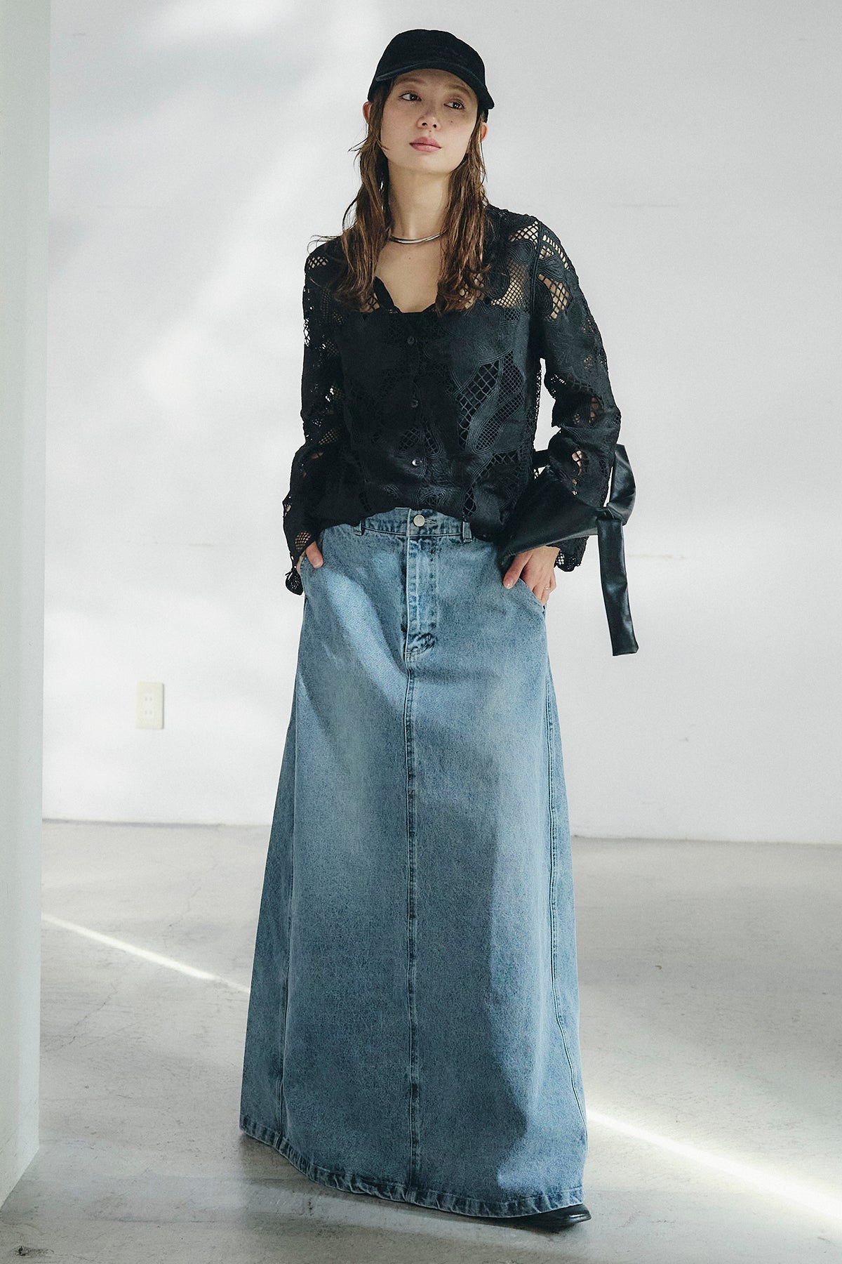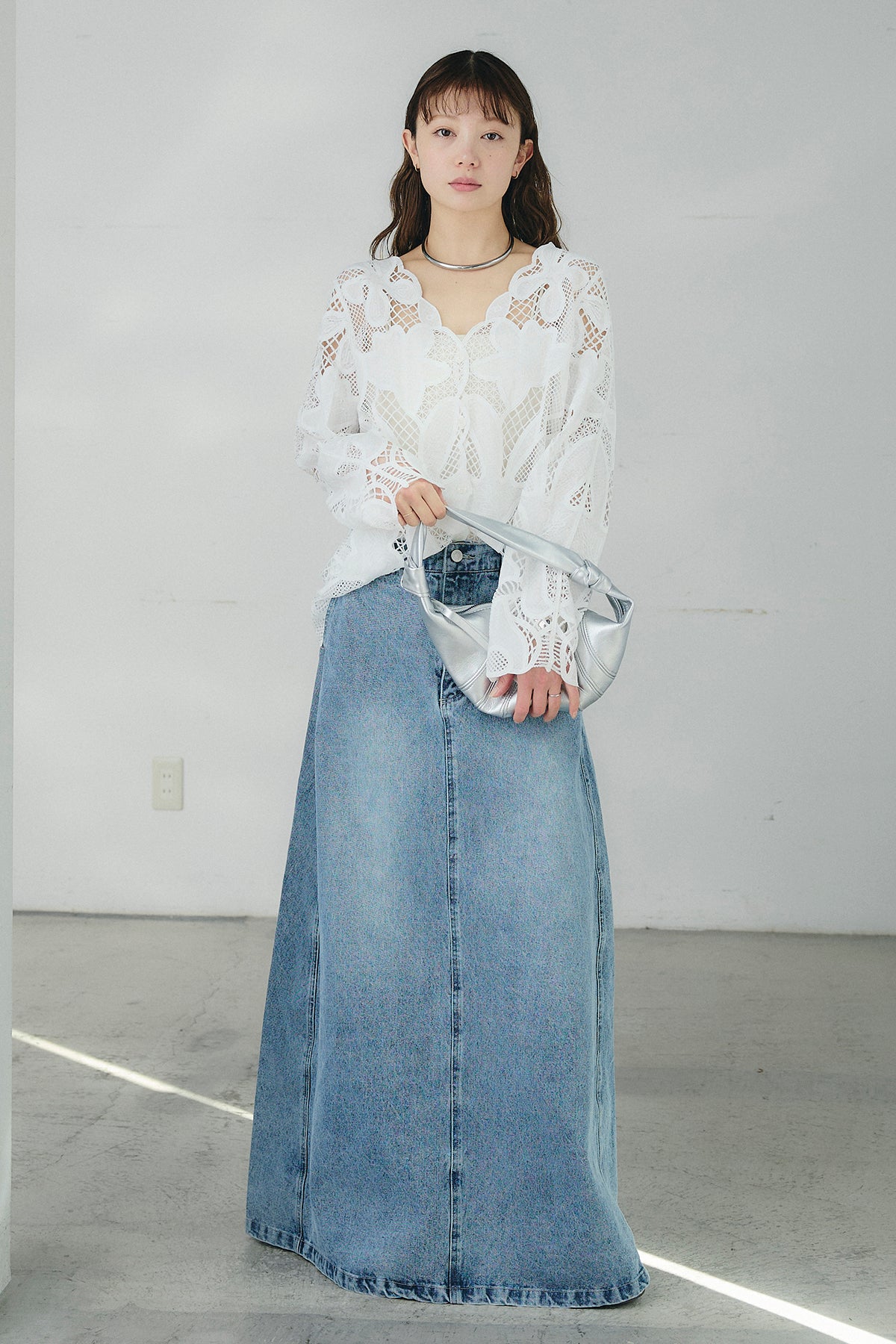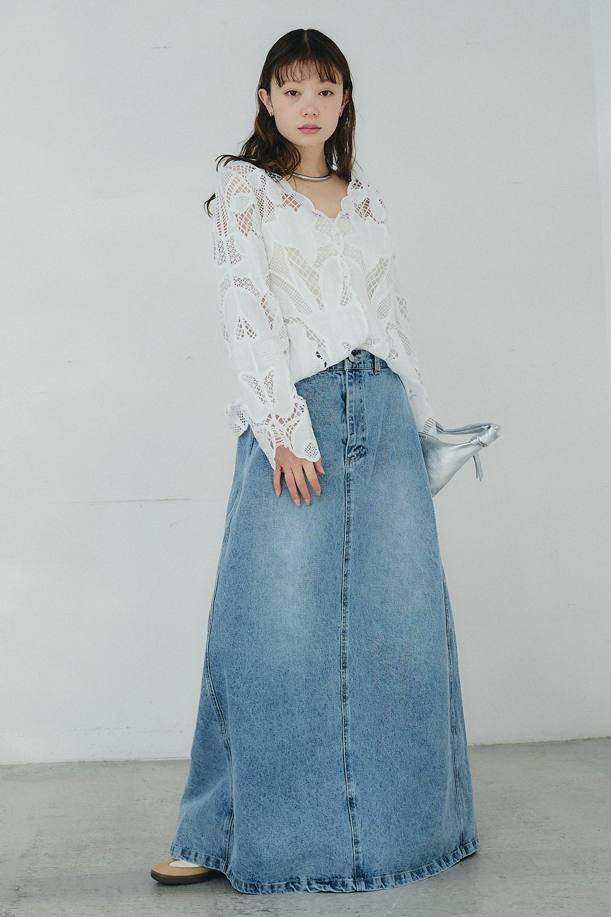 [SET]フラワー刺繍レースブラウス+デニムロングフレアスカート(2set)