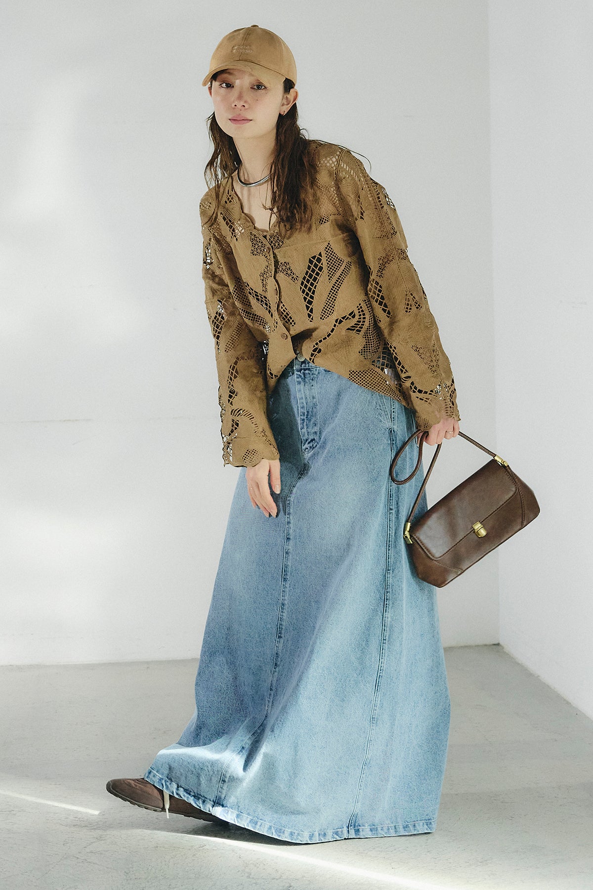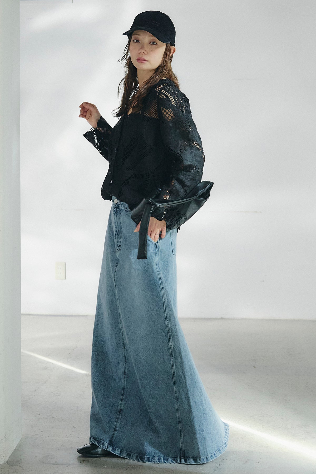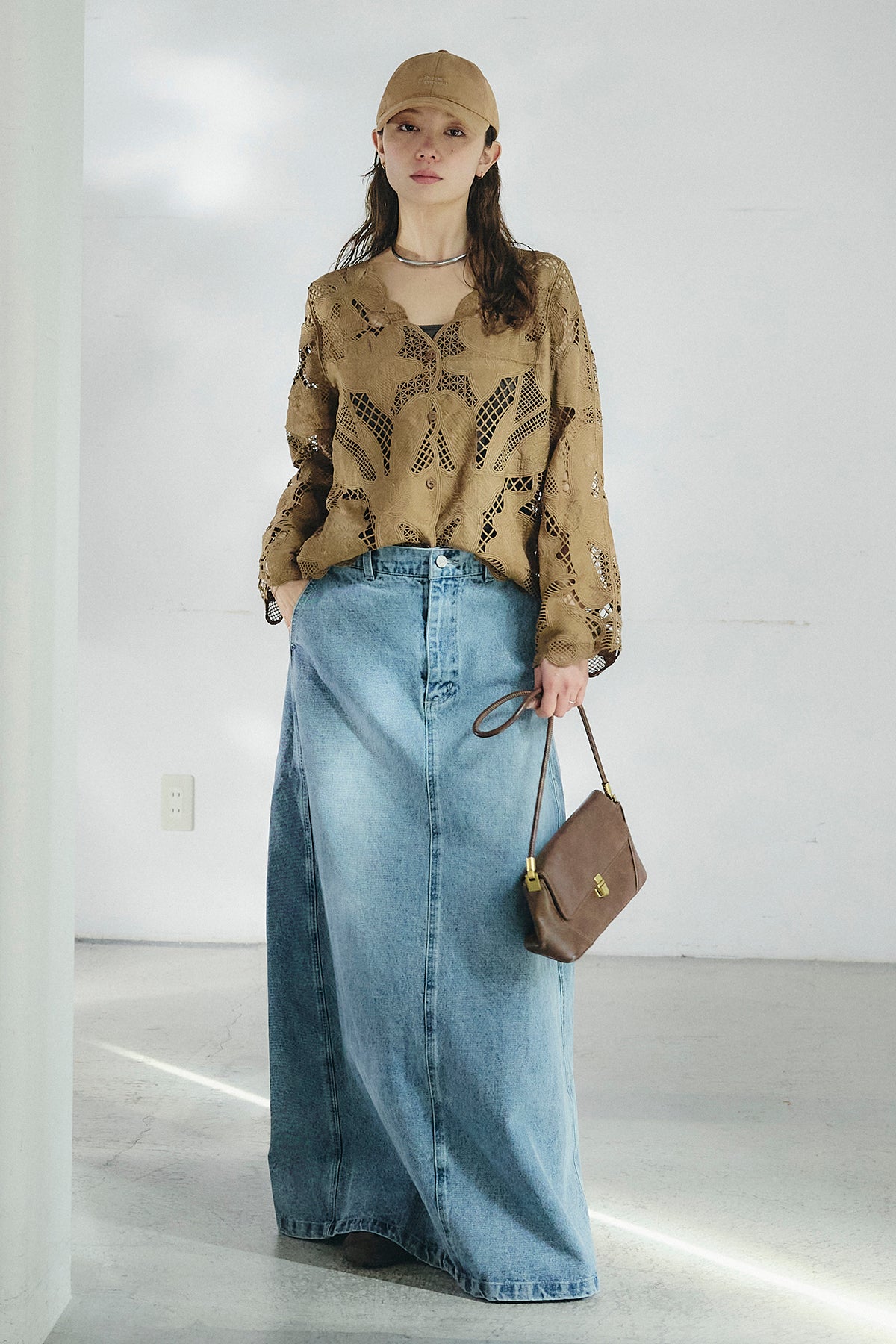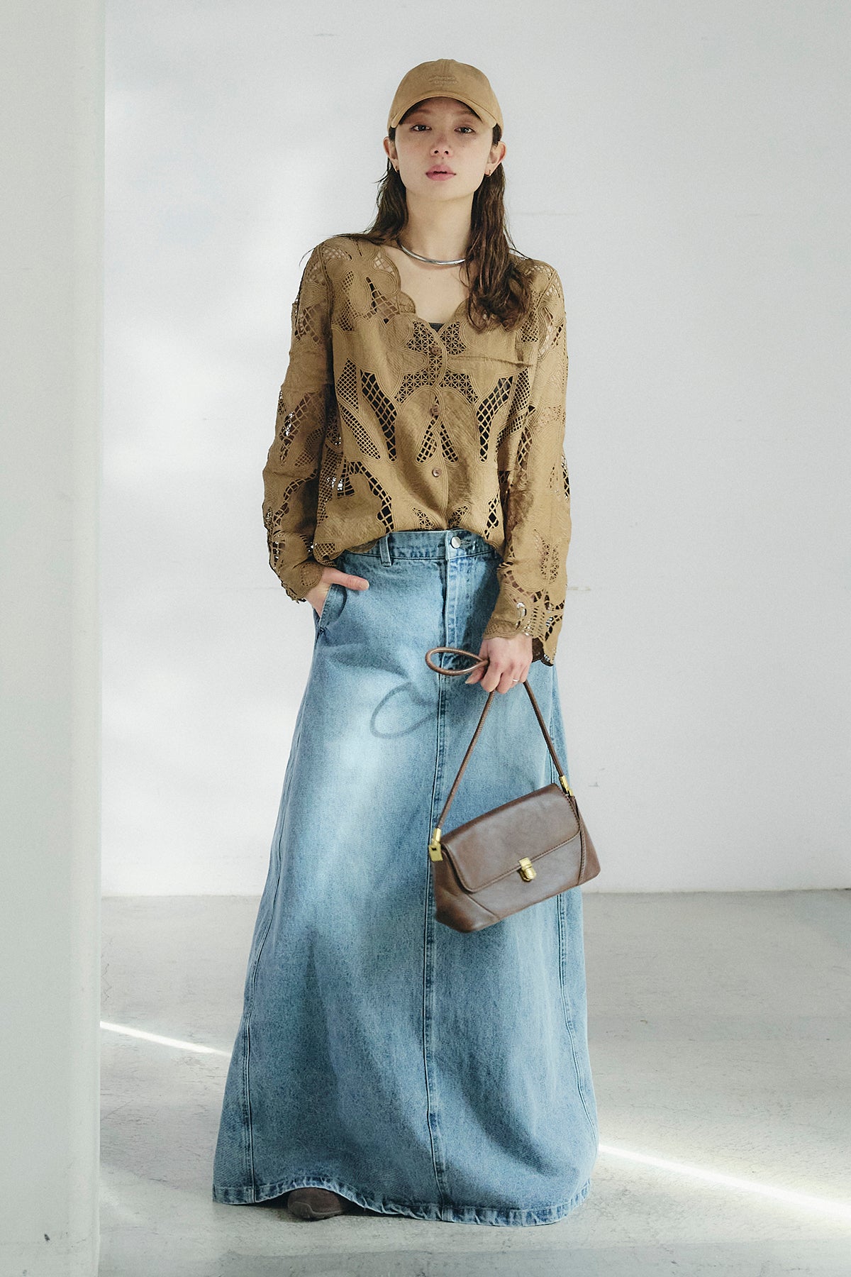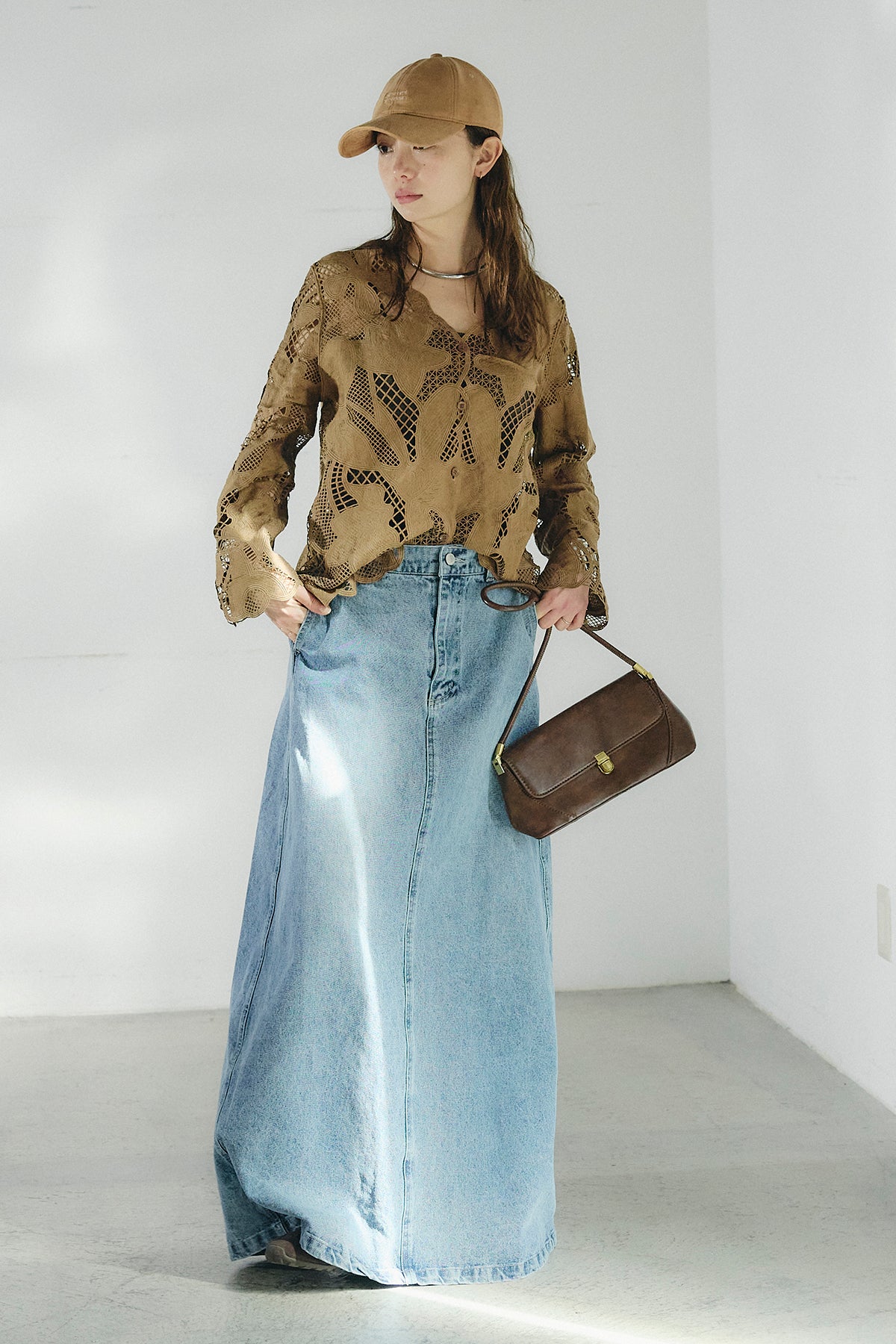 [SET]フラワー刺繍レースブラウス+デニムロングフレアスカート(2set)
